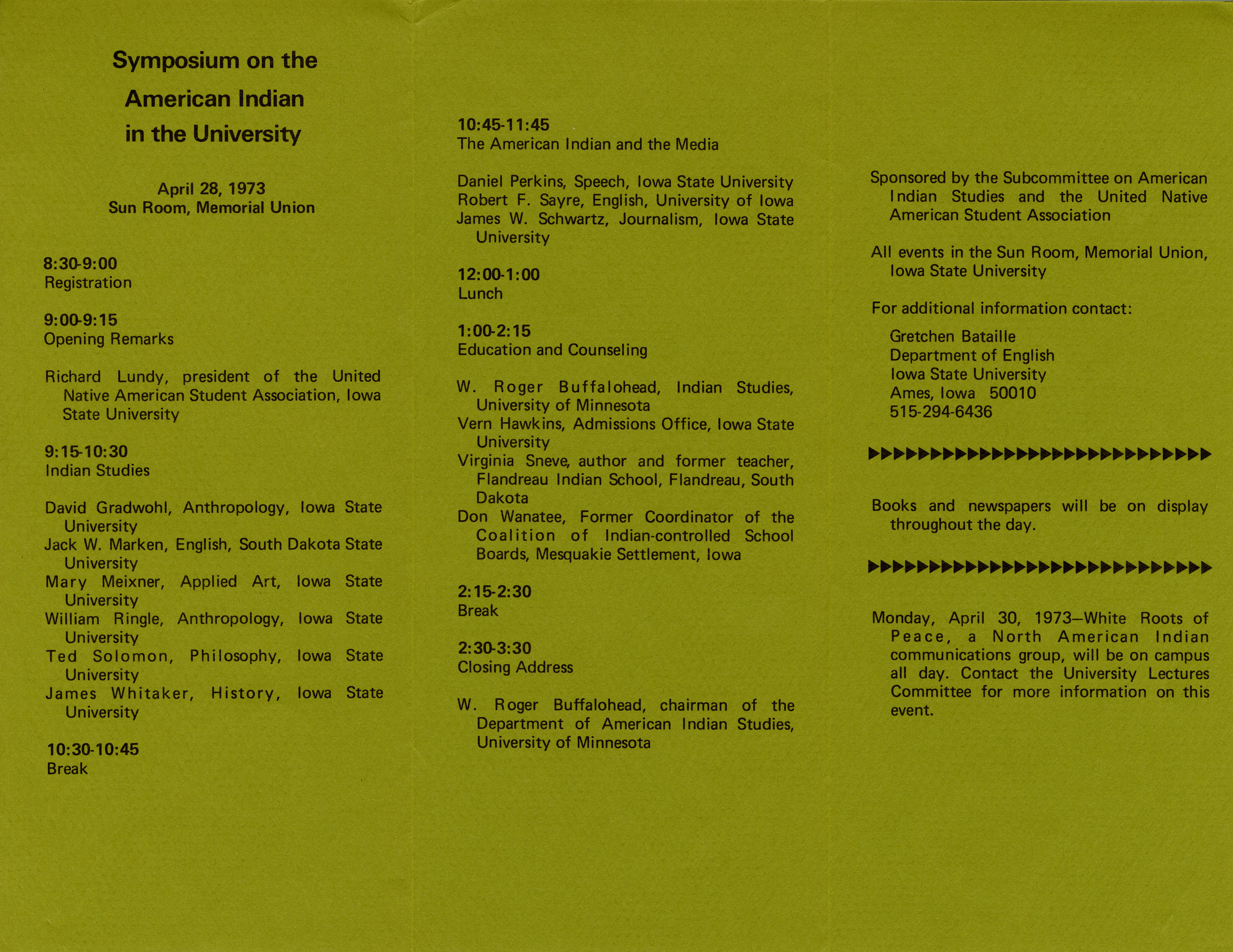 - "Symposium of the American Indian in the university, April 28, 1973", Iowa State University Multicultural Student Organizations Collection, Iowa State University Library Digital Collections