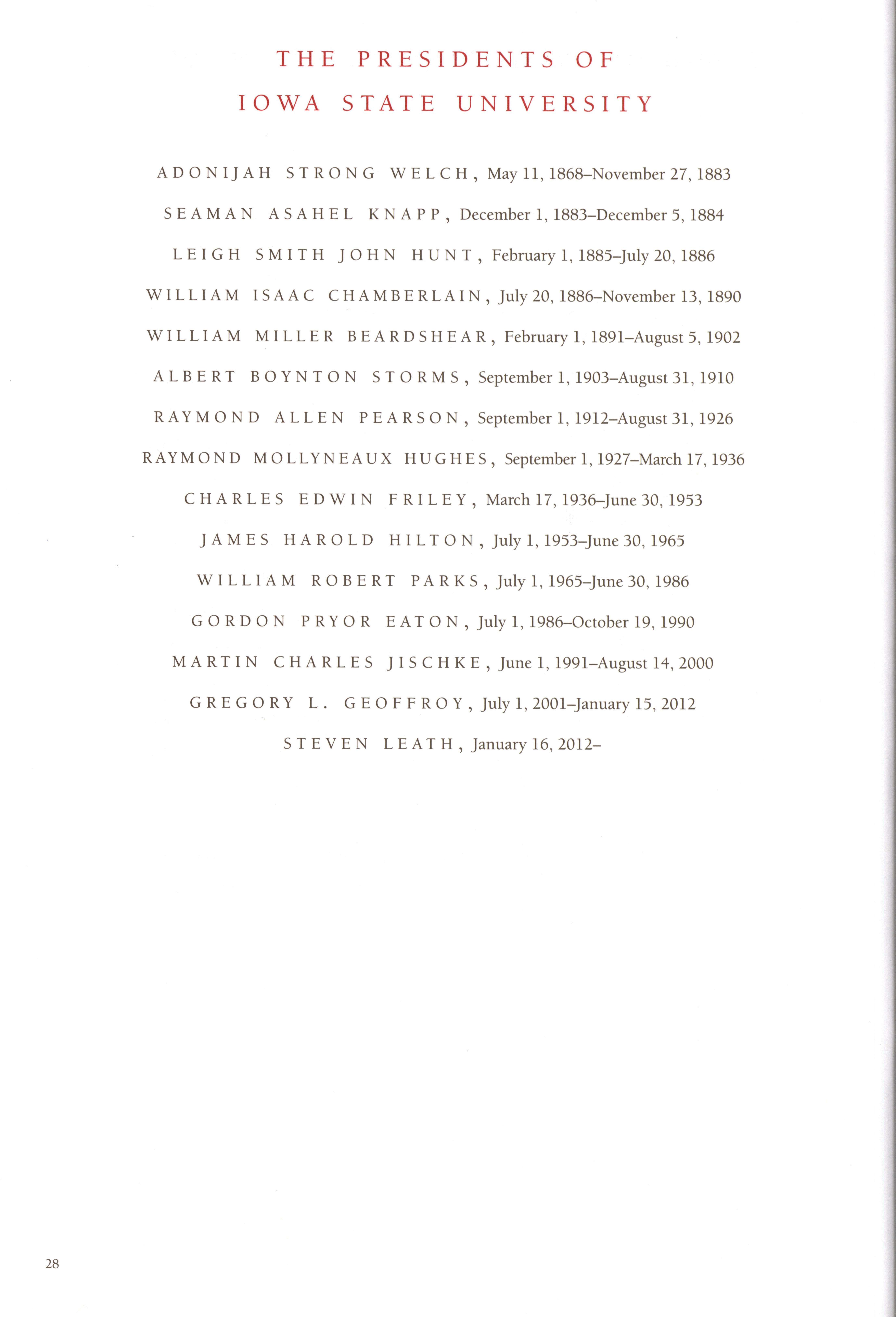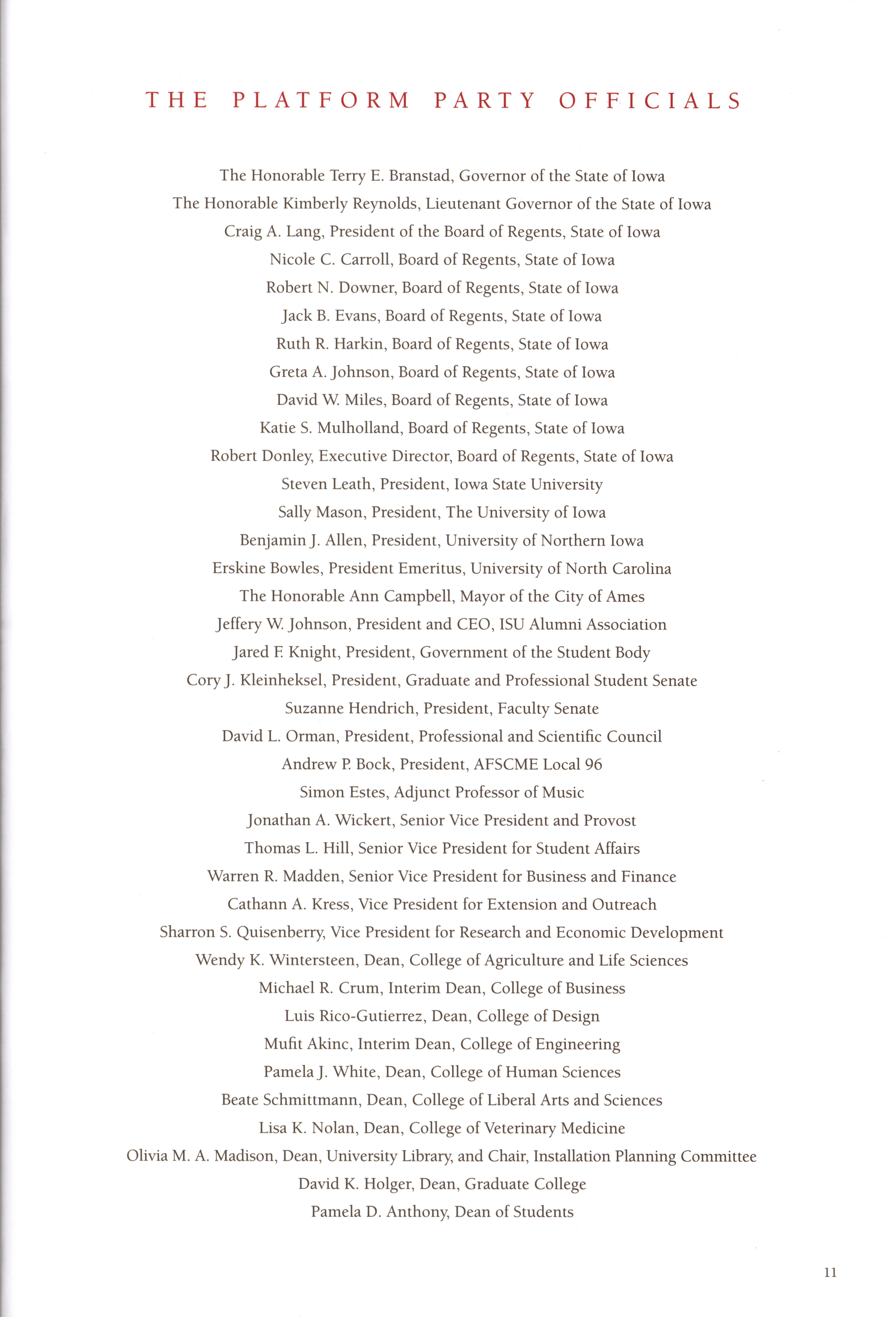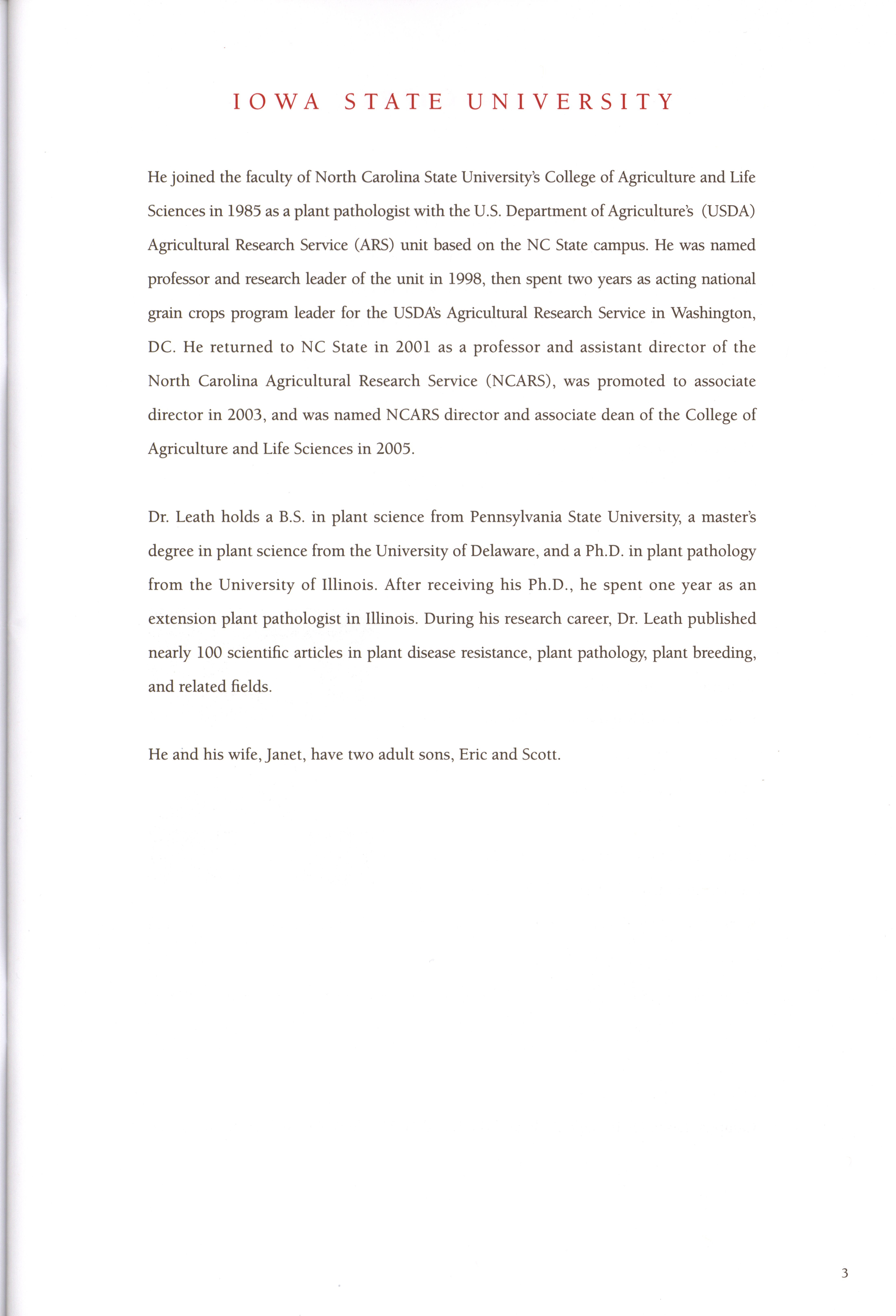 - "Program for the installation of Steven Leath as fifteenth president of Iowa State University, September 14, 2012", Iowa State University Presidents Collection, Iowa State University Library Digital Collections