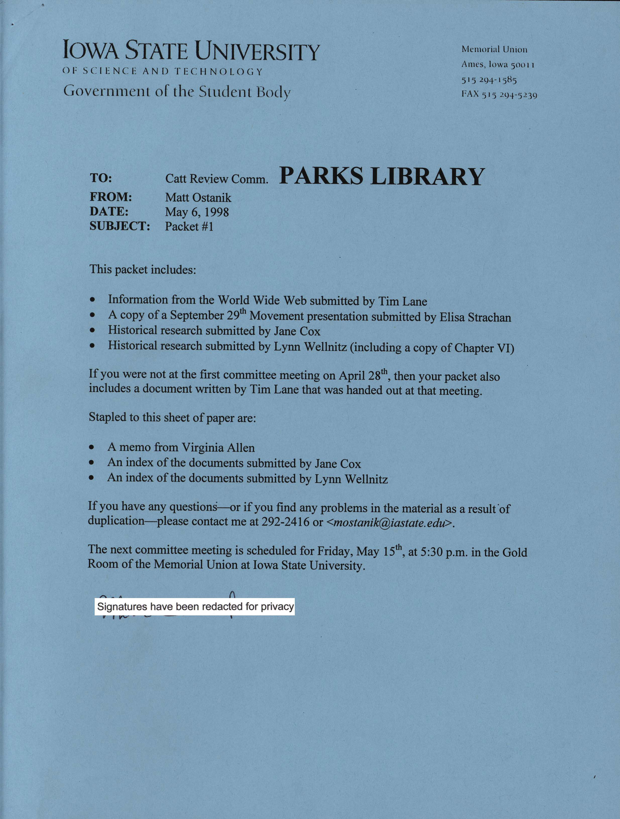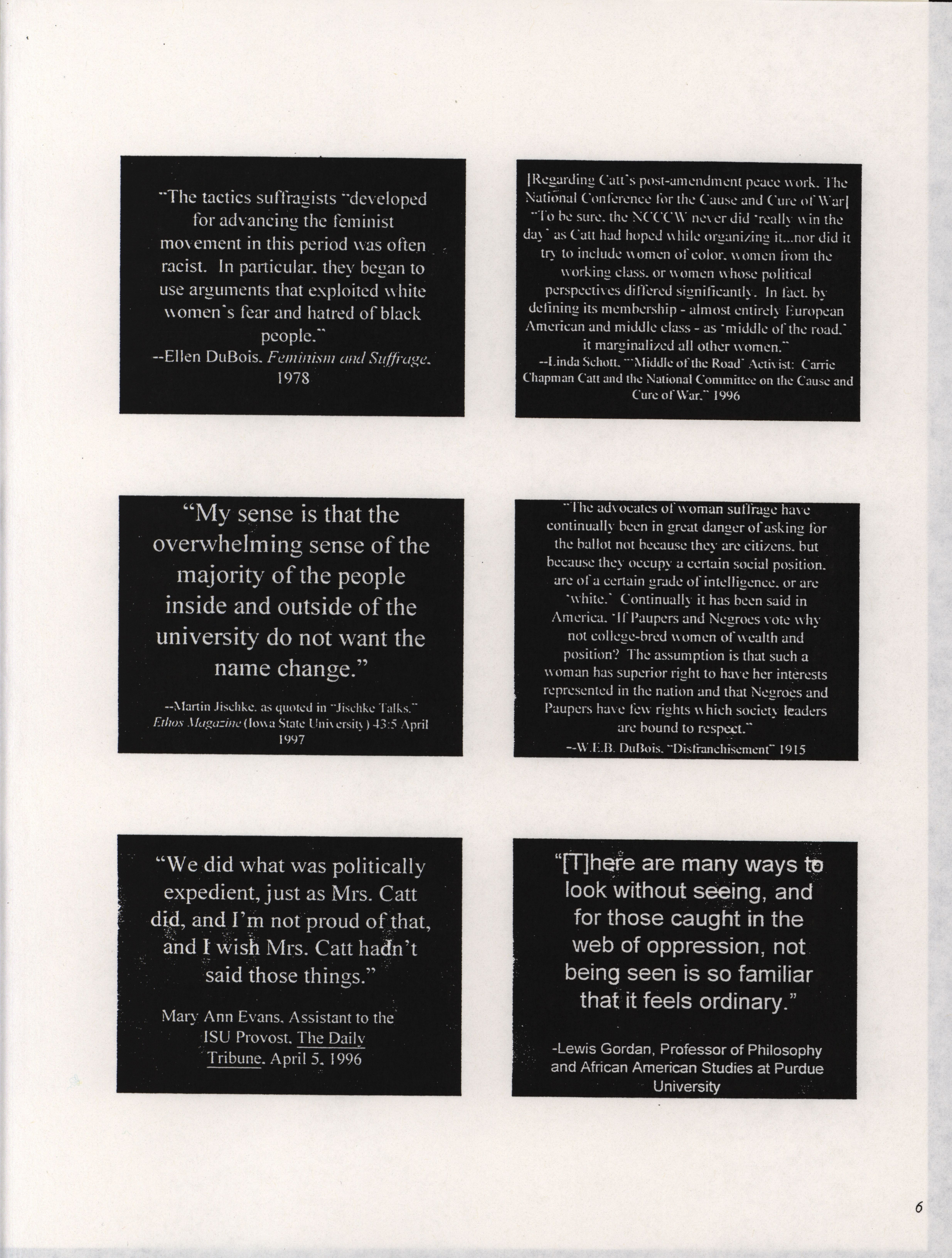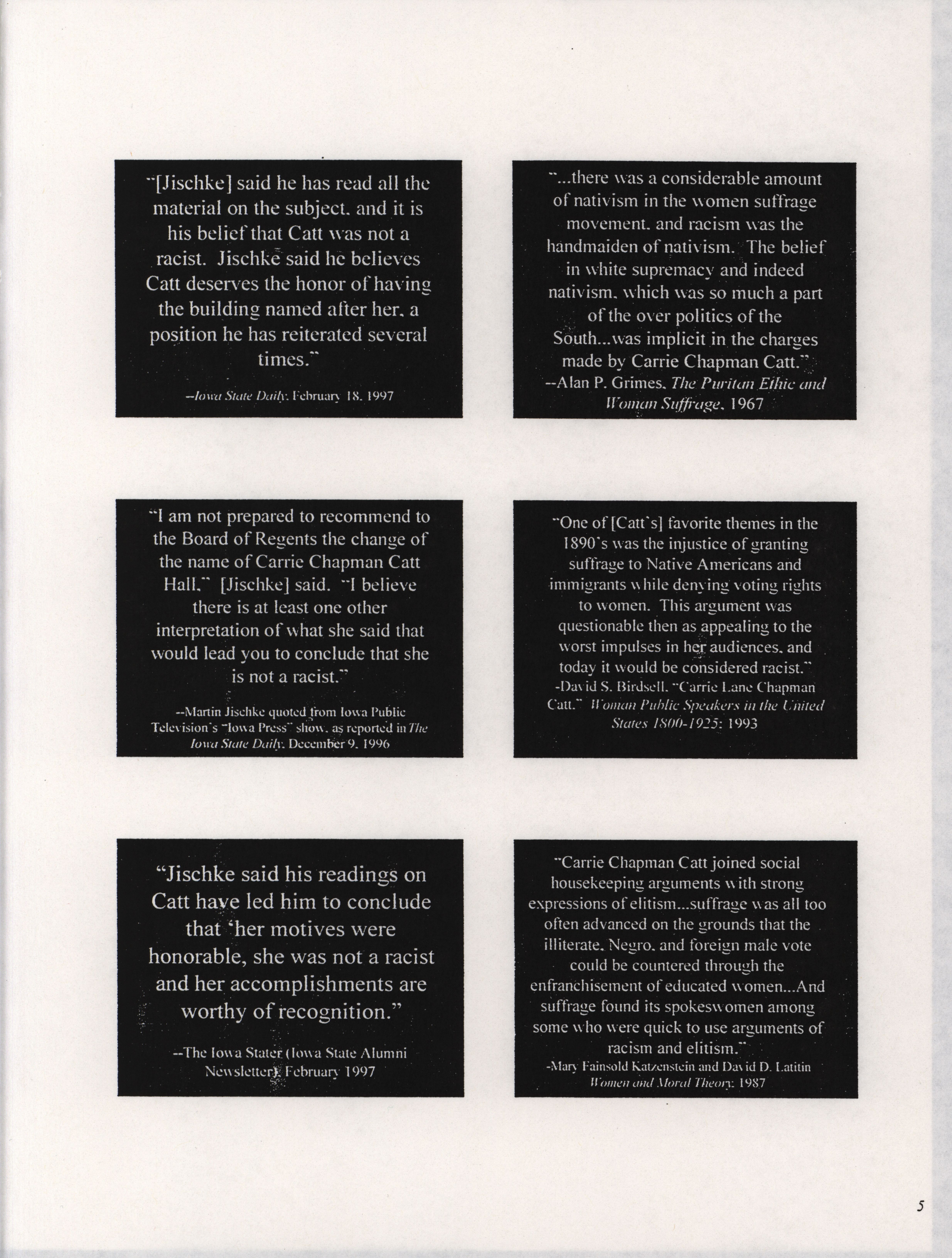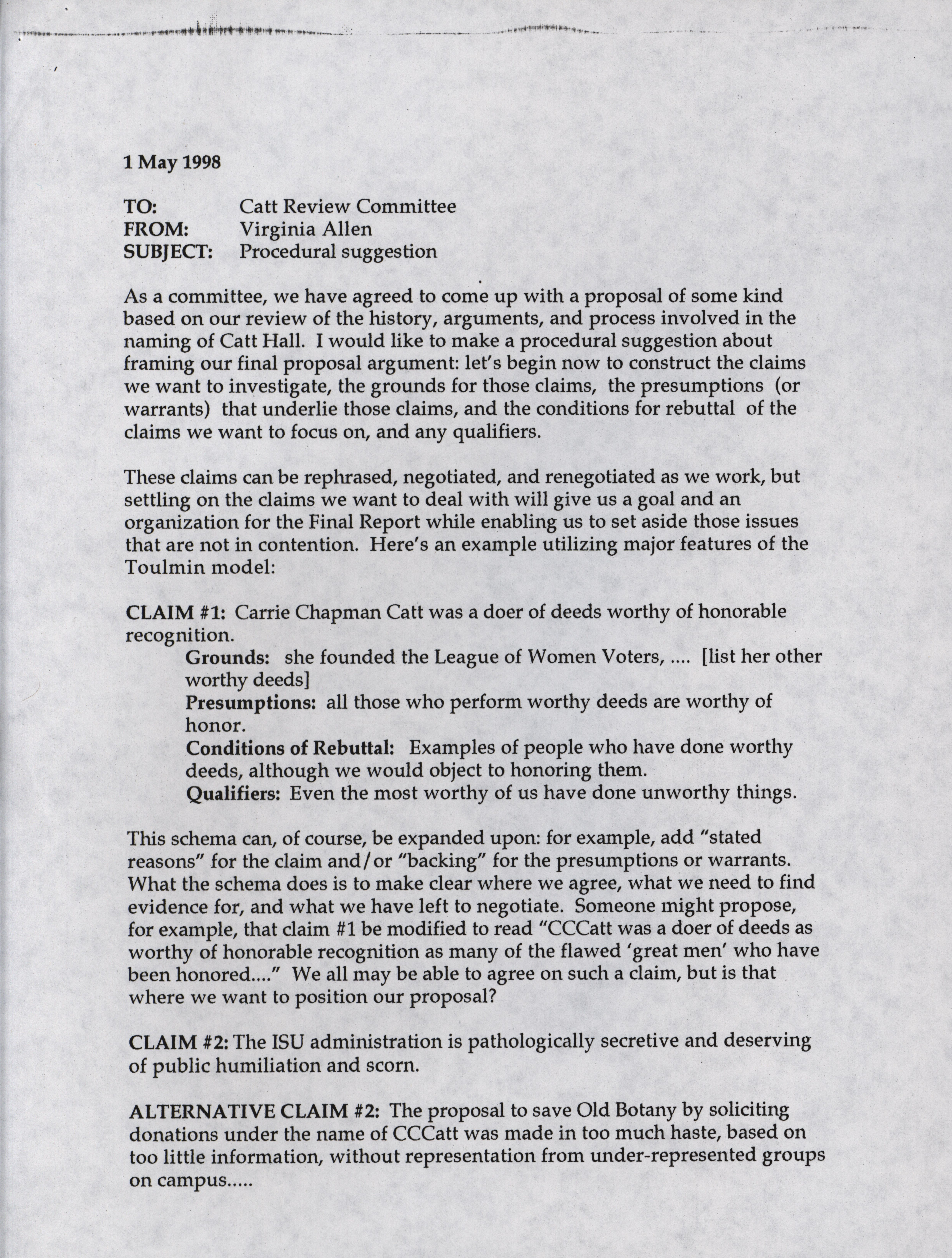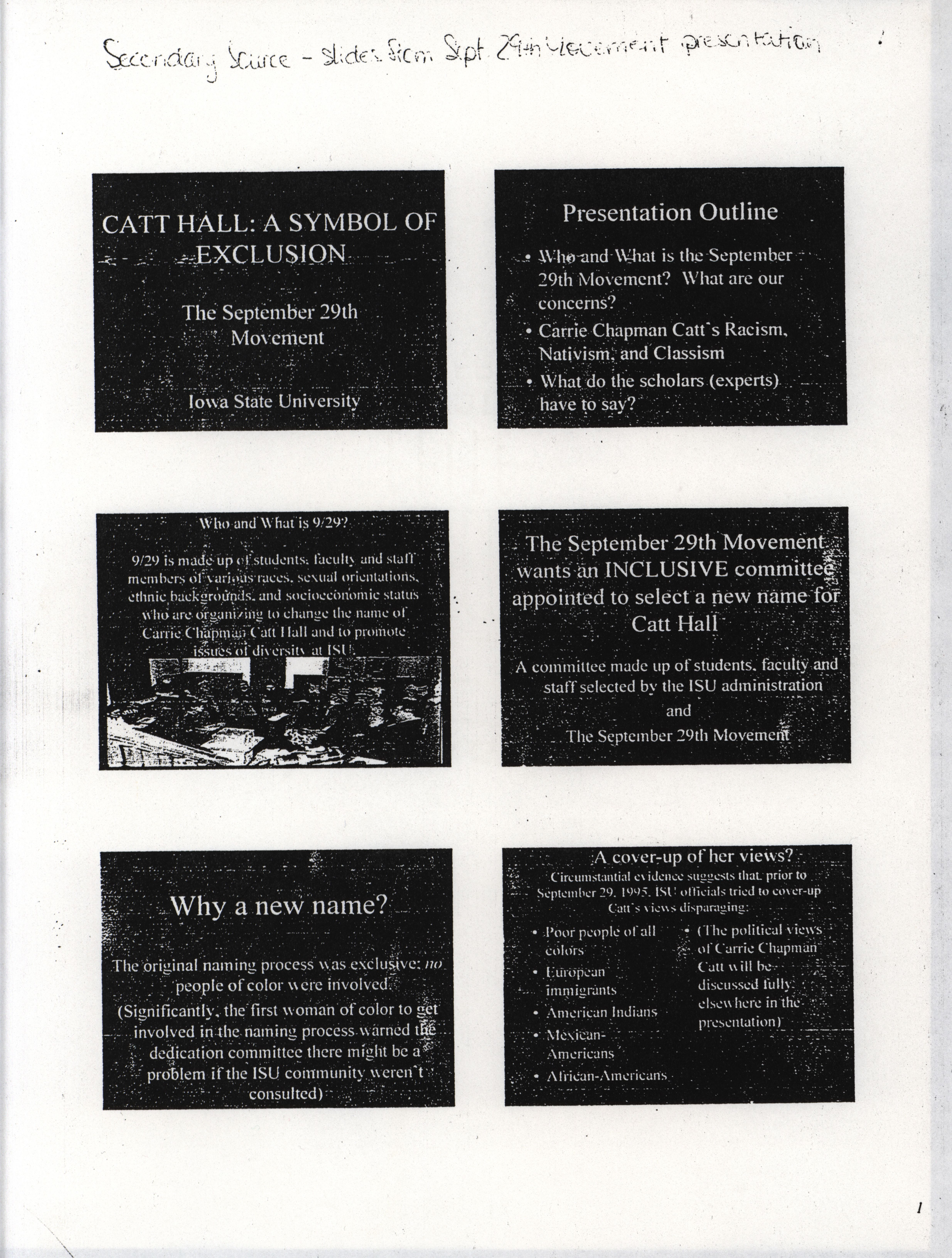 - "Memorandum with enclosures from Matt Ostanik to Catt Review Committee; May 6, 1998", September 29th Movement Collection, Iowa State University Library Digital Collections