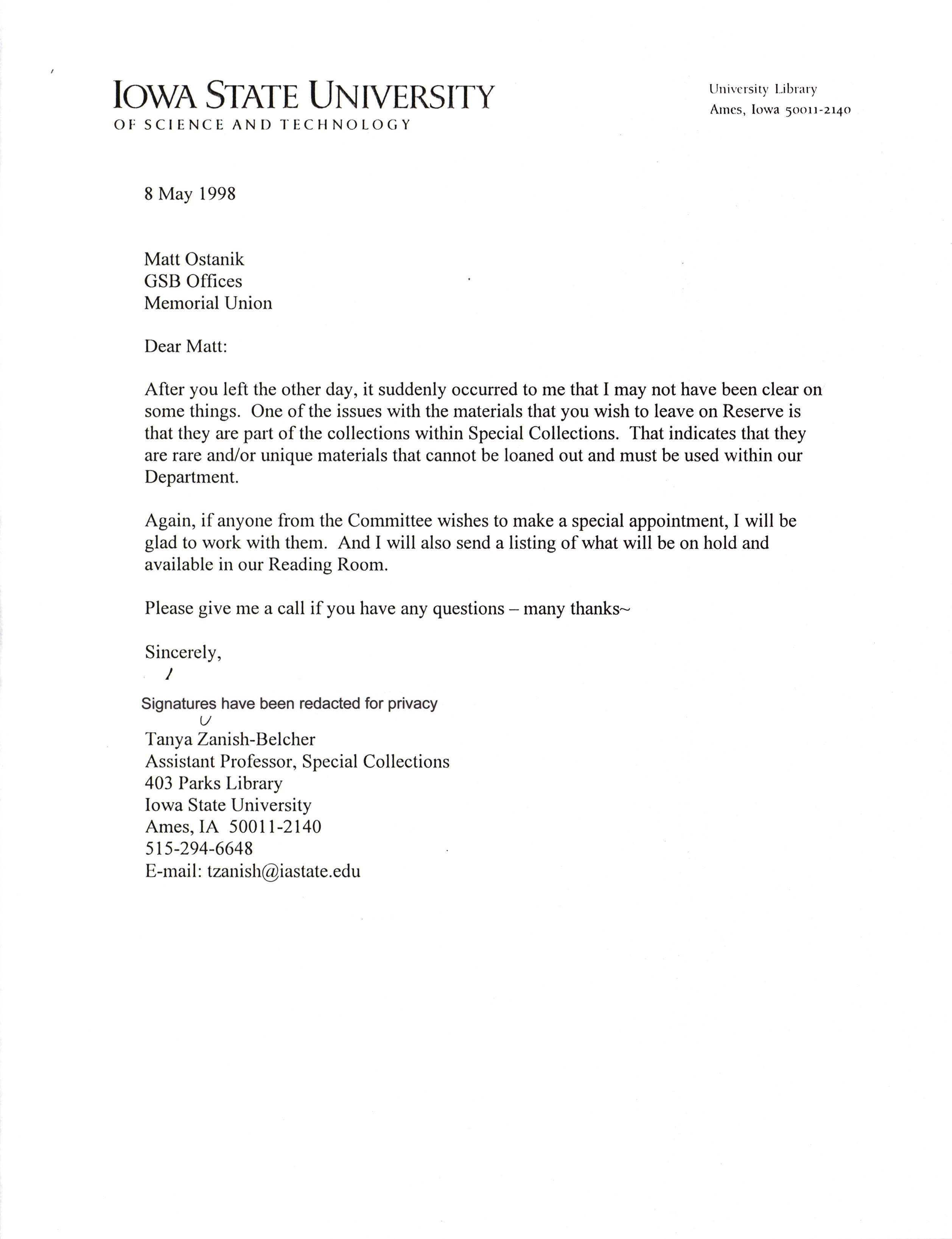 - Letter from Tanya Zanish-Belcher to Matt Ostanik, explaining why collections in the Special Collections Department need to remain with the department.