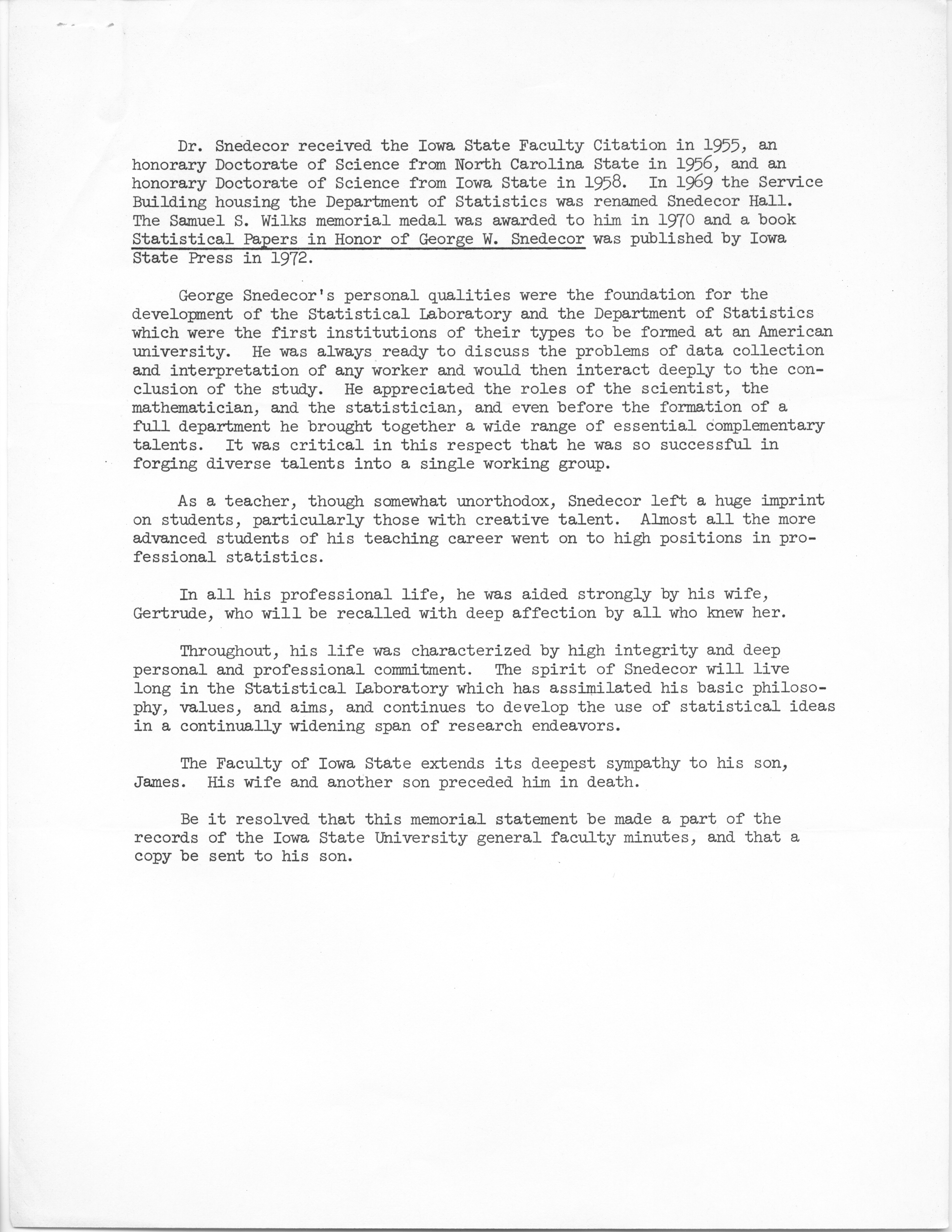 - "Memorial resolution--George W. Snedecor", George W. Snedecor Collection, Iowa State University Library Digital Collections