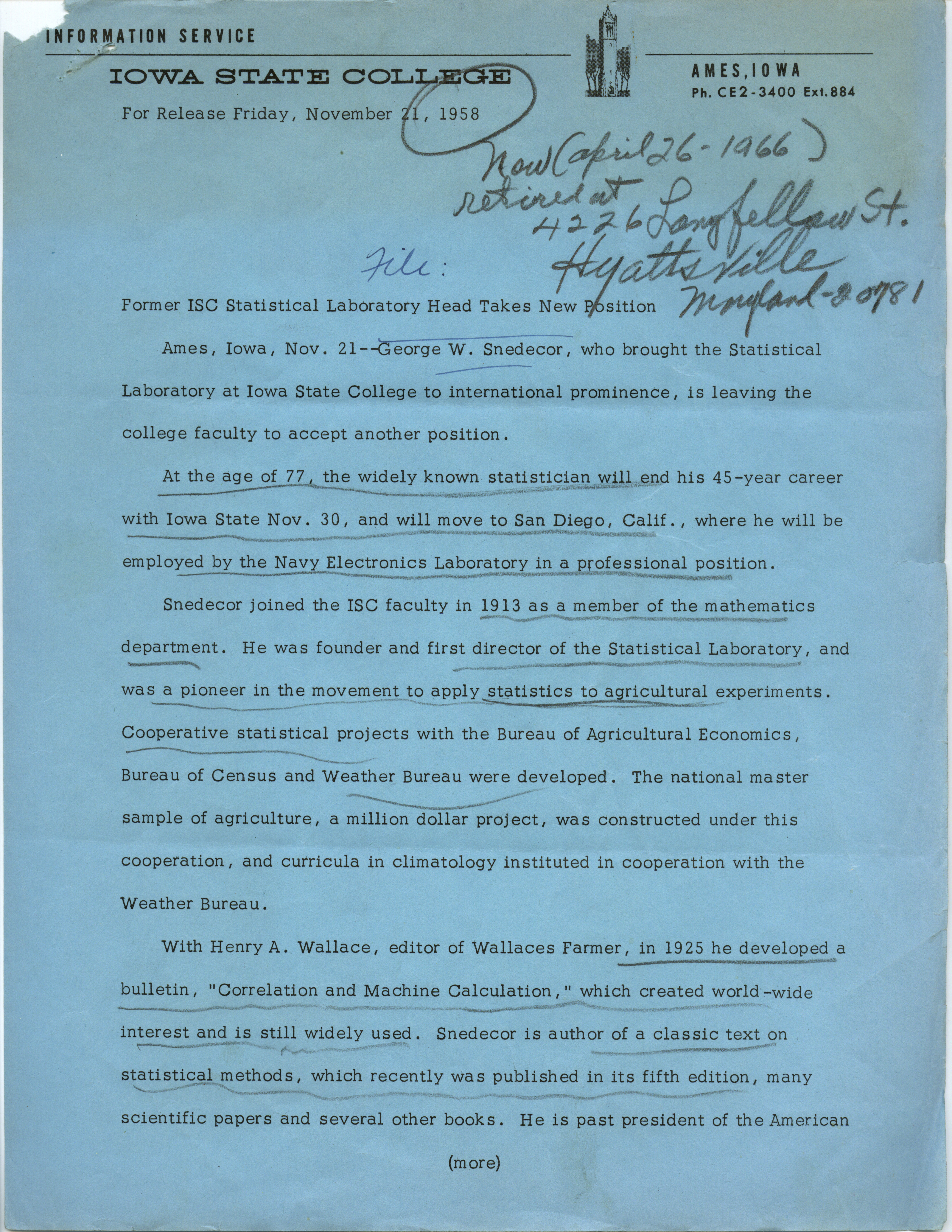 - Announces that Snedecor, after 45 years at Iowa State, is leaving for a position at the Navy Electronics Laboratory in San Diego, California.