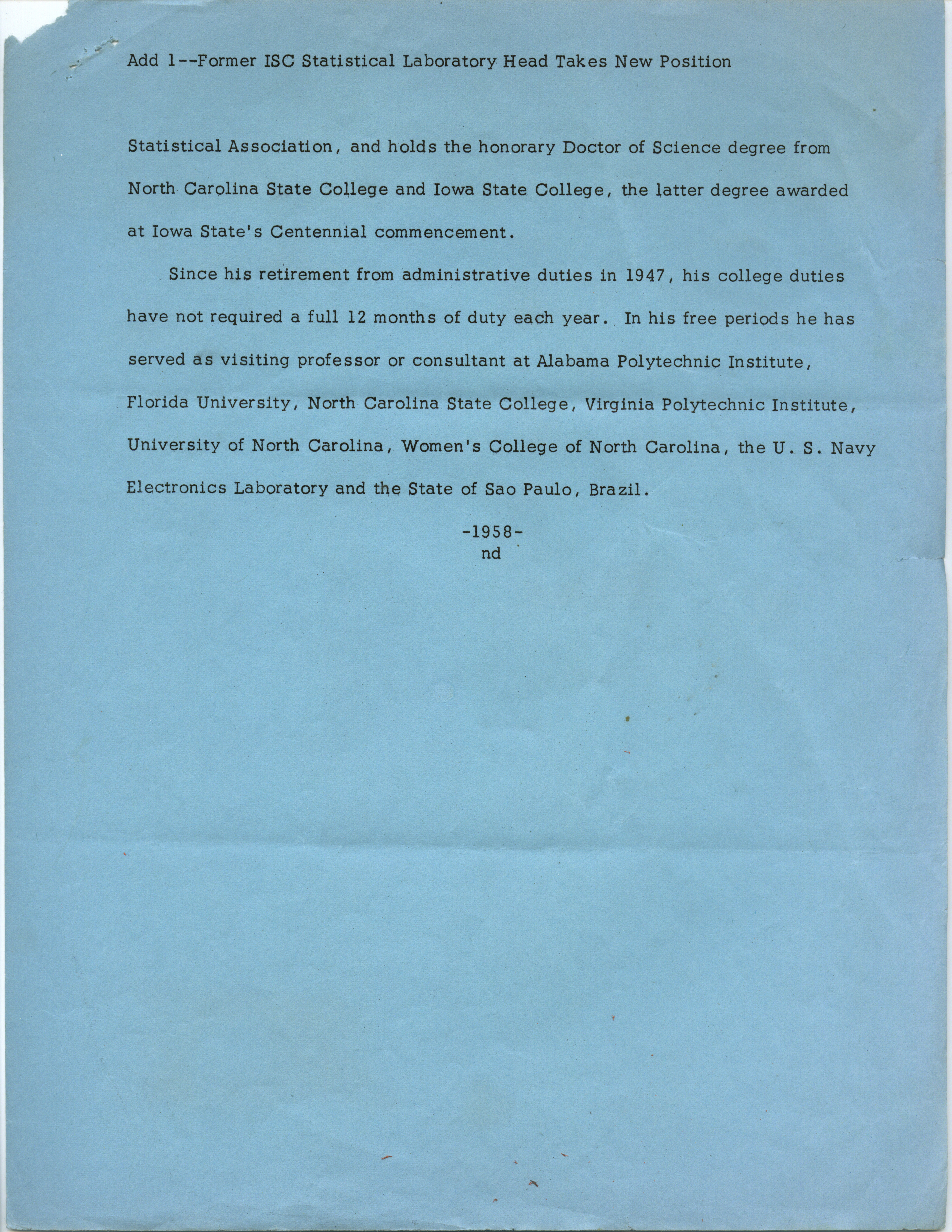 - "Former ISC Statistical Laboratory head takes new position", George W. Snedecor Collection, Iowa State University Library Digital Collections