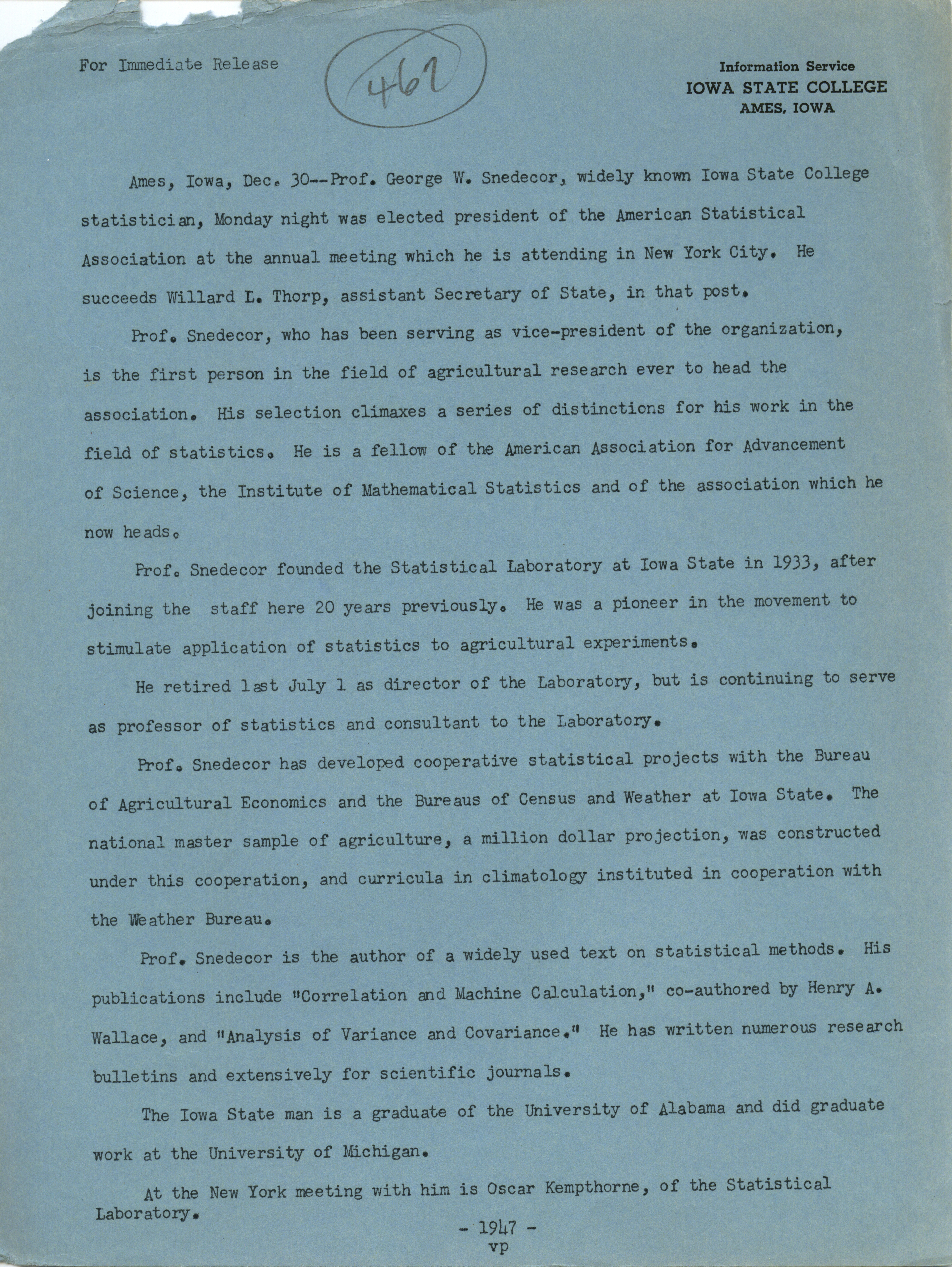 - "Snedecor elected American Statistical Society president", George W. Snedecor Collection, Iowa State University Library Digital Collections