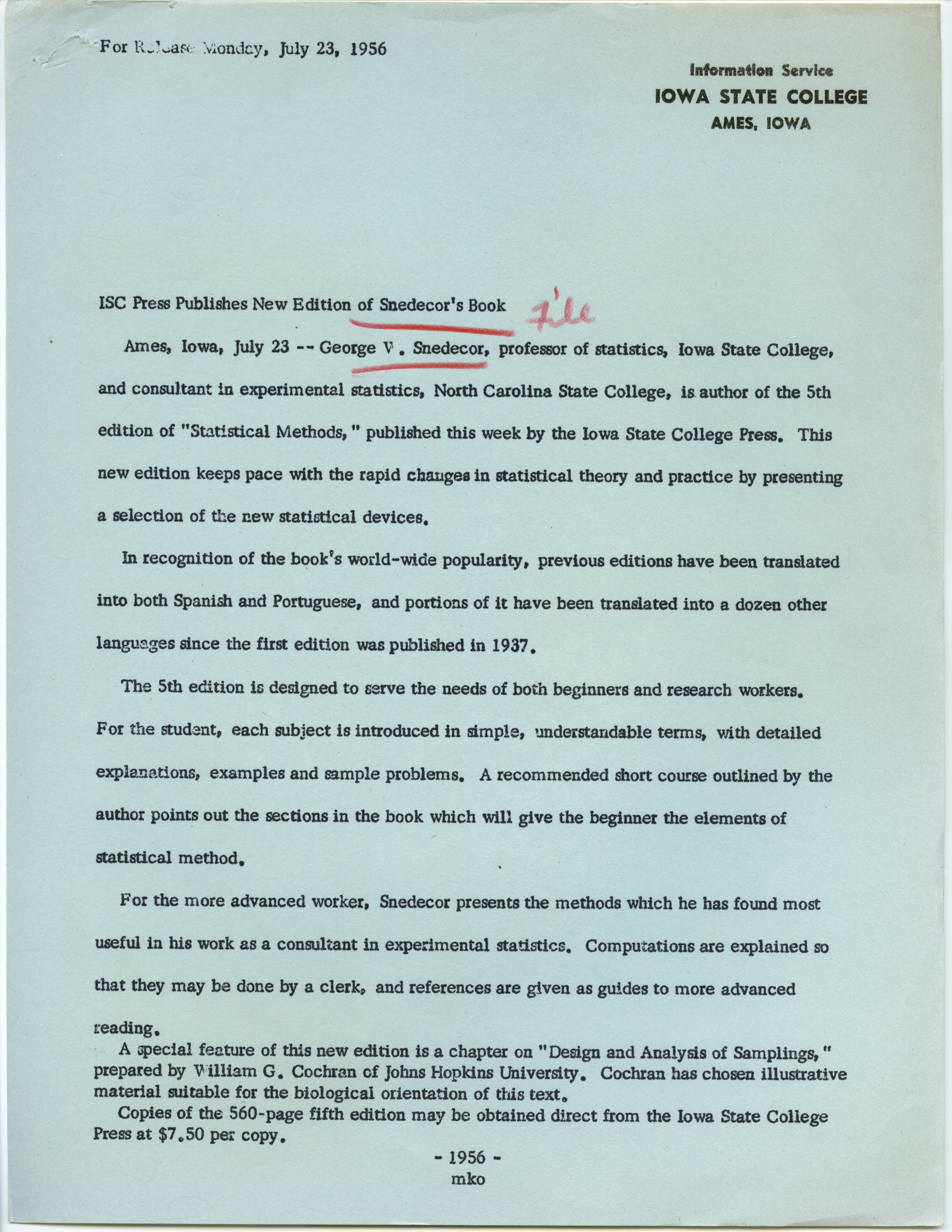 - "ISC Press publishes new edition of Snedecor's book", George W. Snedecor Collection, Iowa State University Library Digital Collections