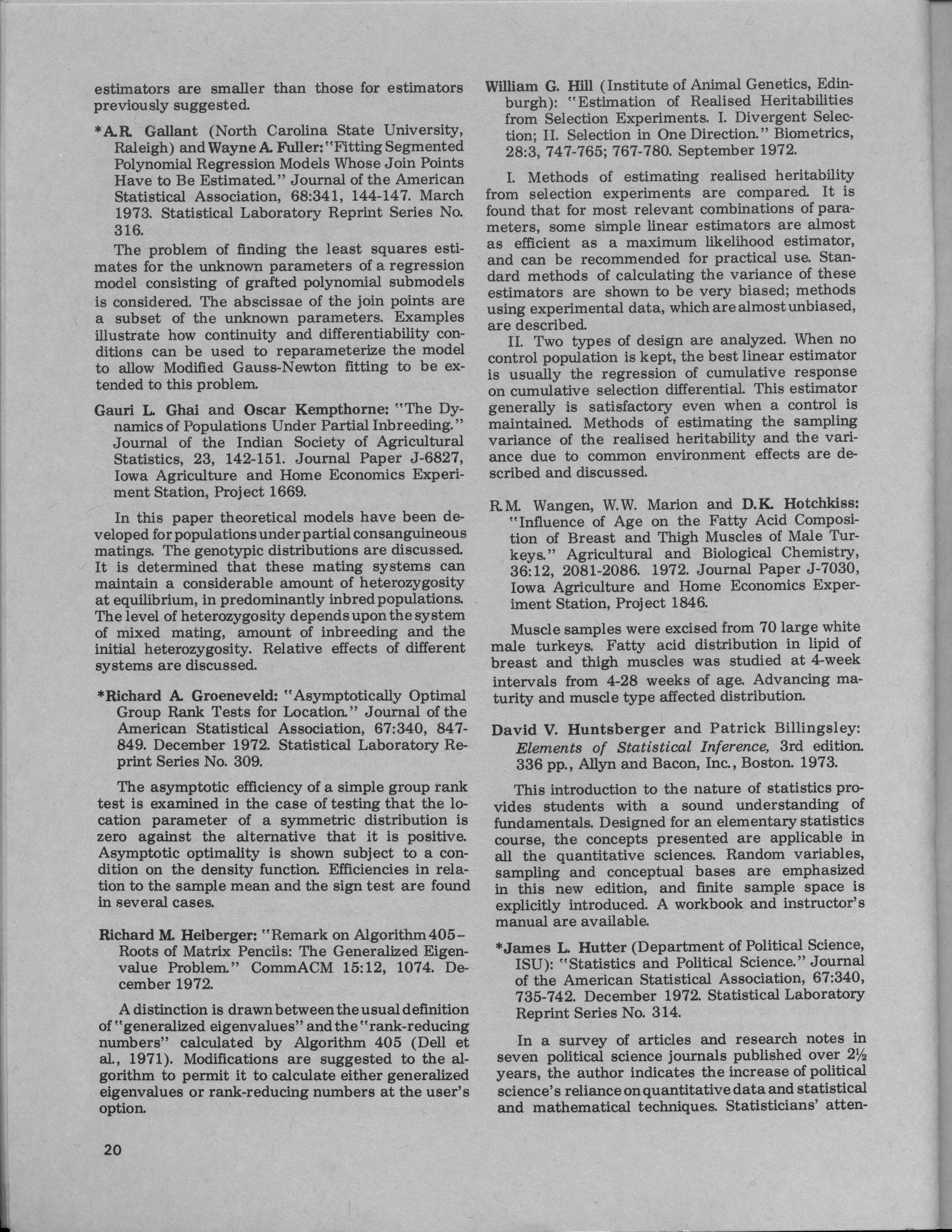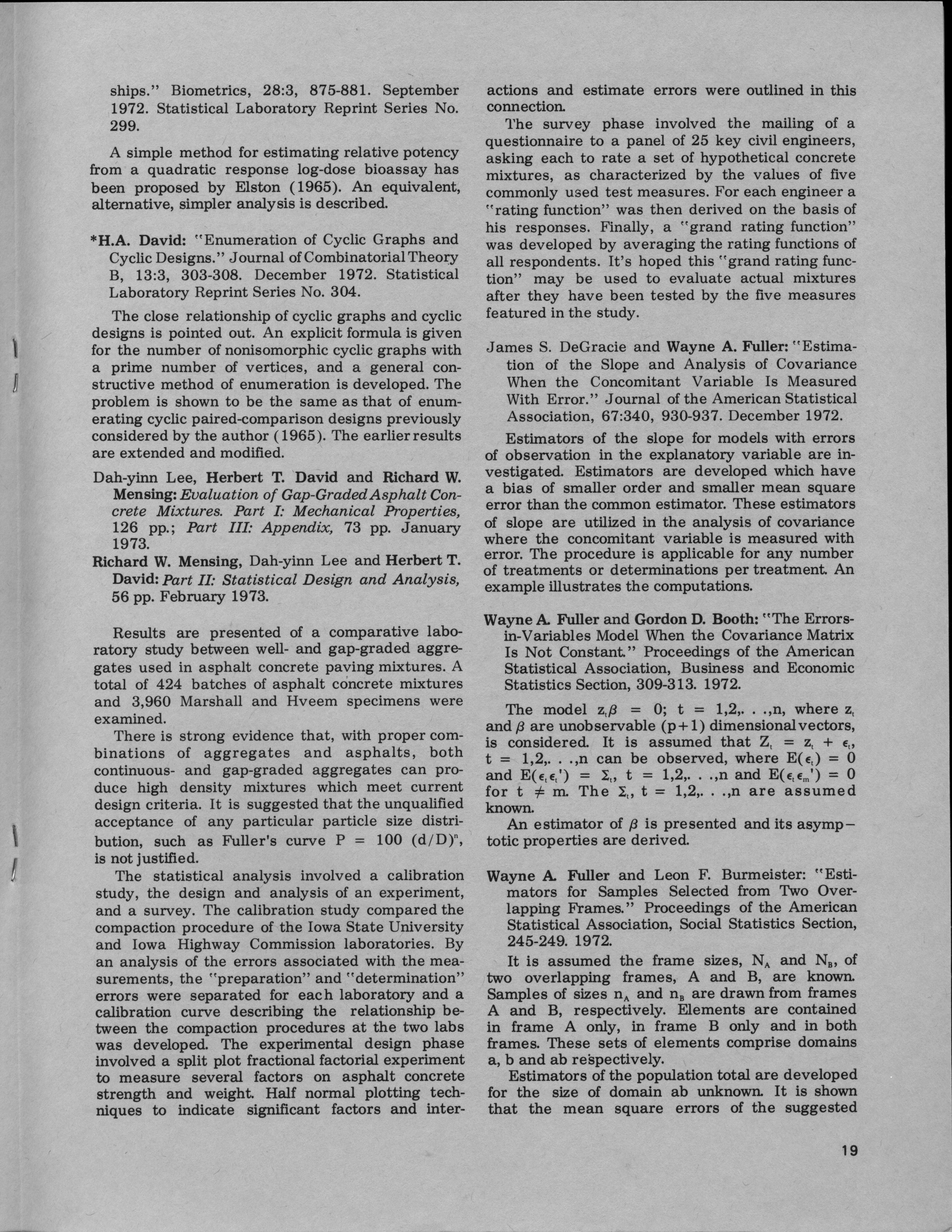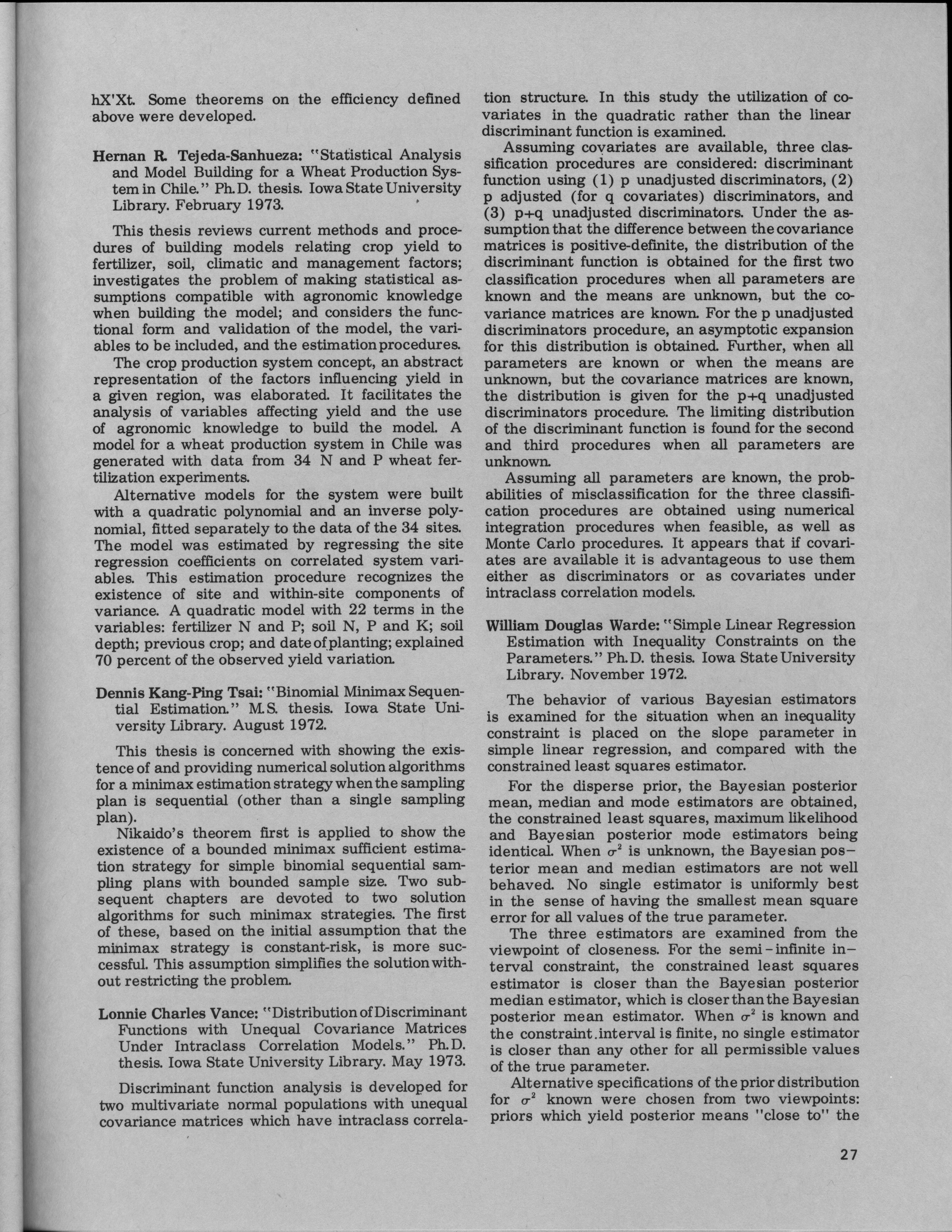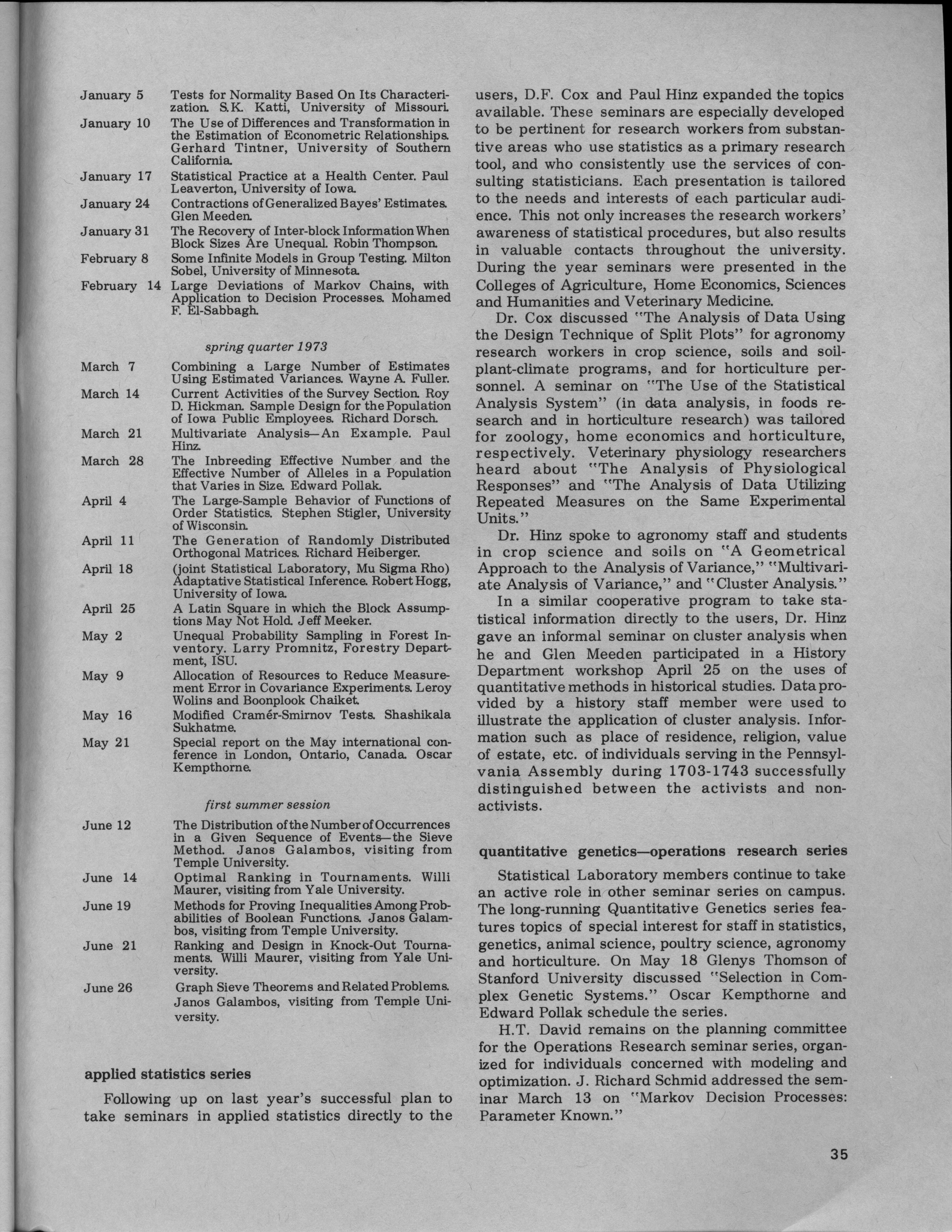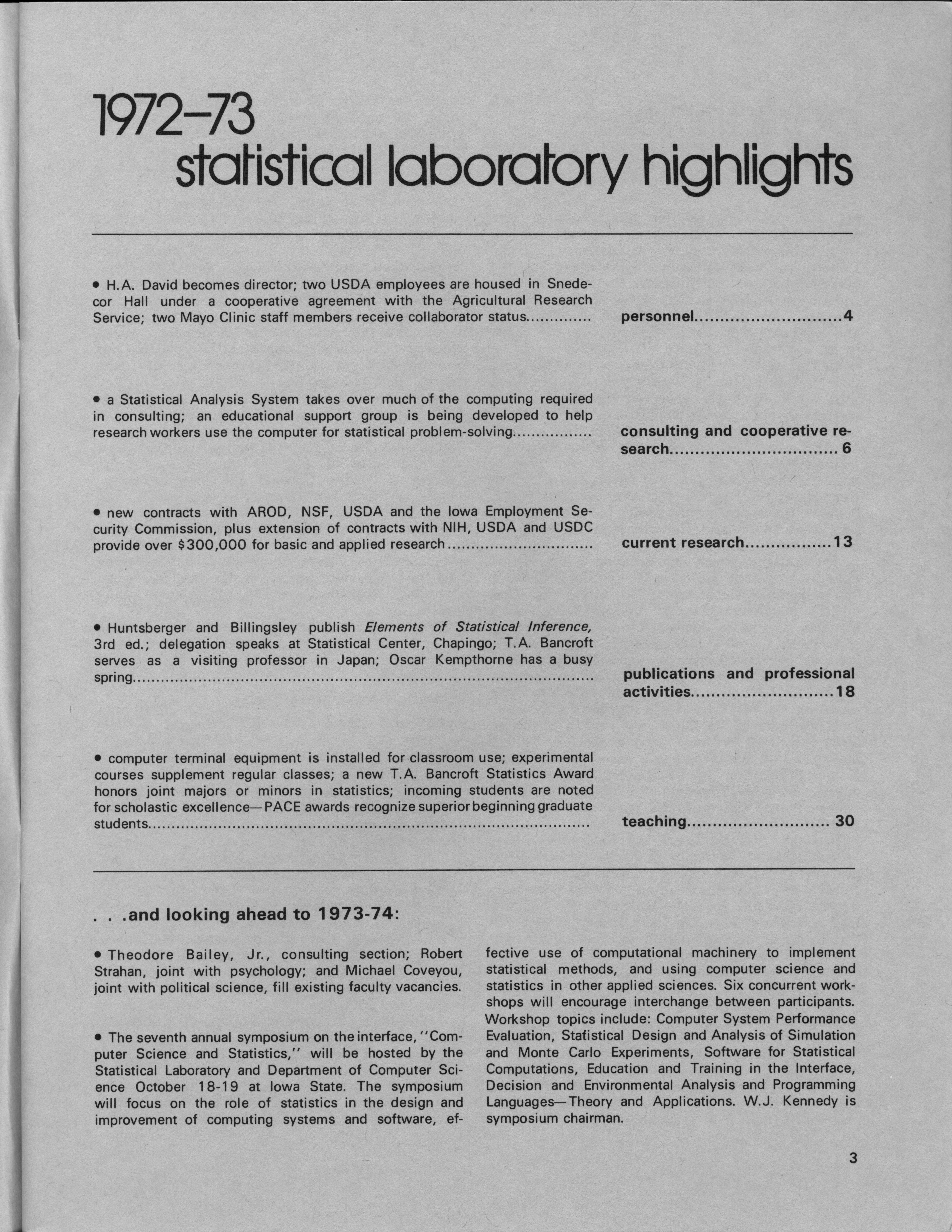 - "Statistical Laboratory Annual Report, July 1, 1972 to June 30, 1973", Iowa State University Statistical Laboratory Annual Reports, Iowa State University Library Digital Collections