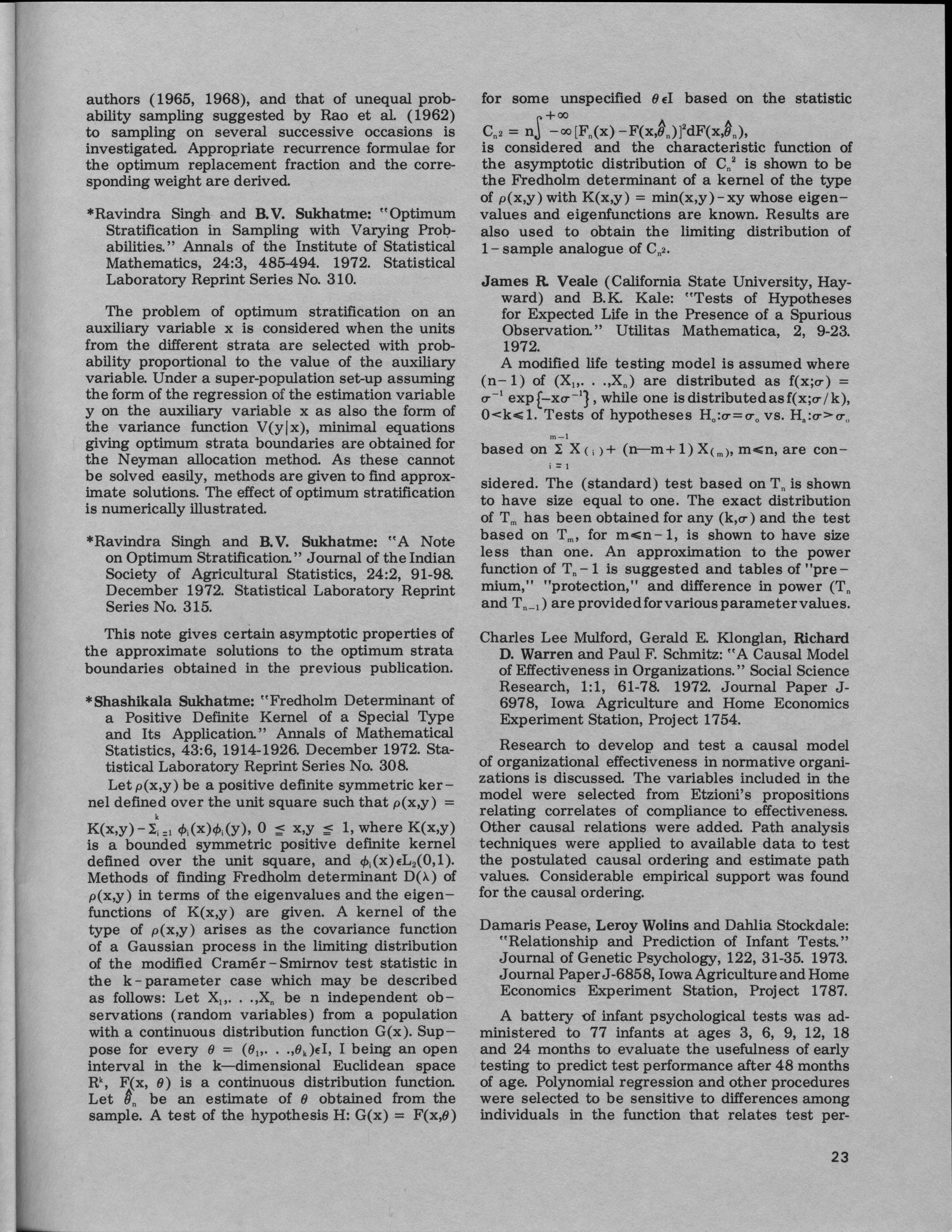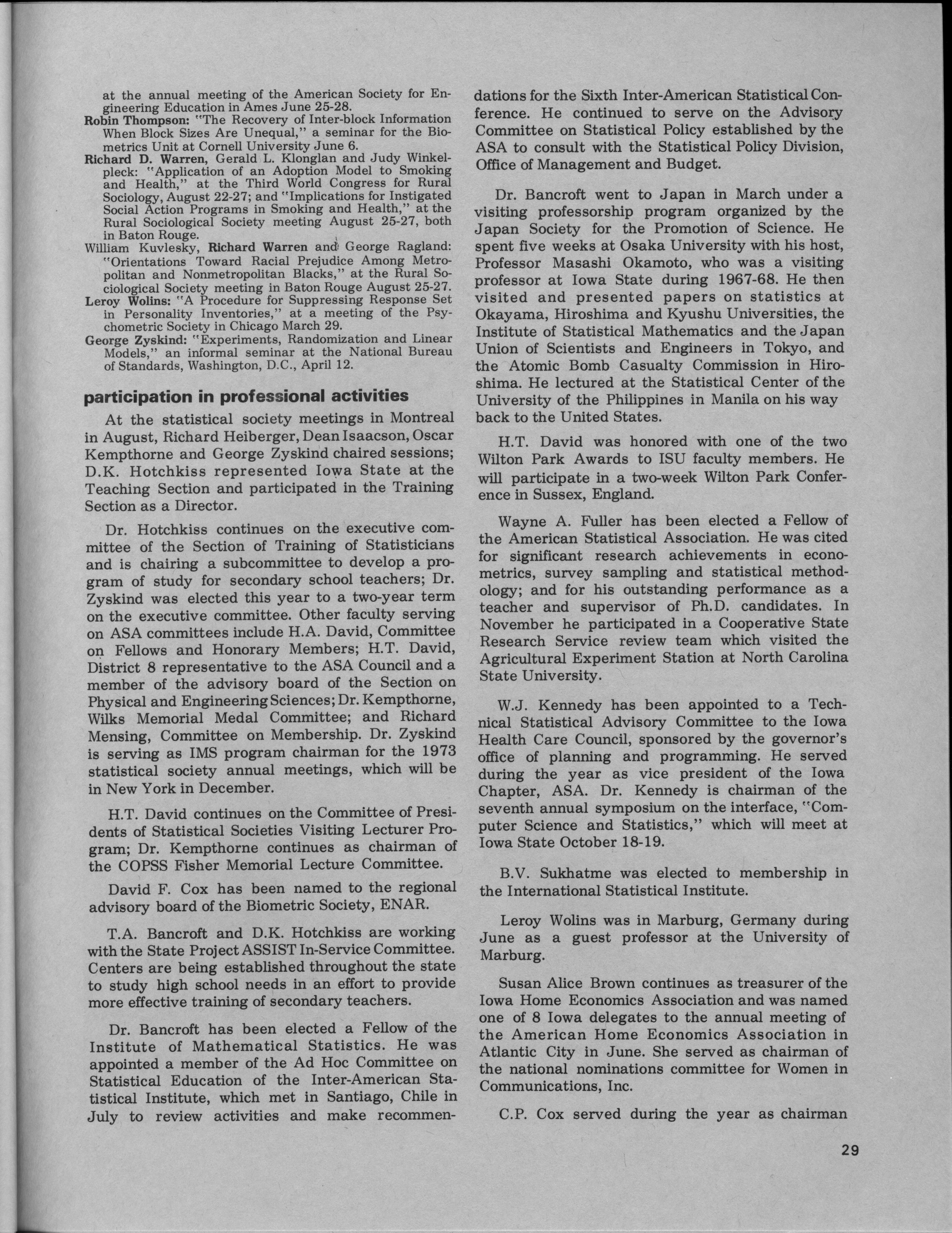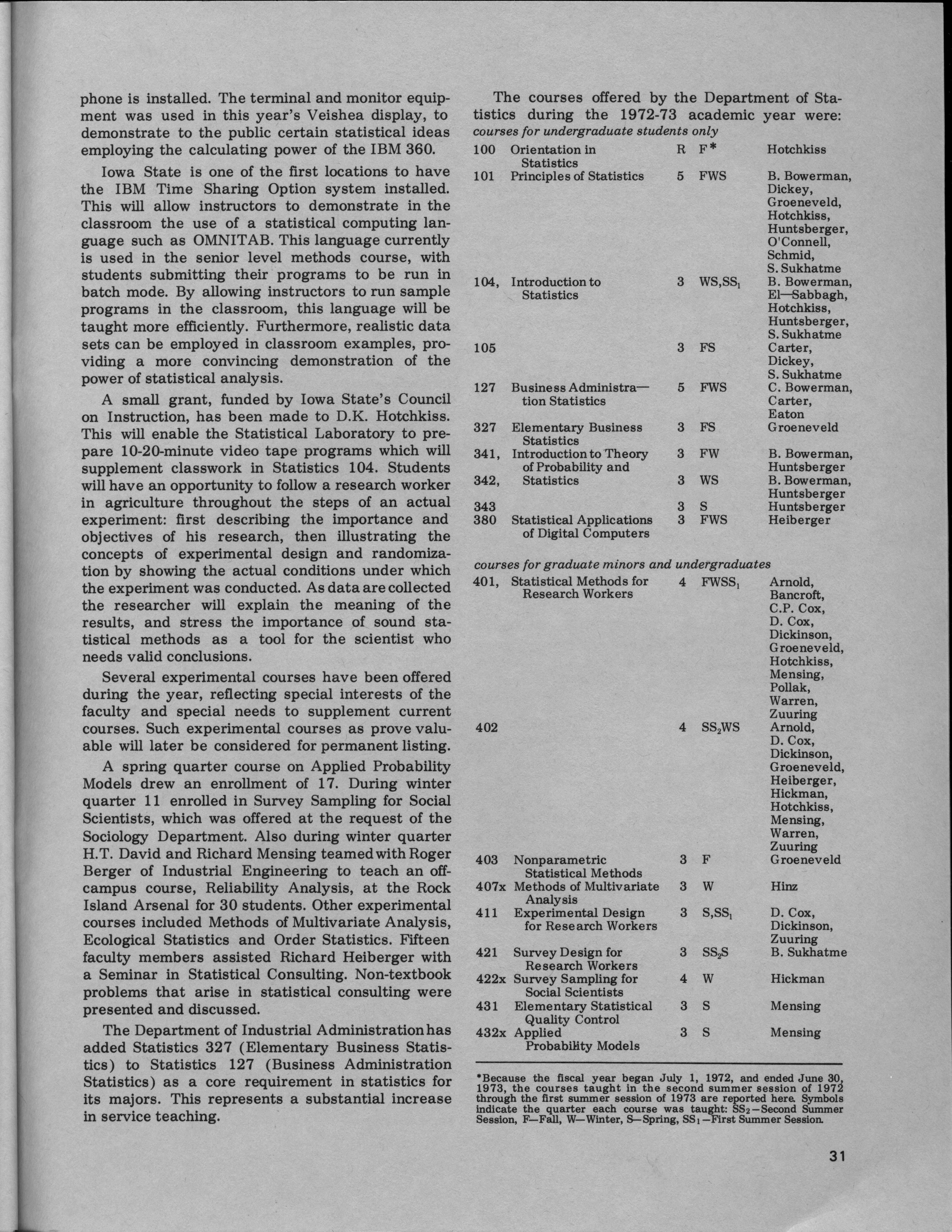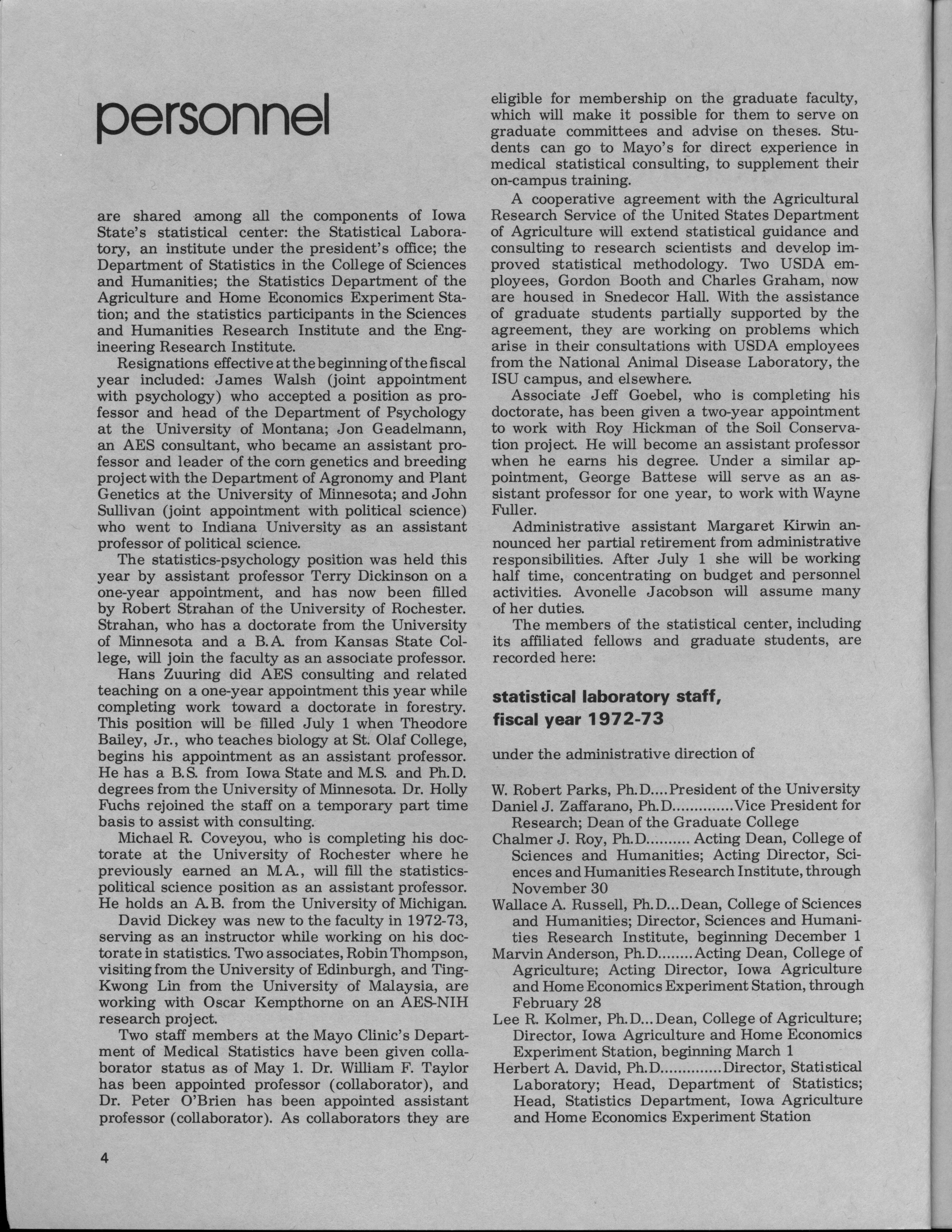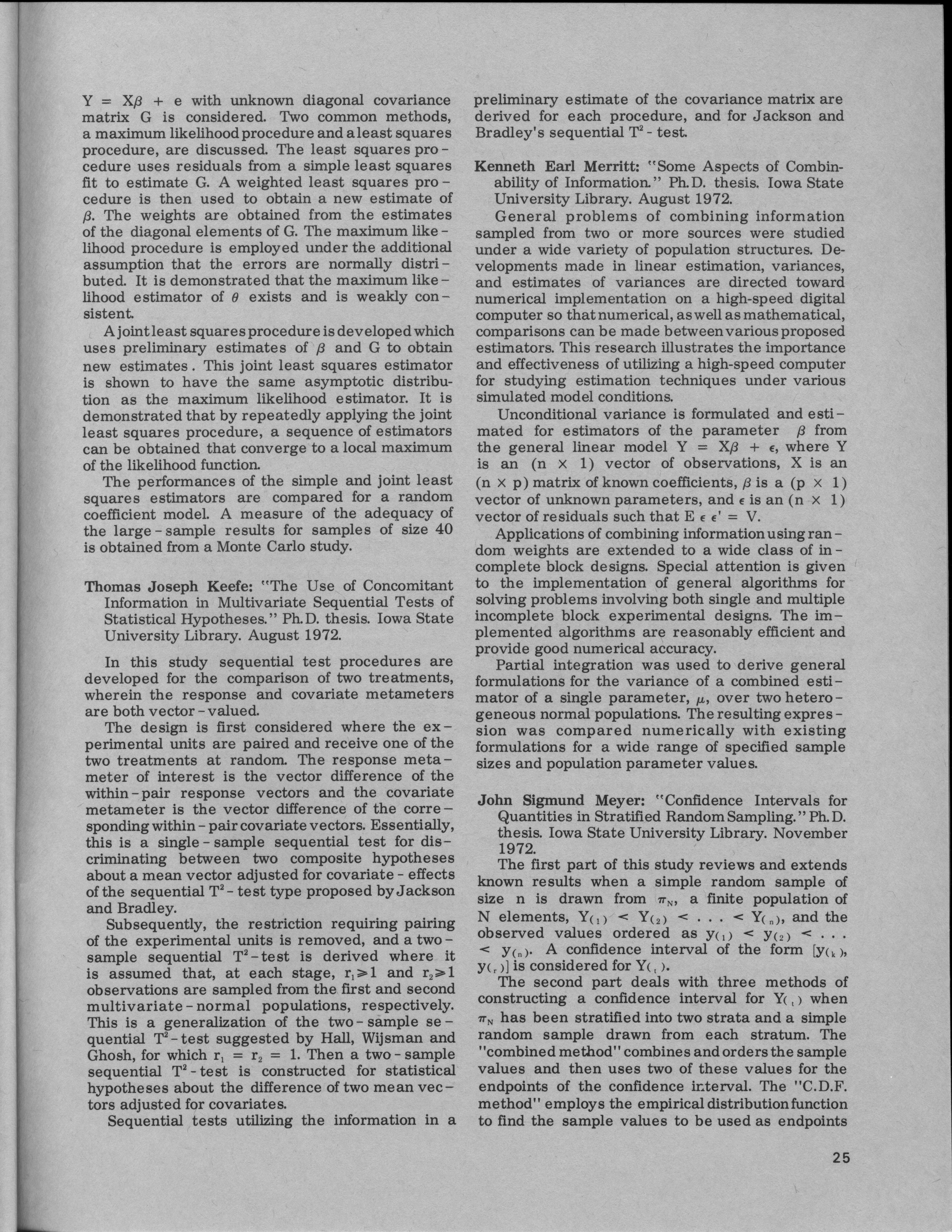 - "Statistical Laboratory Annual Report, July 1, 1972 to June 30, 1973", Iowa State University Statistical Laboratory Annual Reports, Iowa State University Library Digital Collections