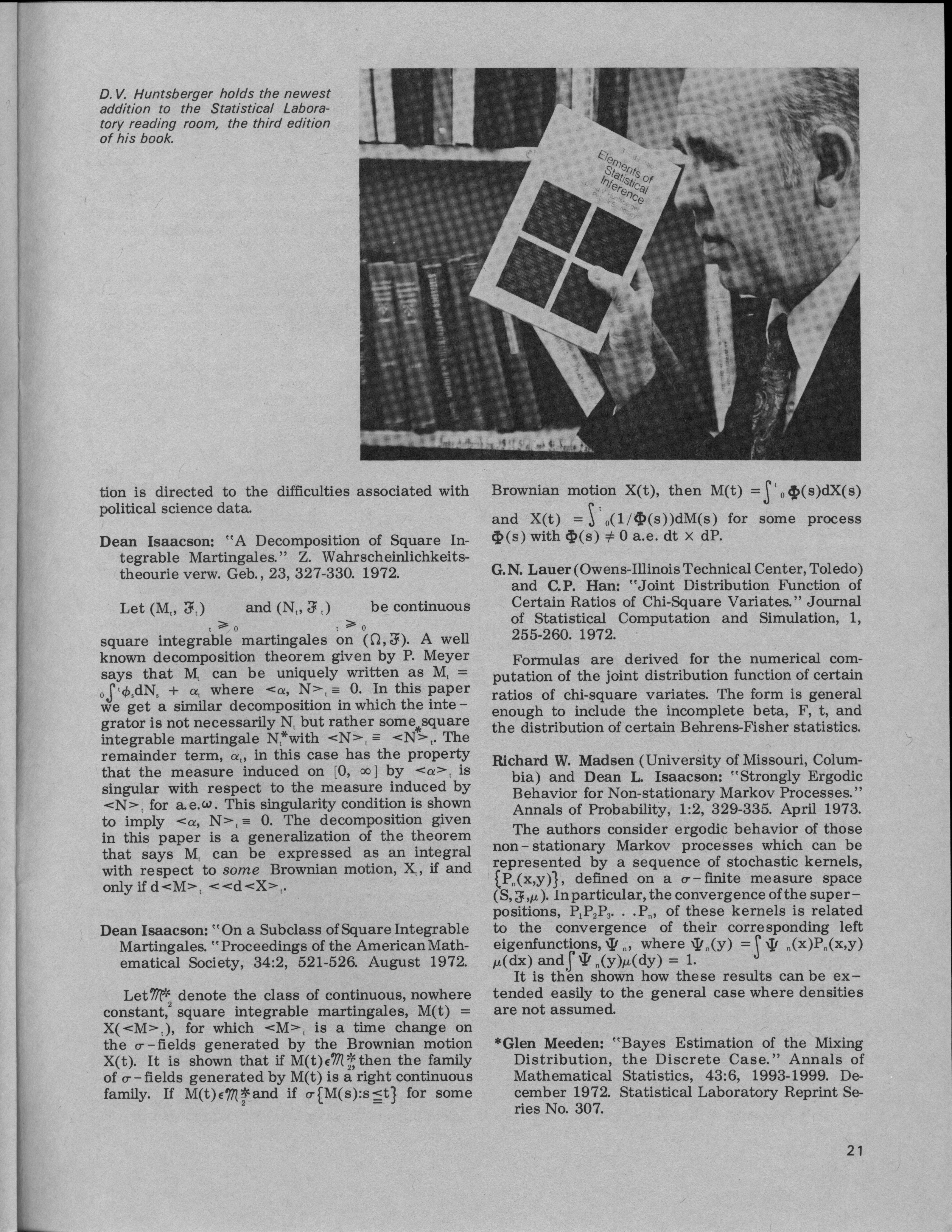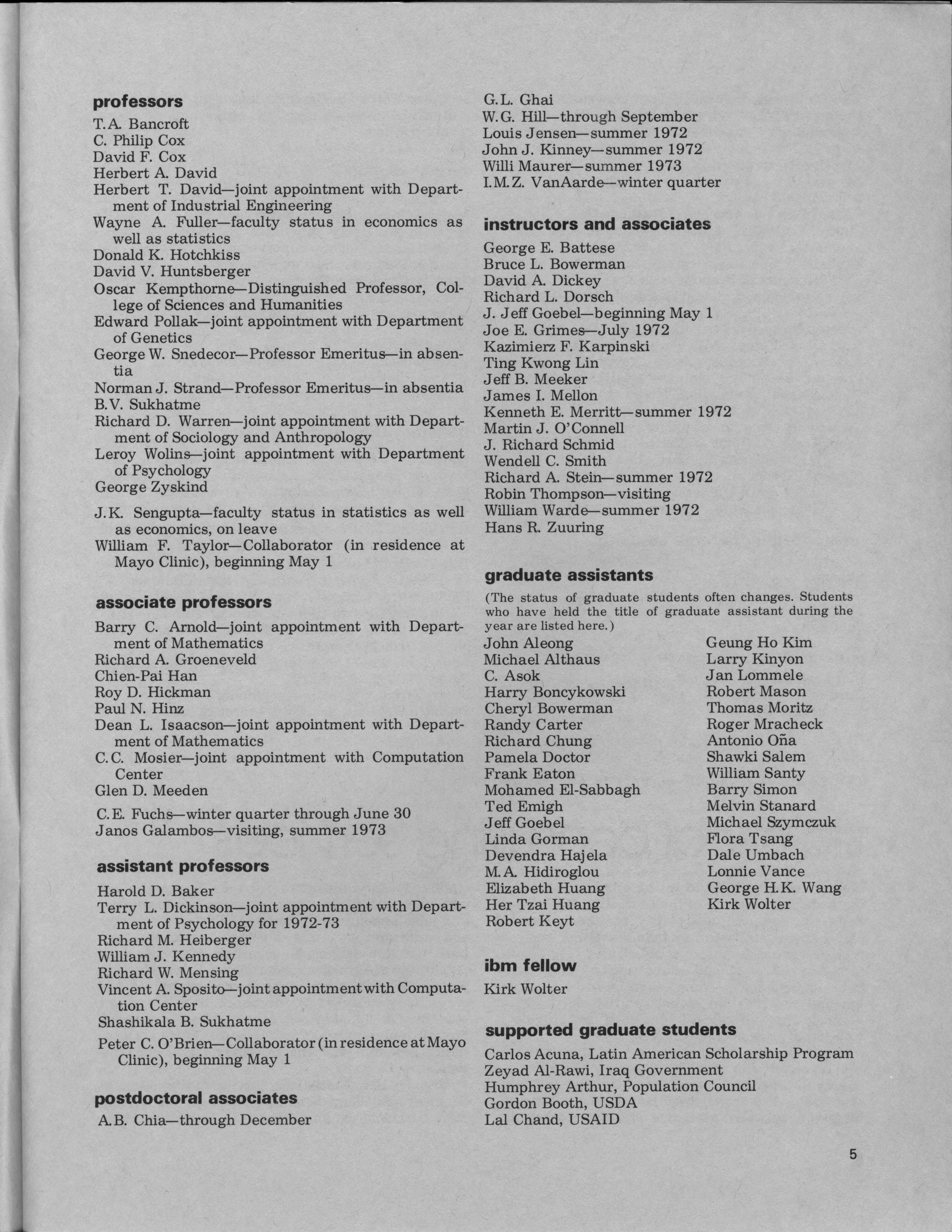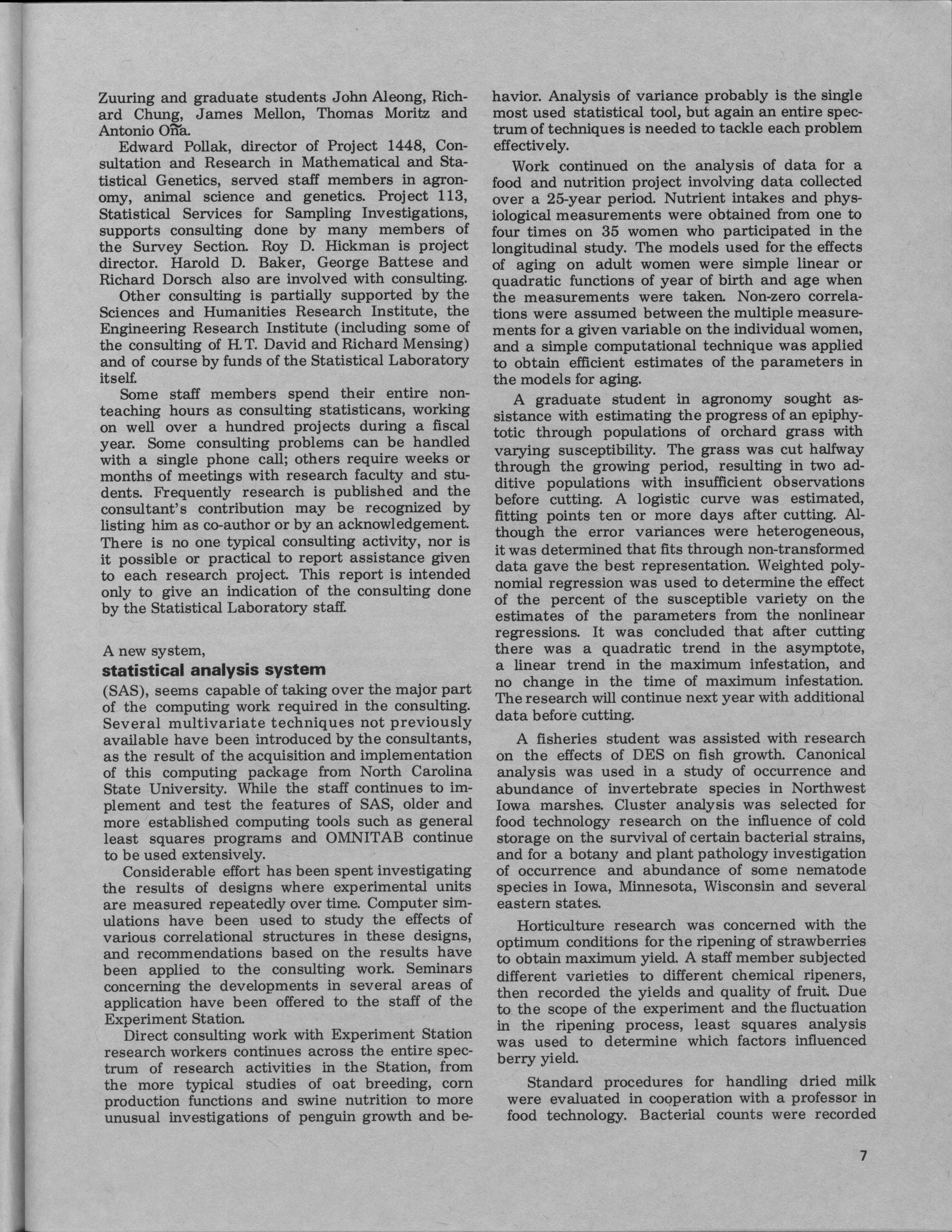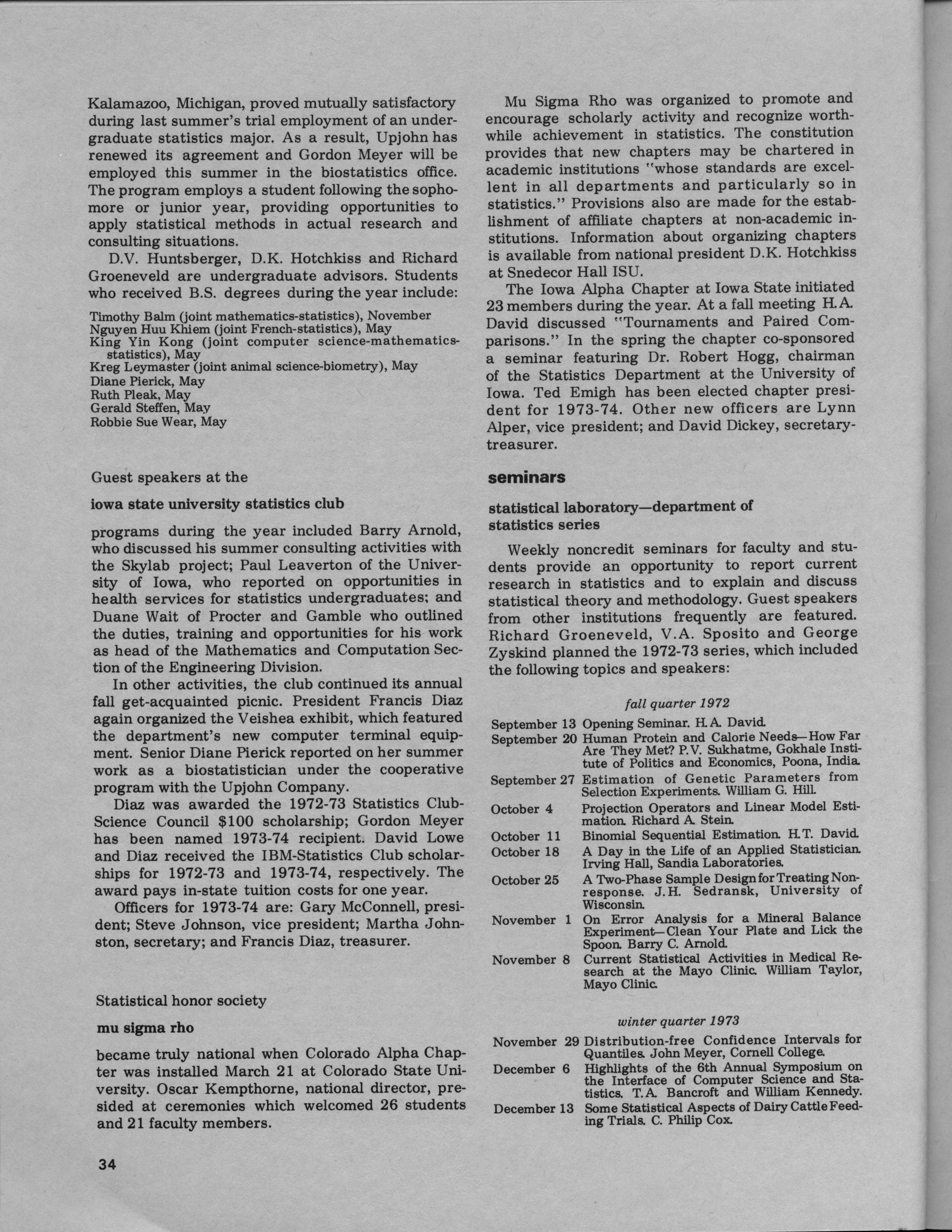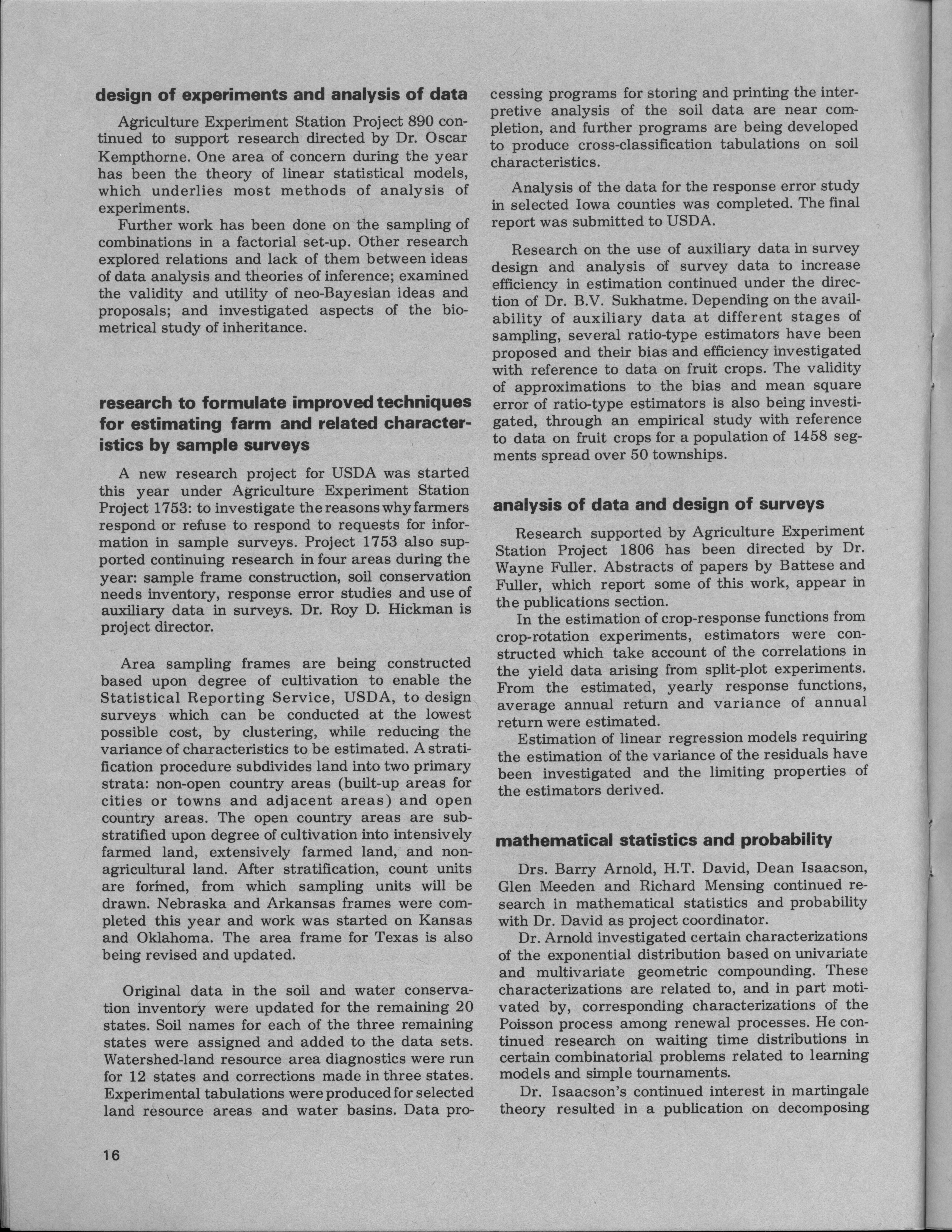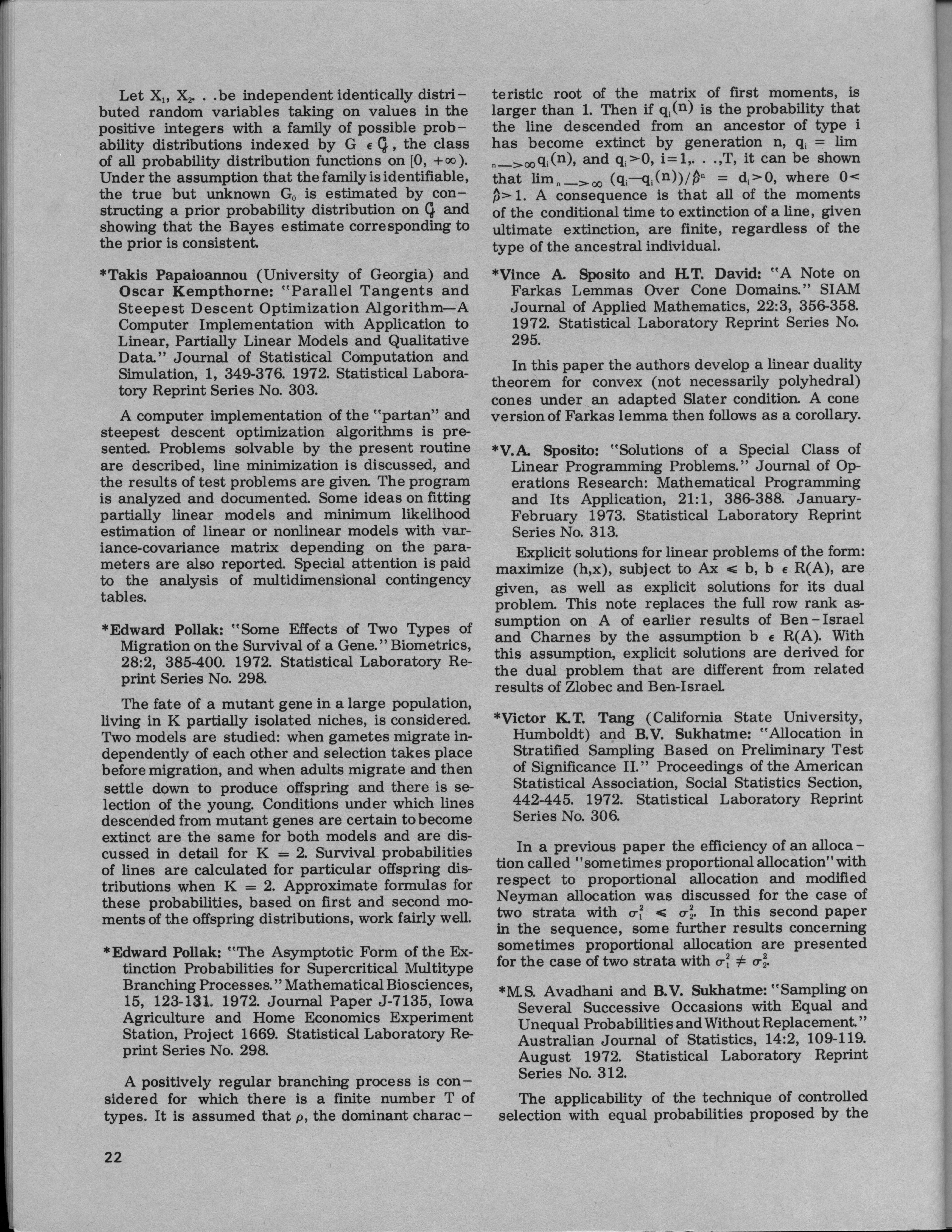 - "Statistical Laboratory Annual Report, July 1, 1972 to June 30, 1973", Iowa State University Statistical Laboratory Annual Reports, Iowa State University Library Digital Collections