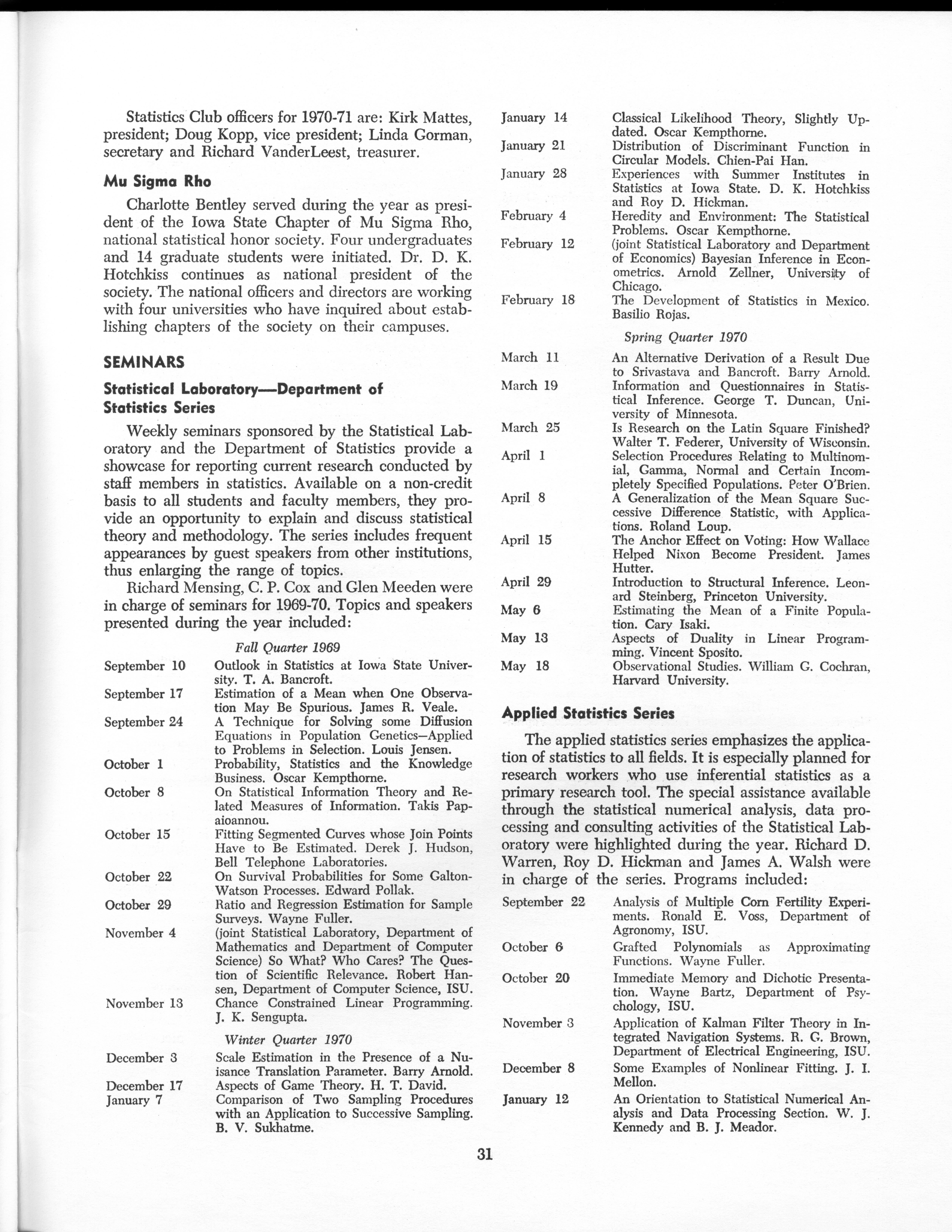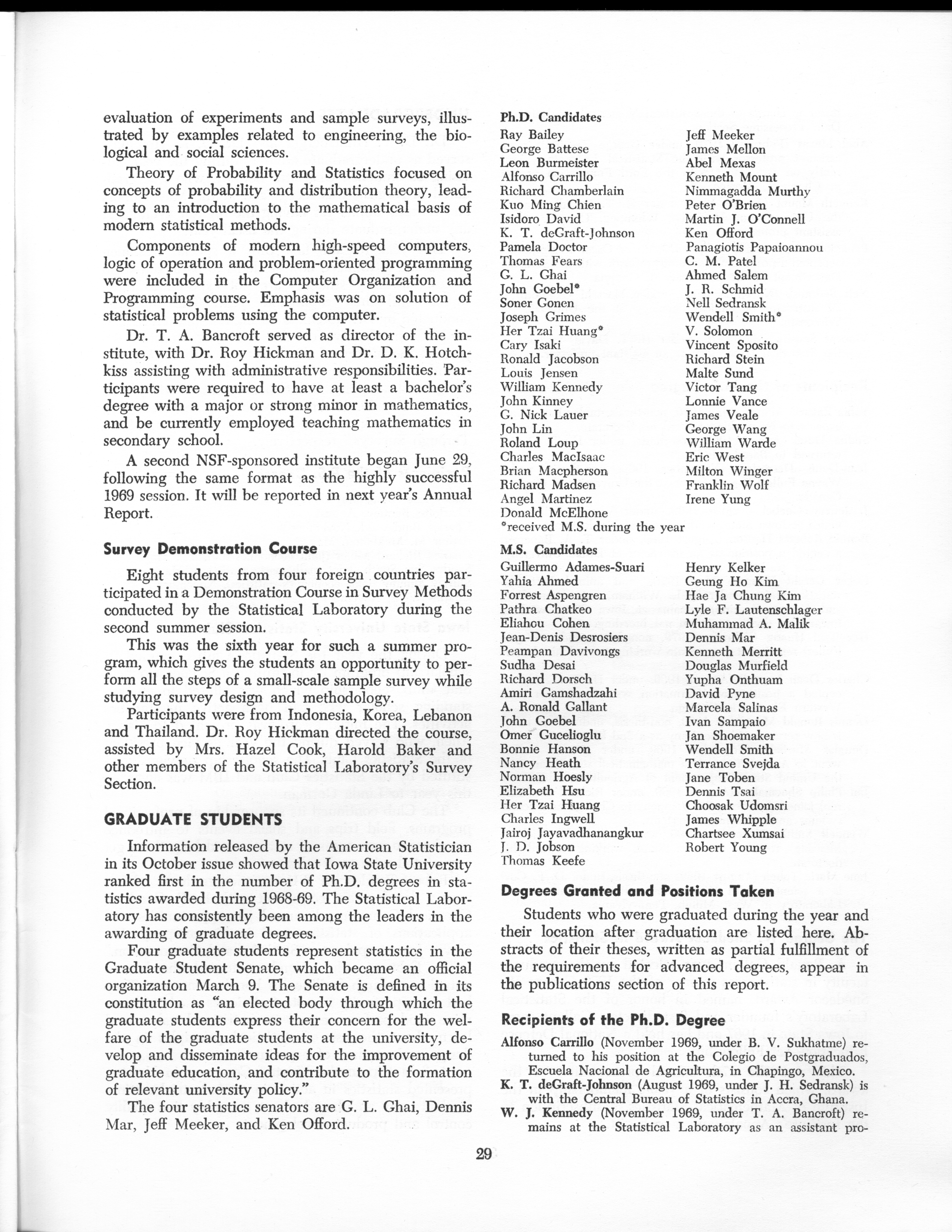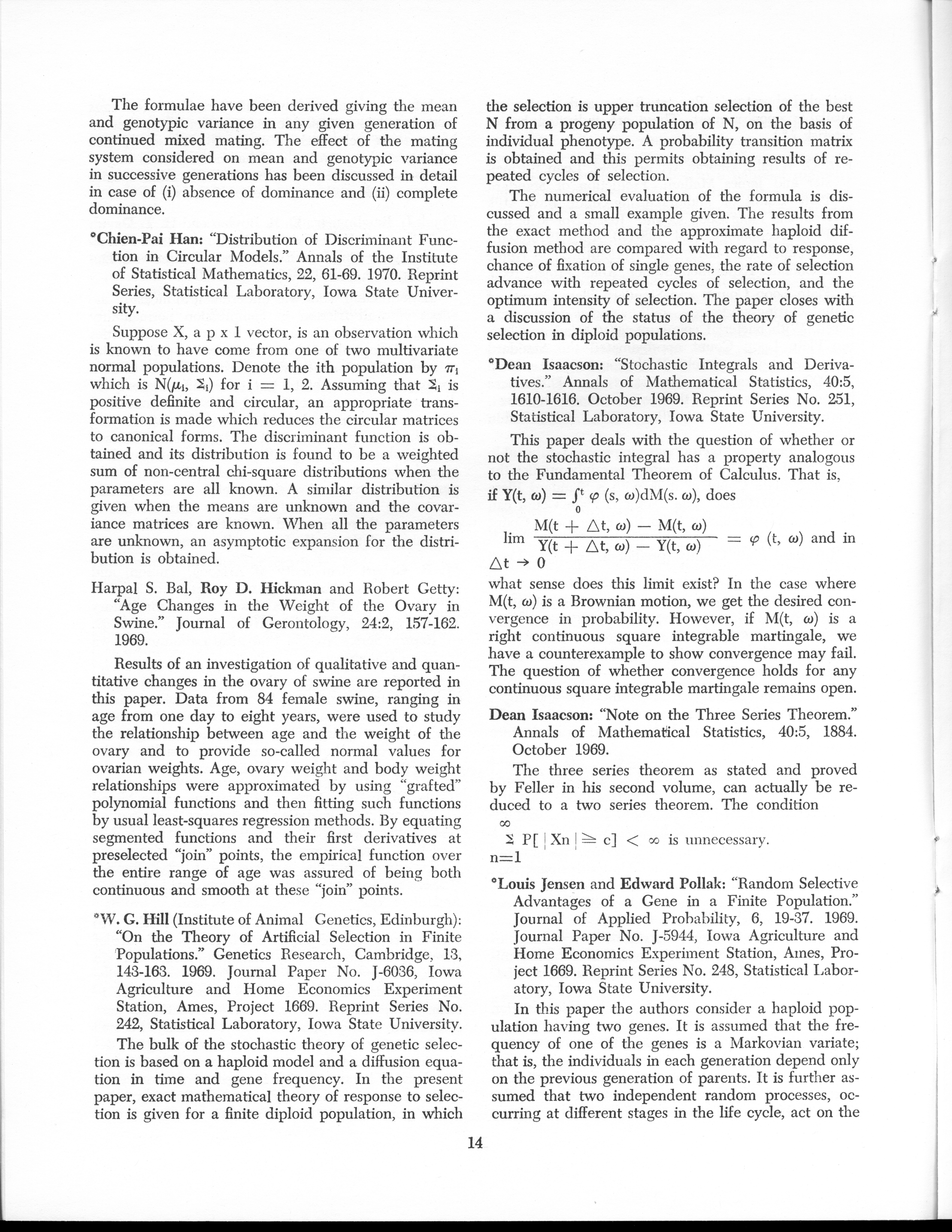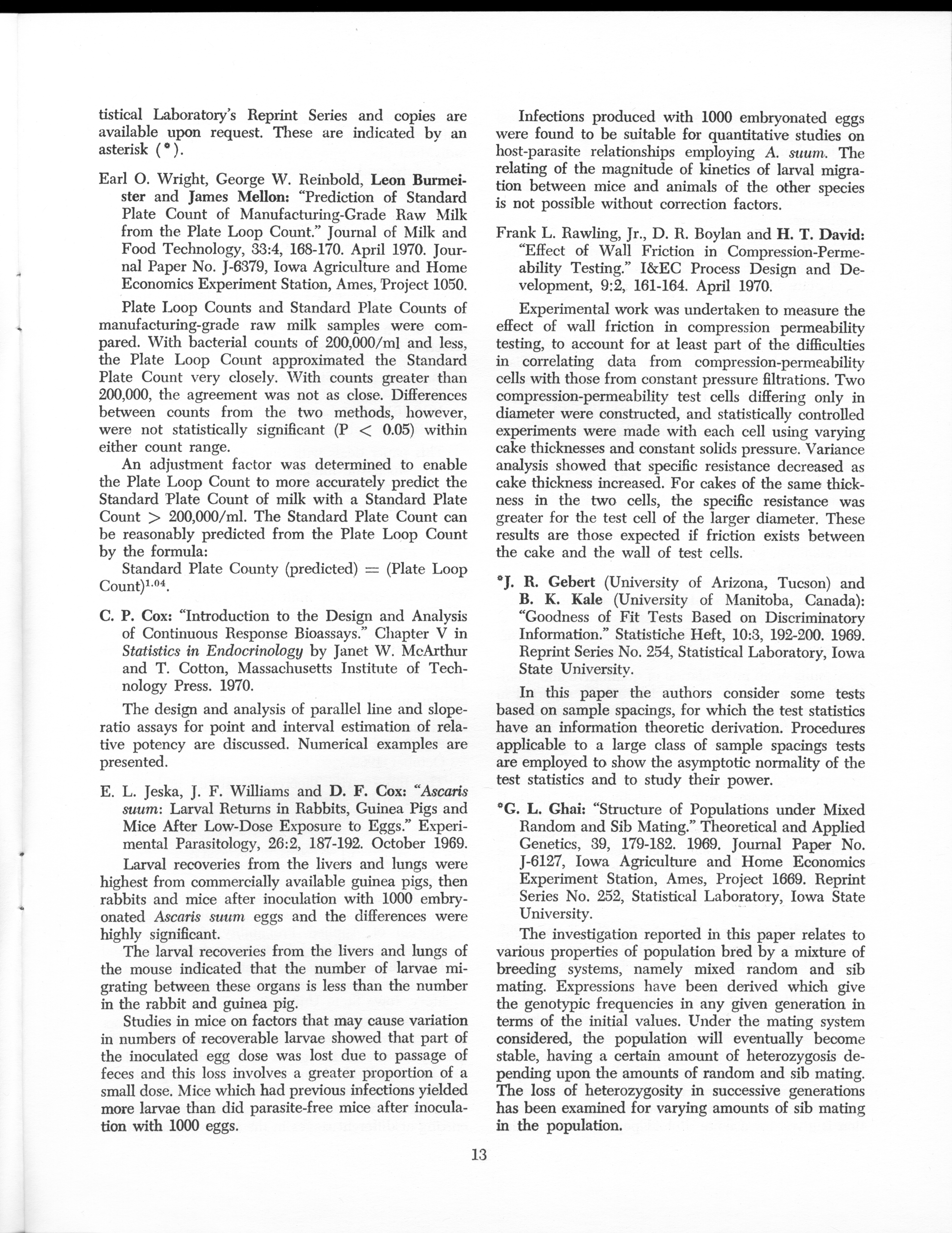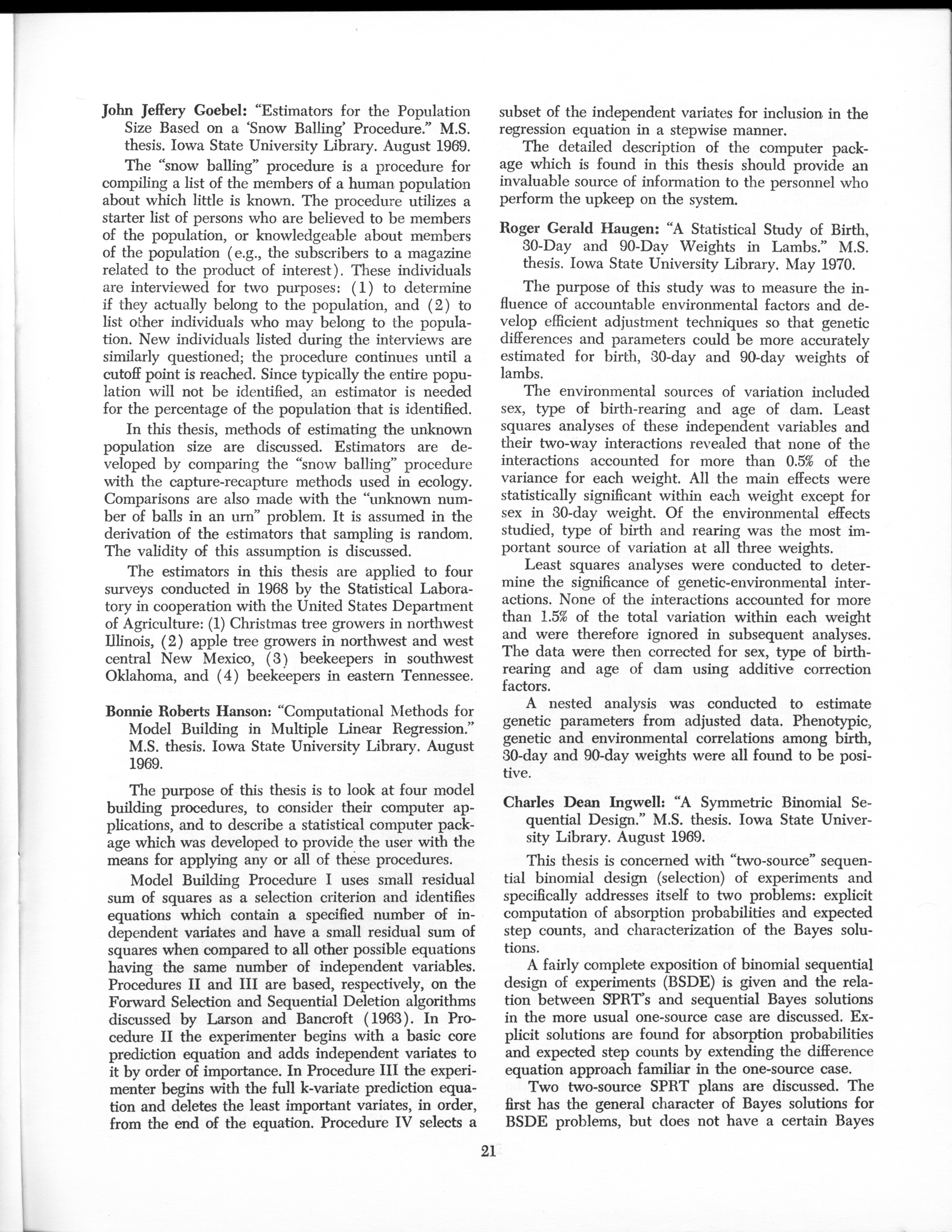 - "Statistical Laboratory Annual Report, July 1, 1969 to June 30, 1970", Iowa State University Statistical Laboratory Annual Reports, Iowa State University Library Digital Collections
