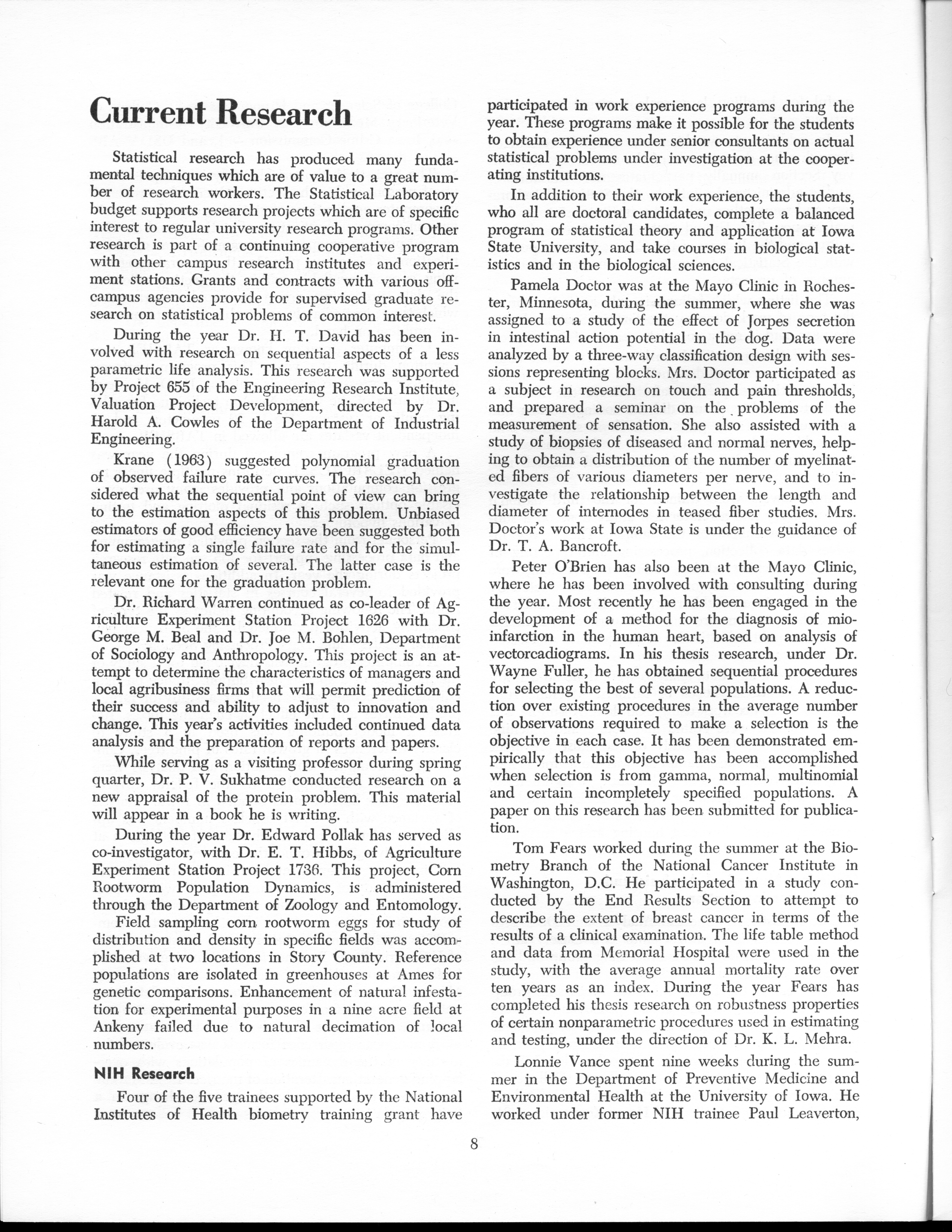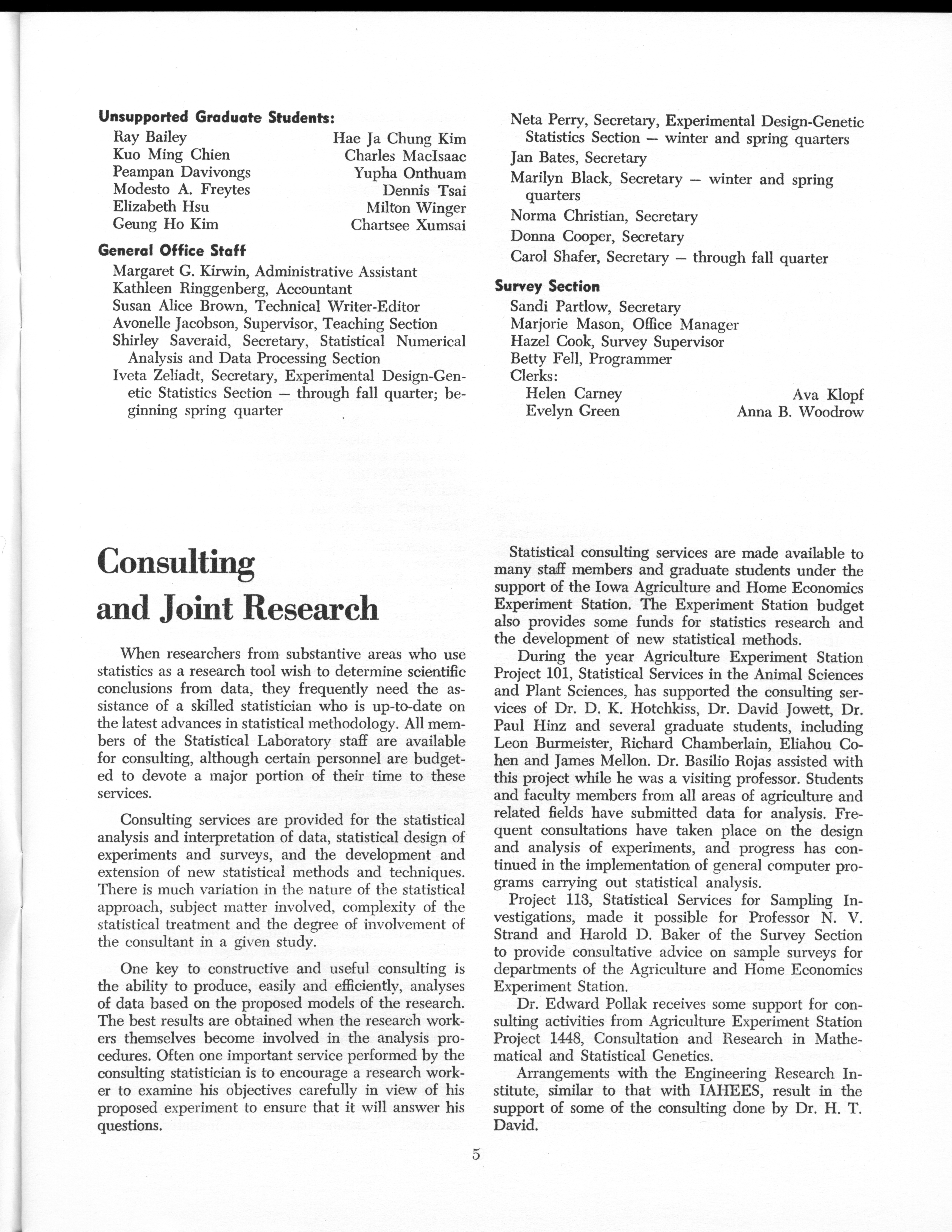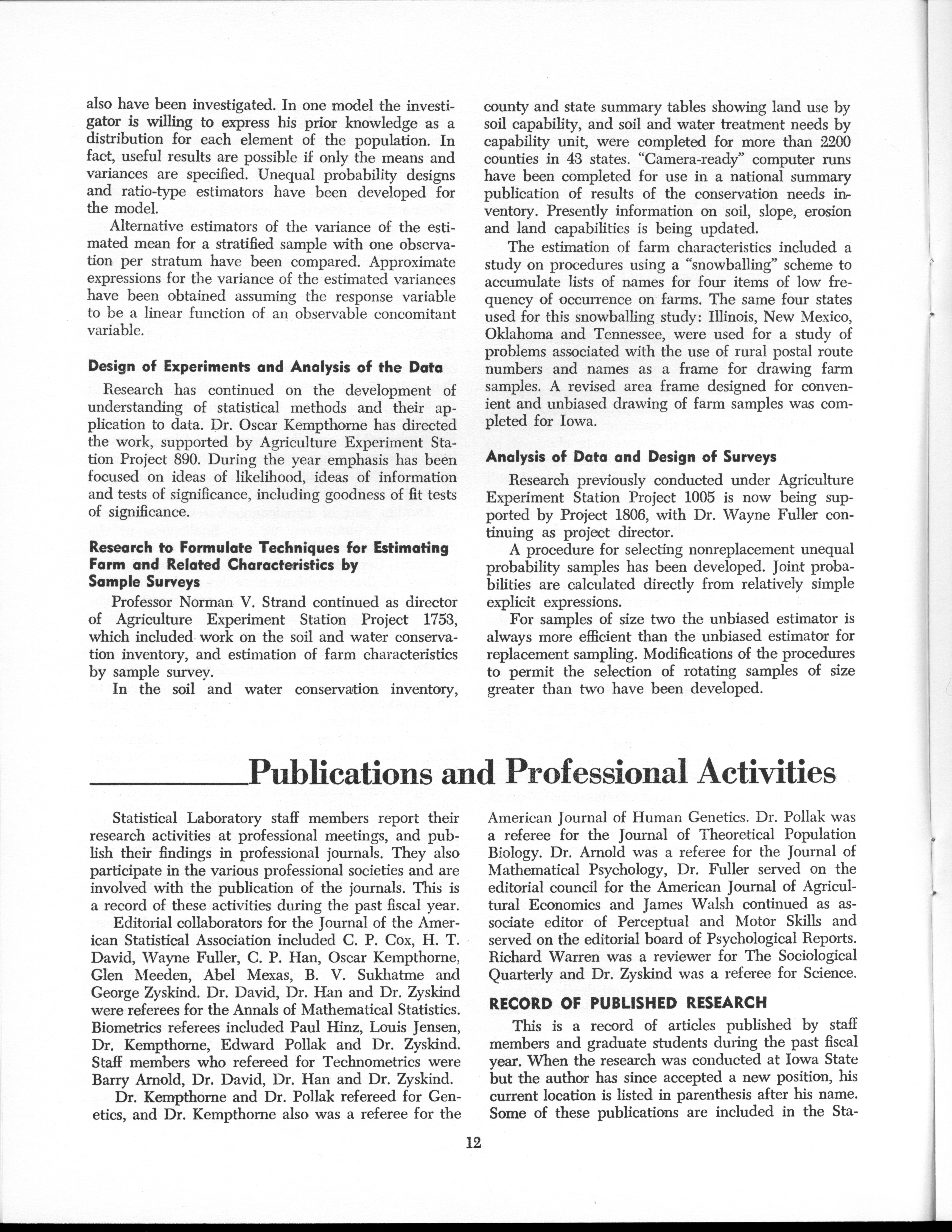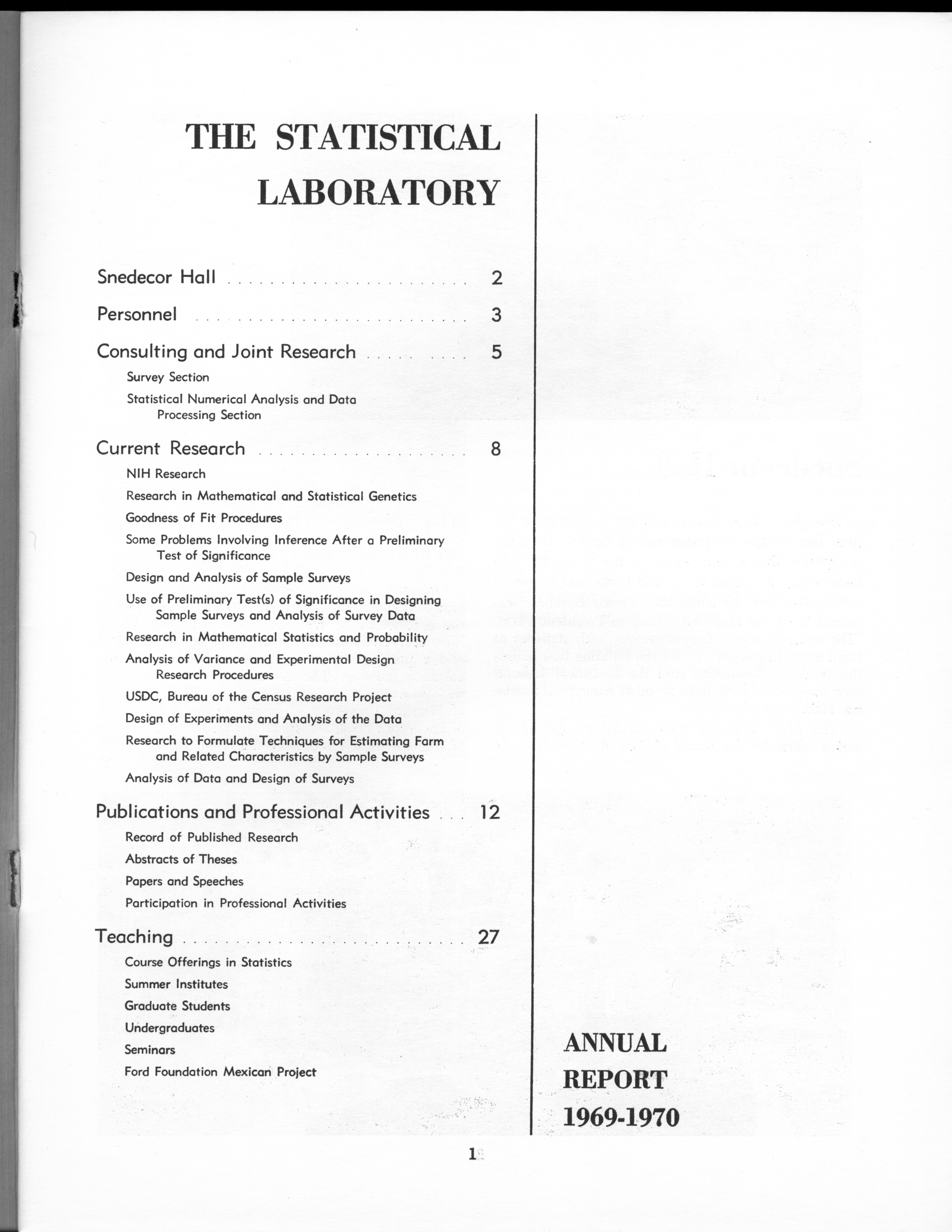 - Contents: Snedecor Hall -- Personnel -- Consulting and Joint Research -- Current Research -- Publications and Professional Activities -- Teaching