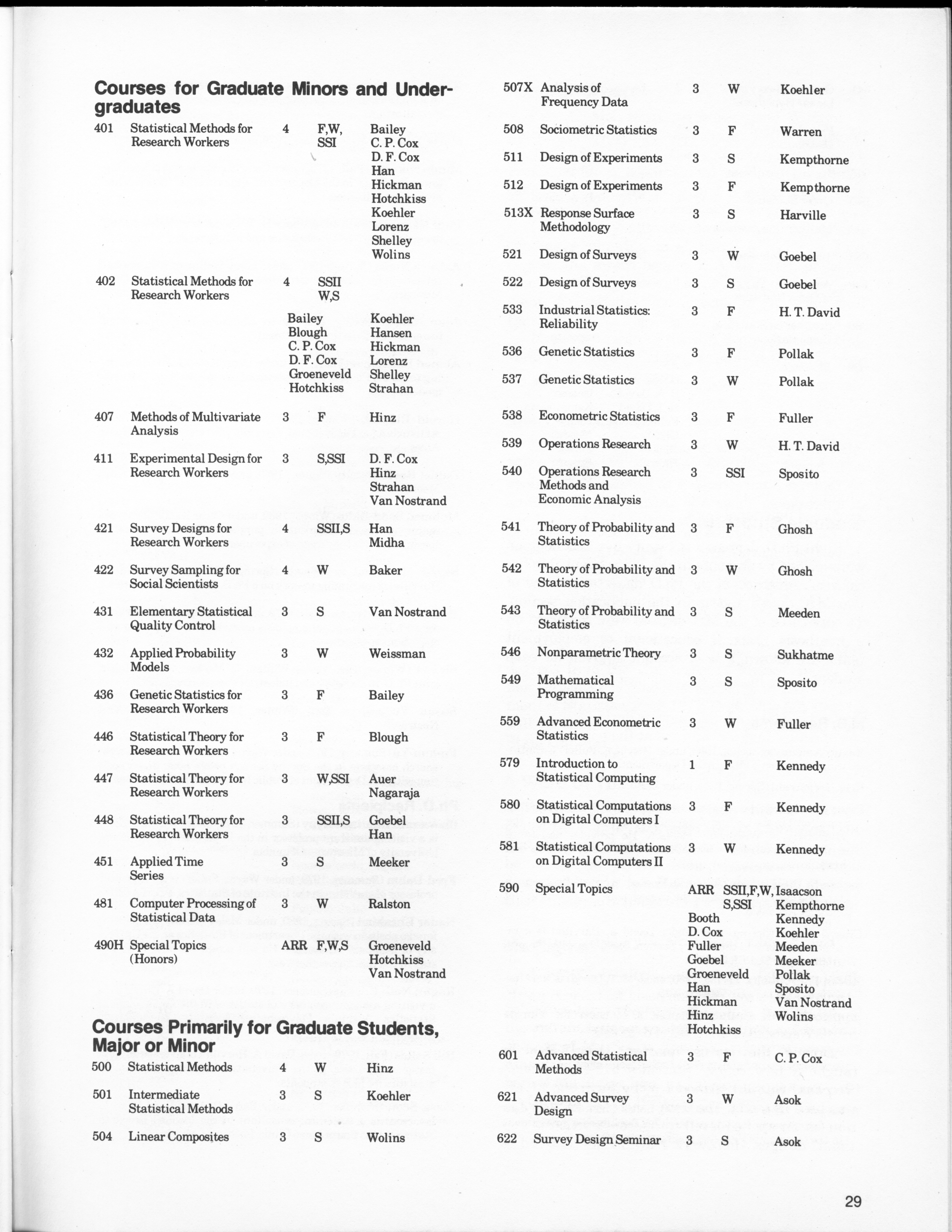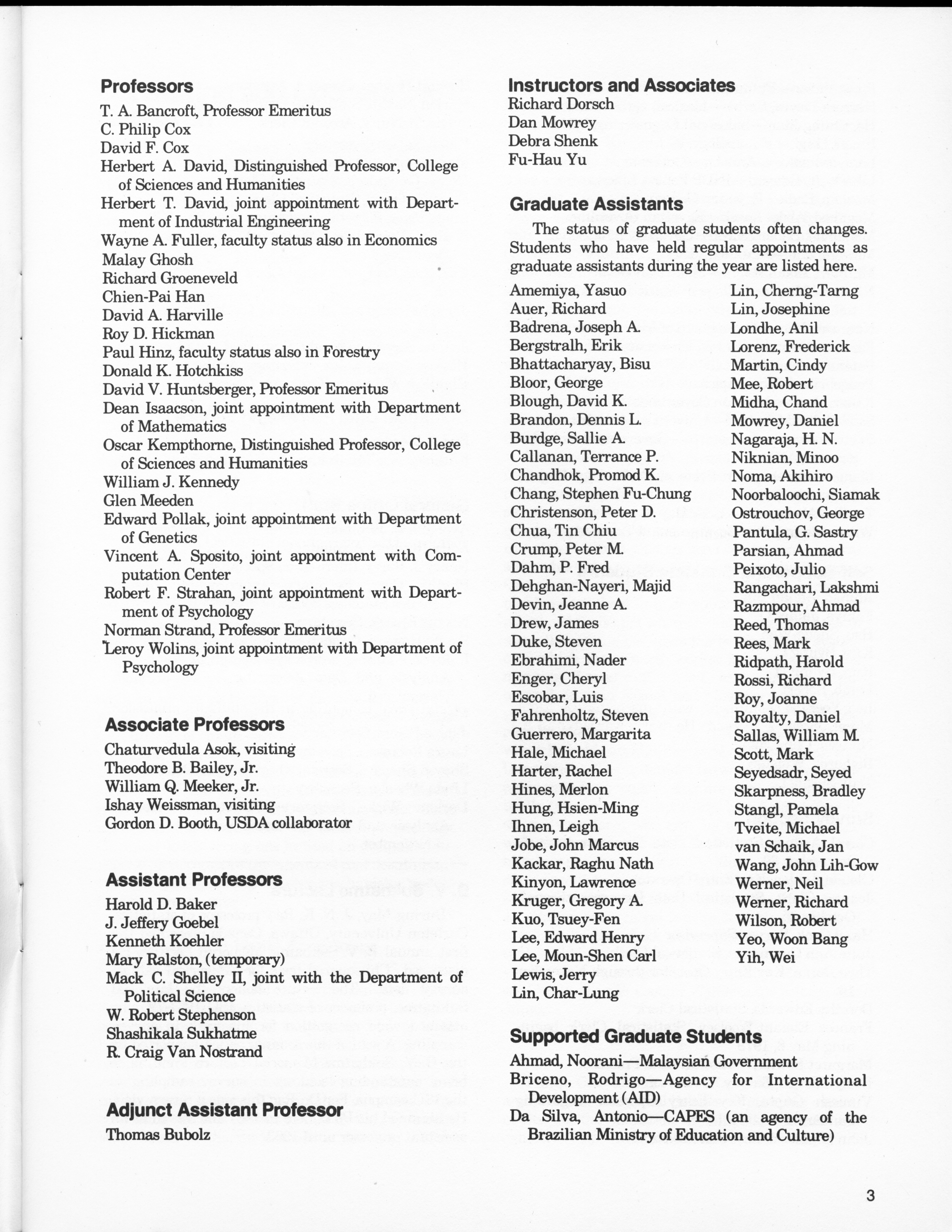 - Contents: Personnel -- Consulting and Cooperative Research -- Current Research -- Professional Activities: Papers, Lectures, Seminars -- Publications and Dissertation abstracts: Published Research, Dissertation Abstracts -- Department of Statistics: Graduate Students, Undergraduates, Seminars -- In Memoriam: Sidney Addelman, Leon Jordan Filho, William G. Cochran
