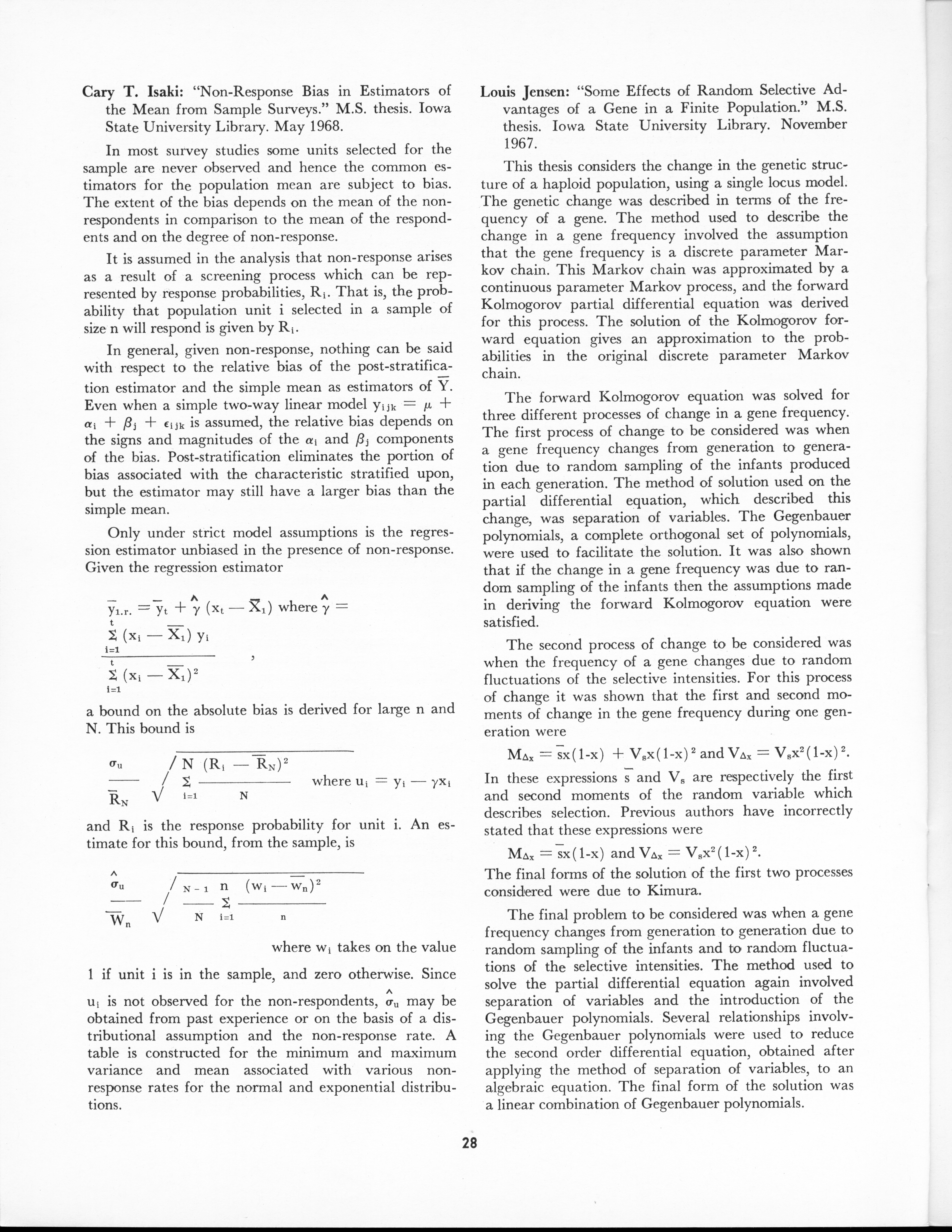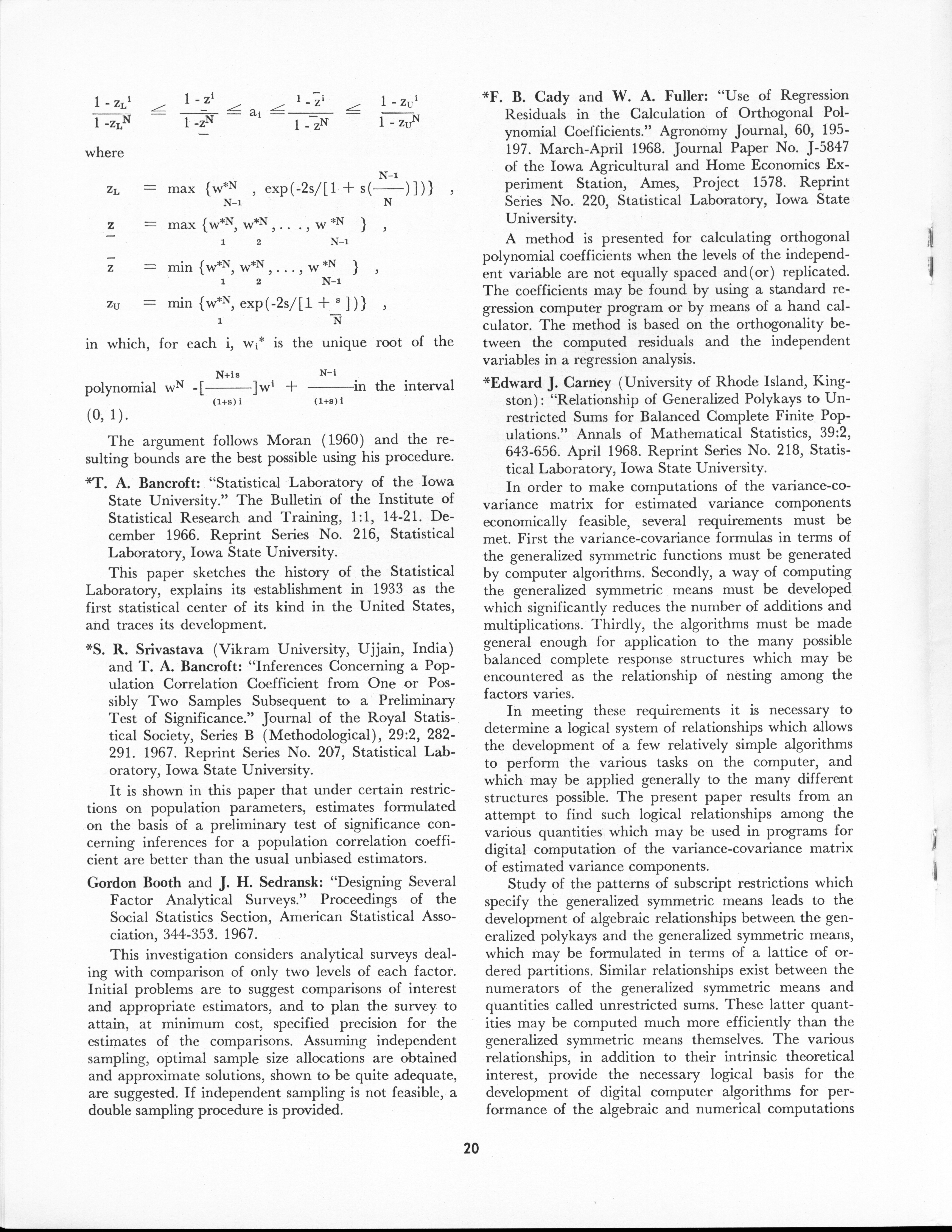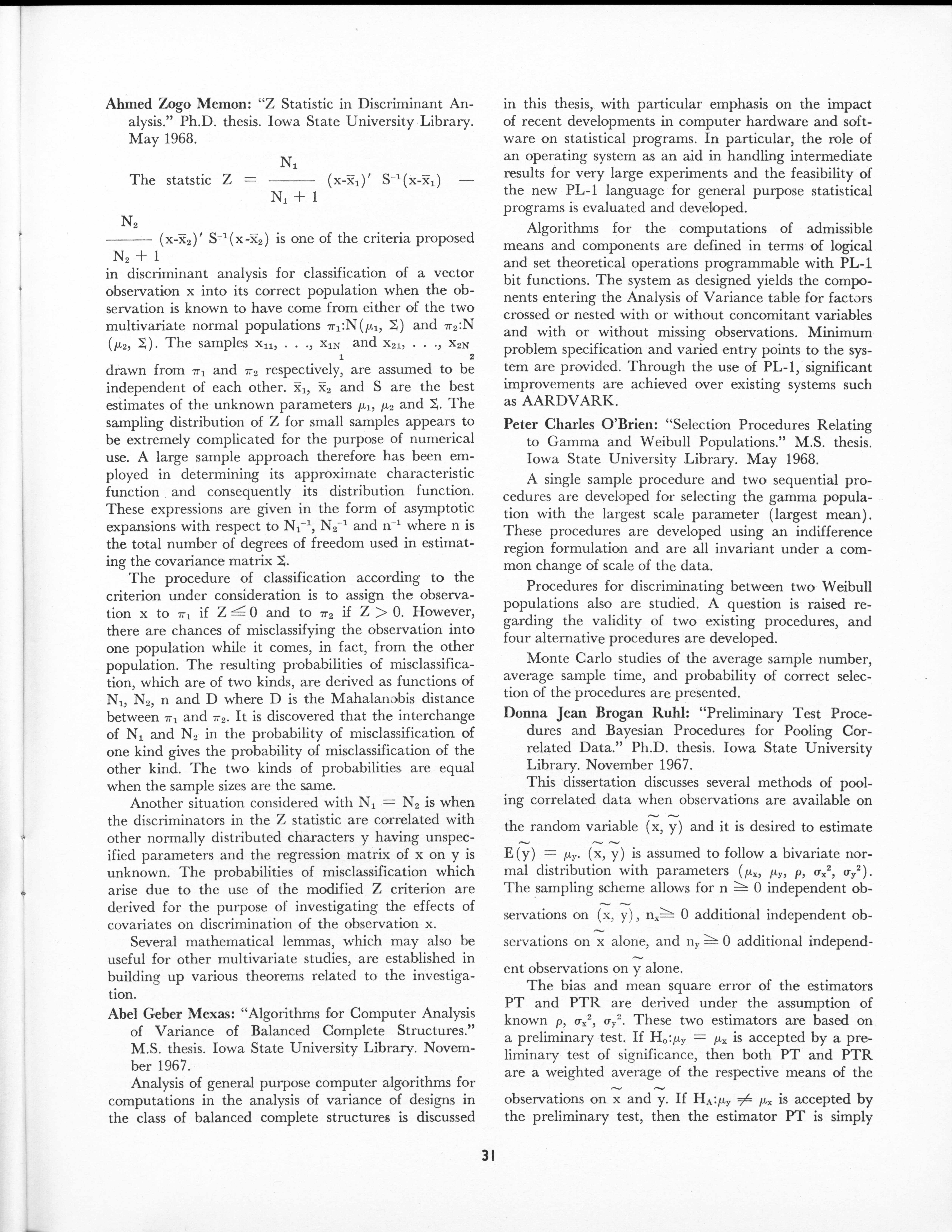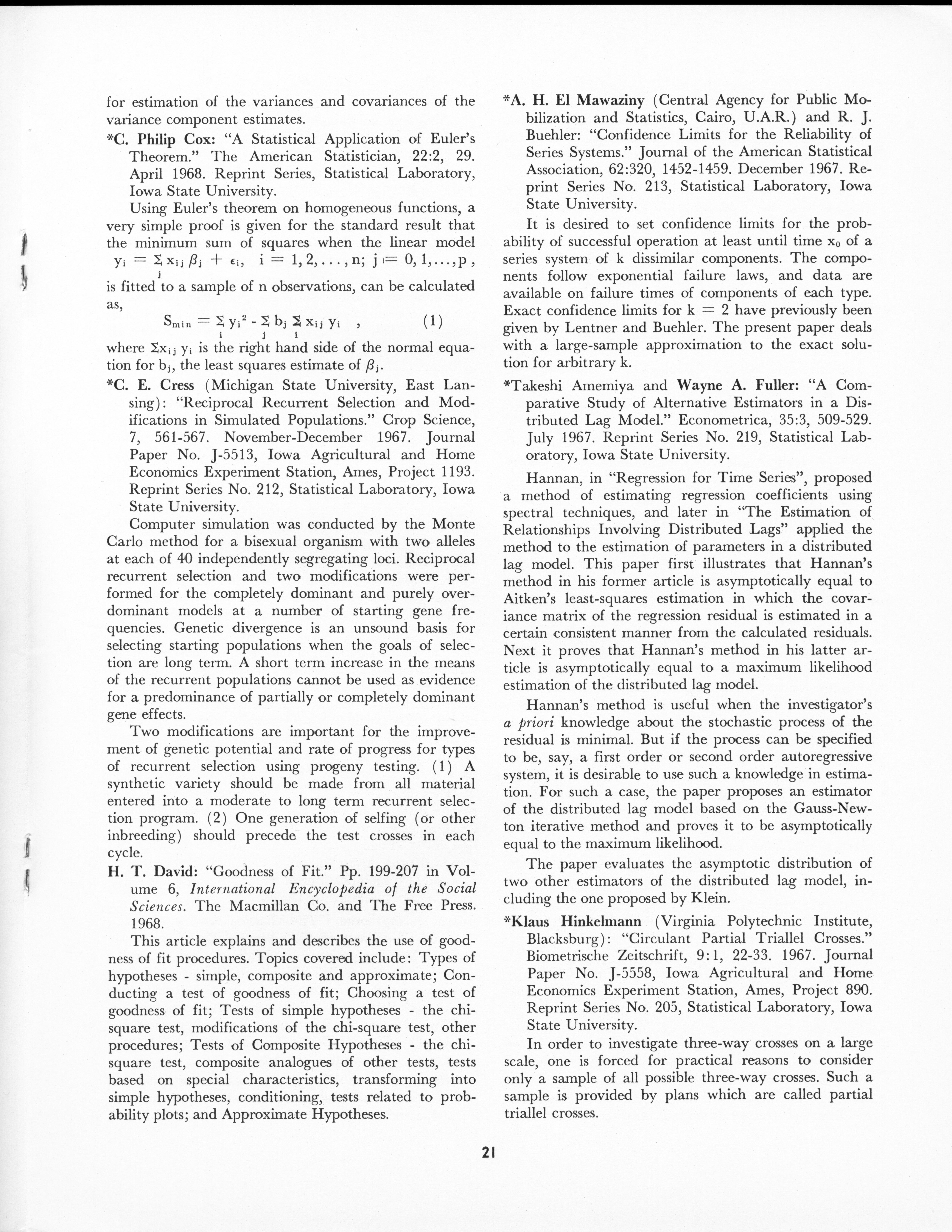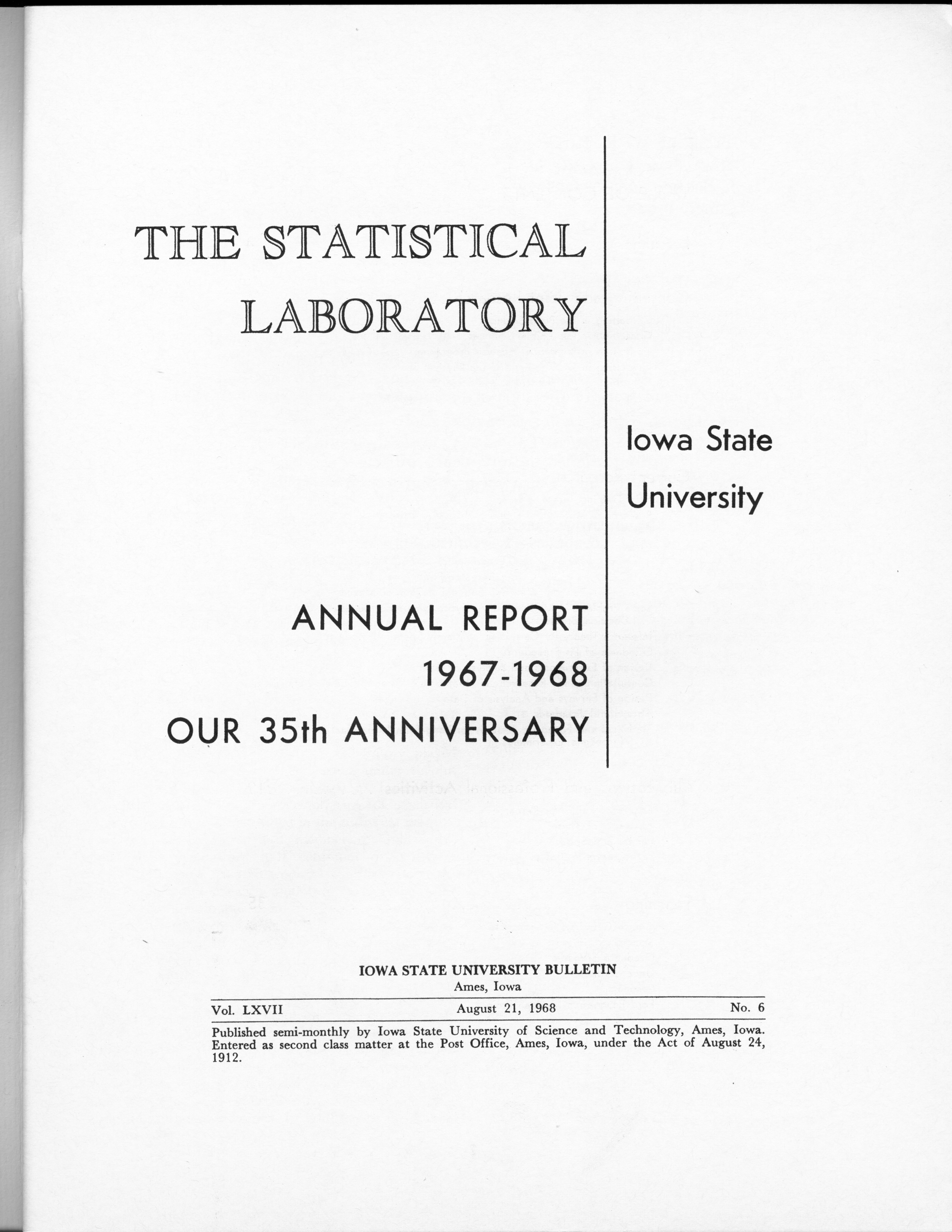 - "Statistical Laboratory Annual Report, July 1, 1967 to June 30, 1968", Iowa State University Statistical Laboratory Annual Reports, Iowa State University Library Digital Collections