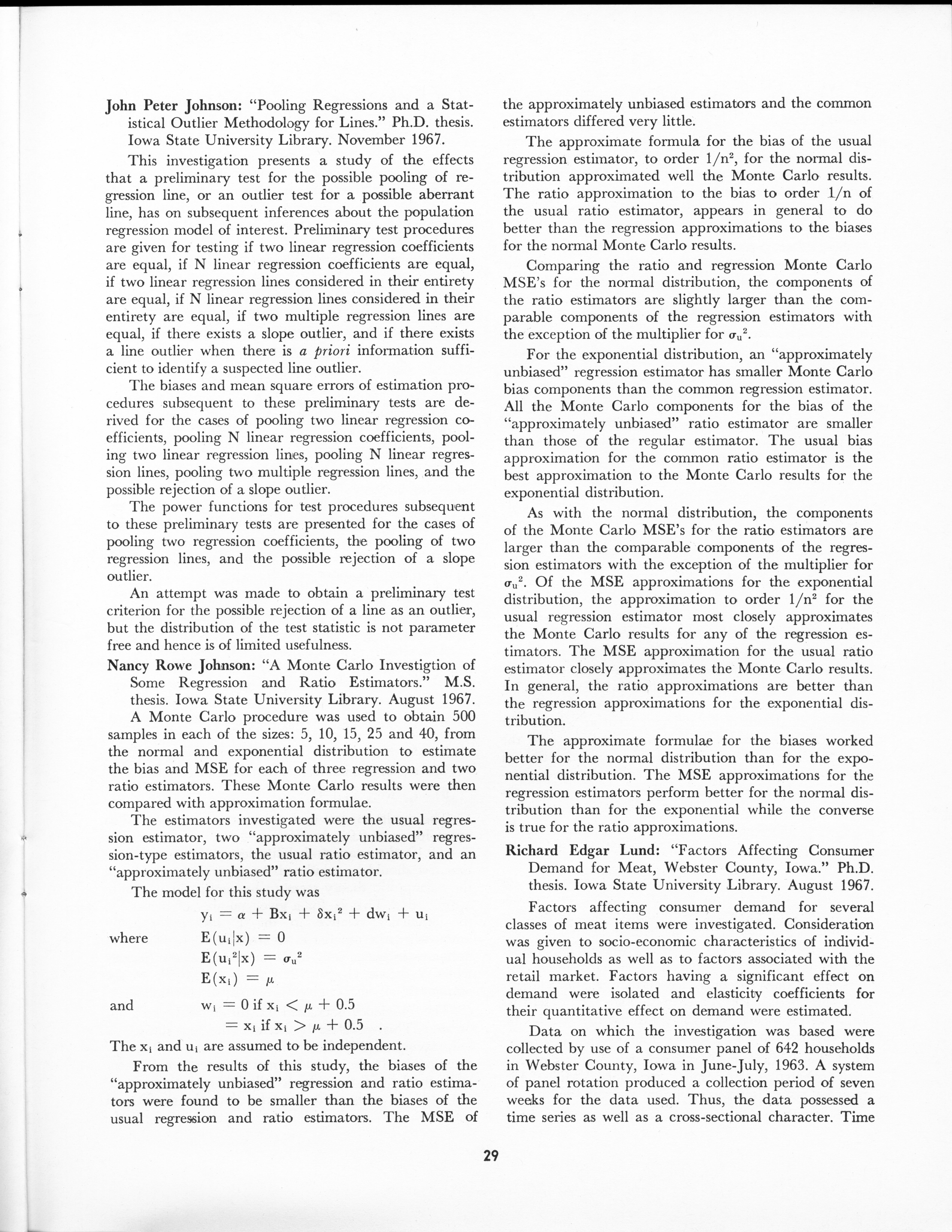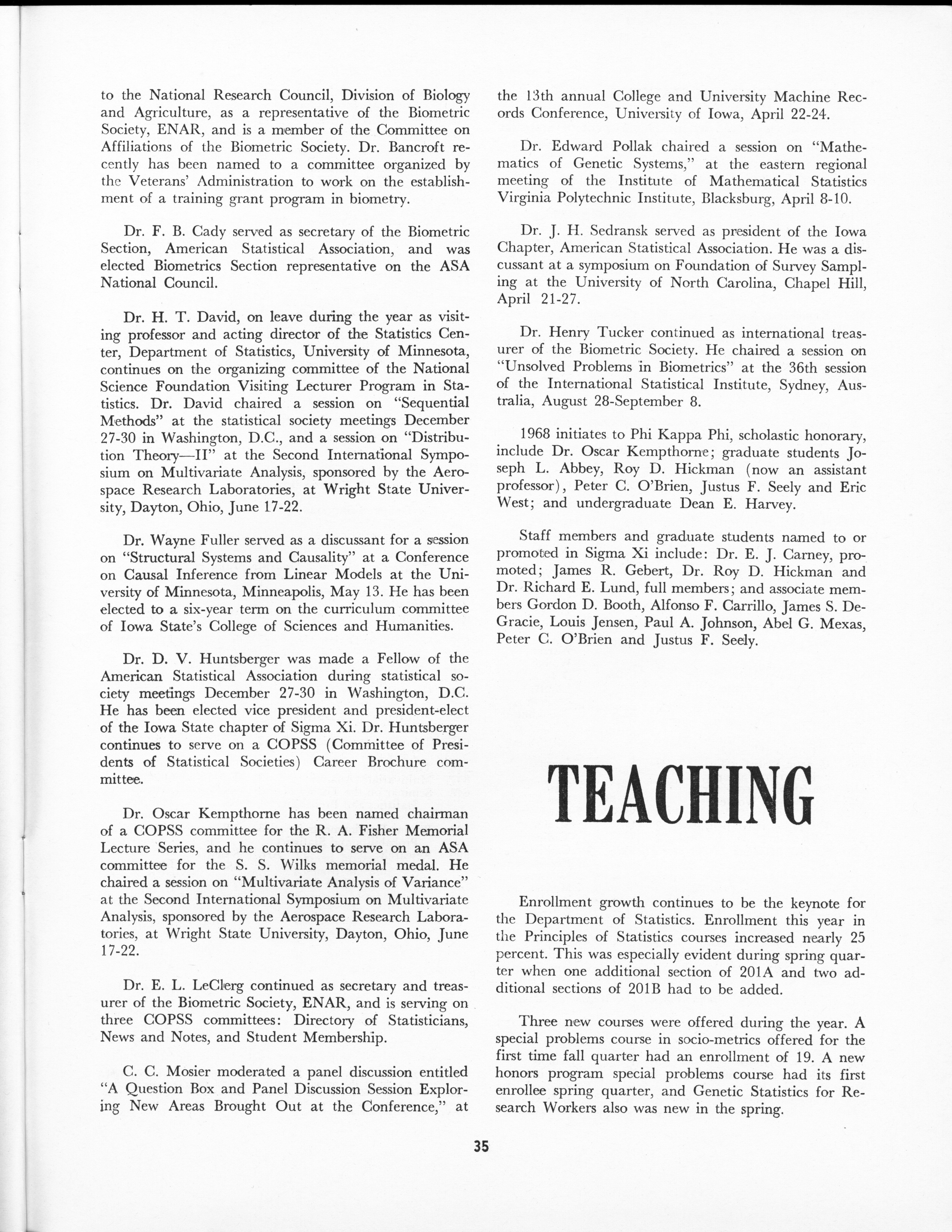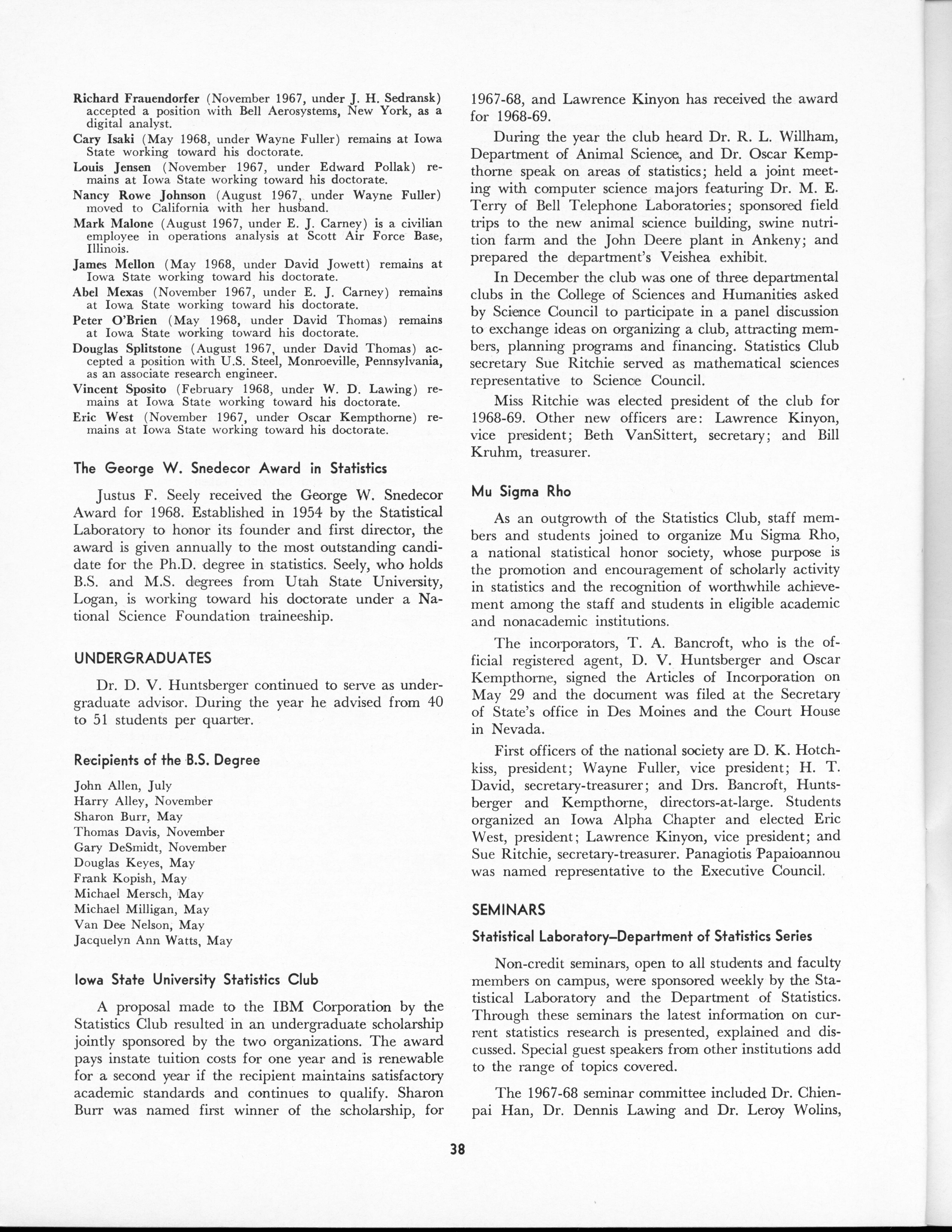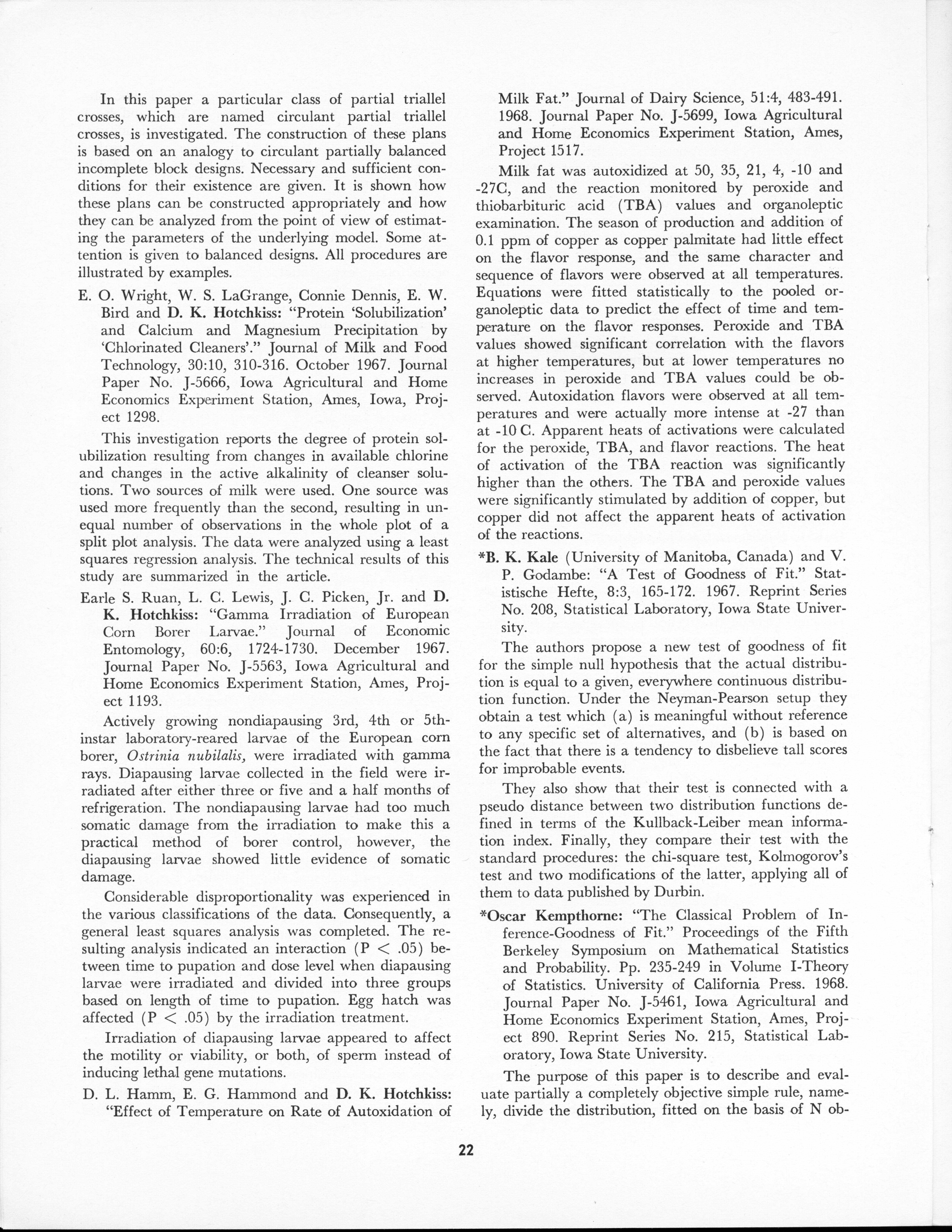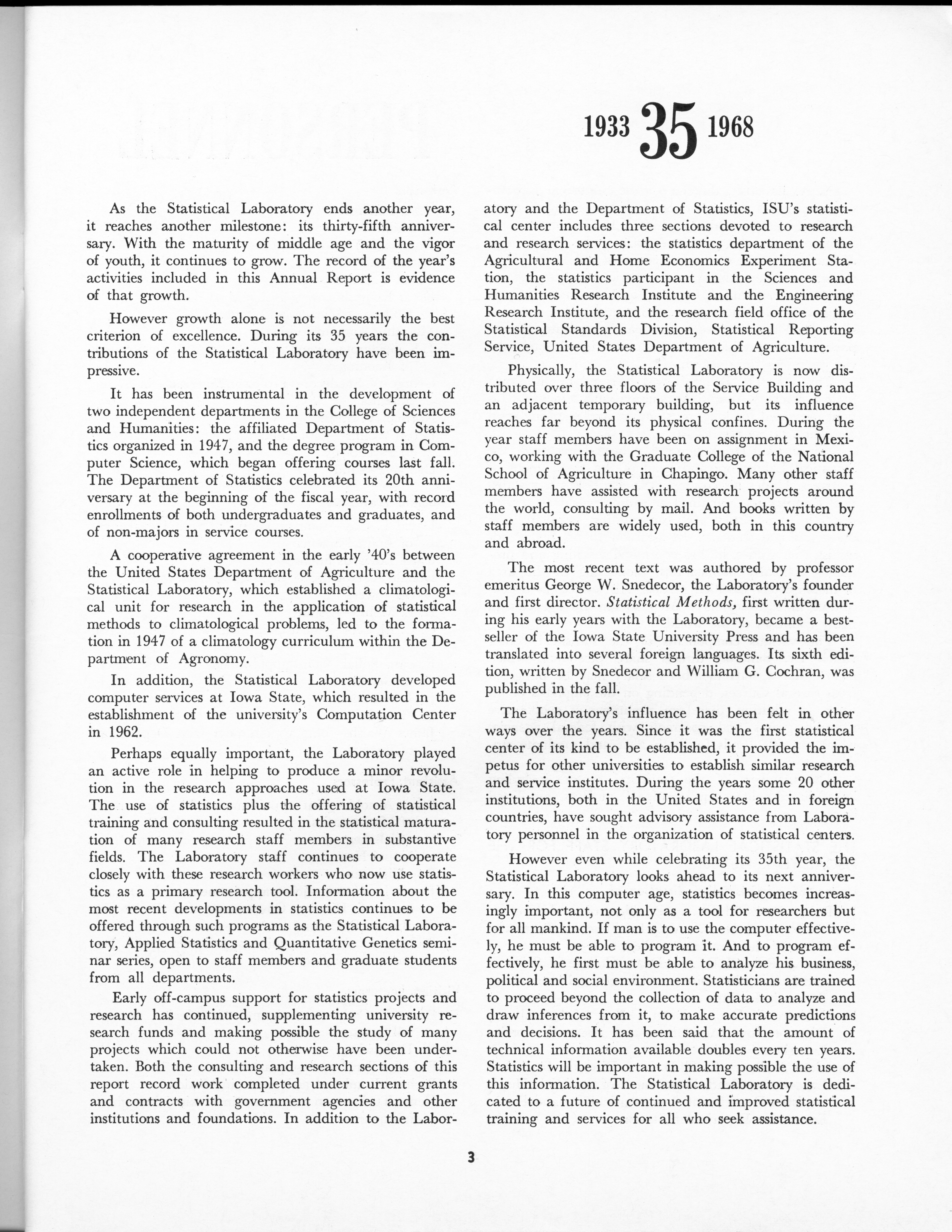 - "Statistical Laboratory Annual Report, July 1, 1967 to June 30, 1968", Iowa State University Statistical Laboratory Annual Reports, Iowa State University Library Digital Collections