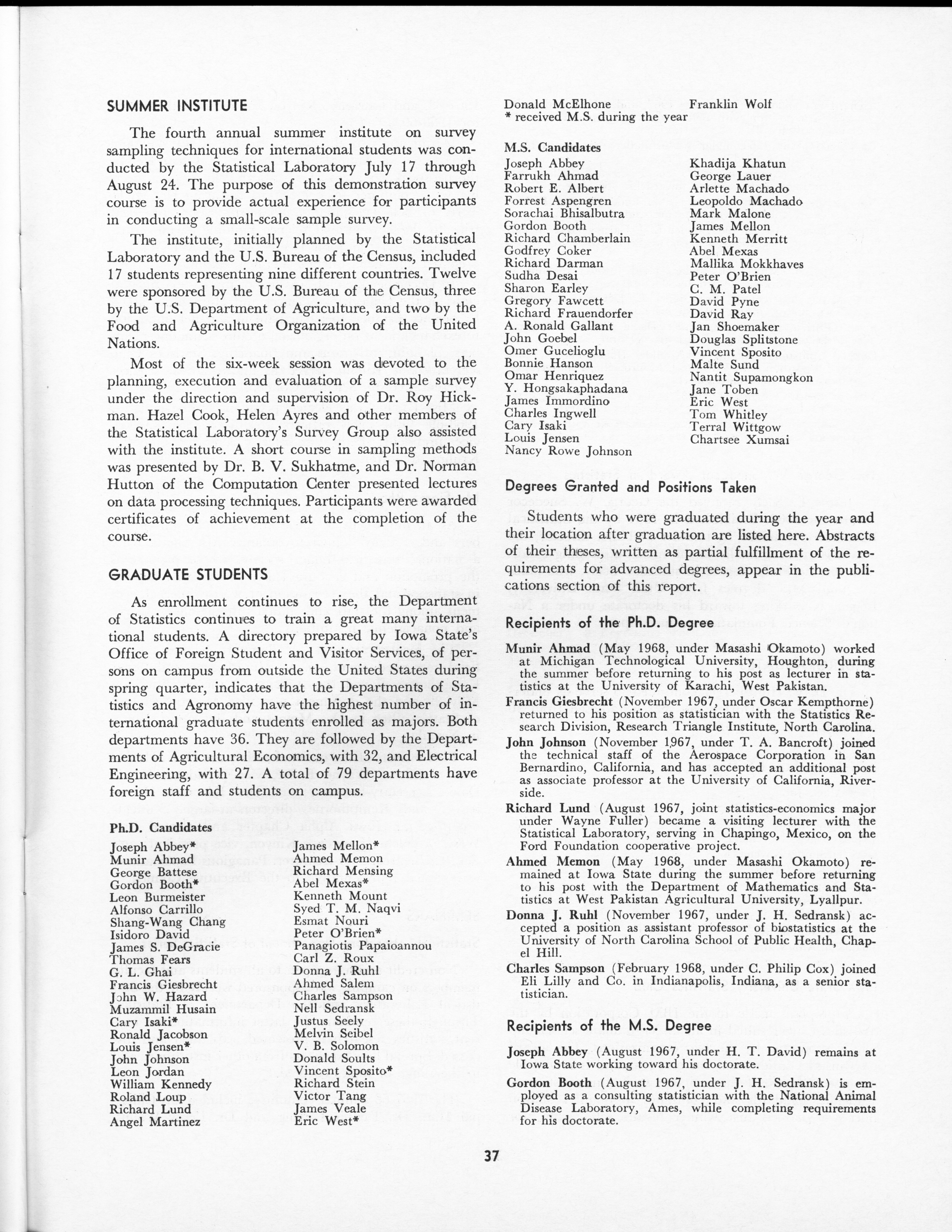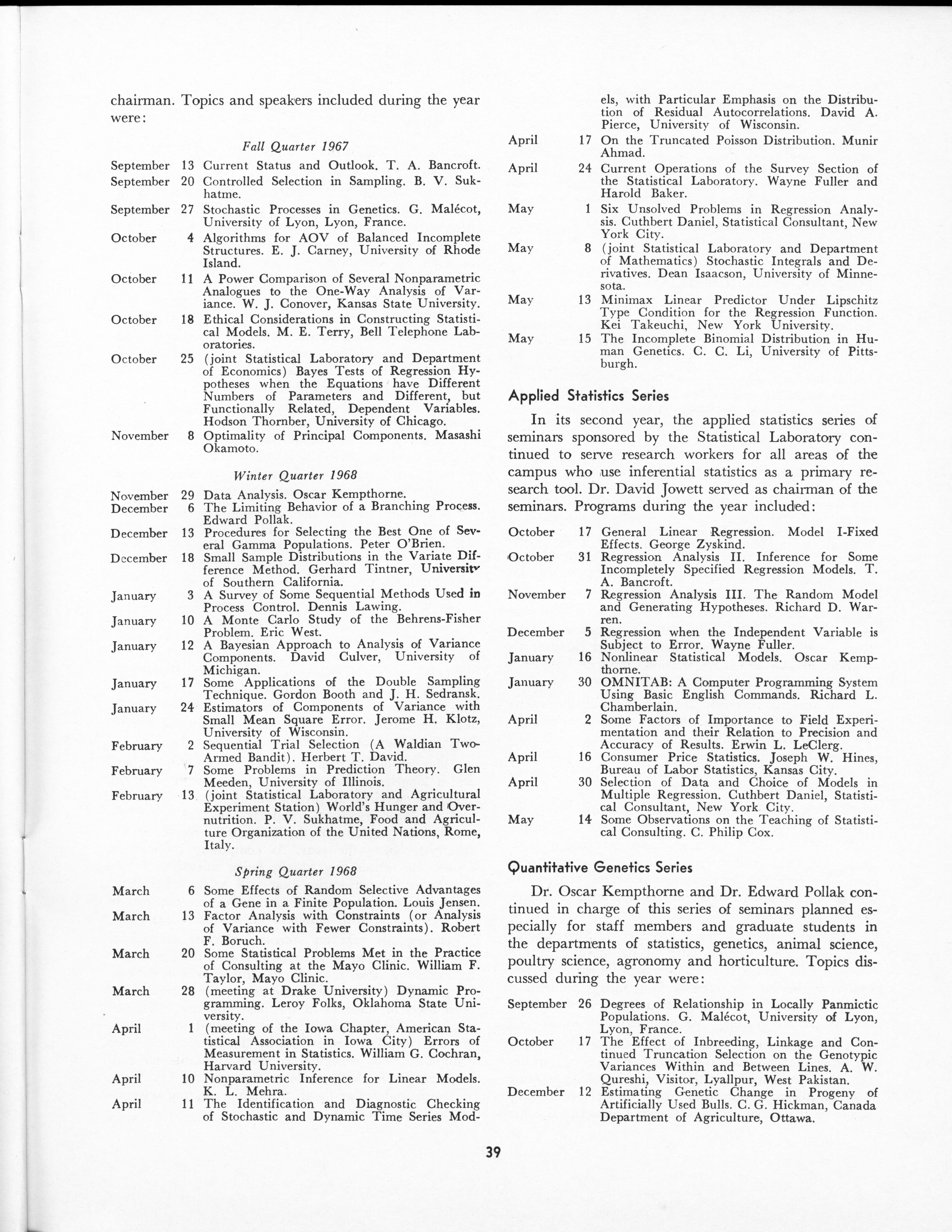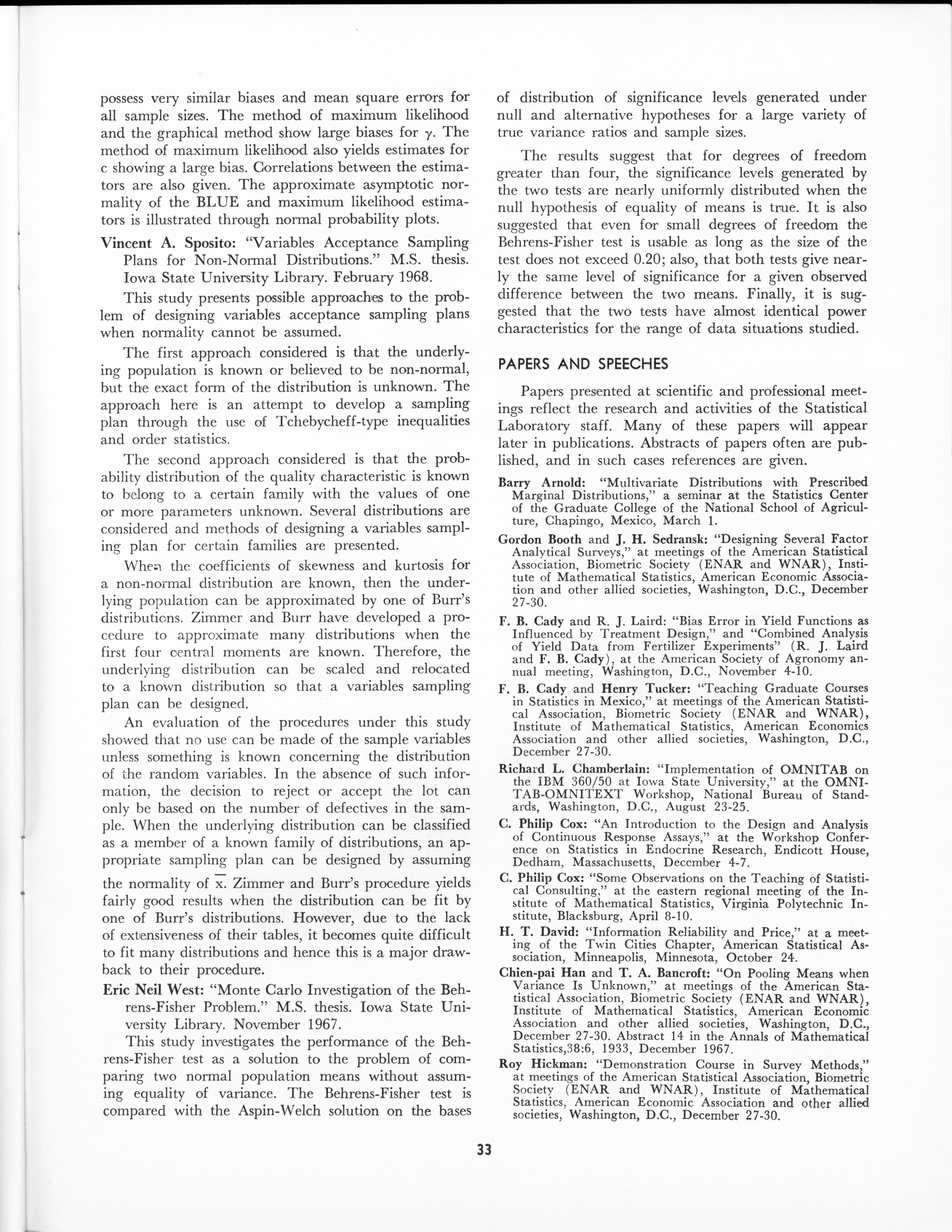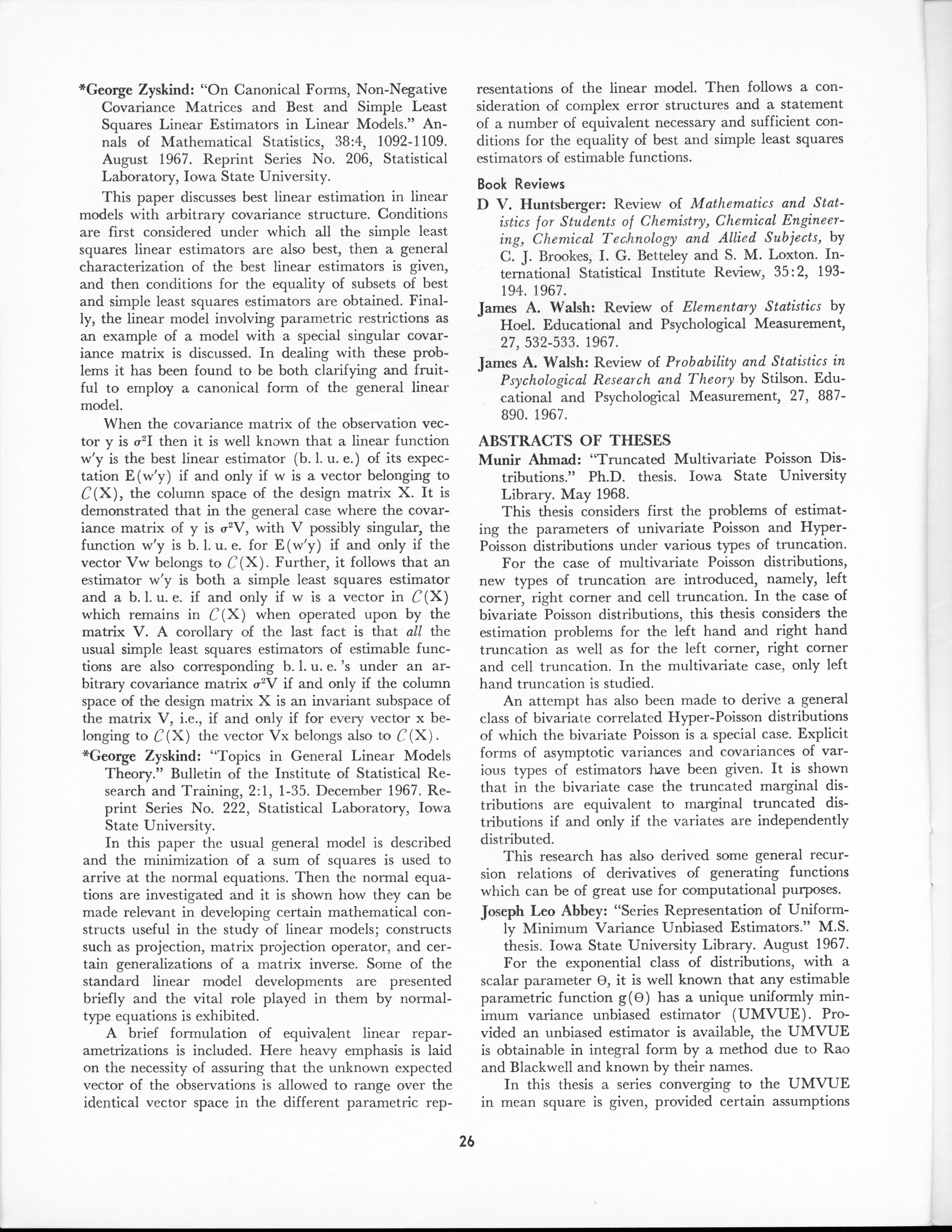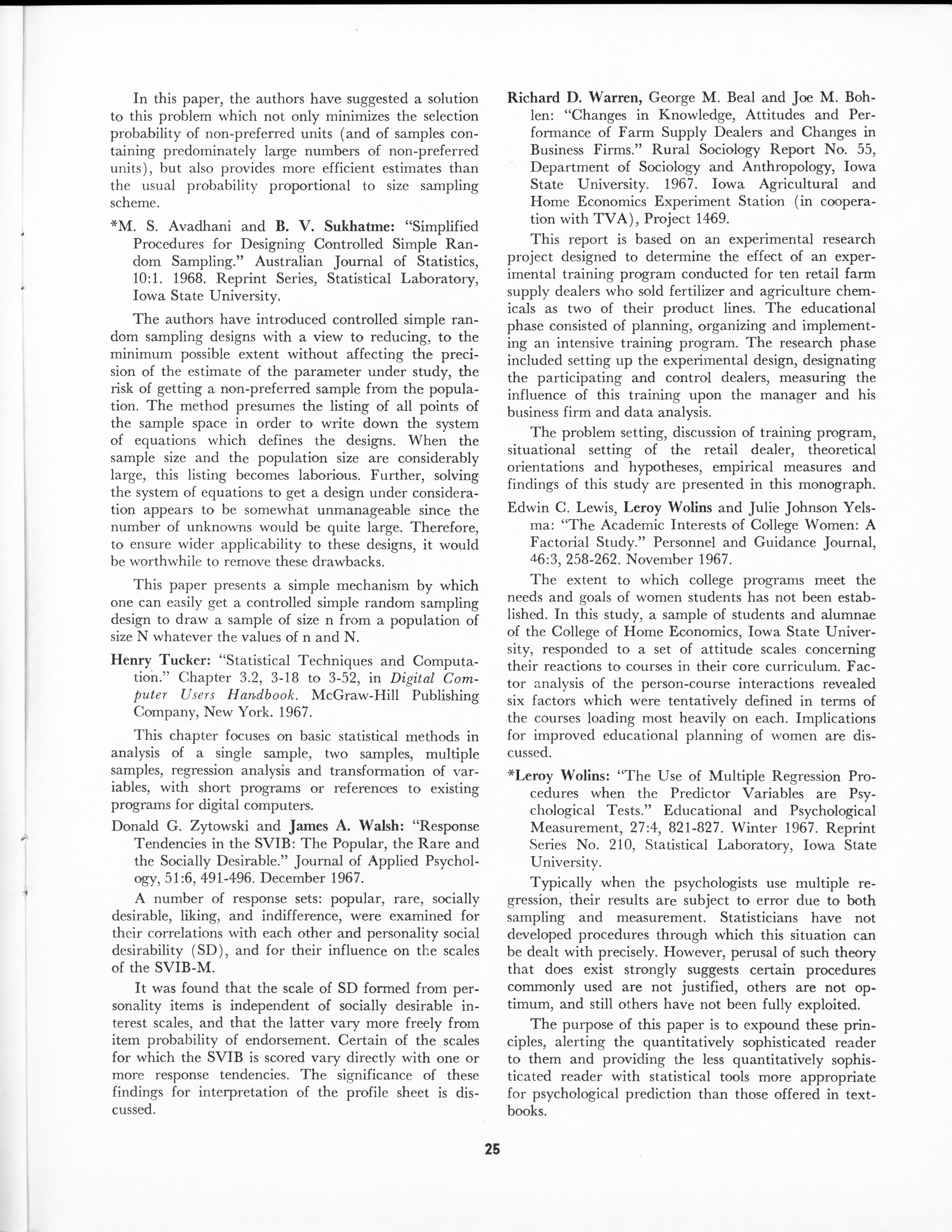 - "Statistical Laboratory Annual Report, July 1, 1967 to June 30, 1968", Iowa State University Statistical Laboratory Annual Reports, Iowa State University Library Digital Collections