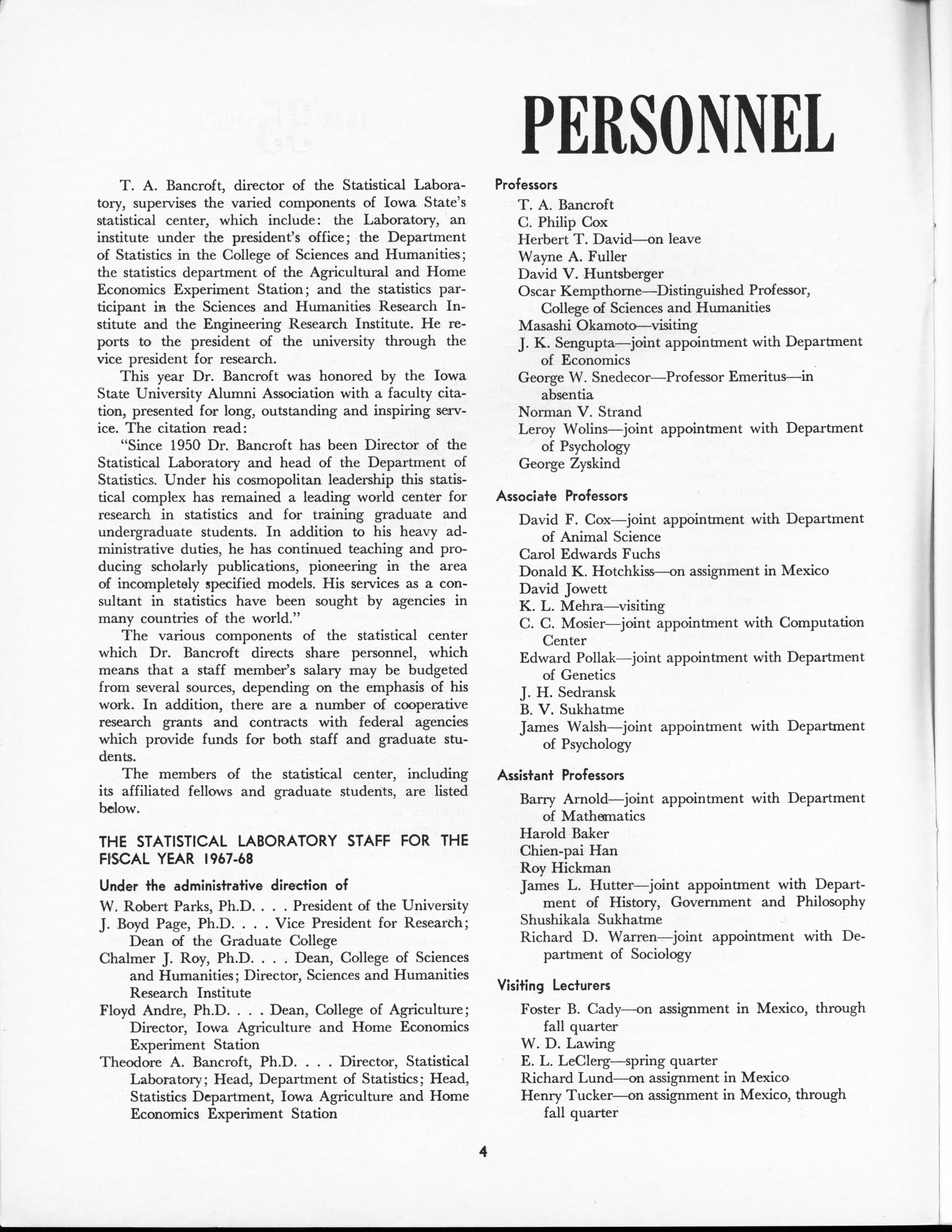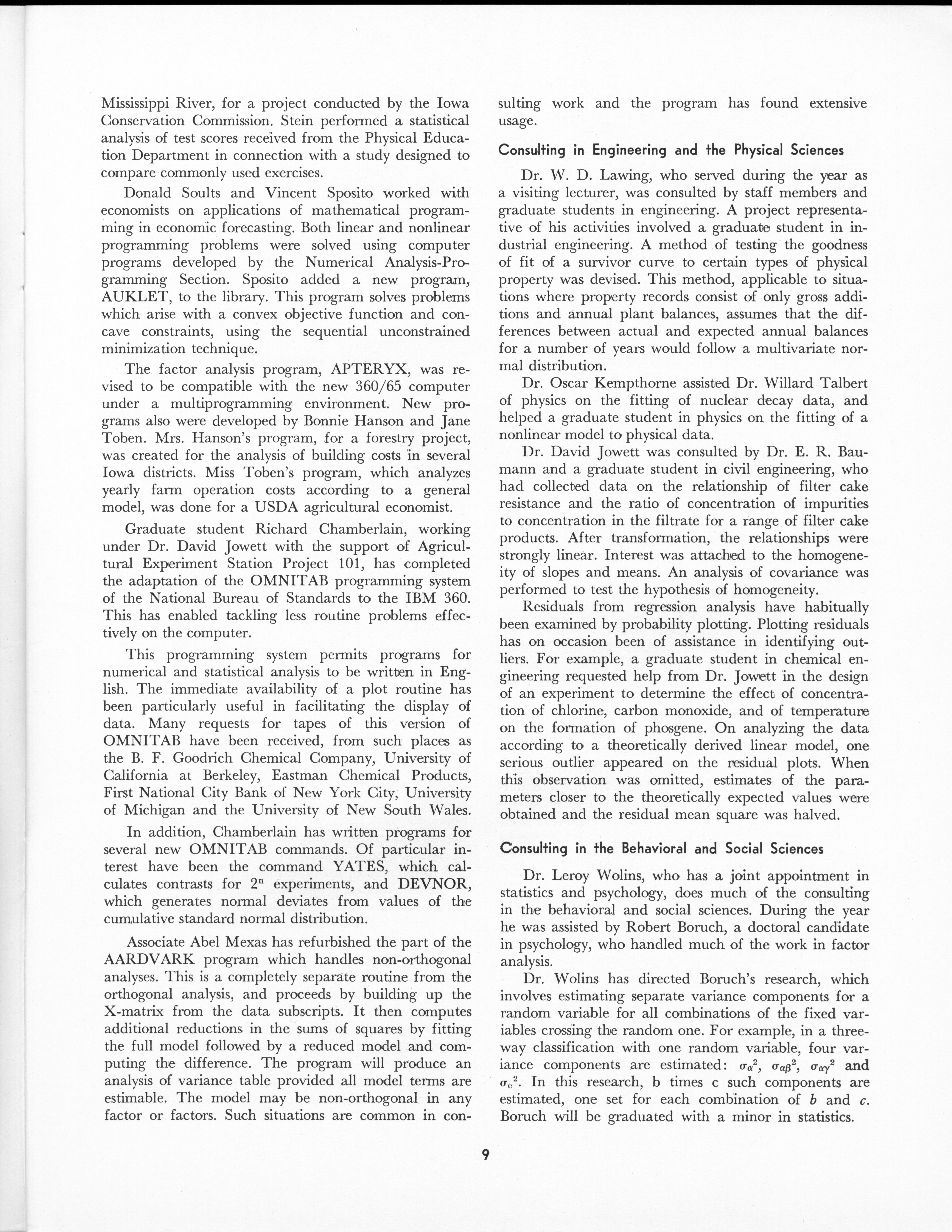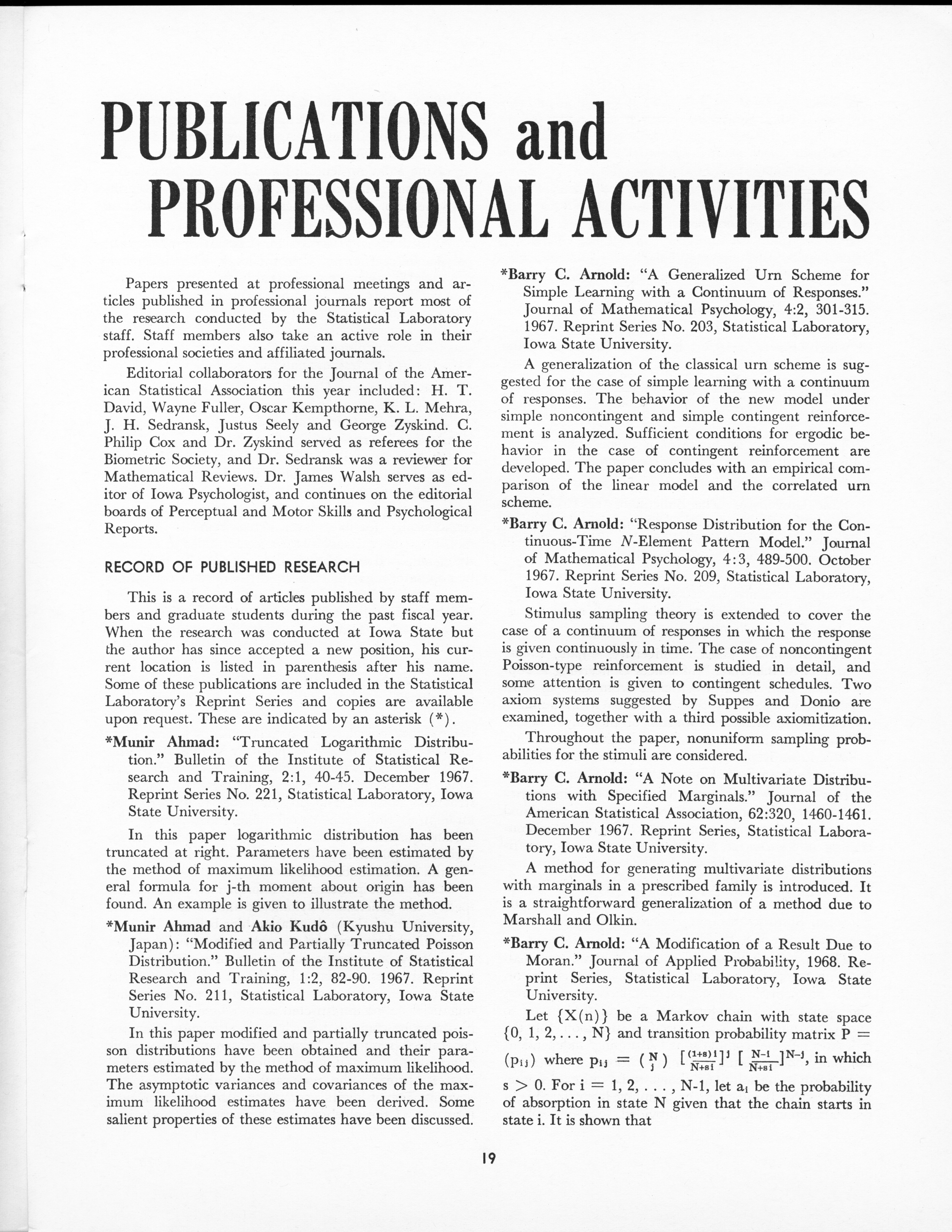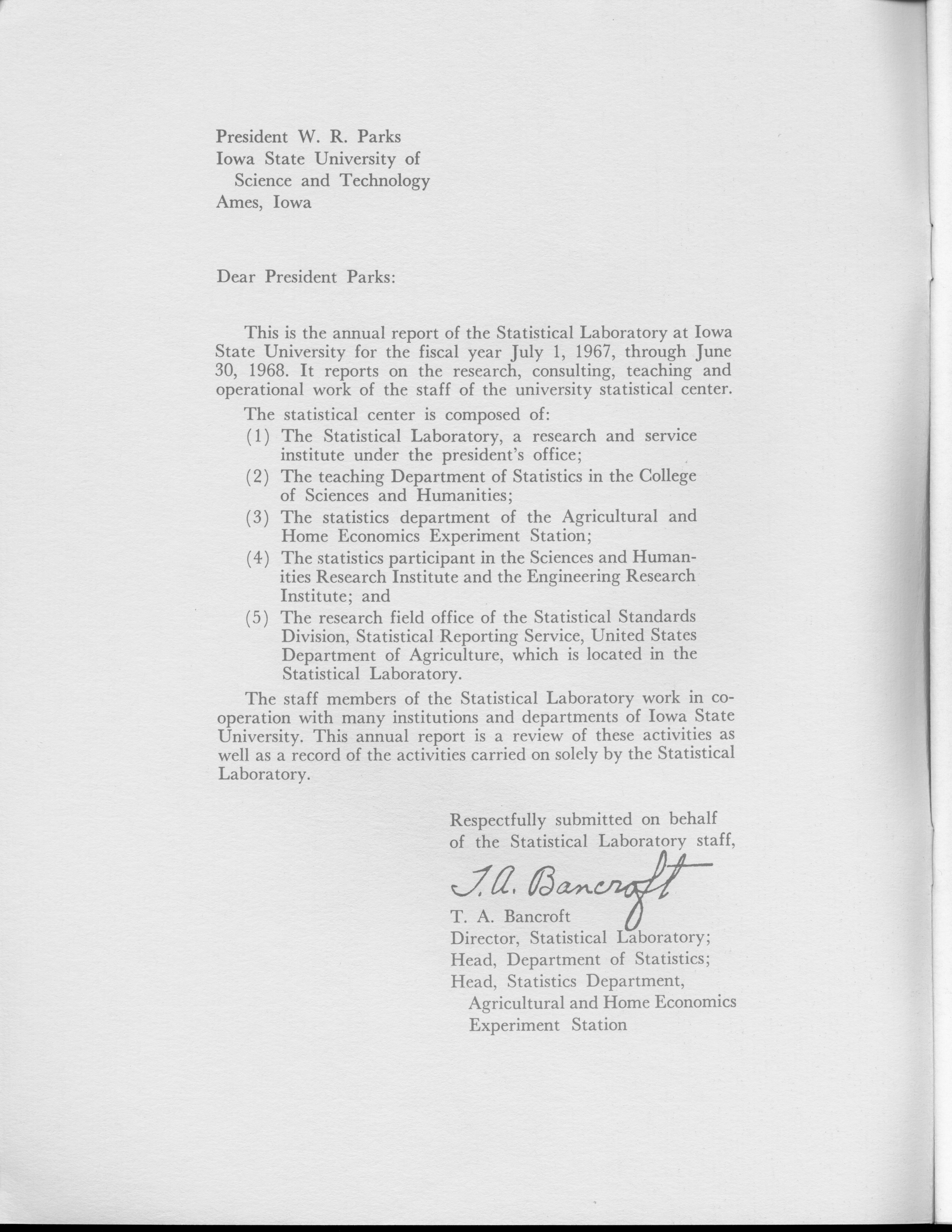 - "Statistical Laboratory Annual Report, July 1, 1967 to June 30, 1968", Iowa State University Statistical Laboratory Annual Reports, Iowa State University Library Digital Collections
