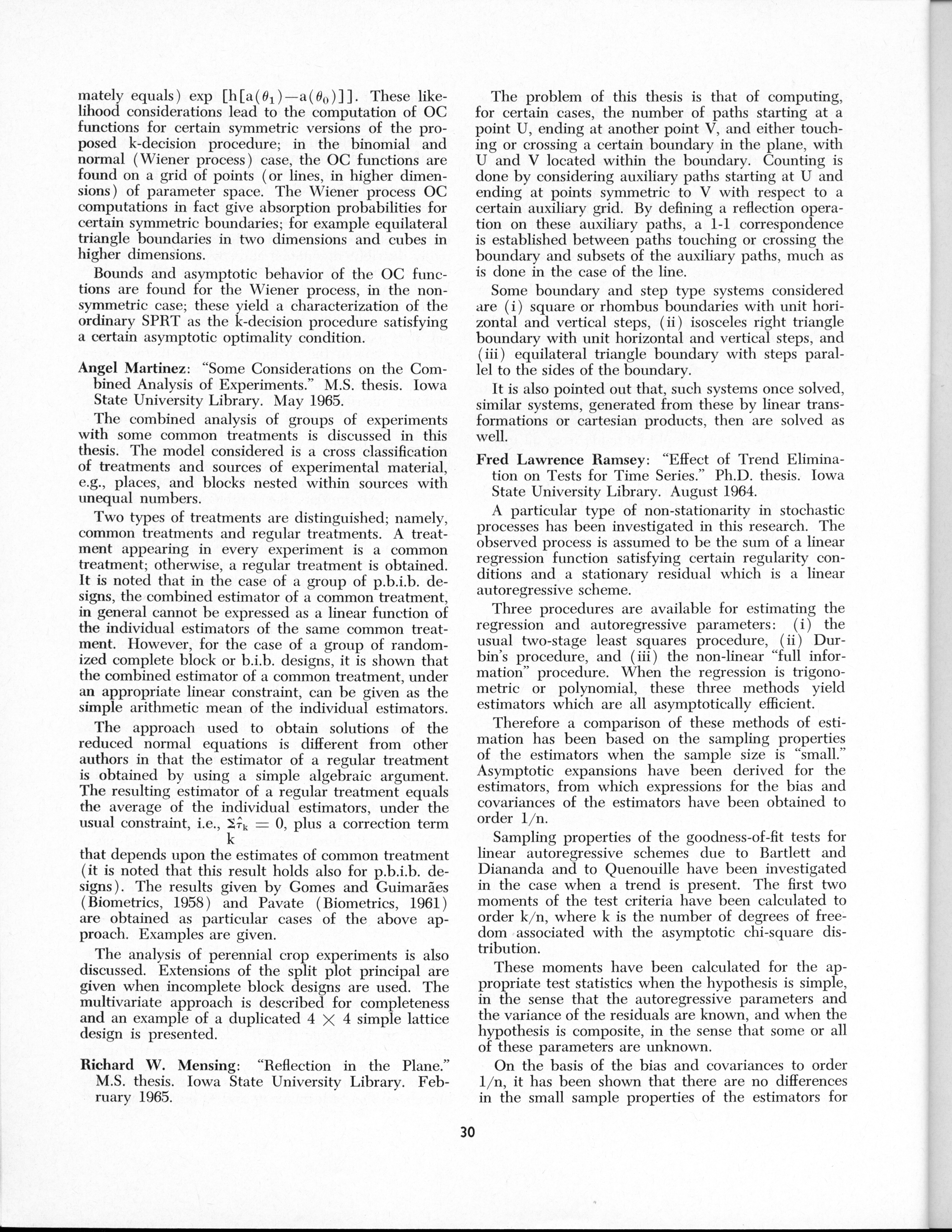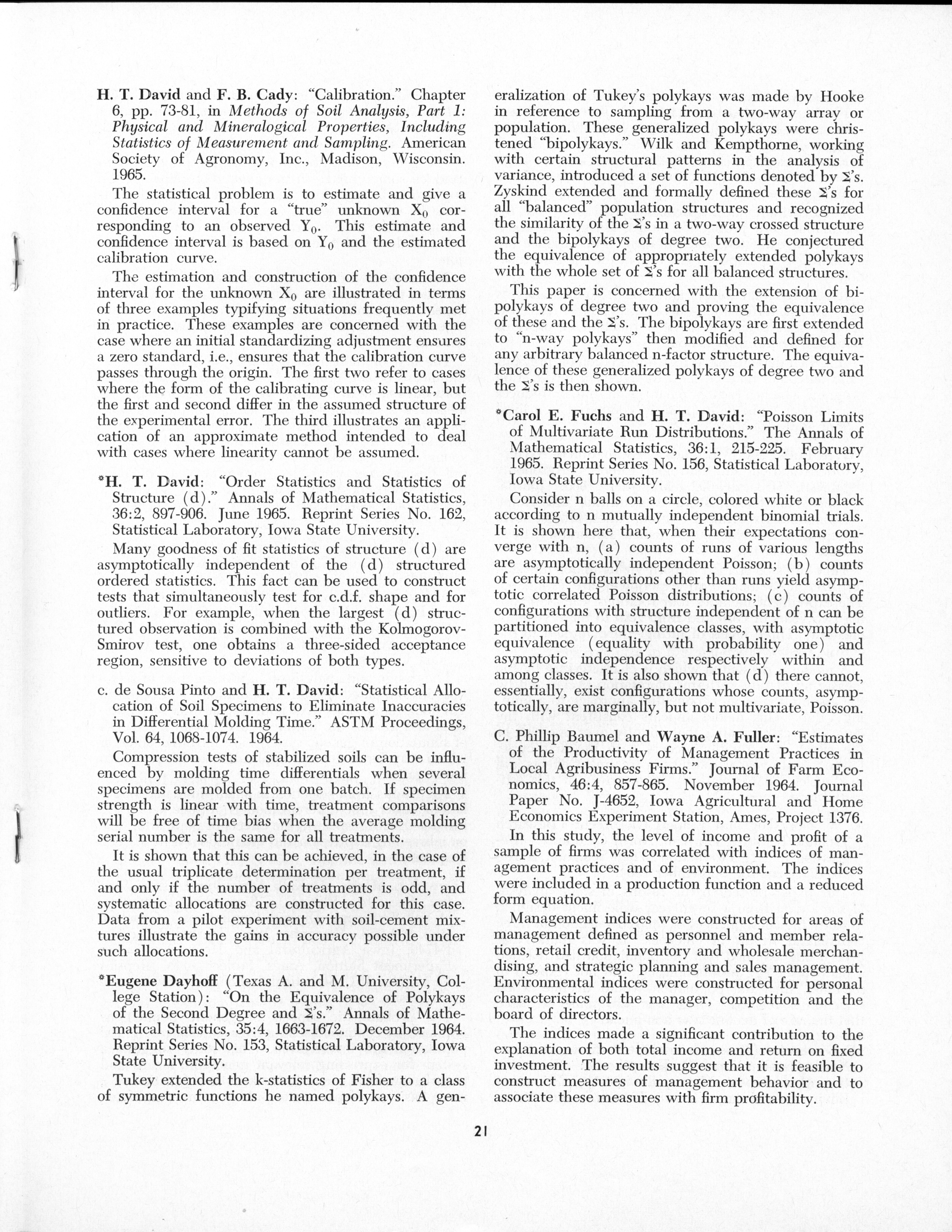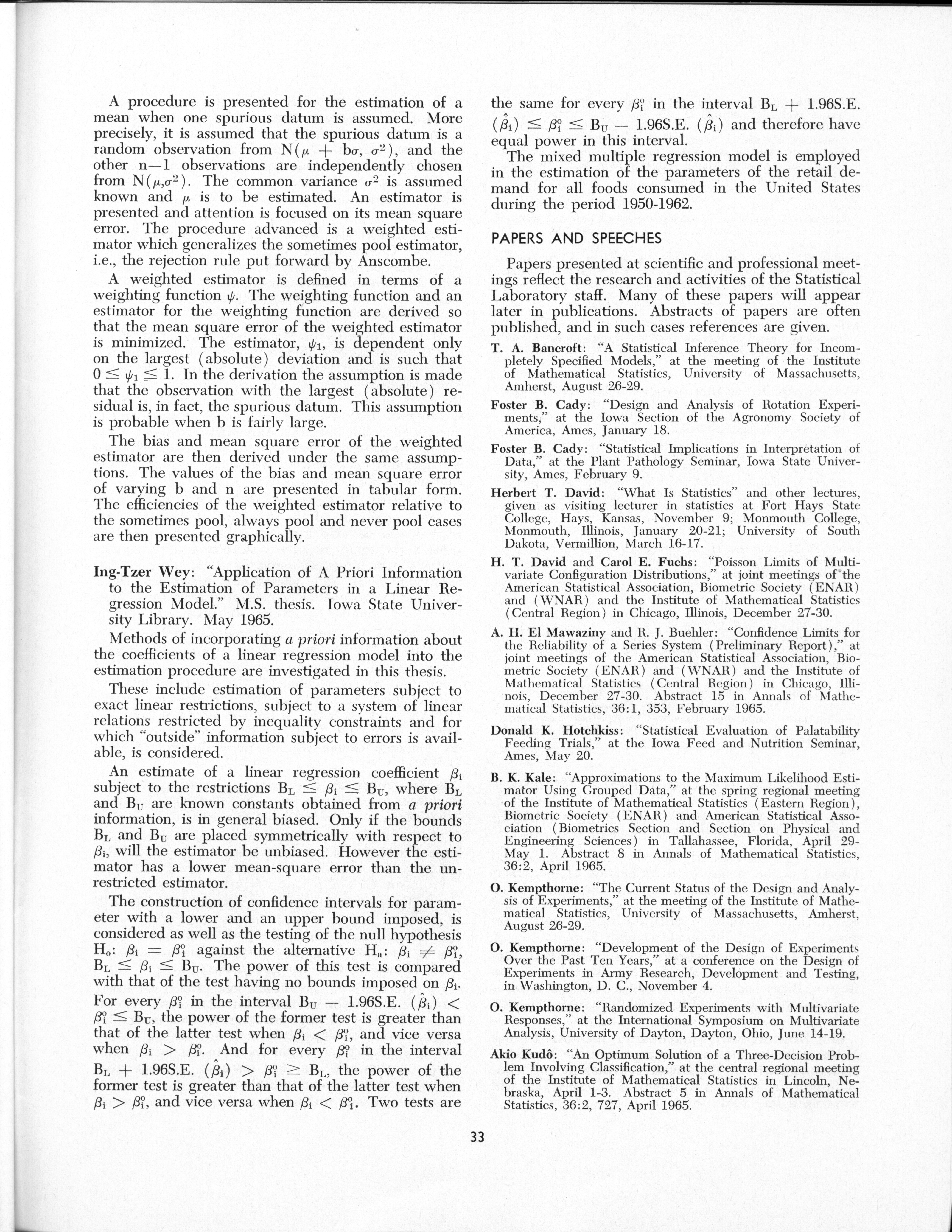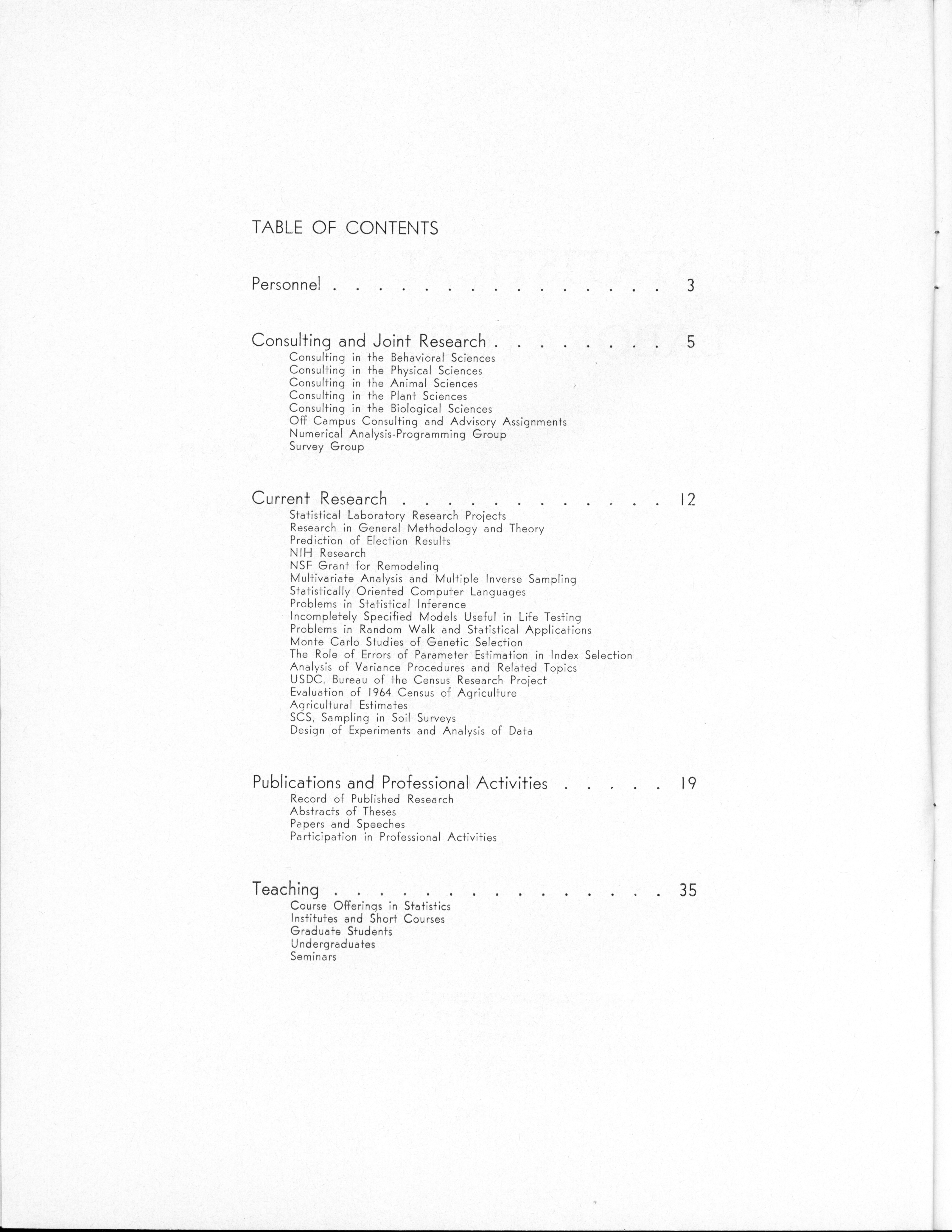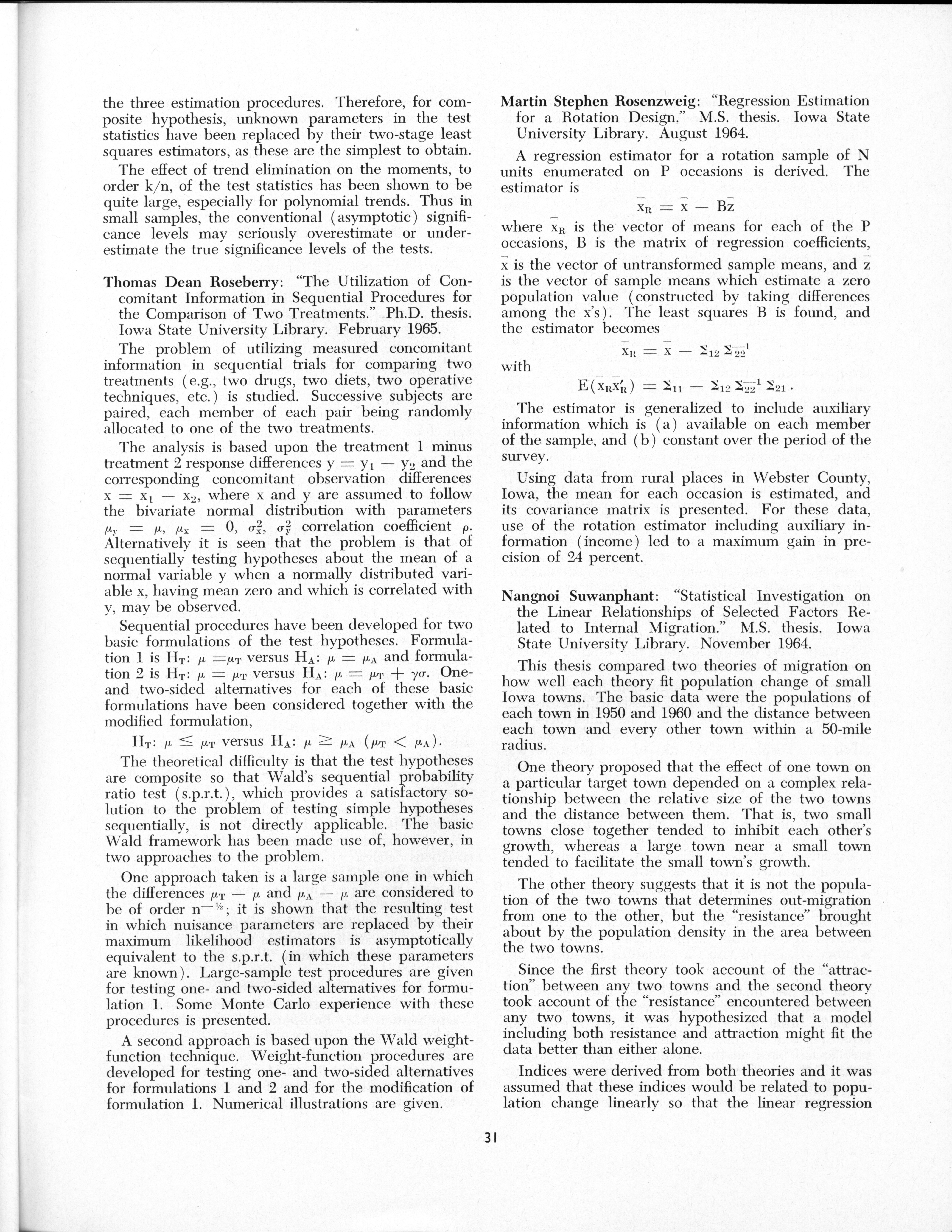 - "Statistical Laboratory Annual Report, July 1, 1964 to June 30, 1965", Iowa State University Statistical Laboratory Annual Reports, Iowa State University Library Digital Collections