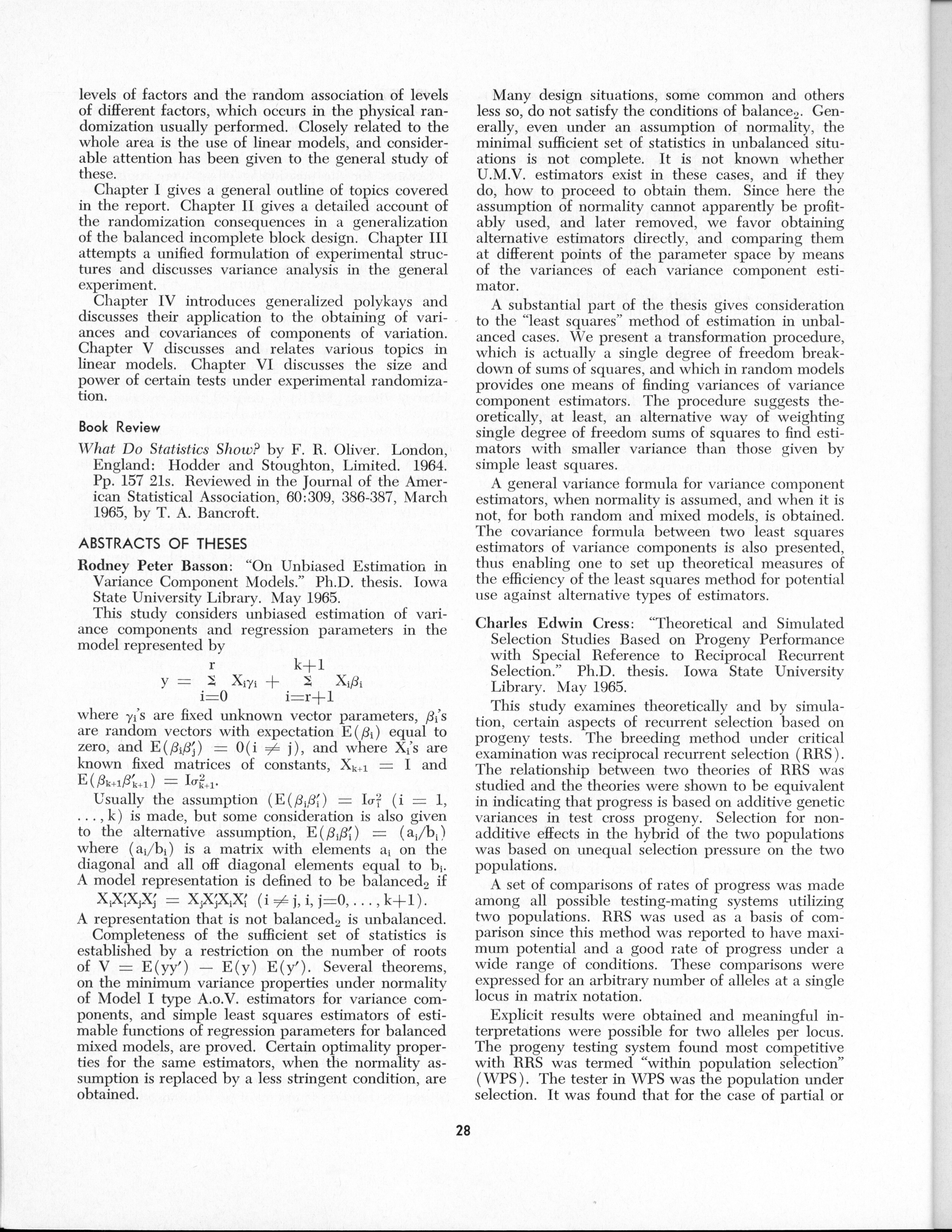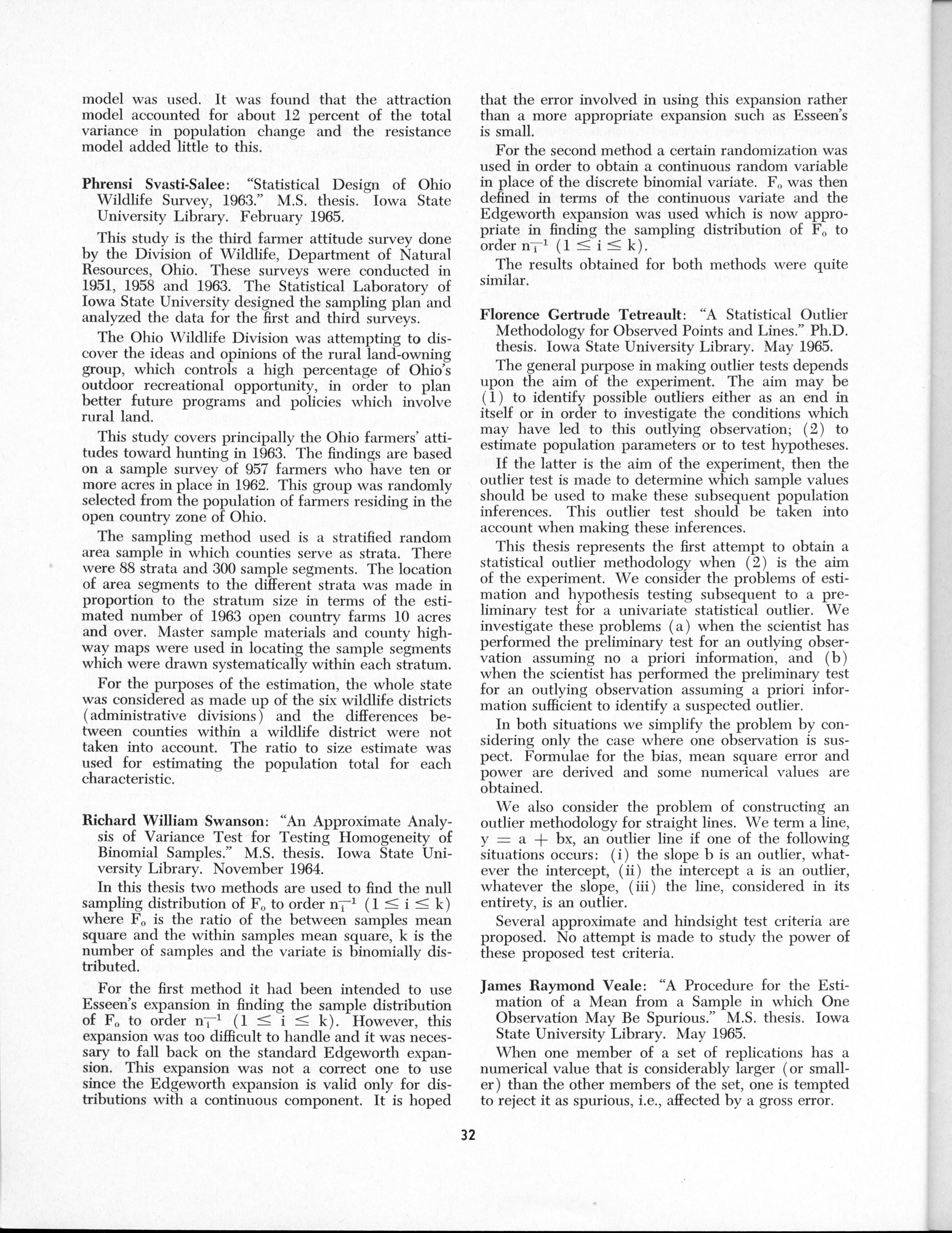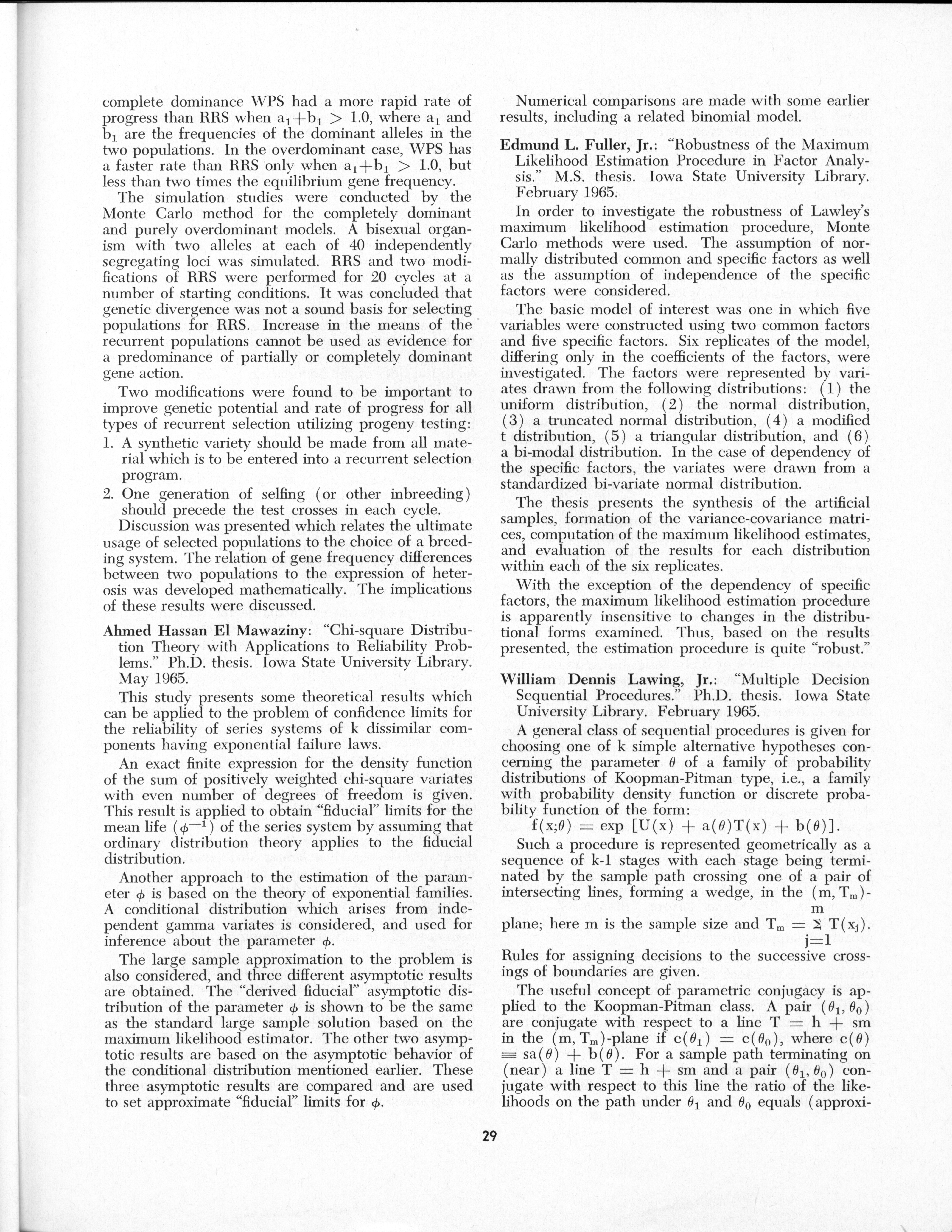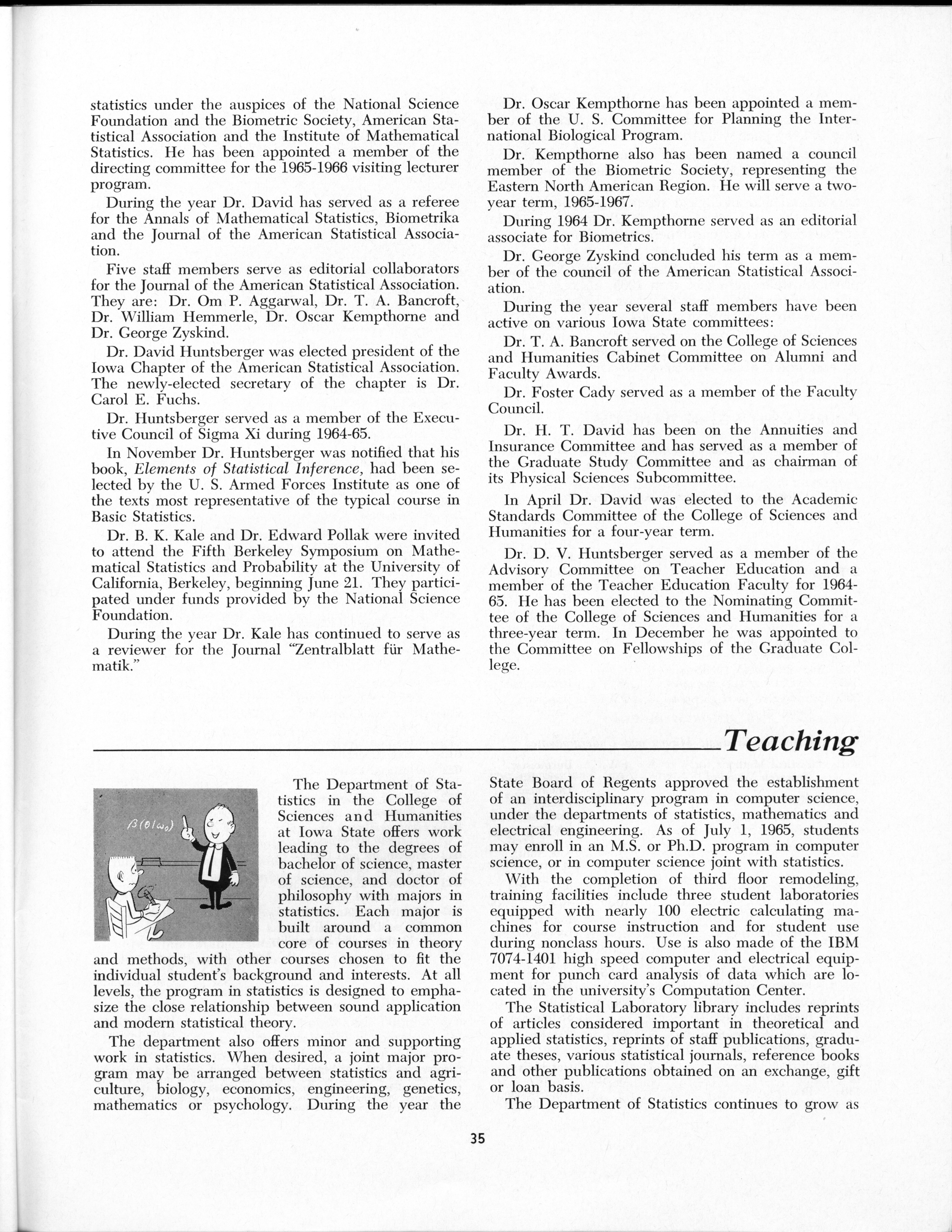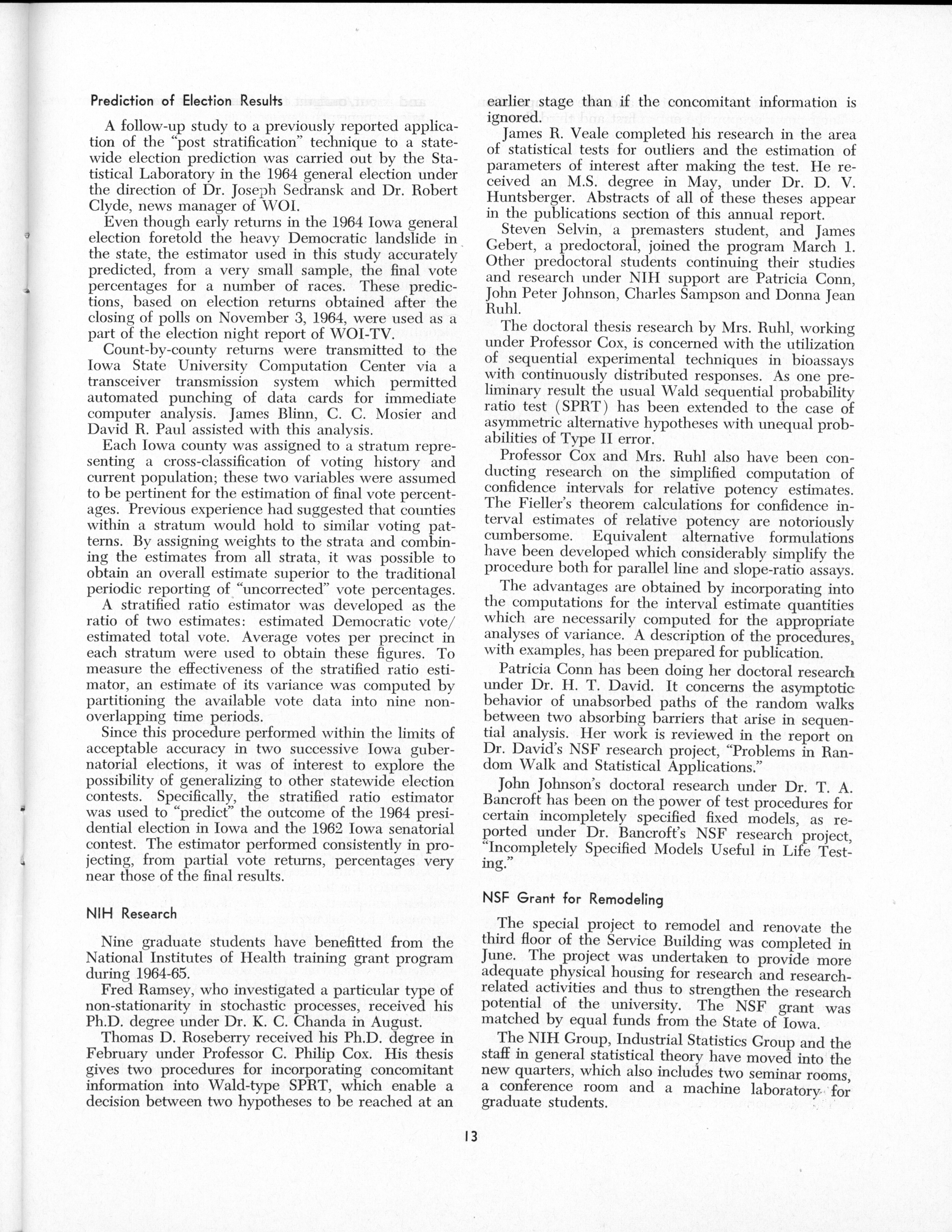 - "Statistical Laboratory Annual Report, July 1, 1964 to June 30, 1965", Iowa State University Statistical Laboratory Annual Reports, Iowa State University Library Digital Collections