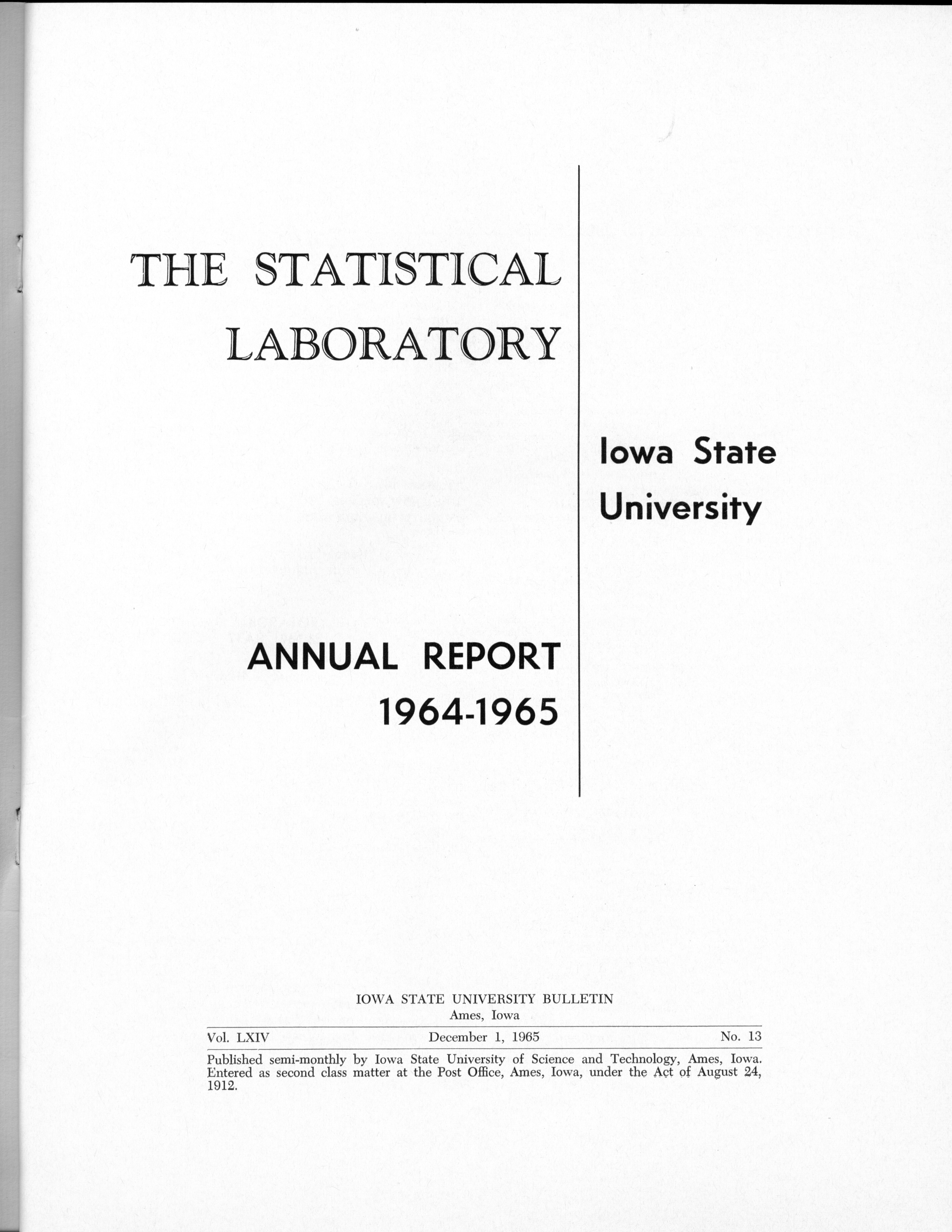 Statistical Laboratory Annual Report, July 1, 1964 to June 30, 1965 Item Info