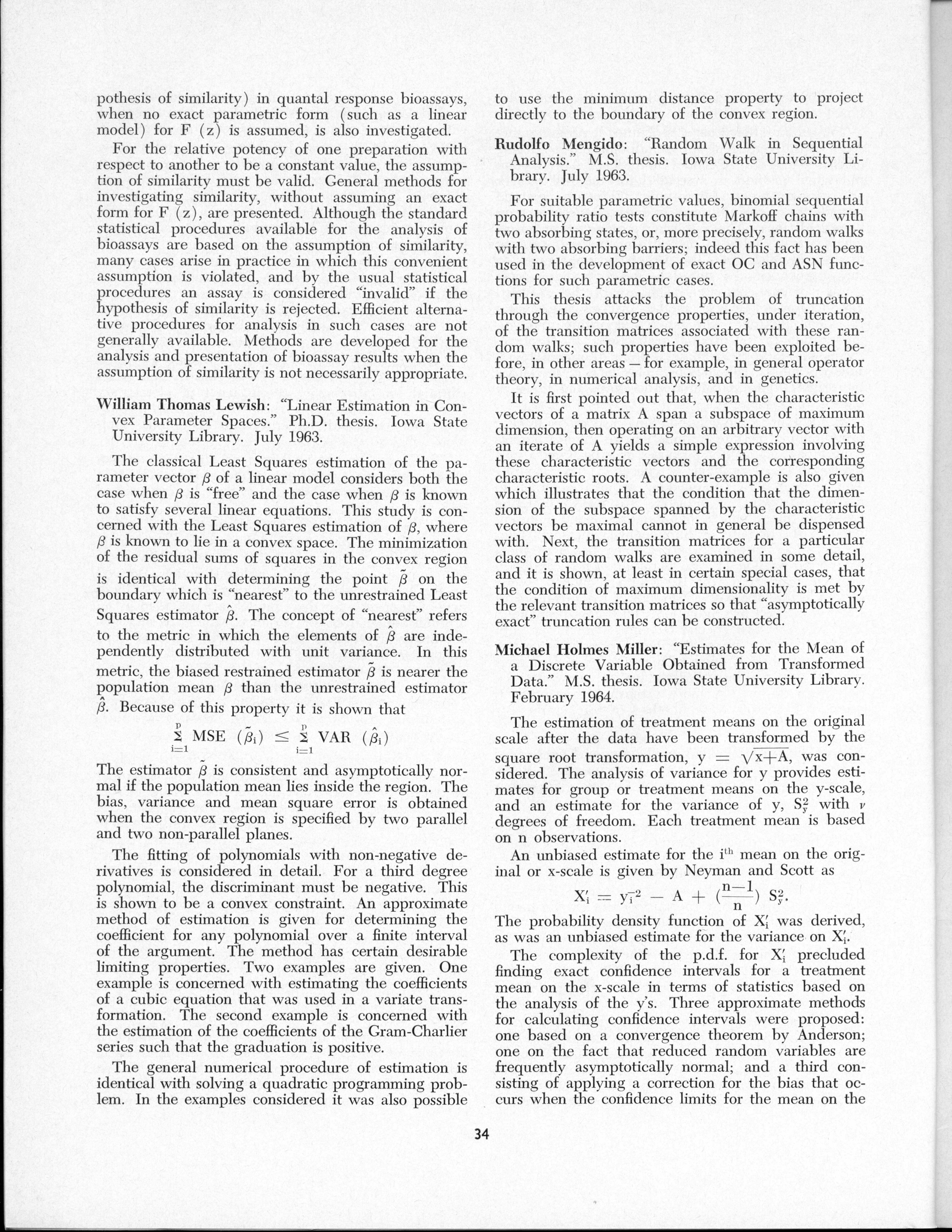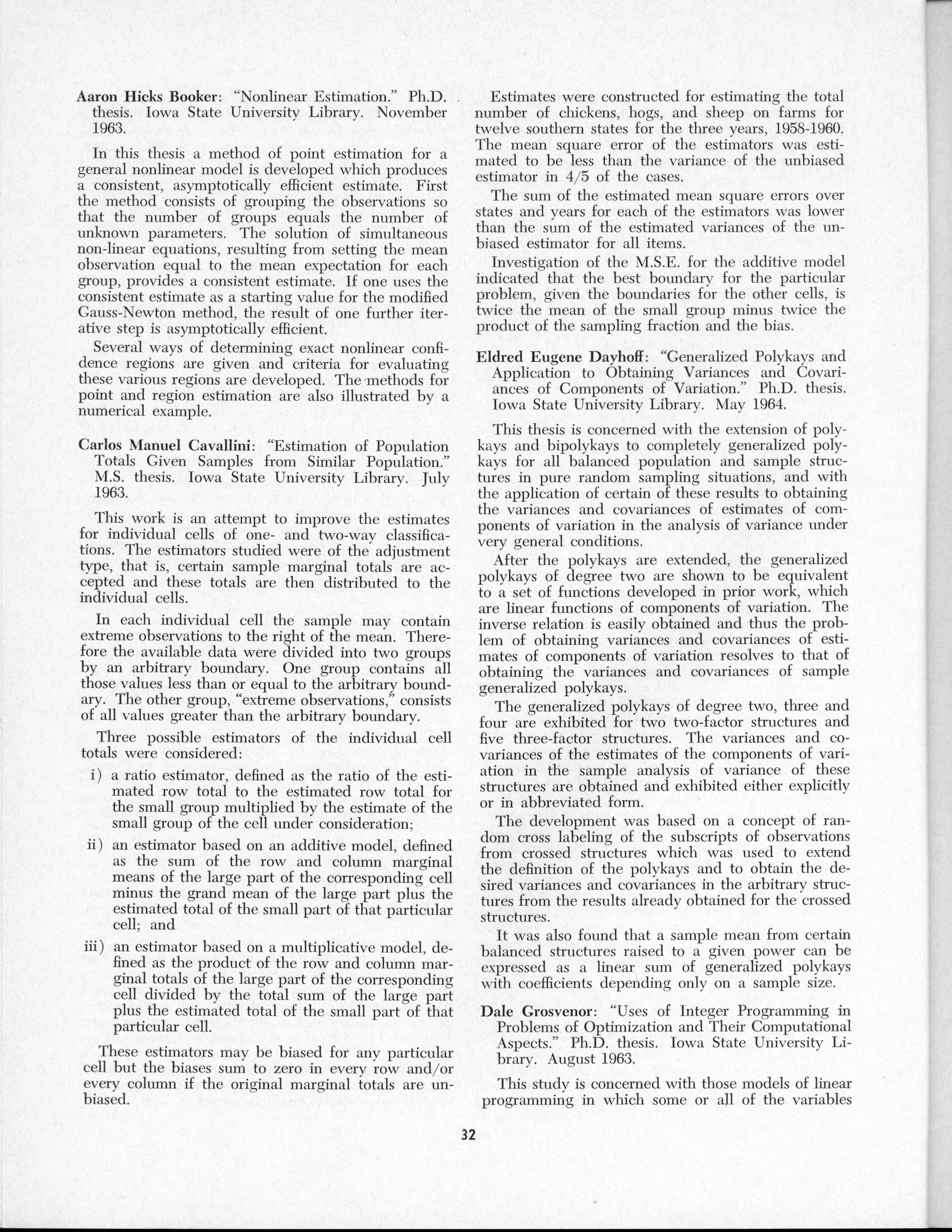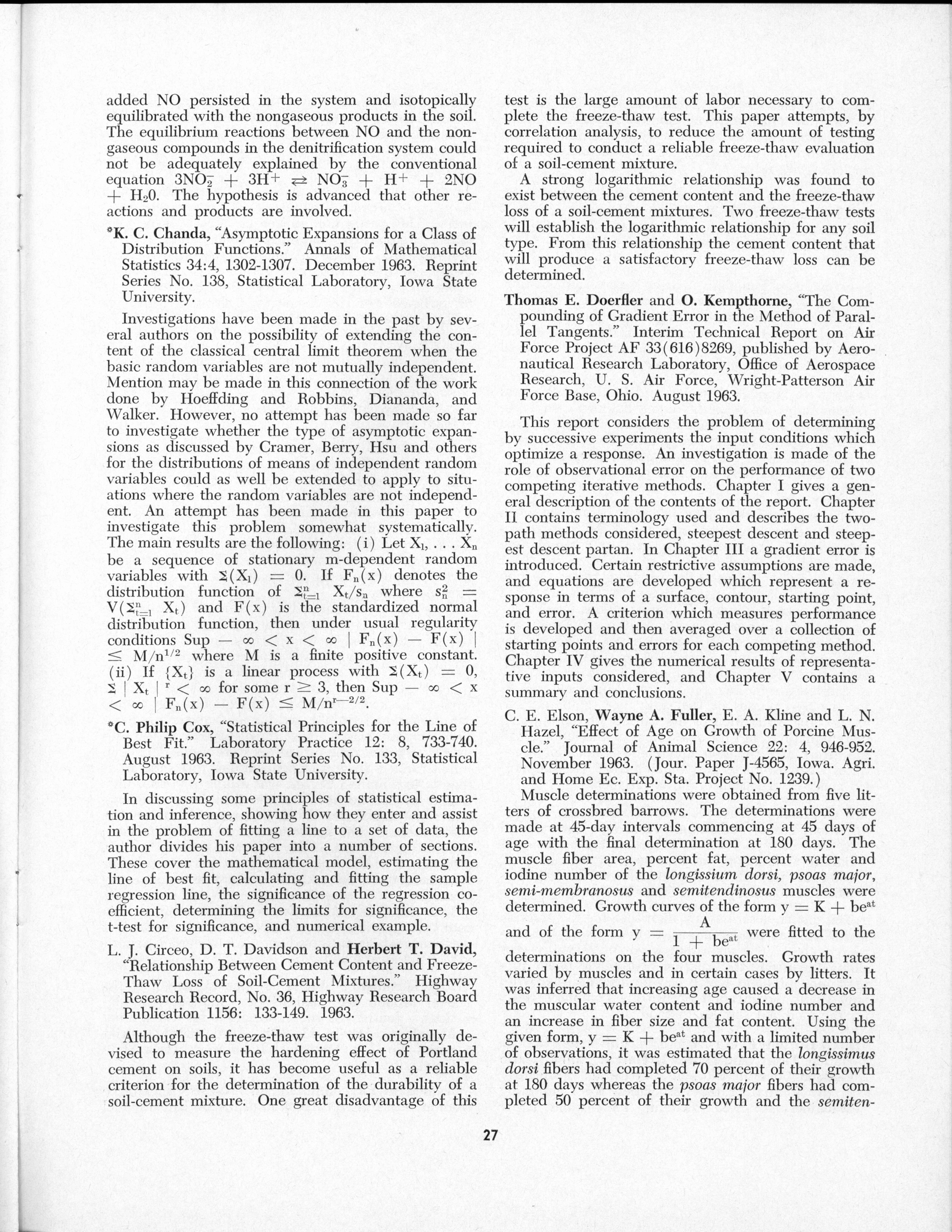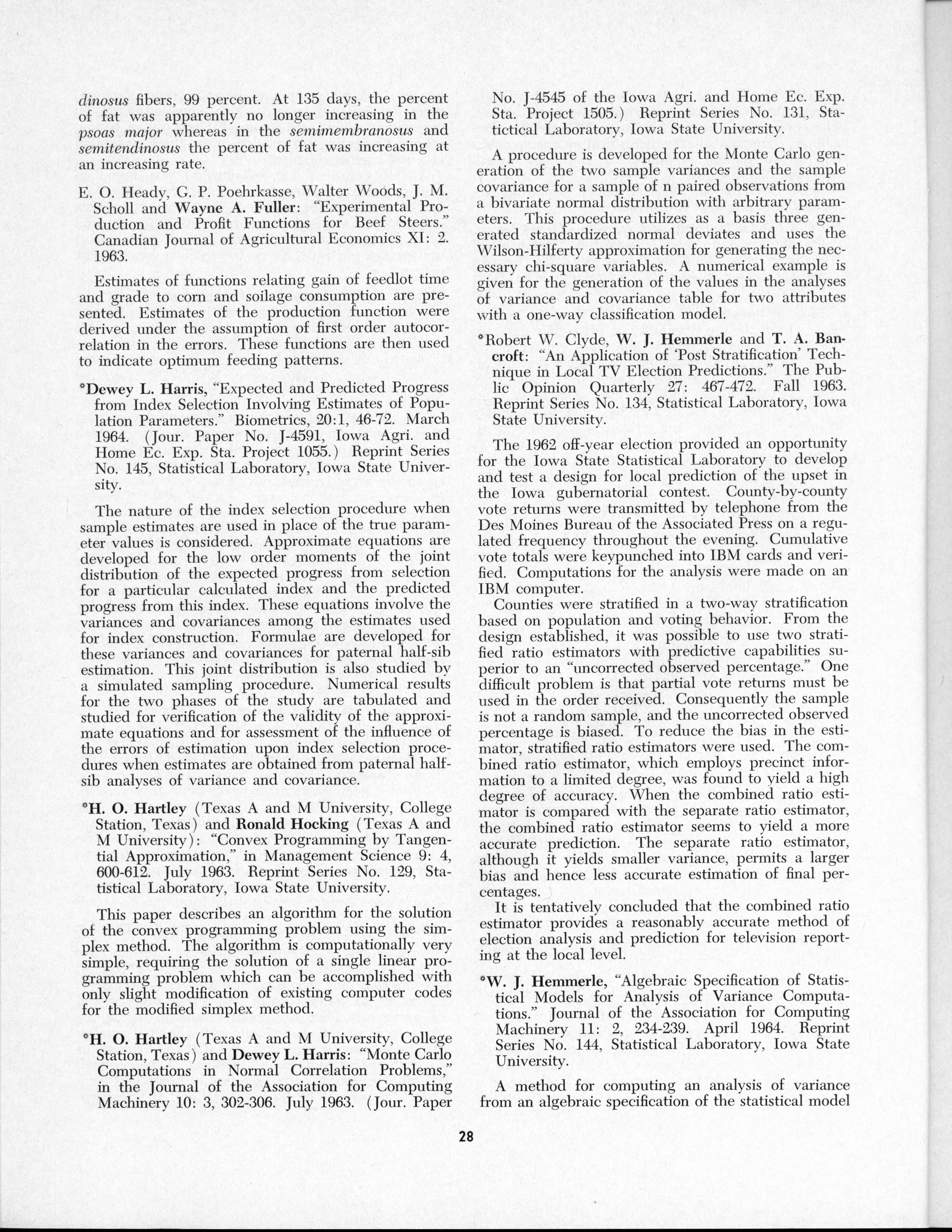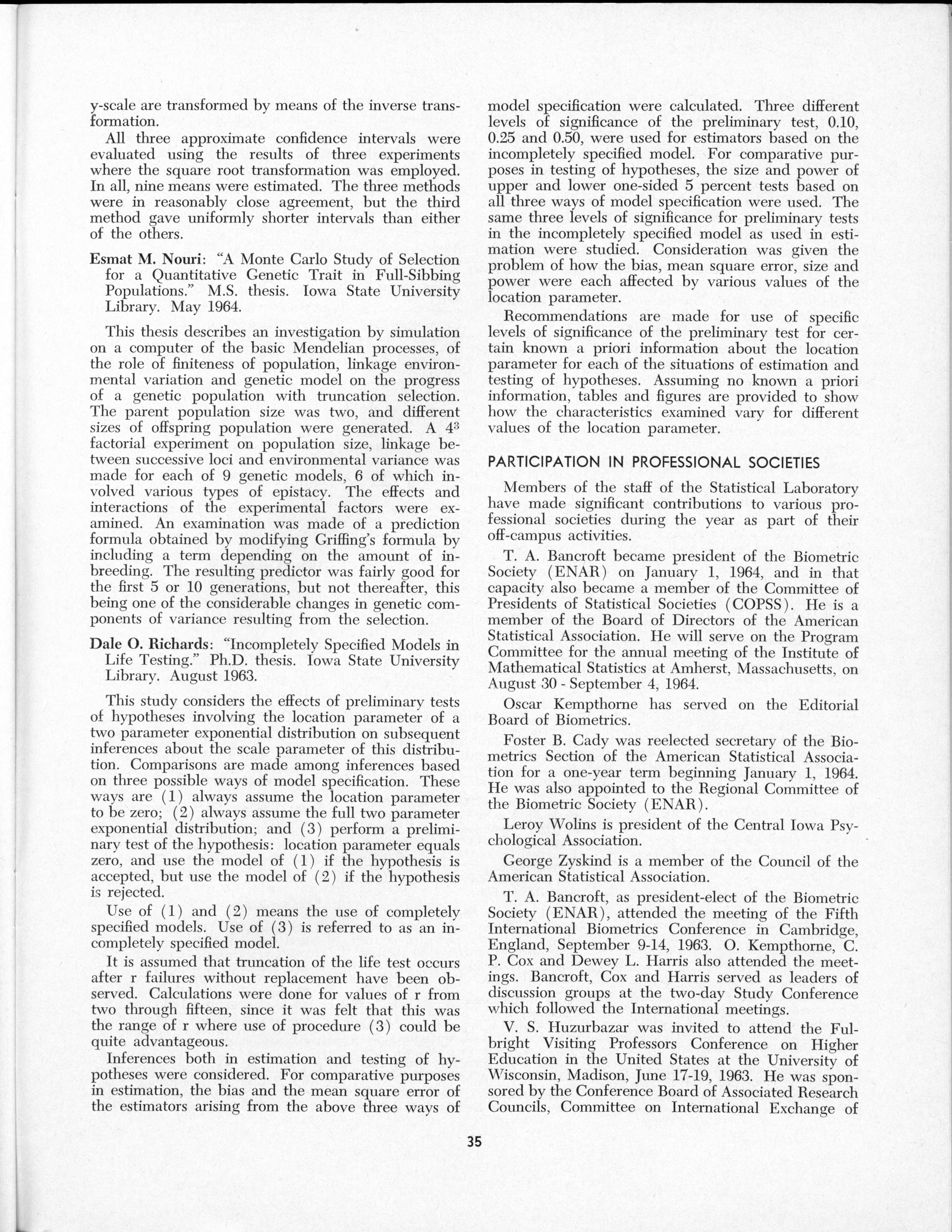 - "Statistical Laboratory Annual Report, July 1, 1963 to June 30, 1964", Iowa State University Statistical Laboratory Annual Reports, Iowa State University Library Digital Collections