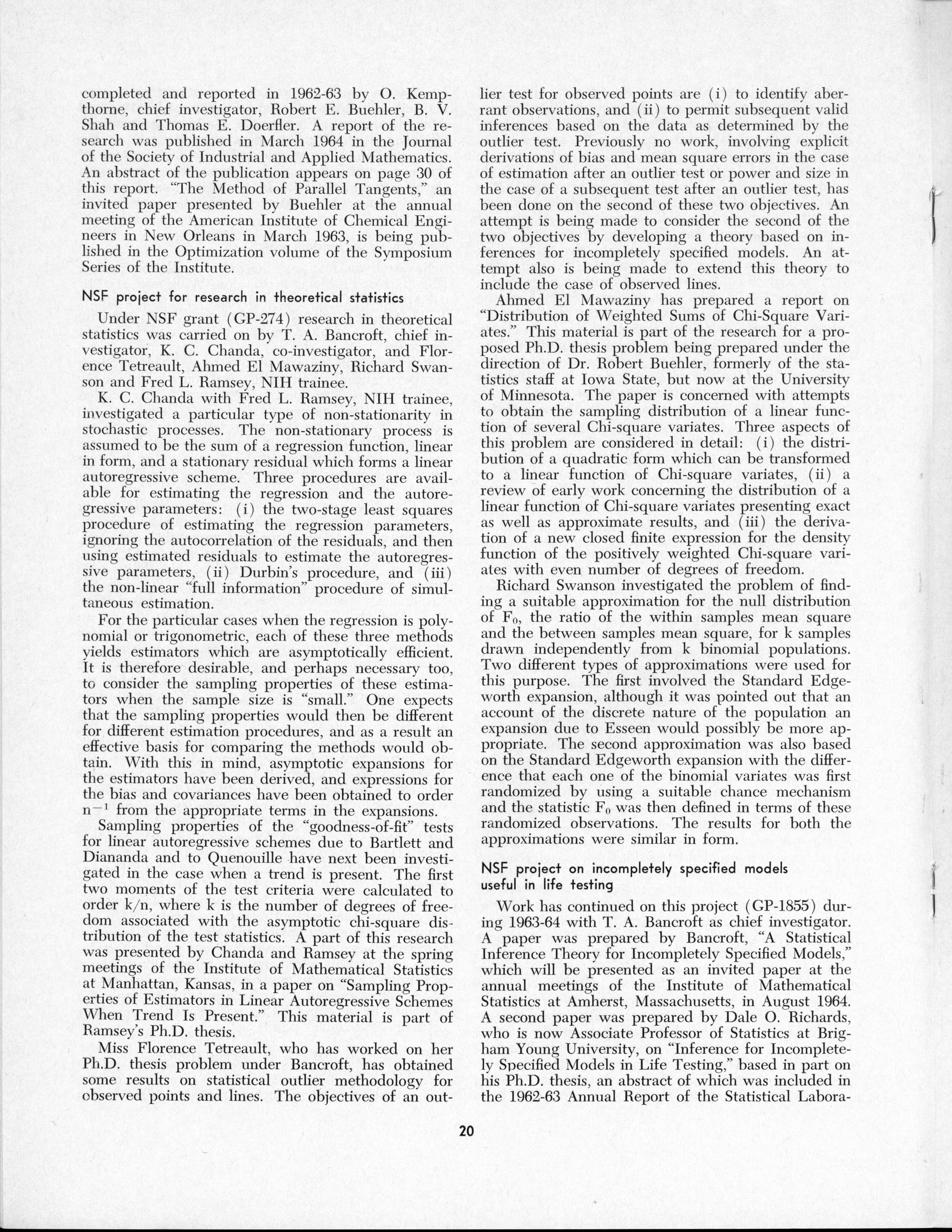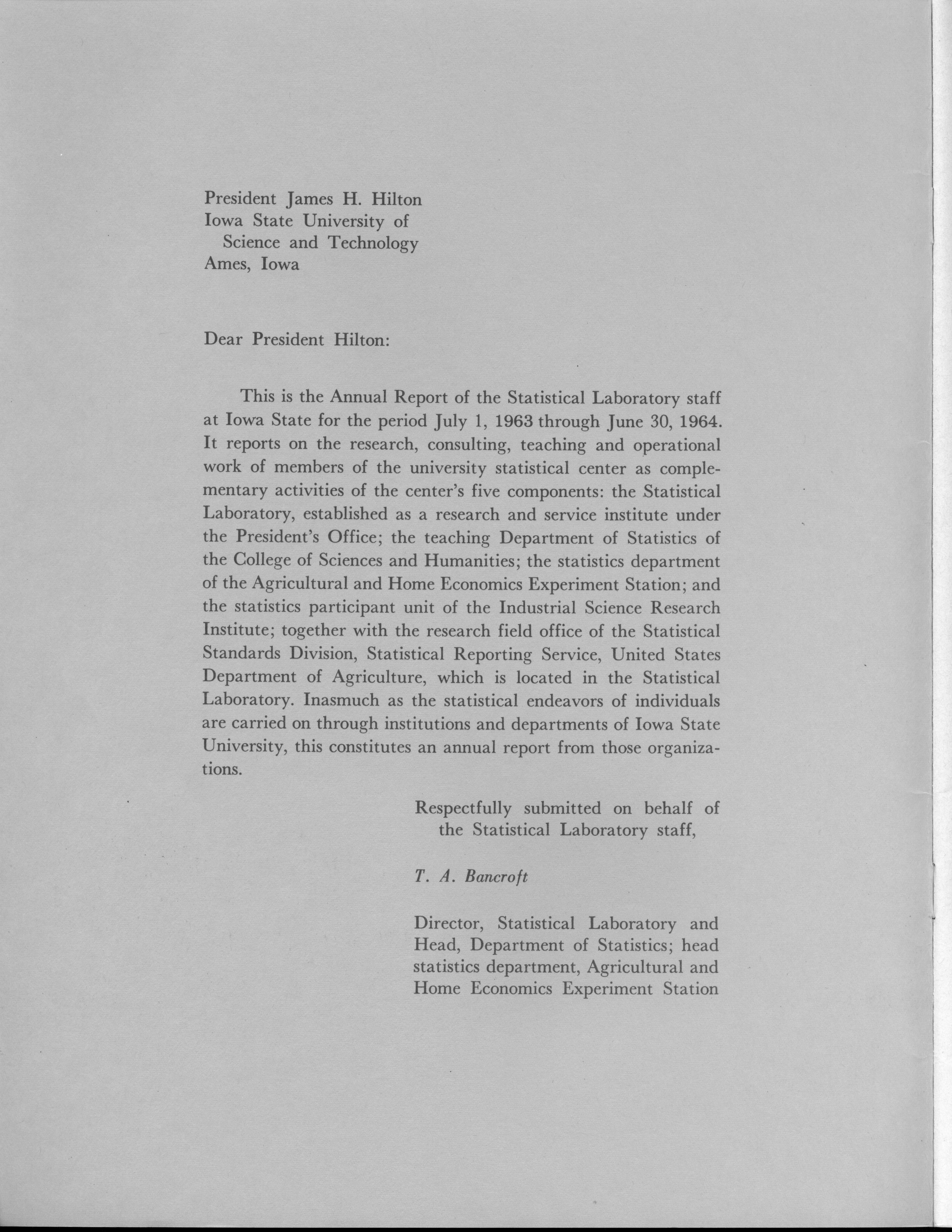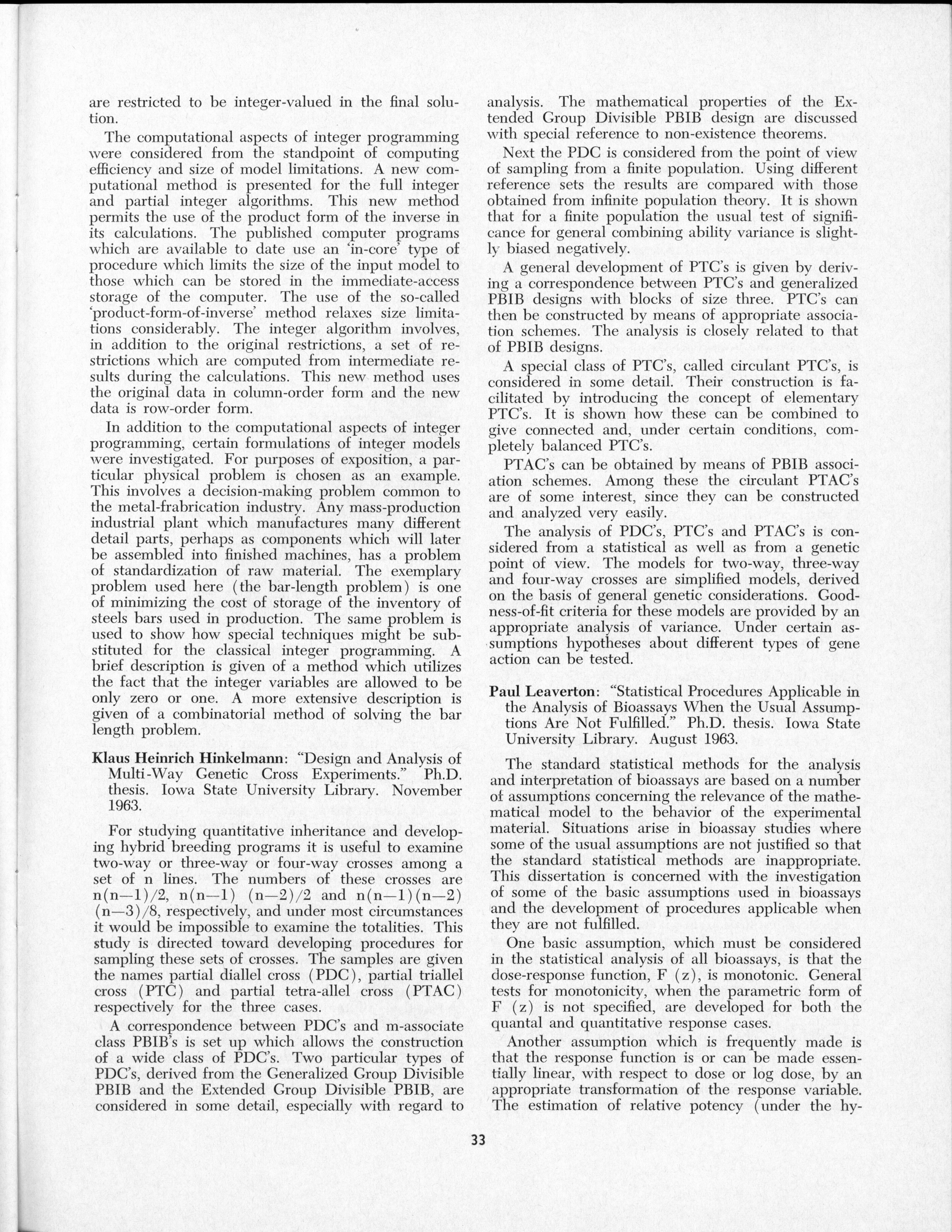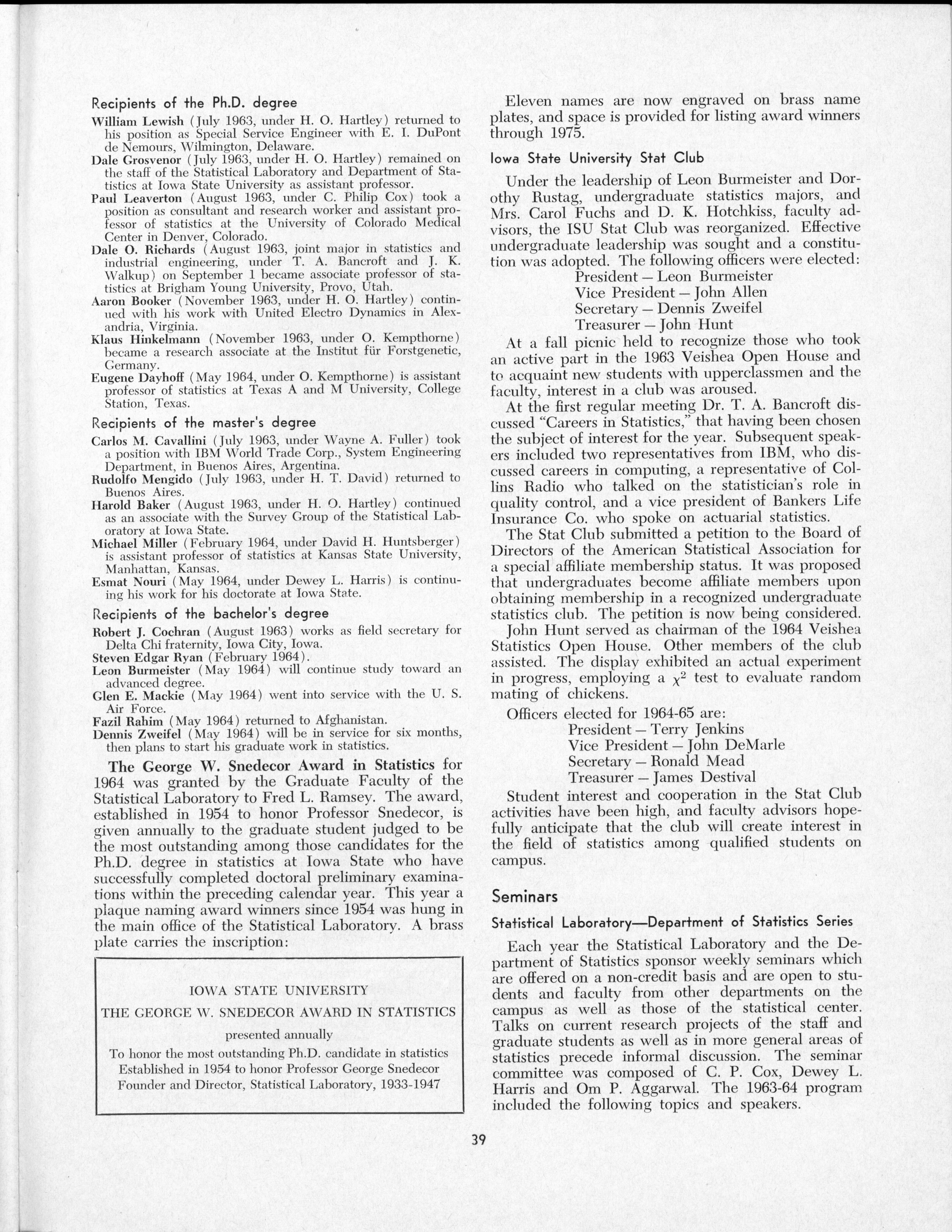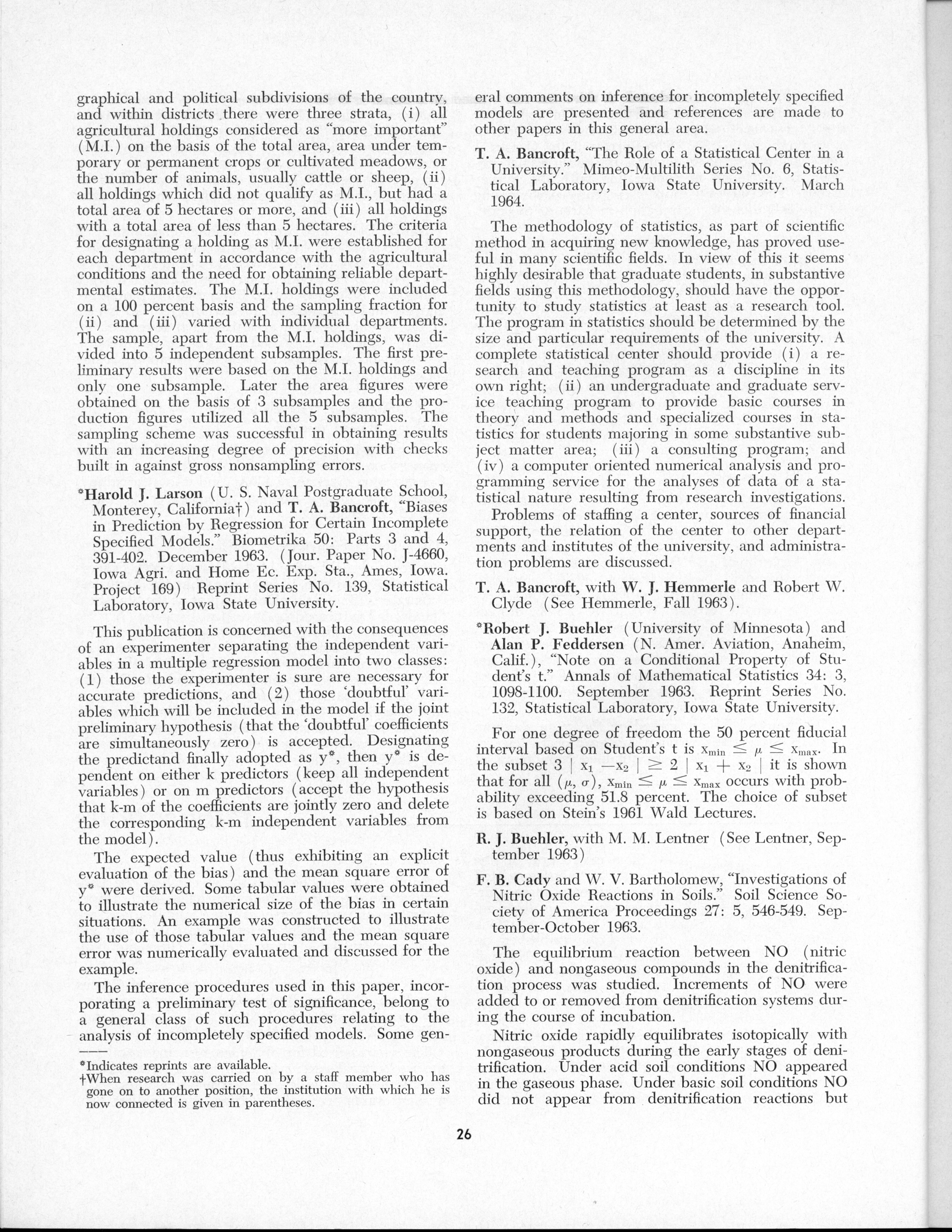 - "Statistical Laboratory Annual Report, July 1, 1963 to June 30, 1964", Iowa State University Statistical Laboratory Annual Reports, Iowa State University Library Digital Collections