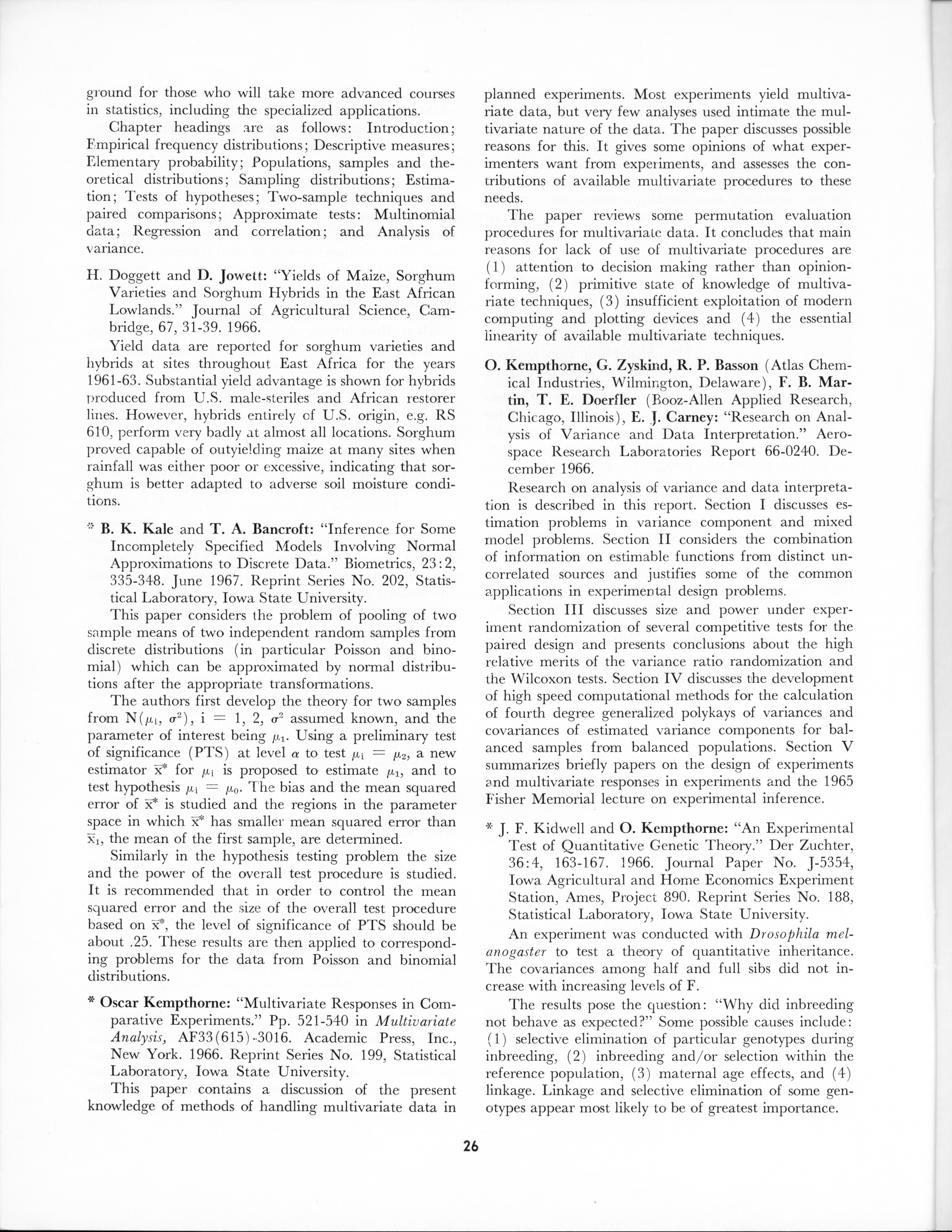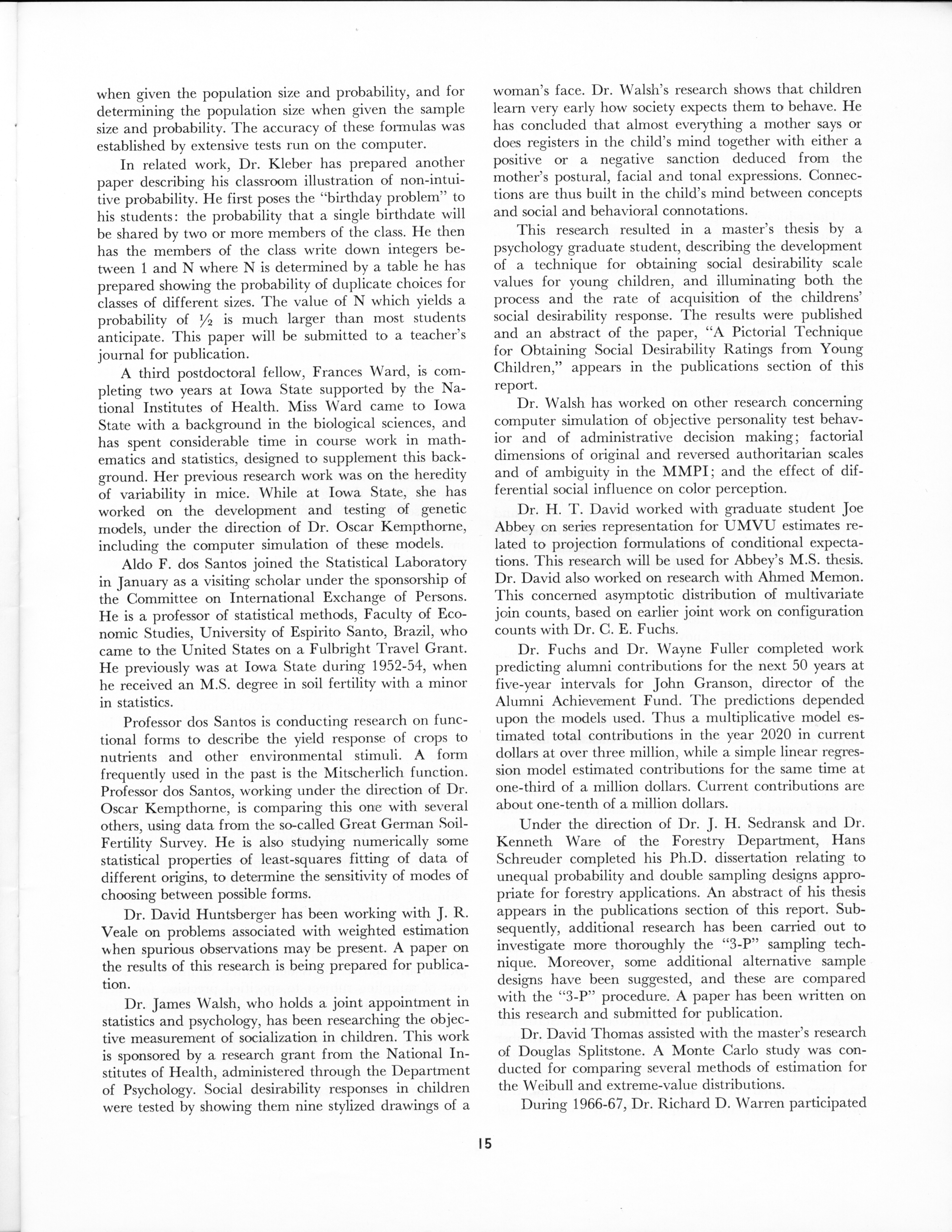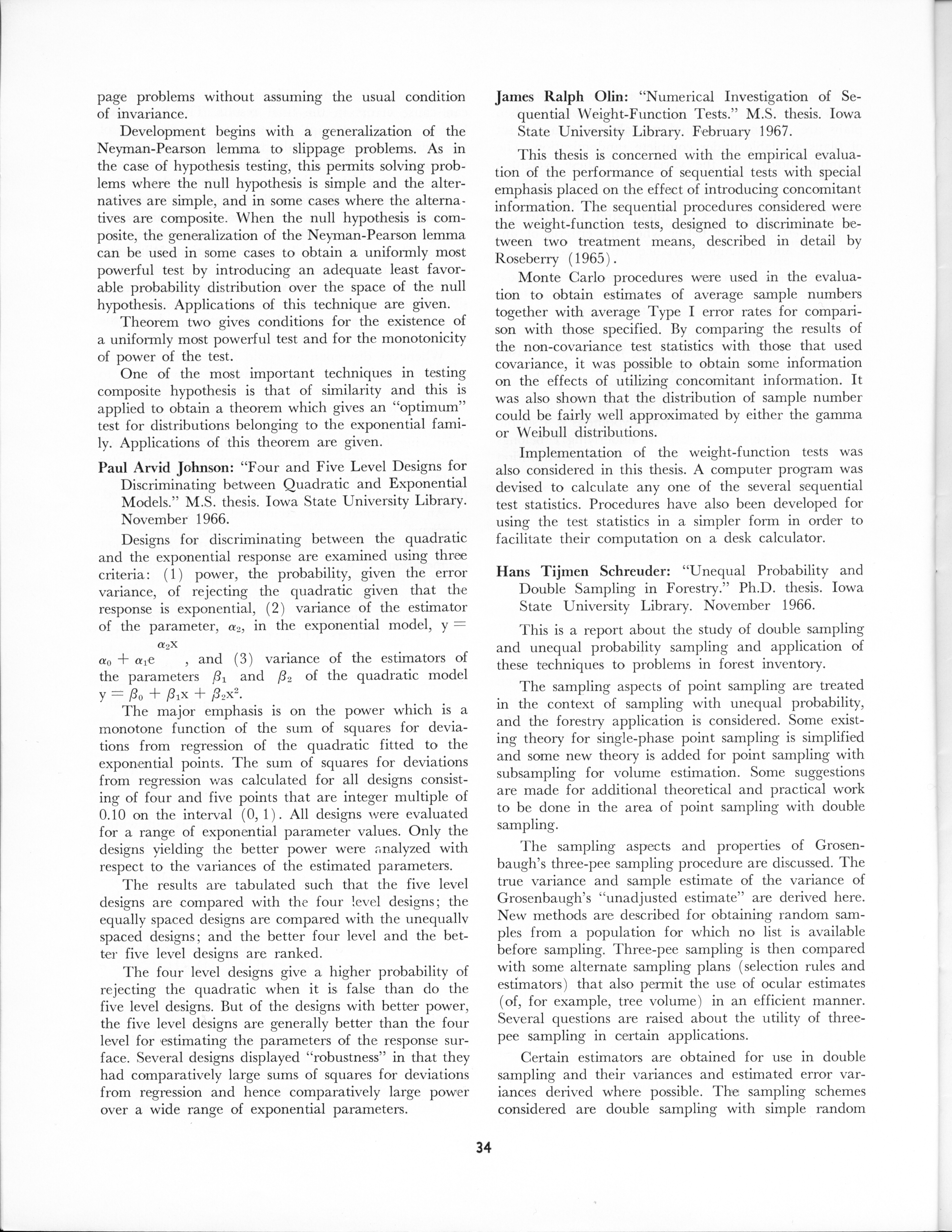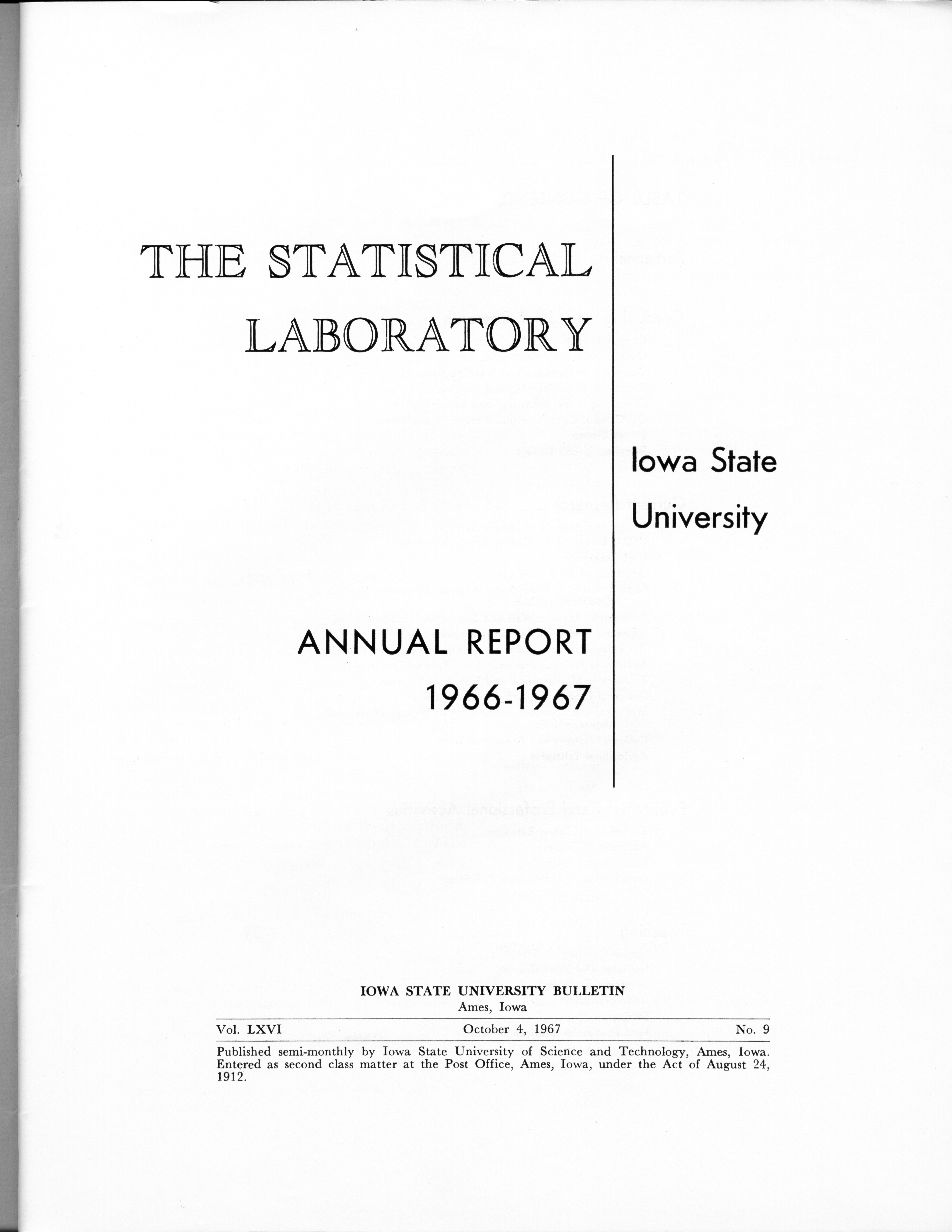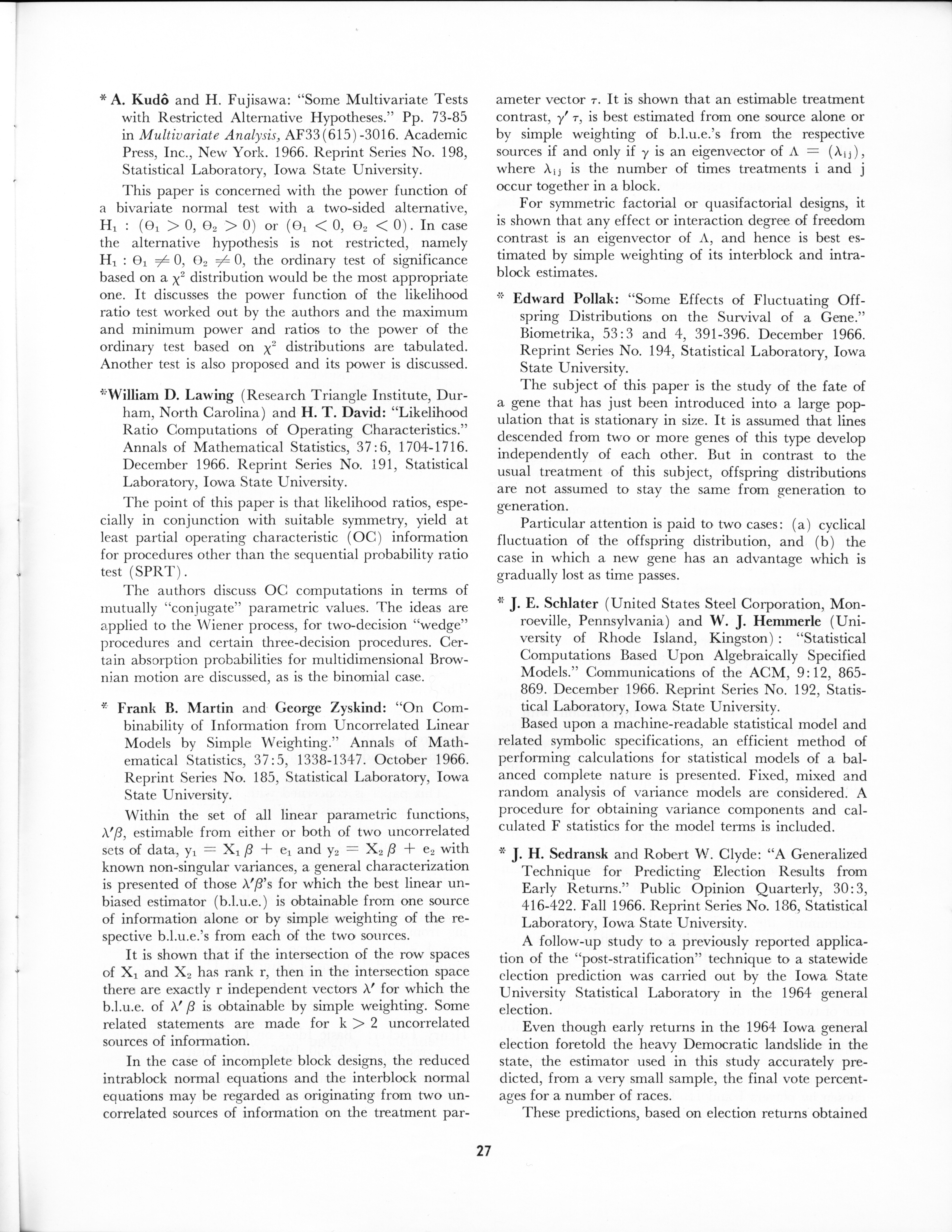 - "Statistical Laboratory Annual Report, July 1, 1966 to June 30, 1967", Iowa State University Statistical Laboratory Annual Reports, Iowa State University Library Digital Collections