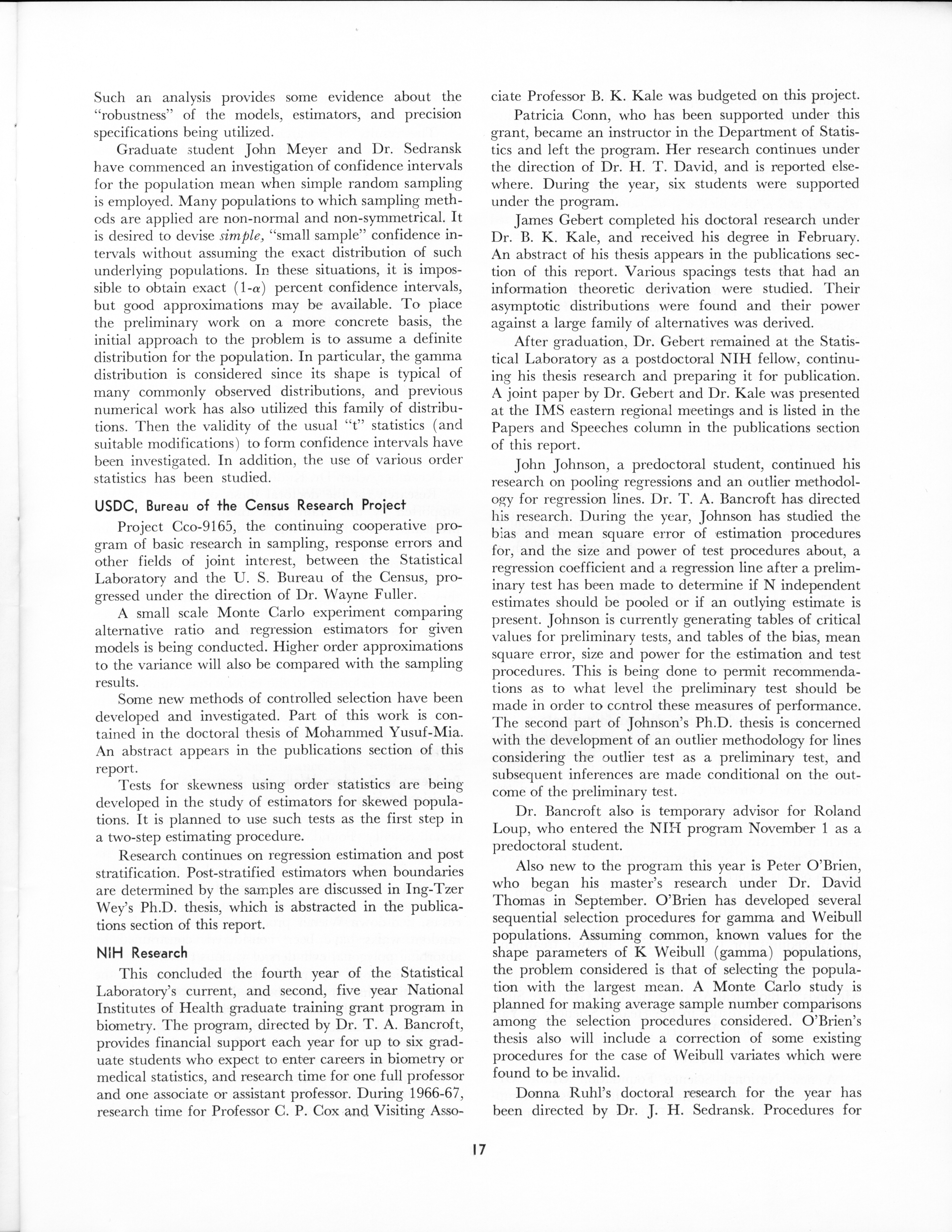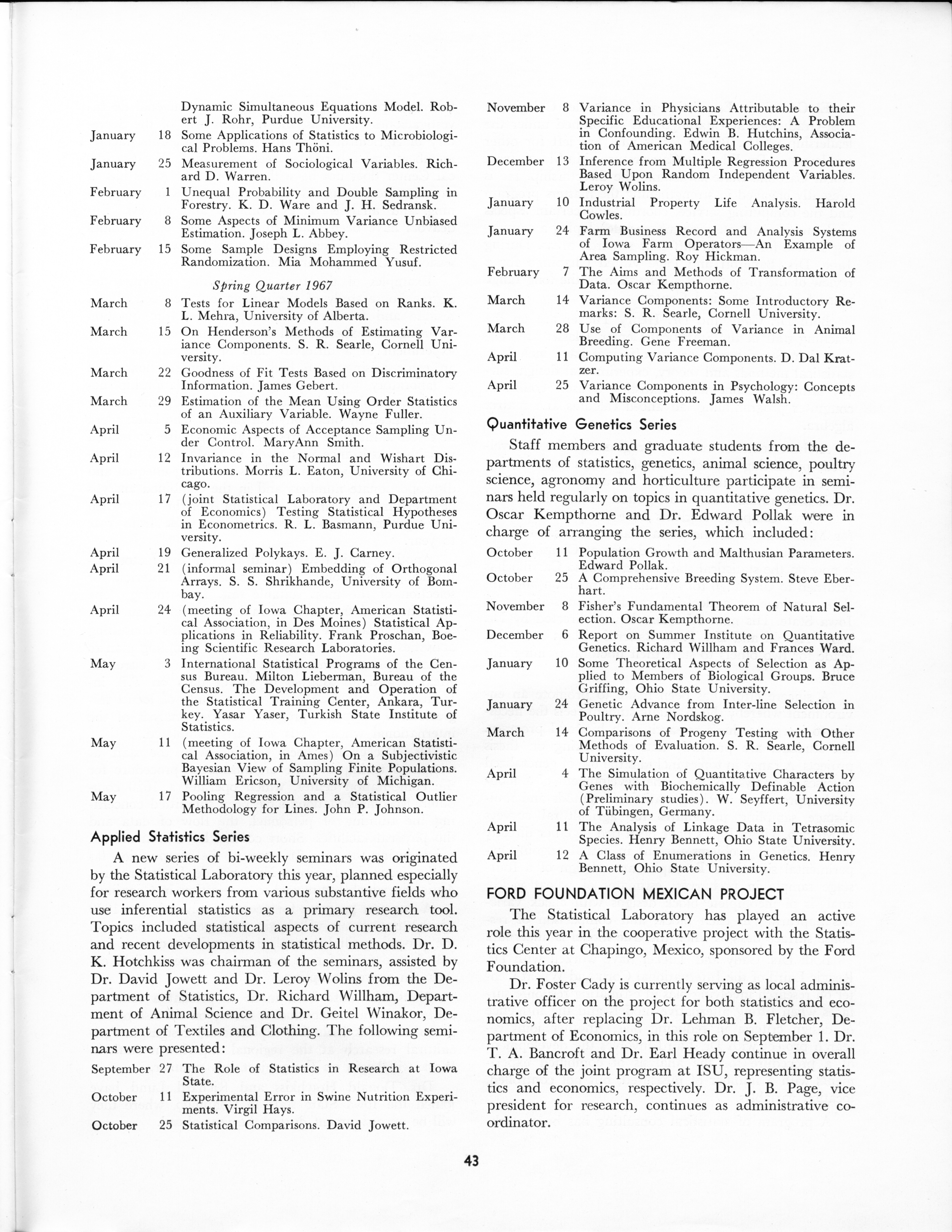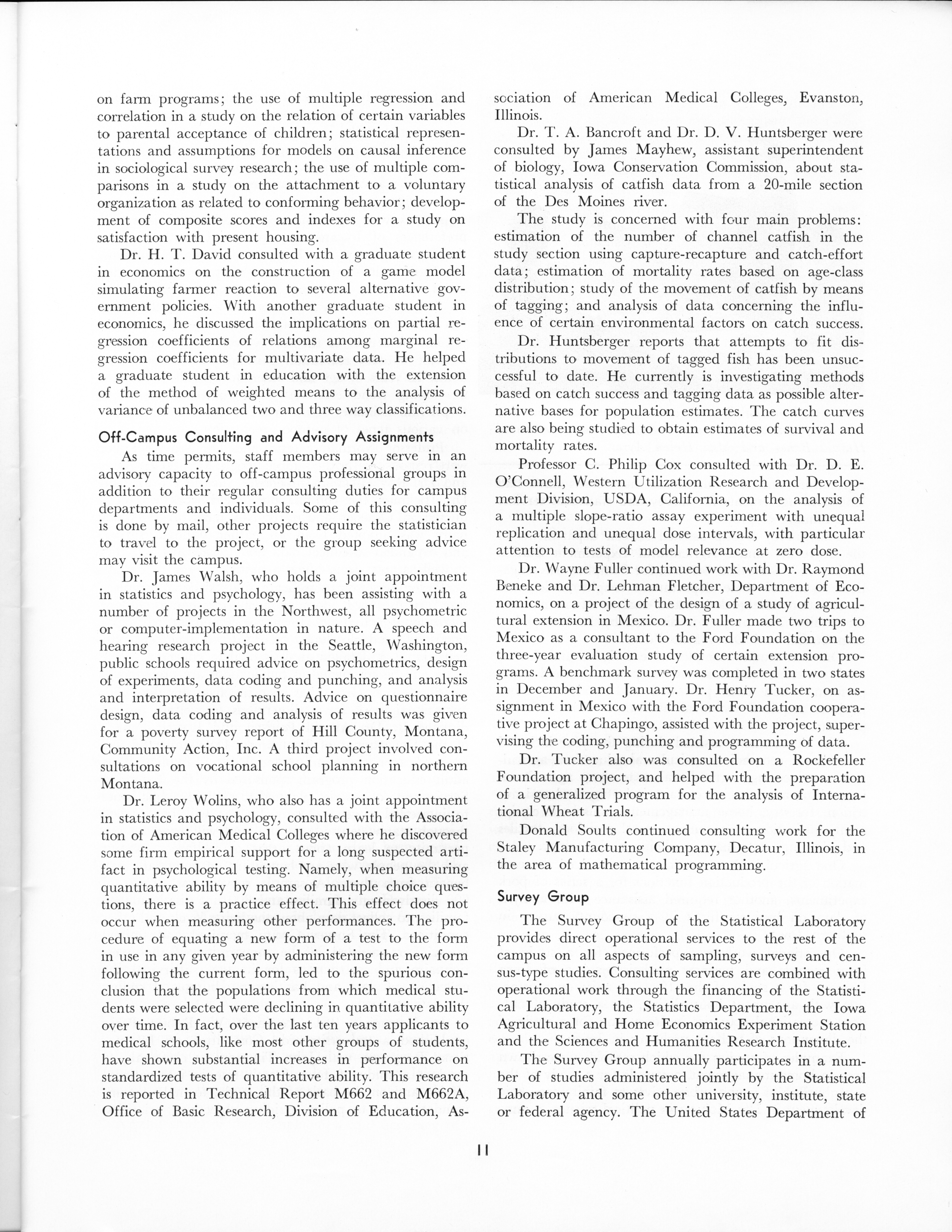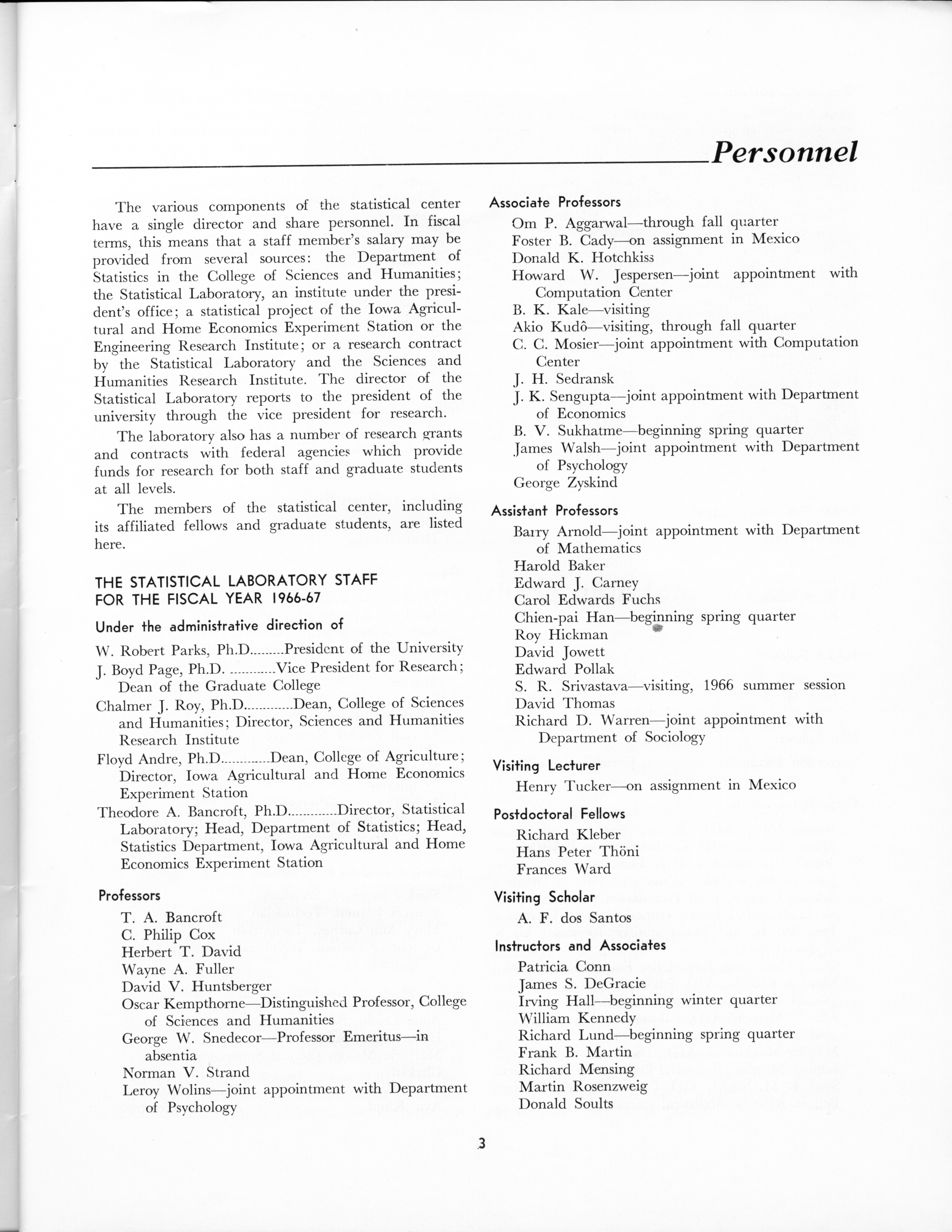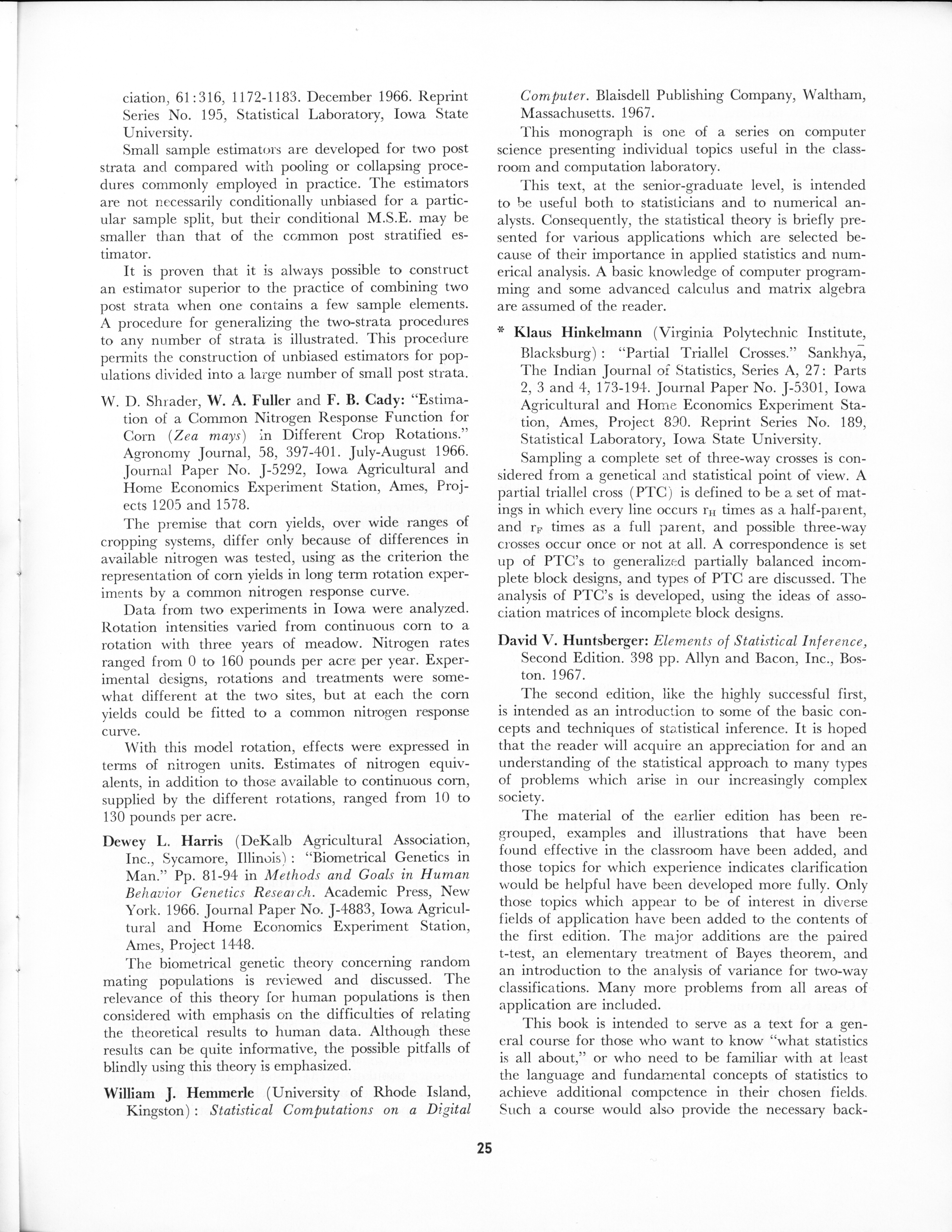 - "Statistical Laboratory Annual Report, July 1, 1966 to June 30, 1967", Iowa State University Statistical Laboratory Annual Reports, Iowa State University Library Digital Collections