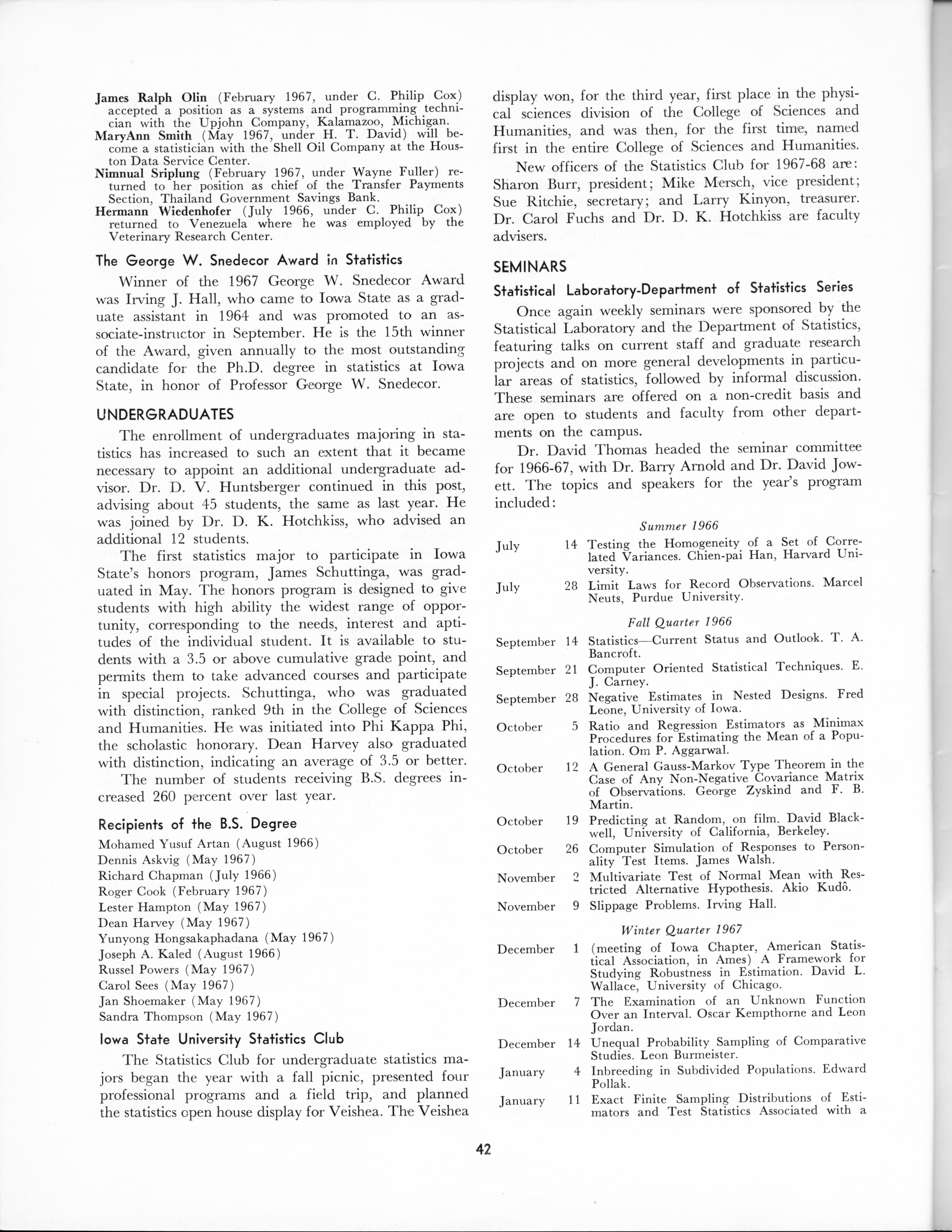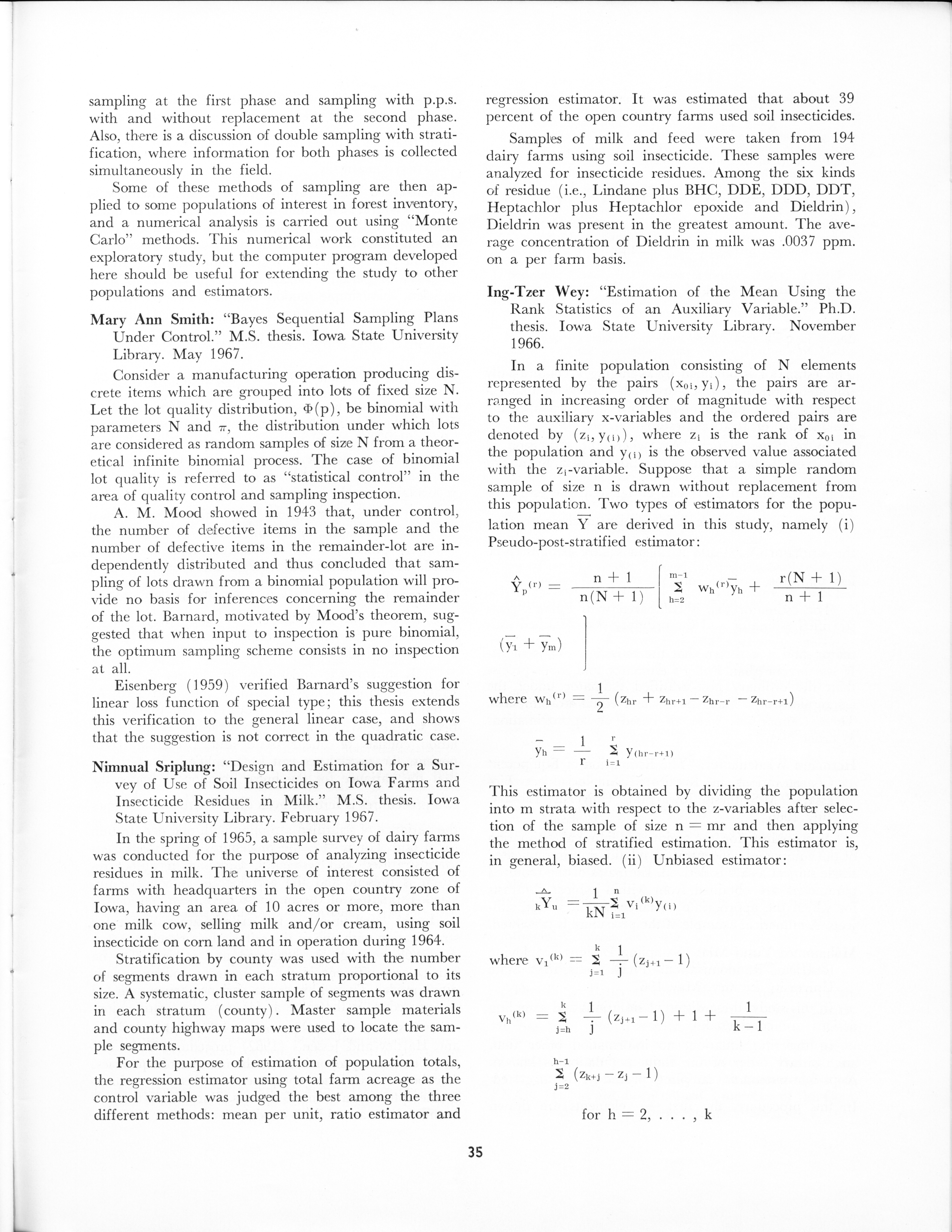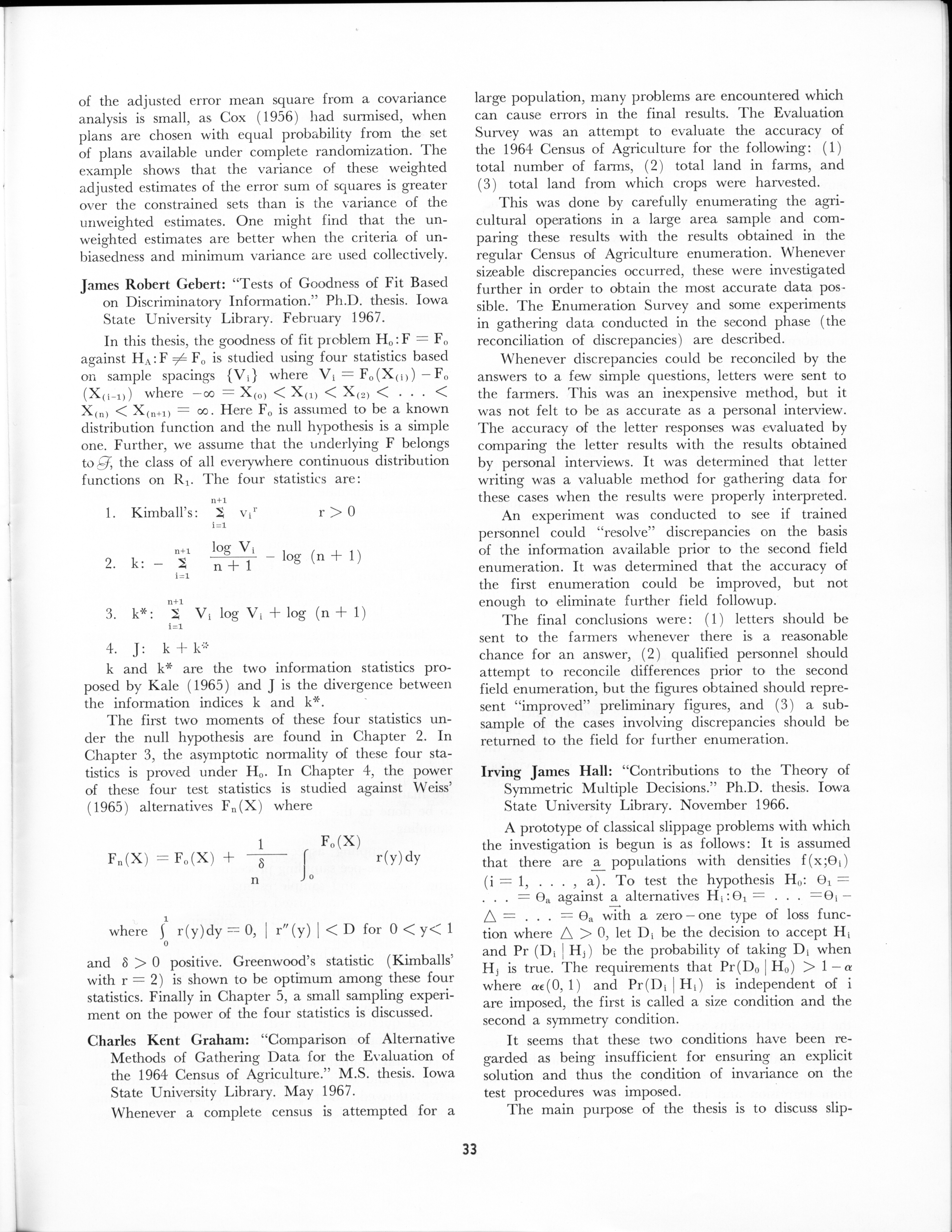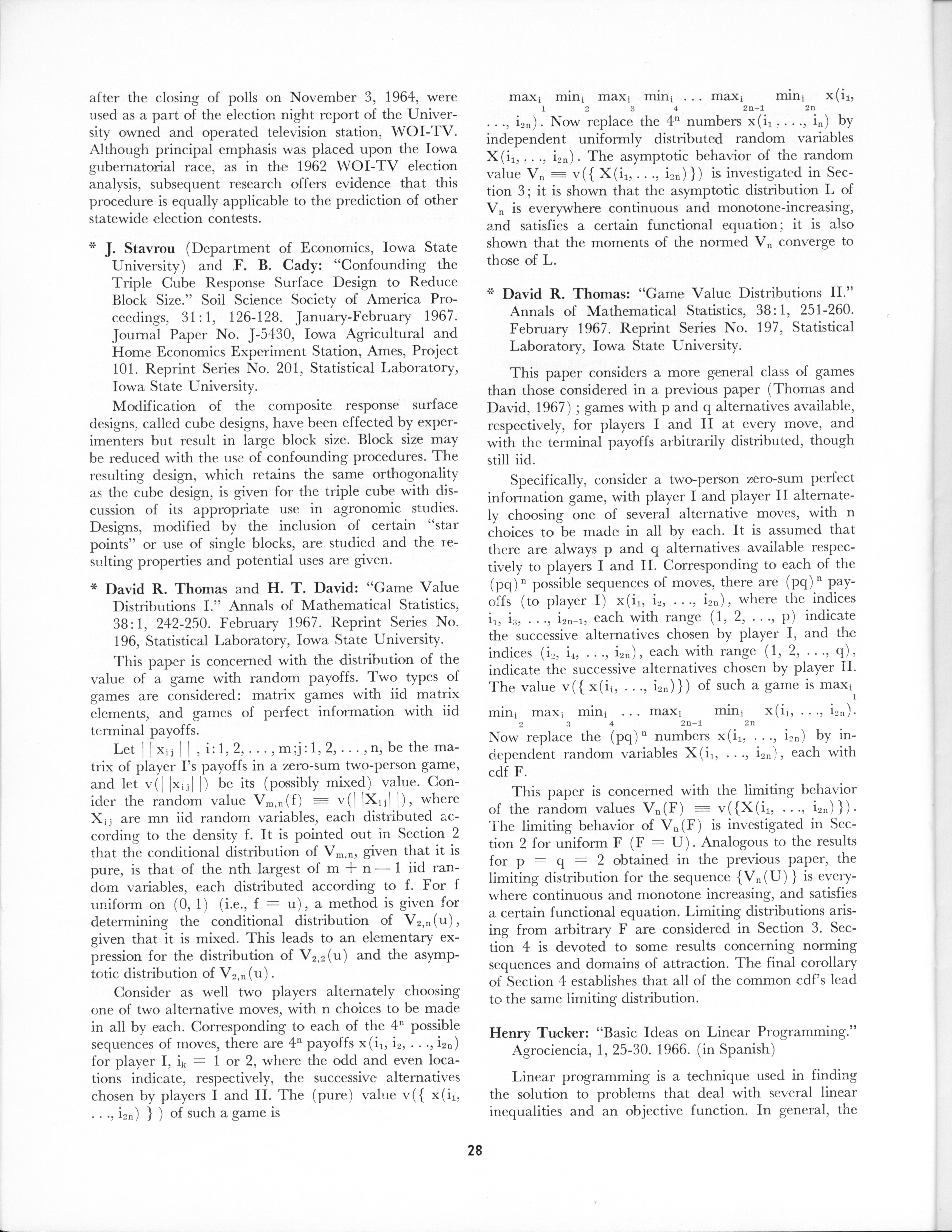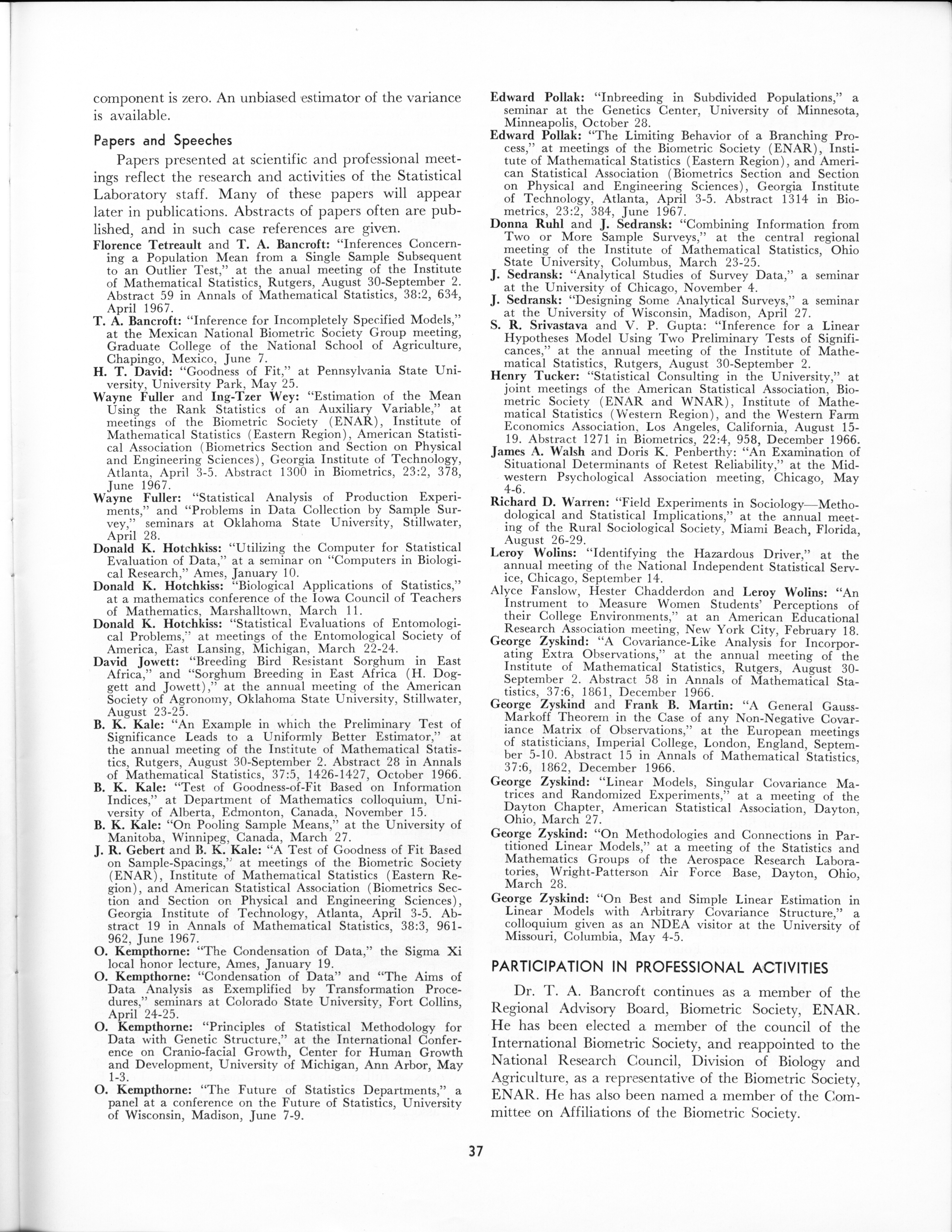 - "Statistical Laboratory Annual Report, July 1, 1966 to June 30, 1967", Iowa State University Statistical Laboratory Annual Reports, Iowa State University Library Digital Collections