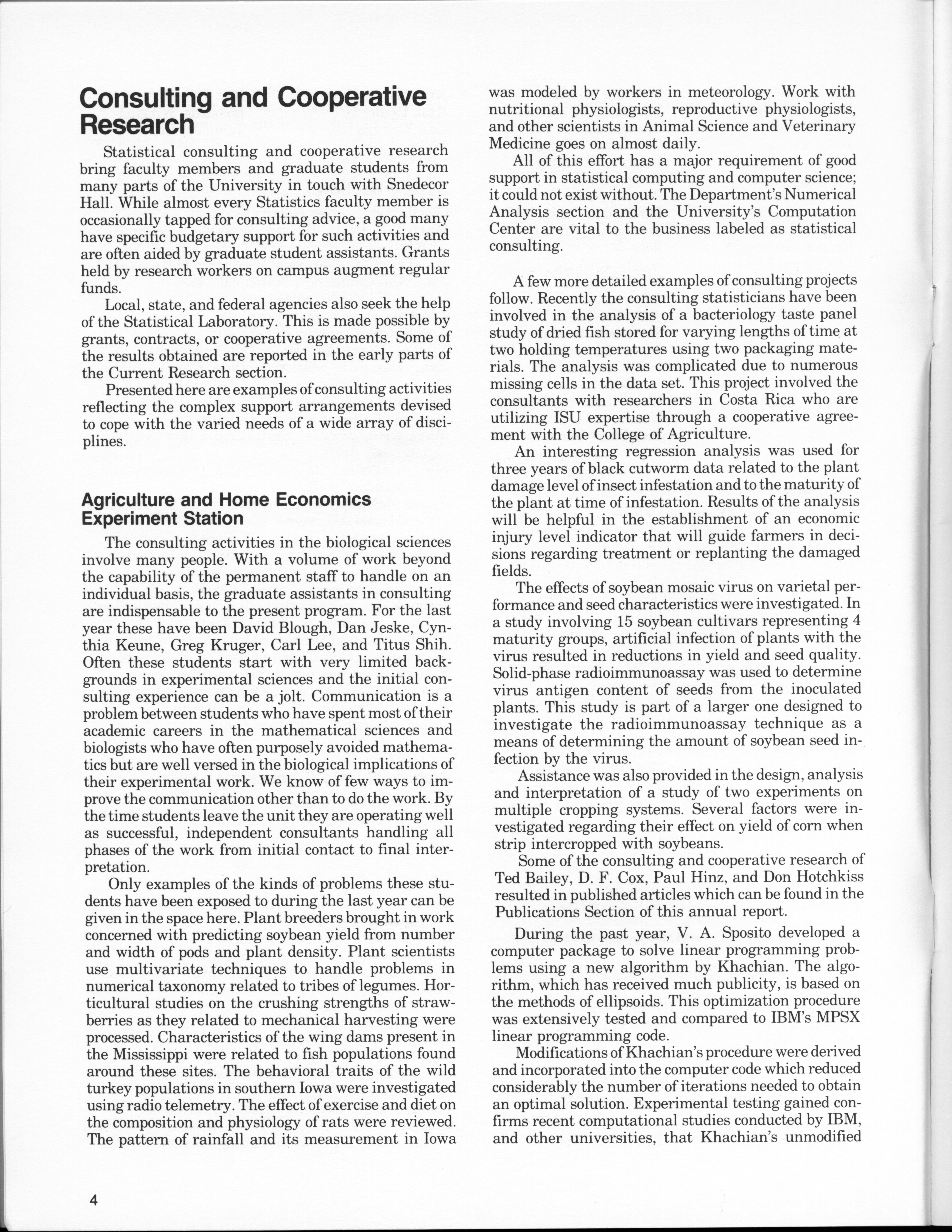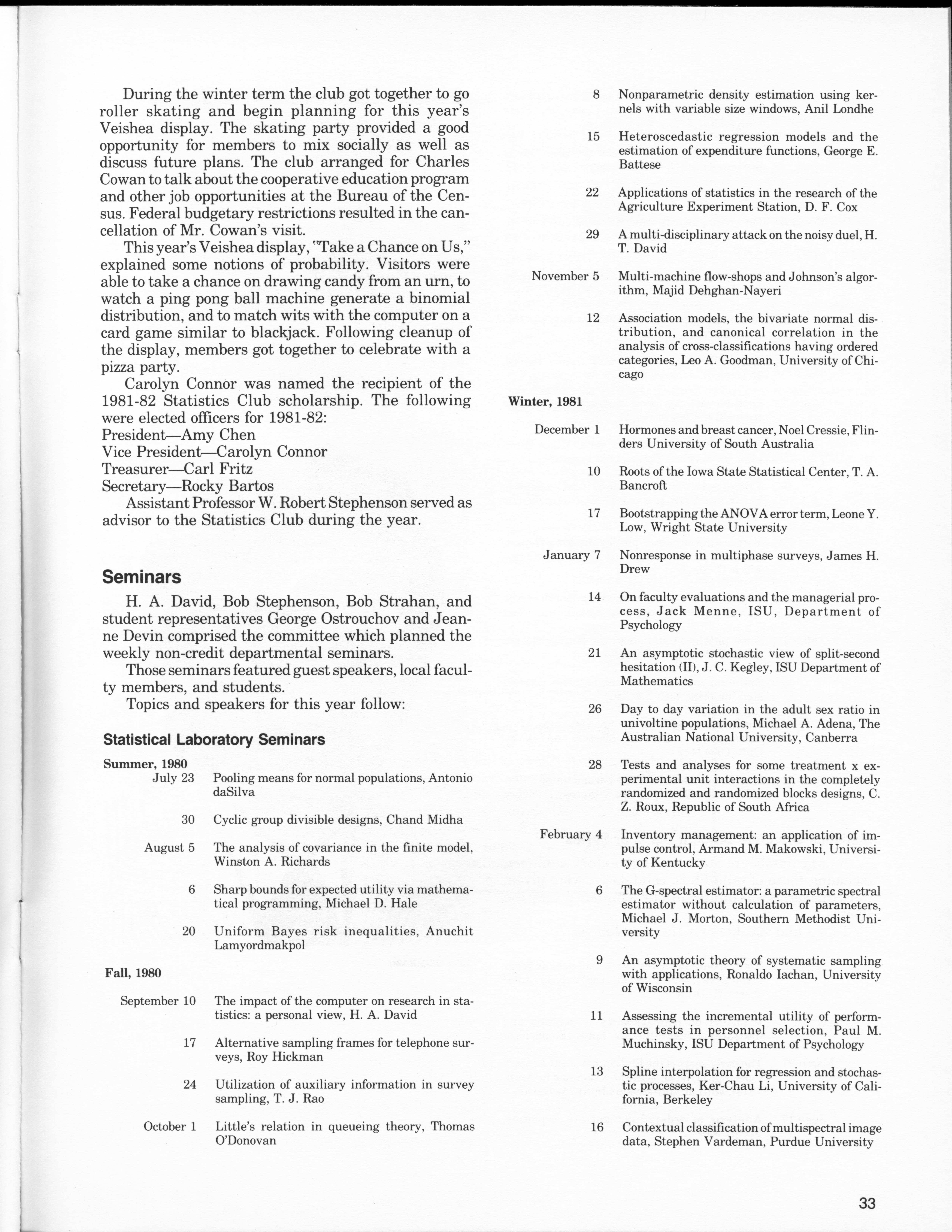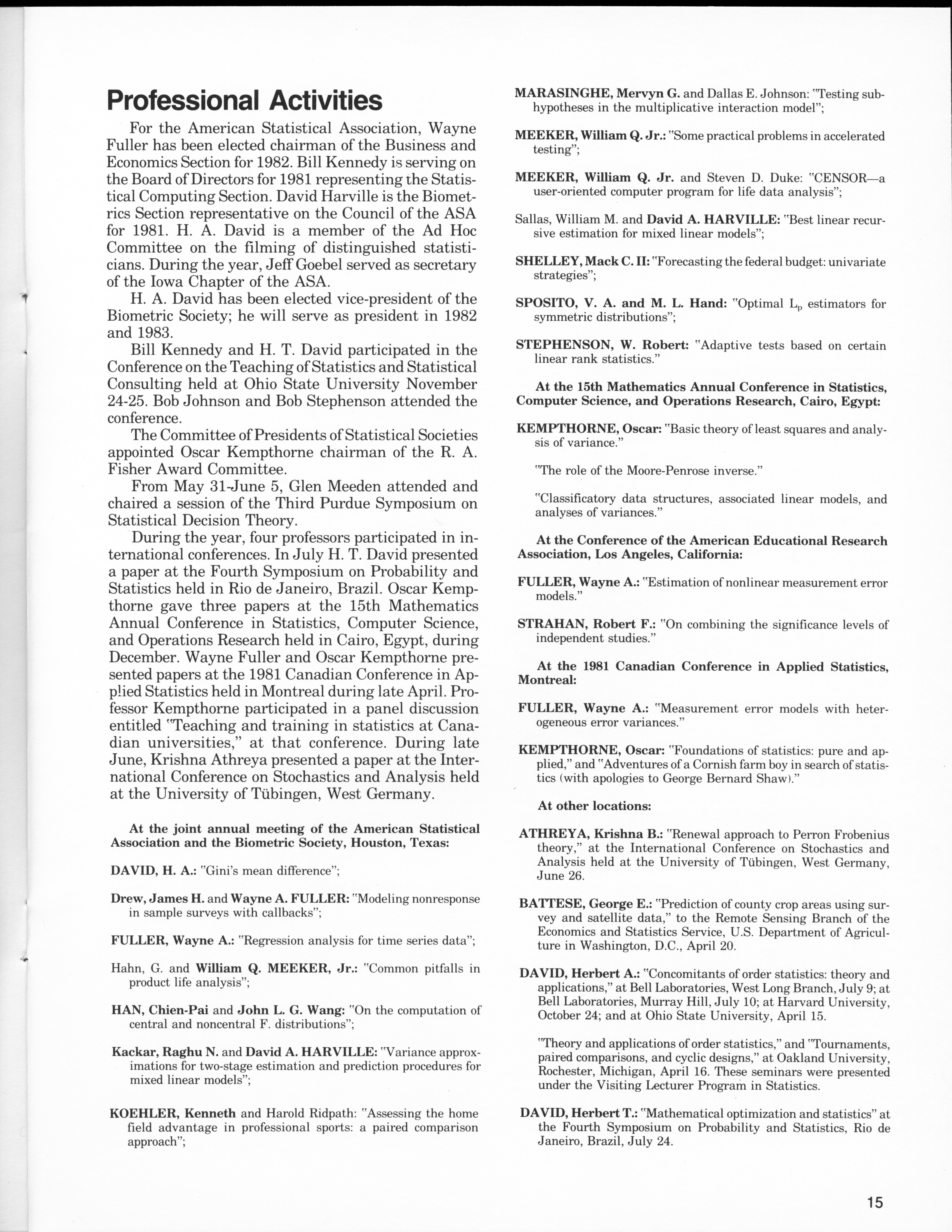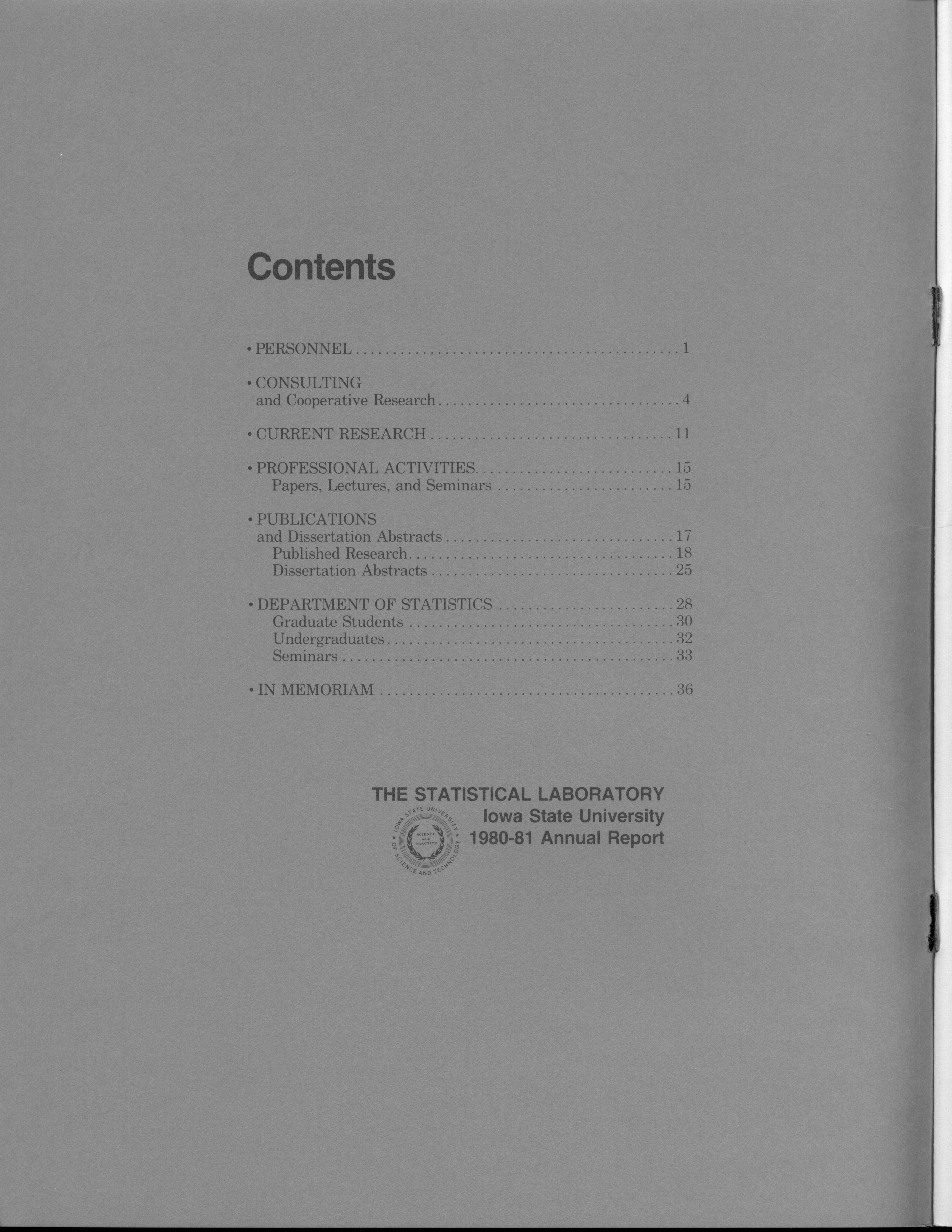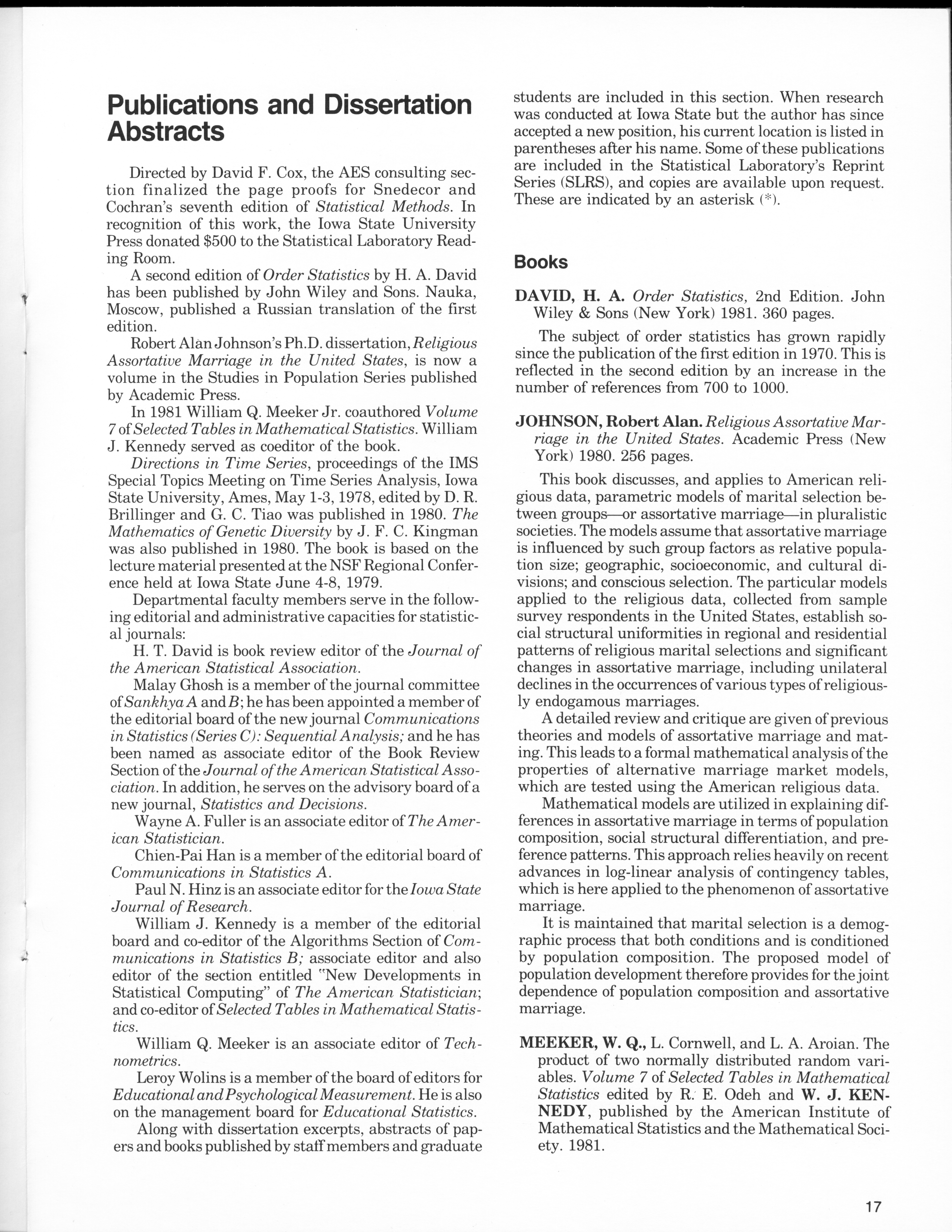 - "Statistical Laboratory Annual Report, July 1, 1980 to June 30, 1981", Iowa State University Statistical Laboratory Annual Reports, Iowa State University Library Digital Collections