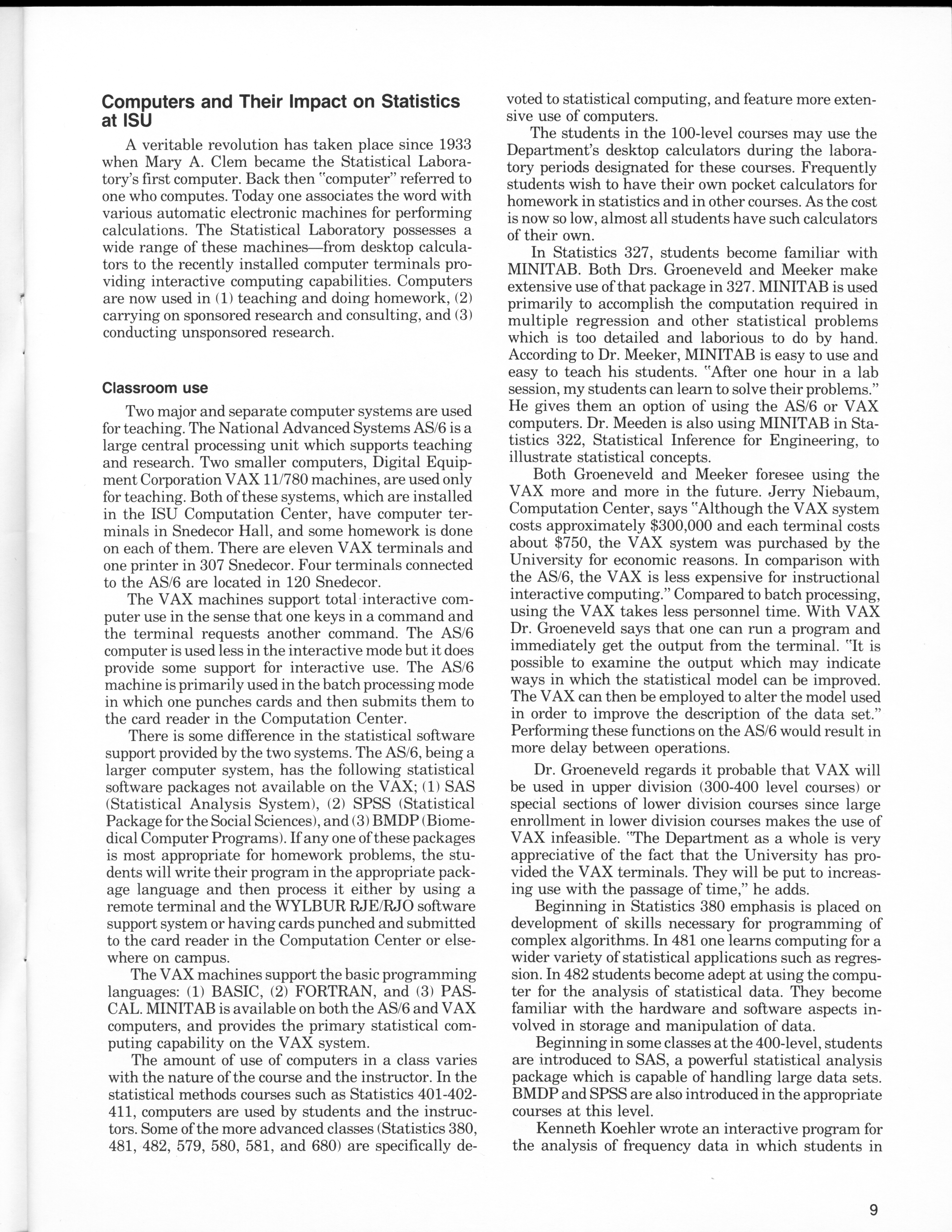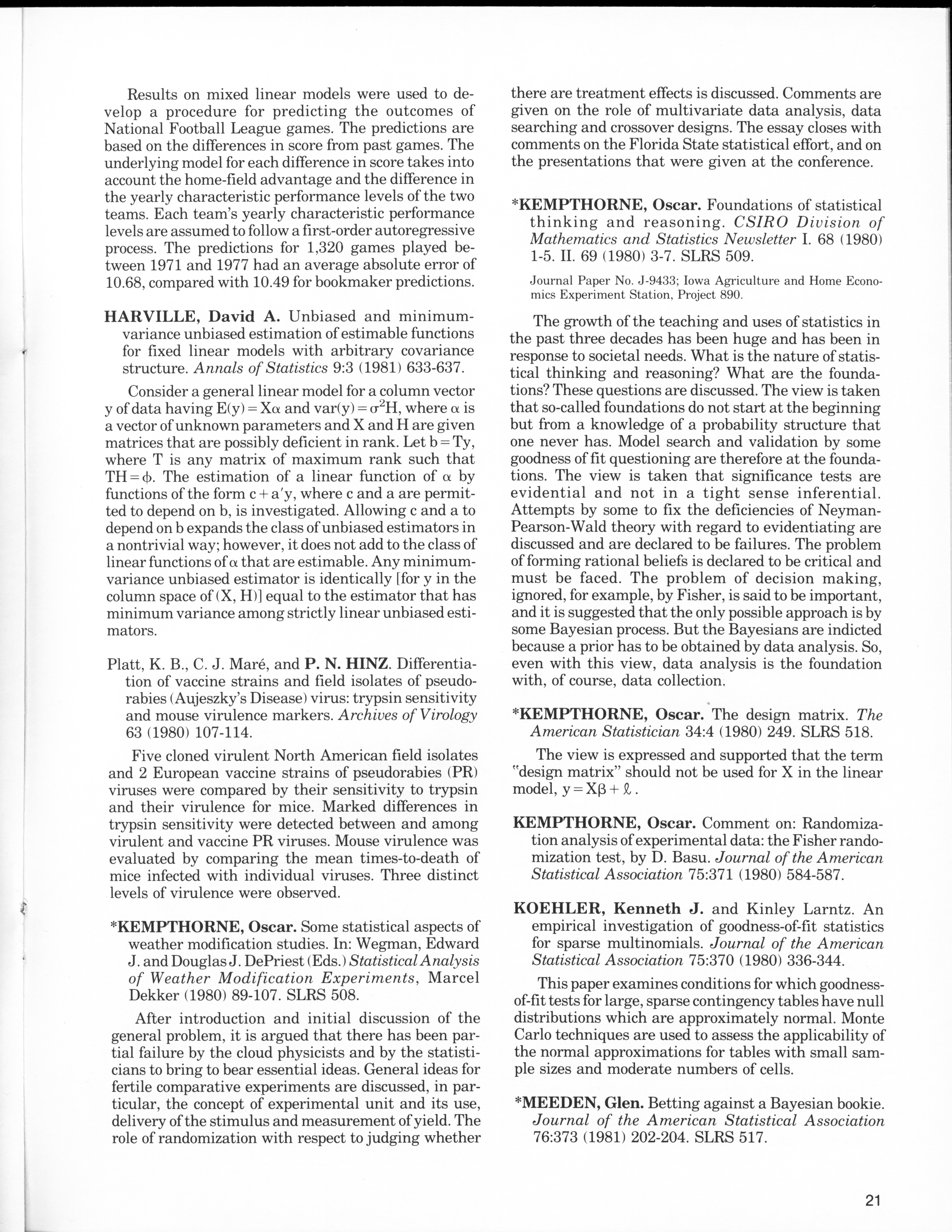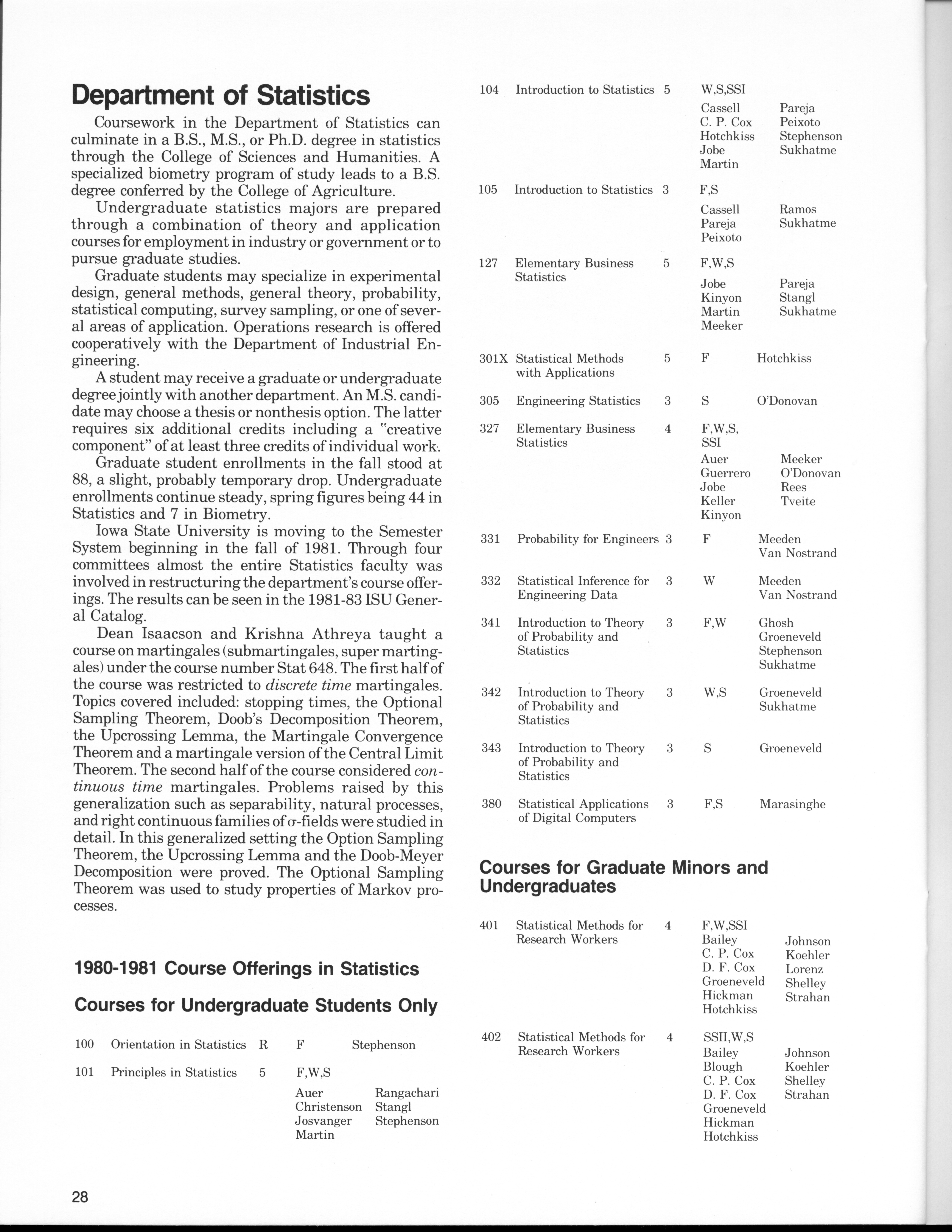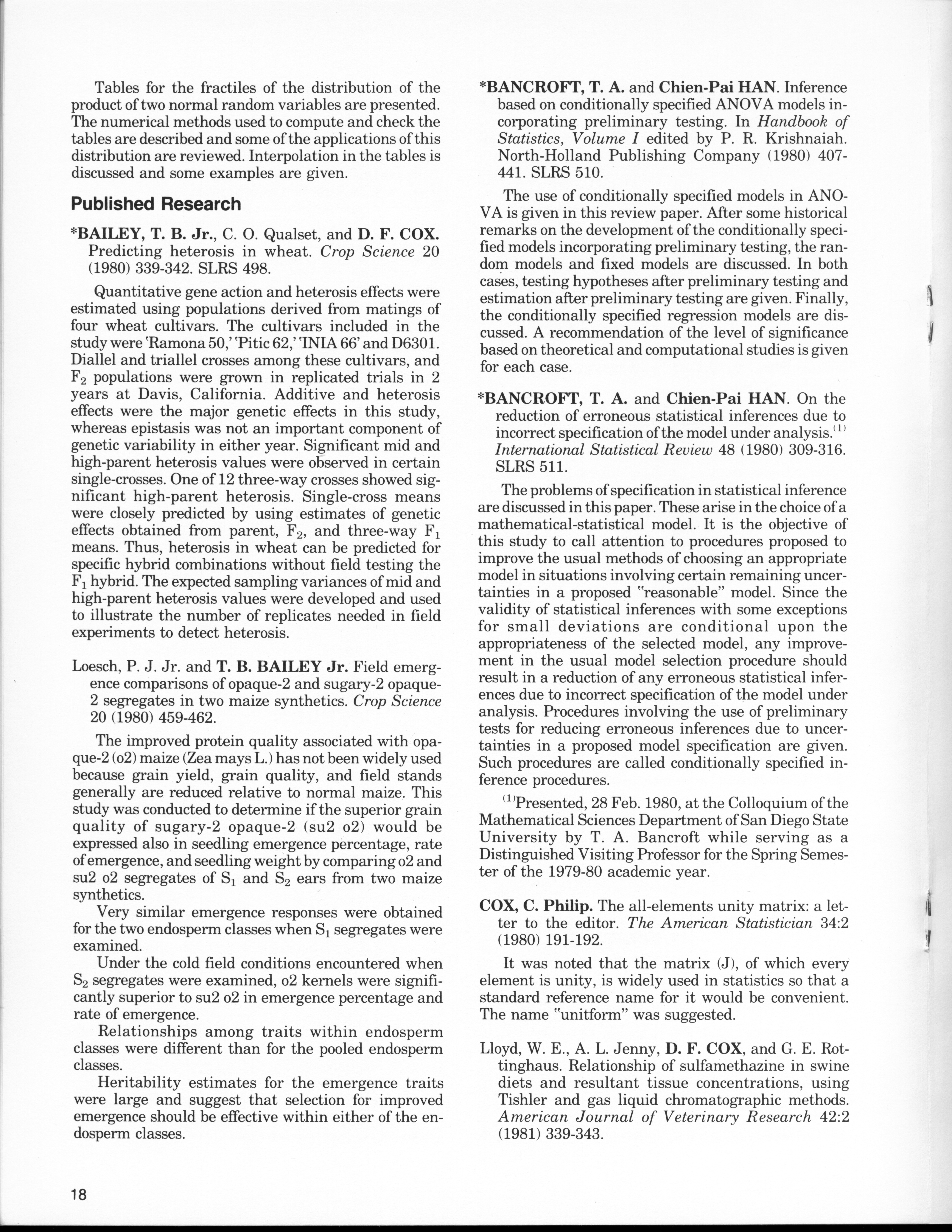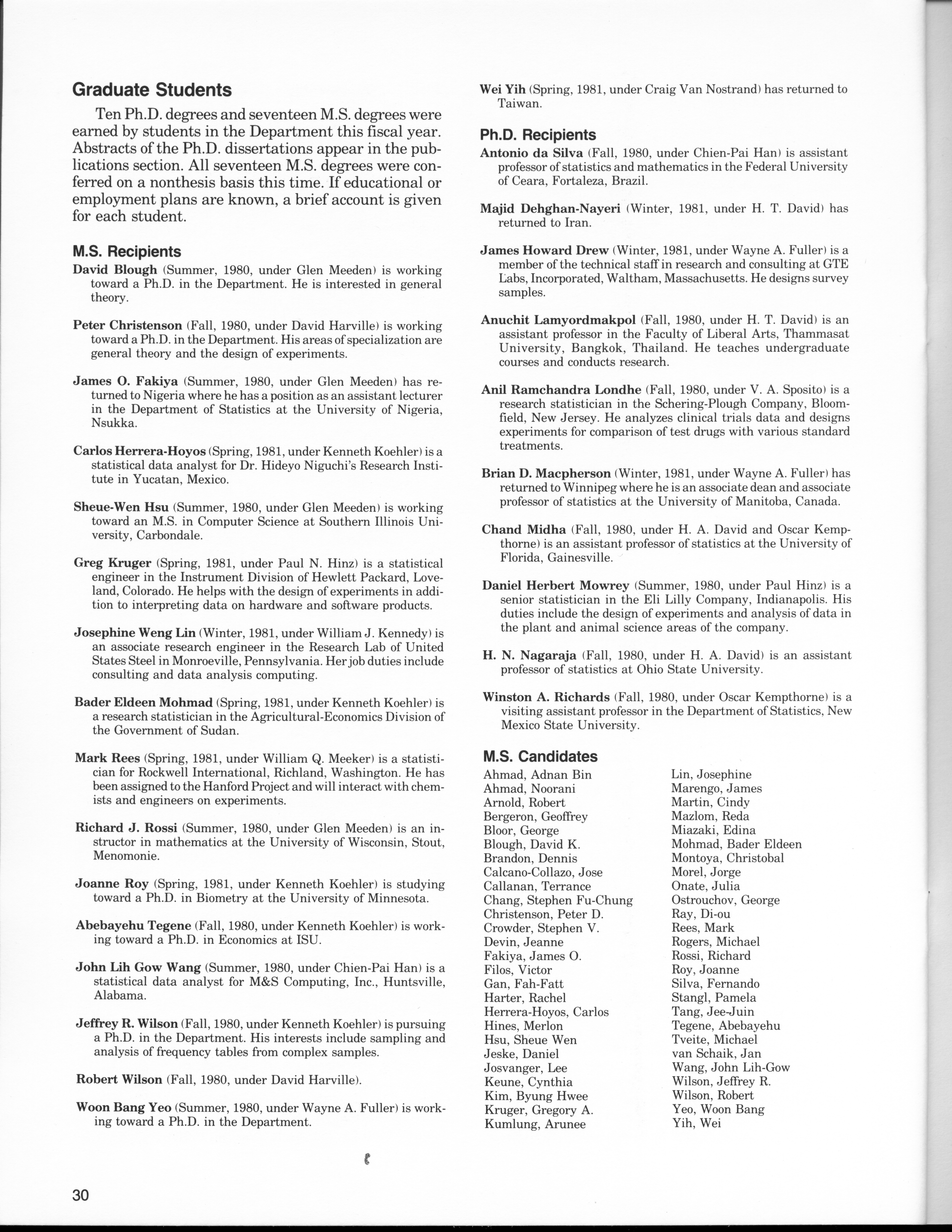 - "Statistical Laboratory Annual Report, July 1, 1980 to June 30, 1981", Iowa State University Statistical Laboratory Annual Reports, Iowa State University Library Digital Collections