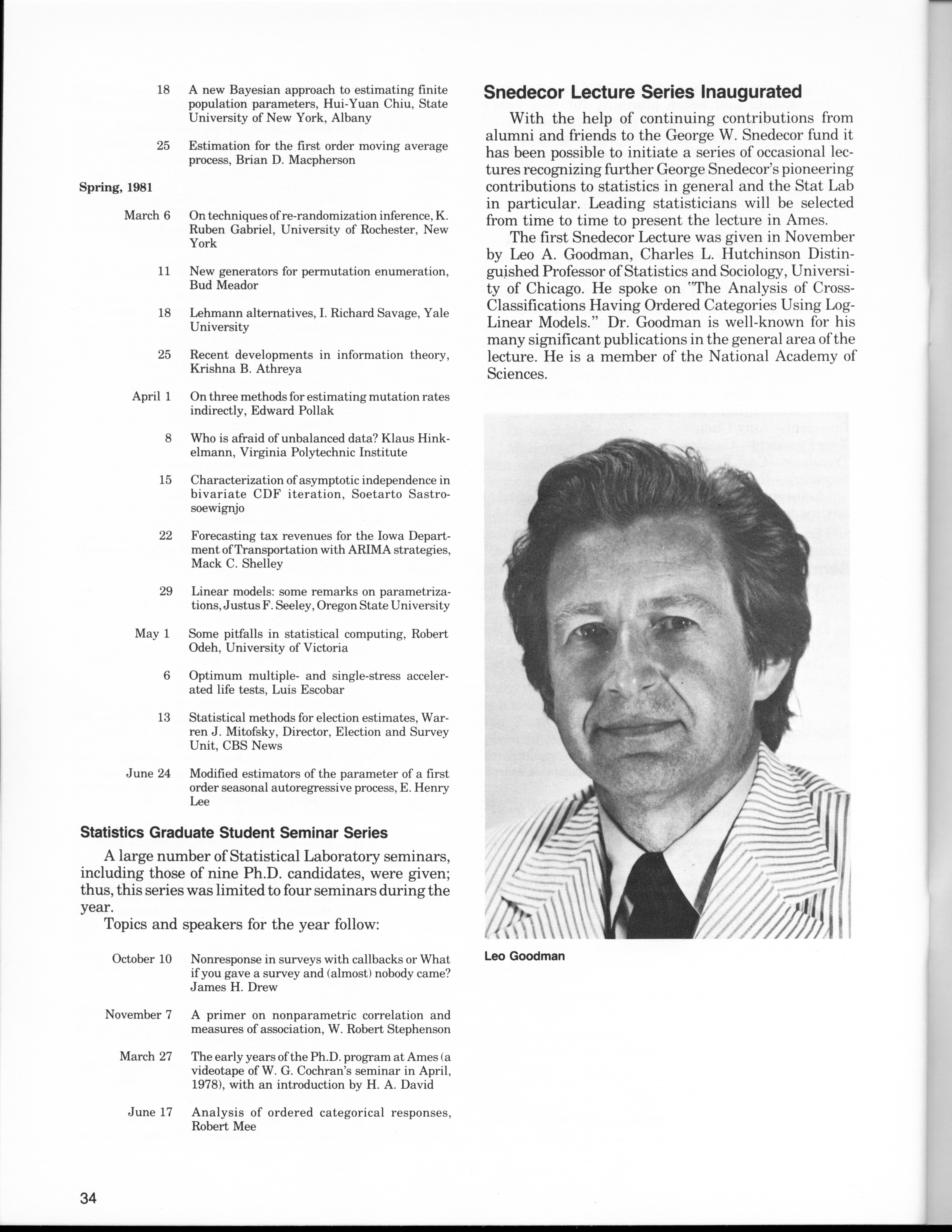 - Contents: Personnel -- Consulting and Cooperative Research -- Current Research -- Professional Activities: Papers, Lectures, Seminars -- Publications and Dissertation abstracts: Published Research, Dissertation Abstracts -- Department of Statistics: Graduate Students, Undergraduates, Seminars -- In Memoriam