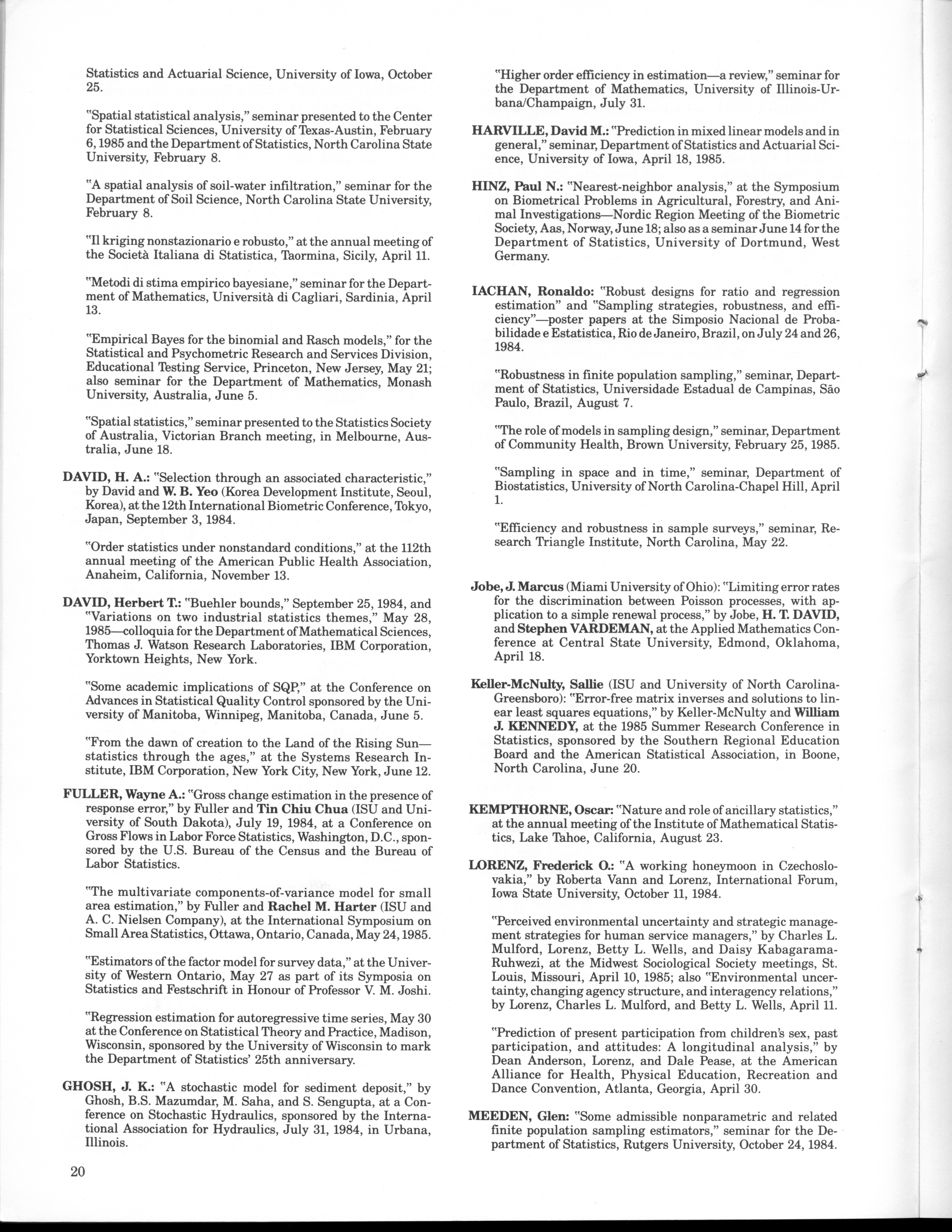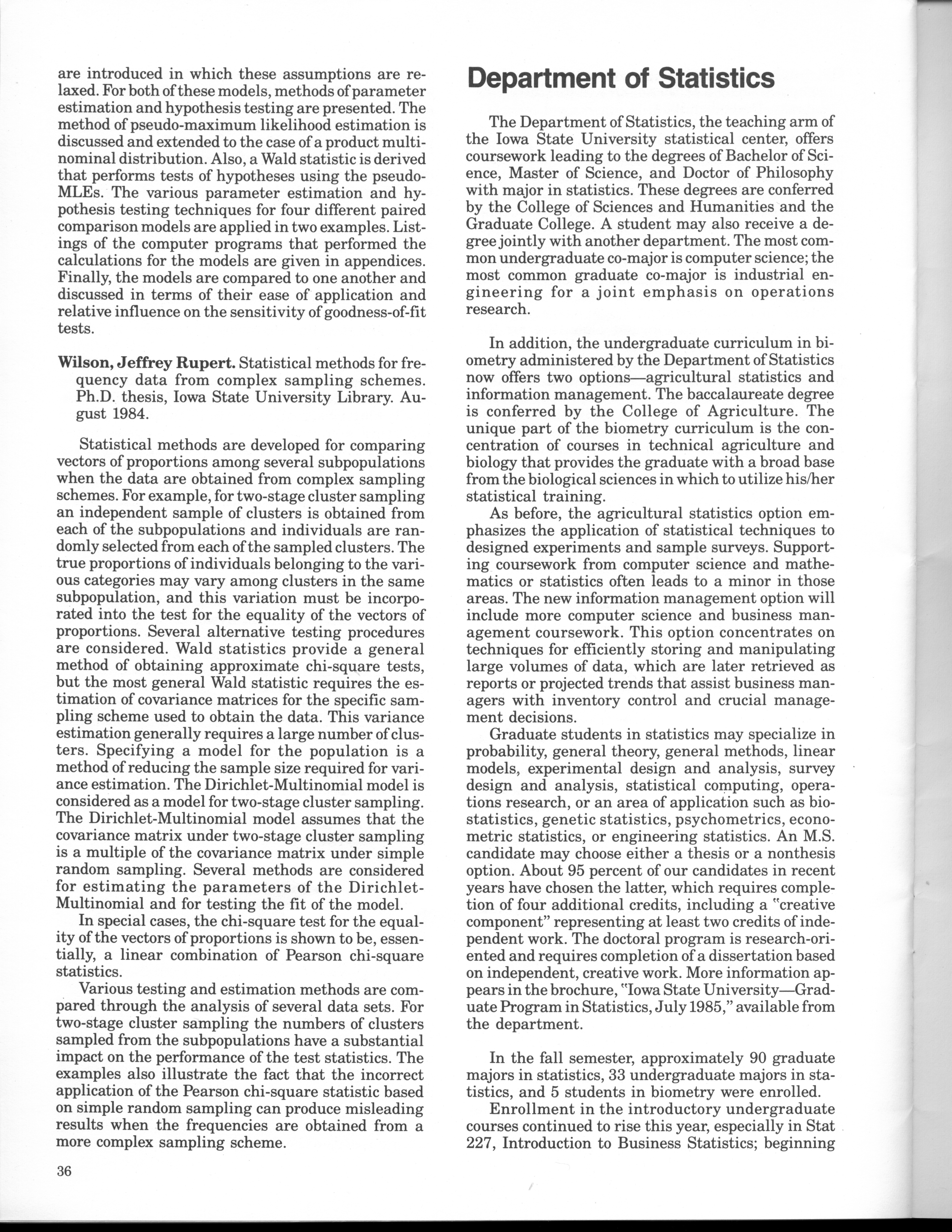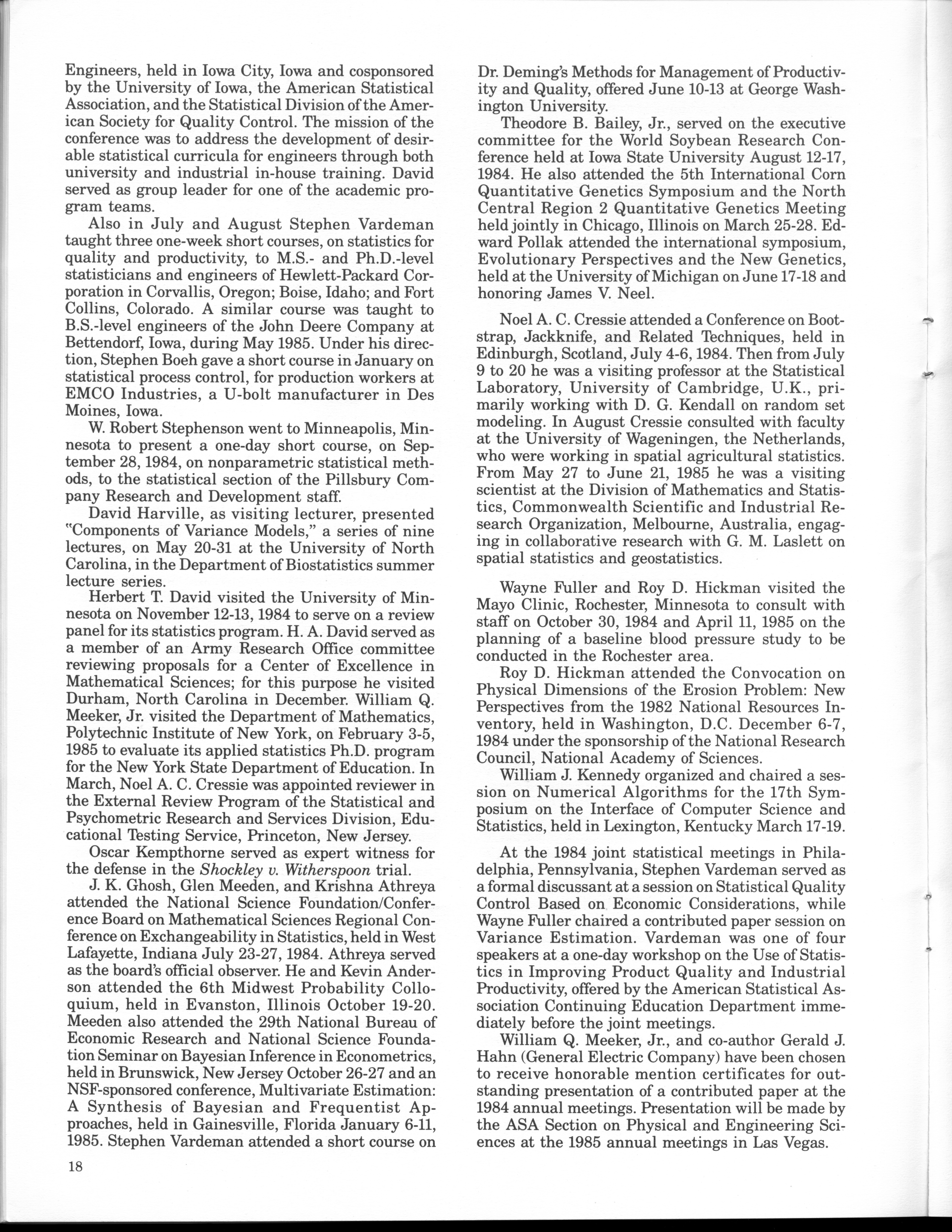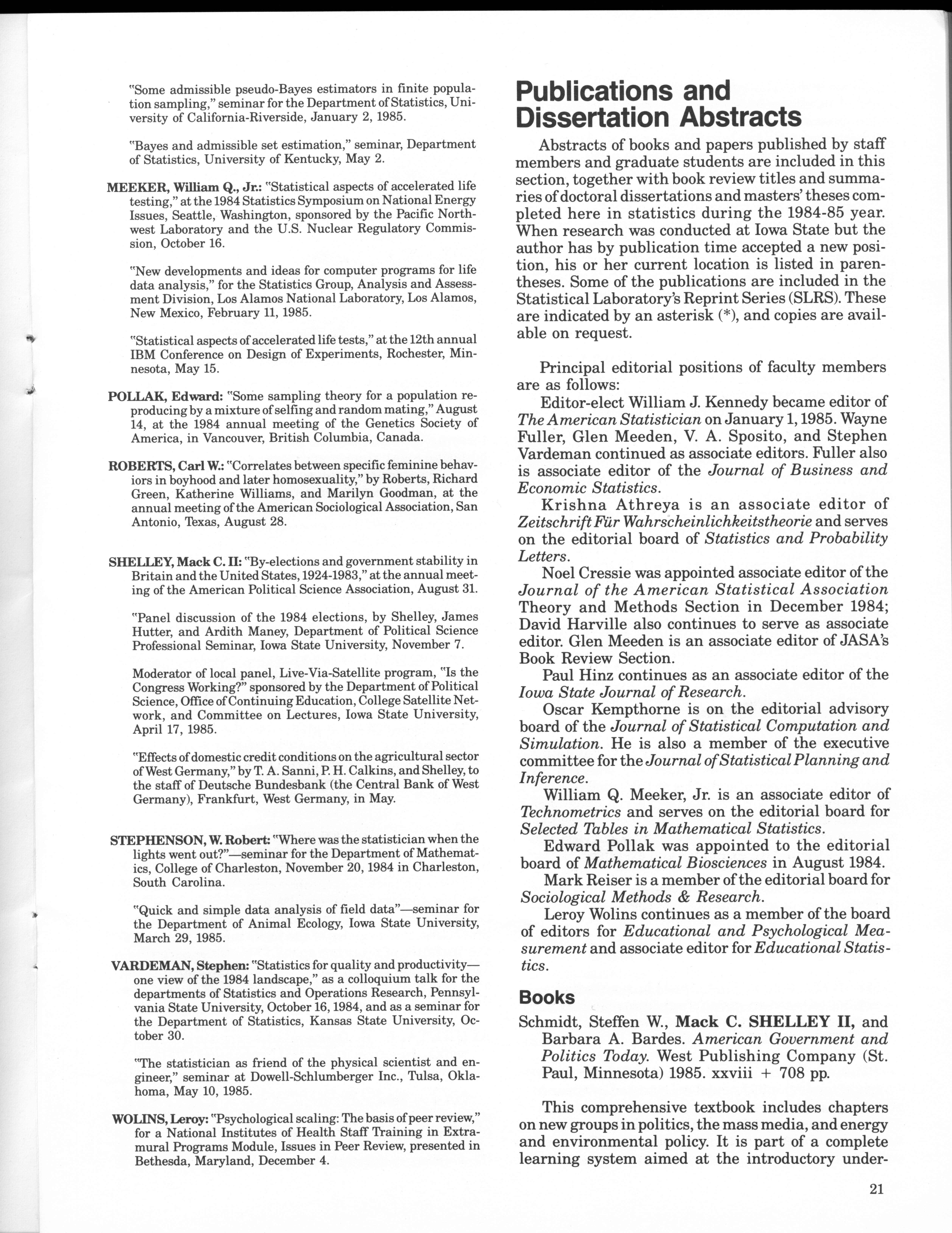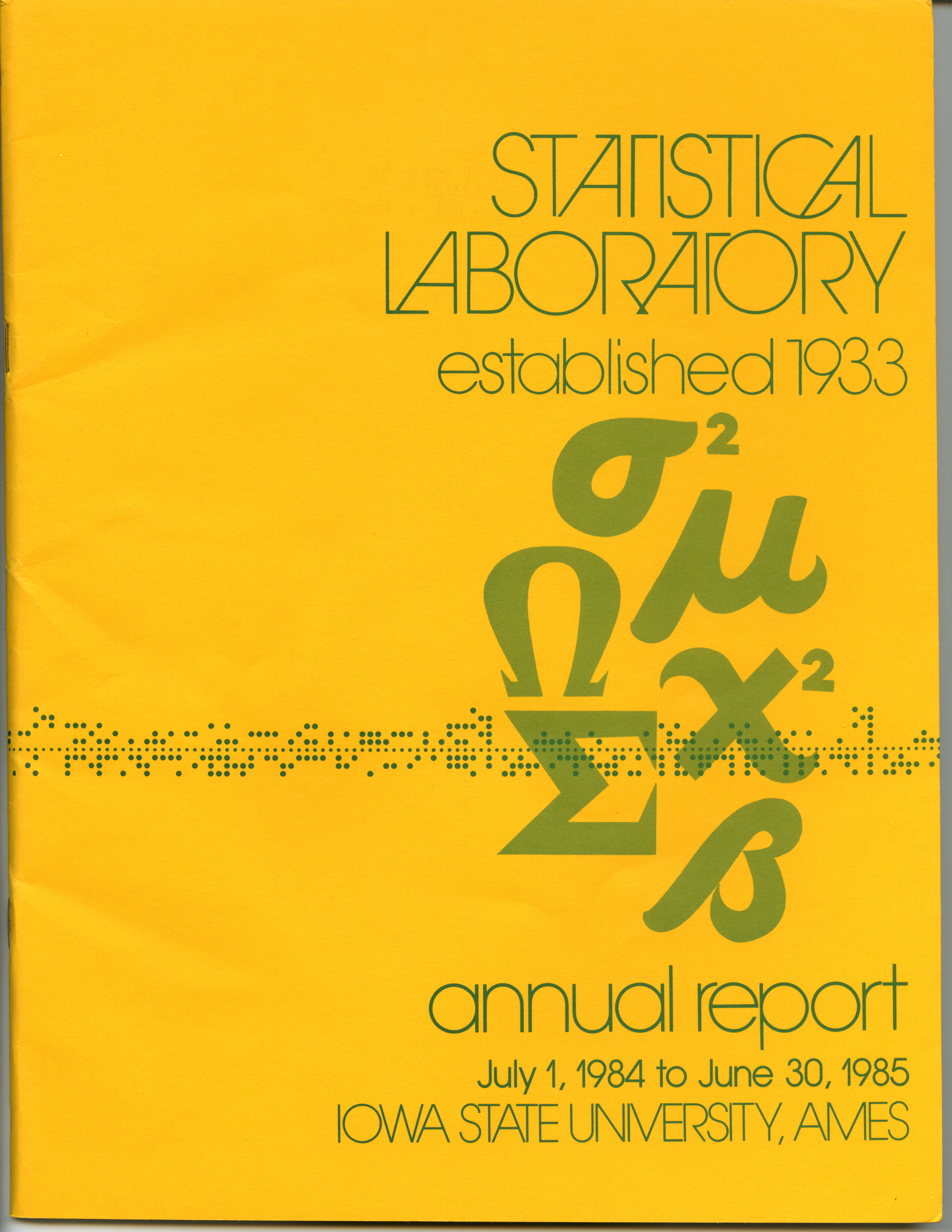 - "Statistical Laboratory Annual Report, July 1, 1984 to June 30, 1985", Iowa State University Statistical Laboratory Annual Reports, Iowa State University Library Digital Collections