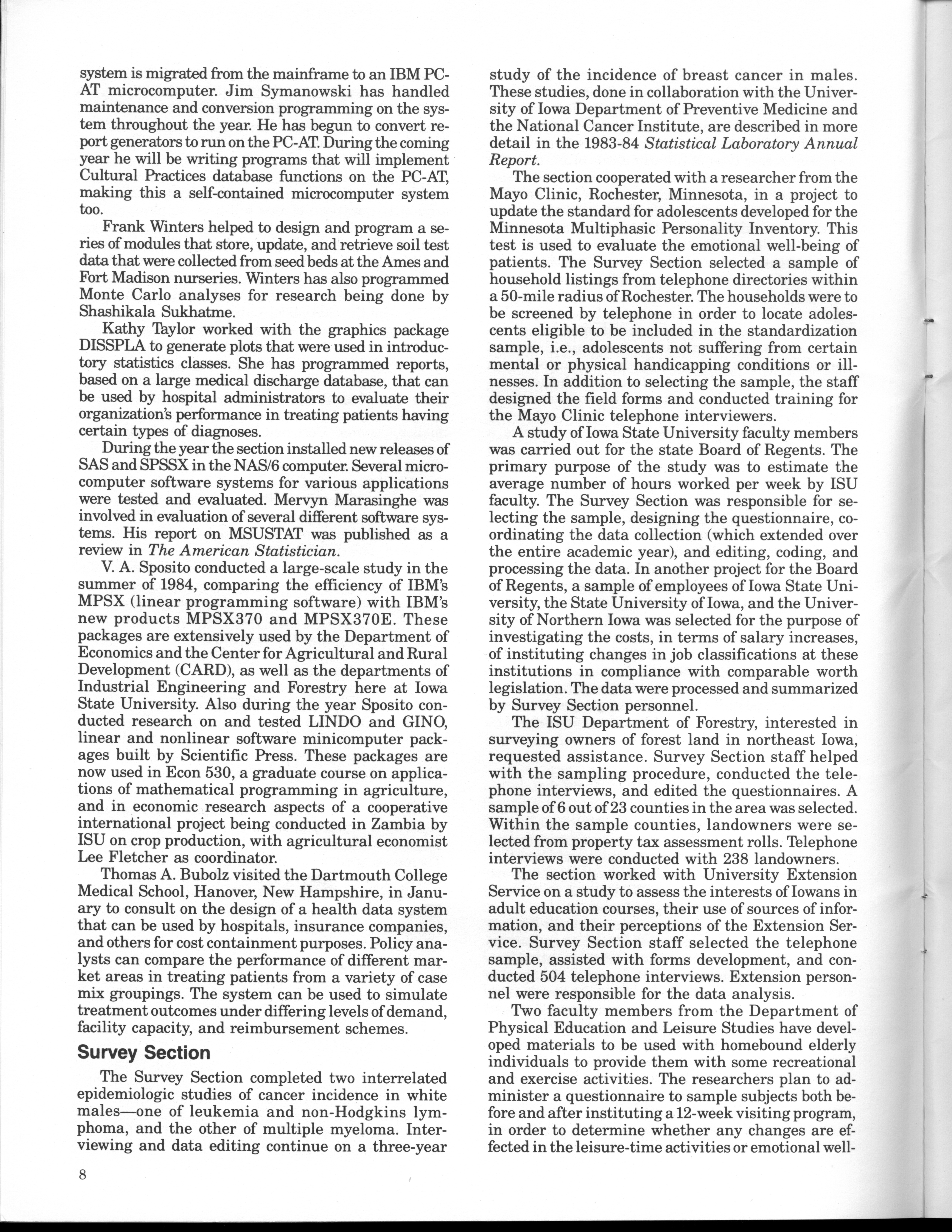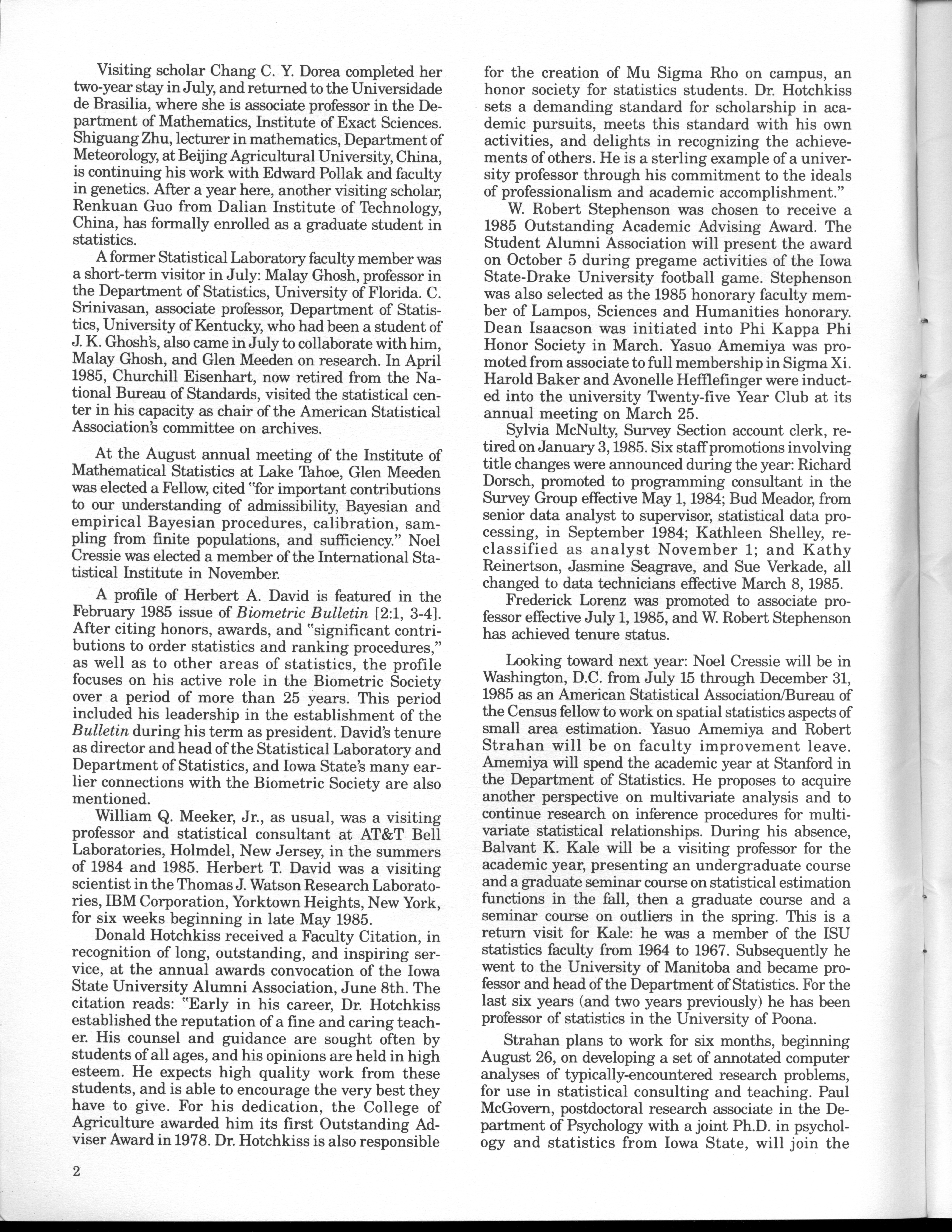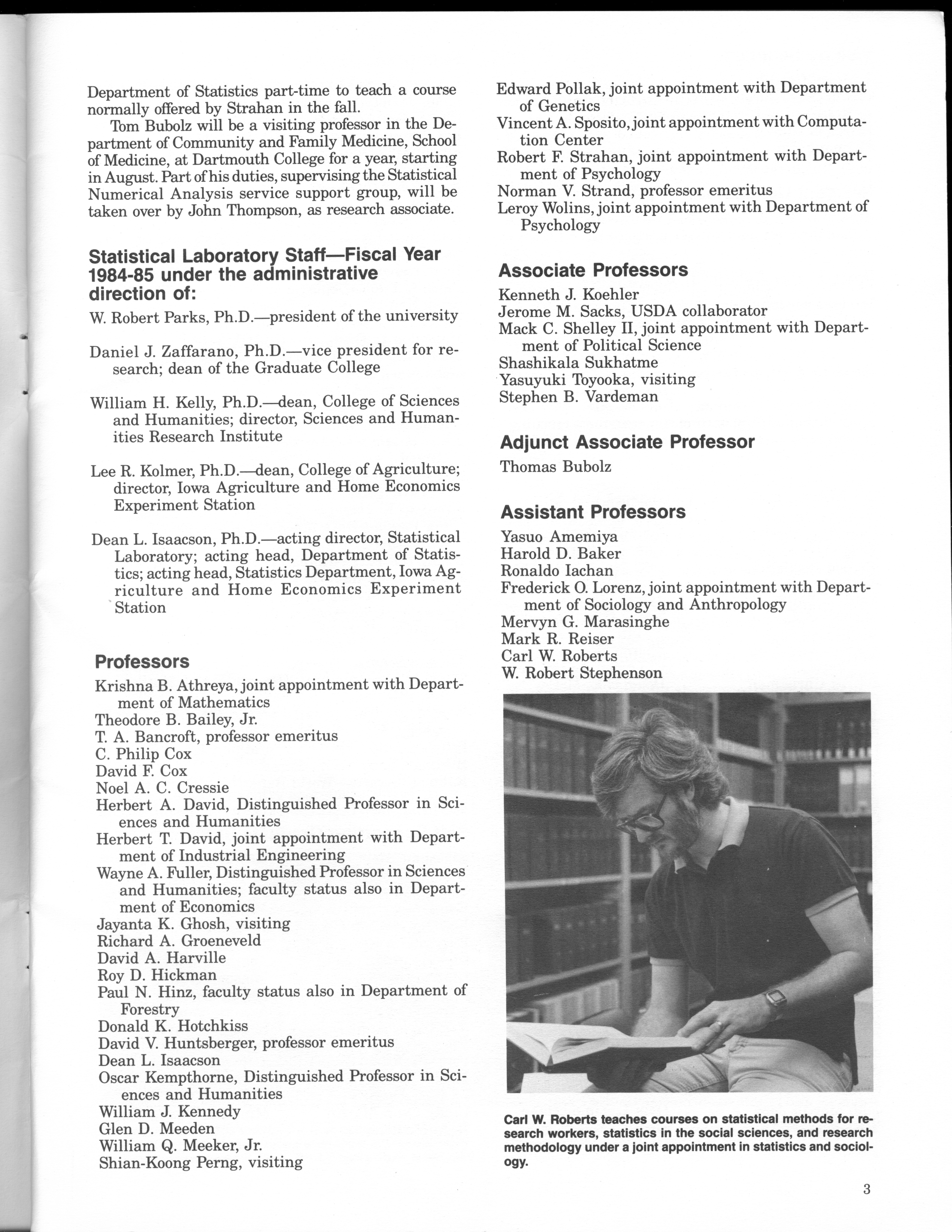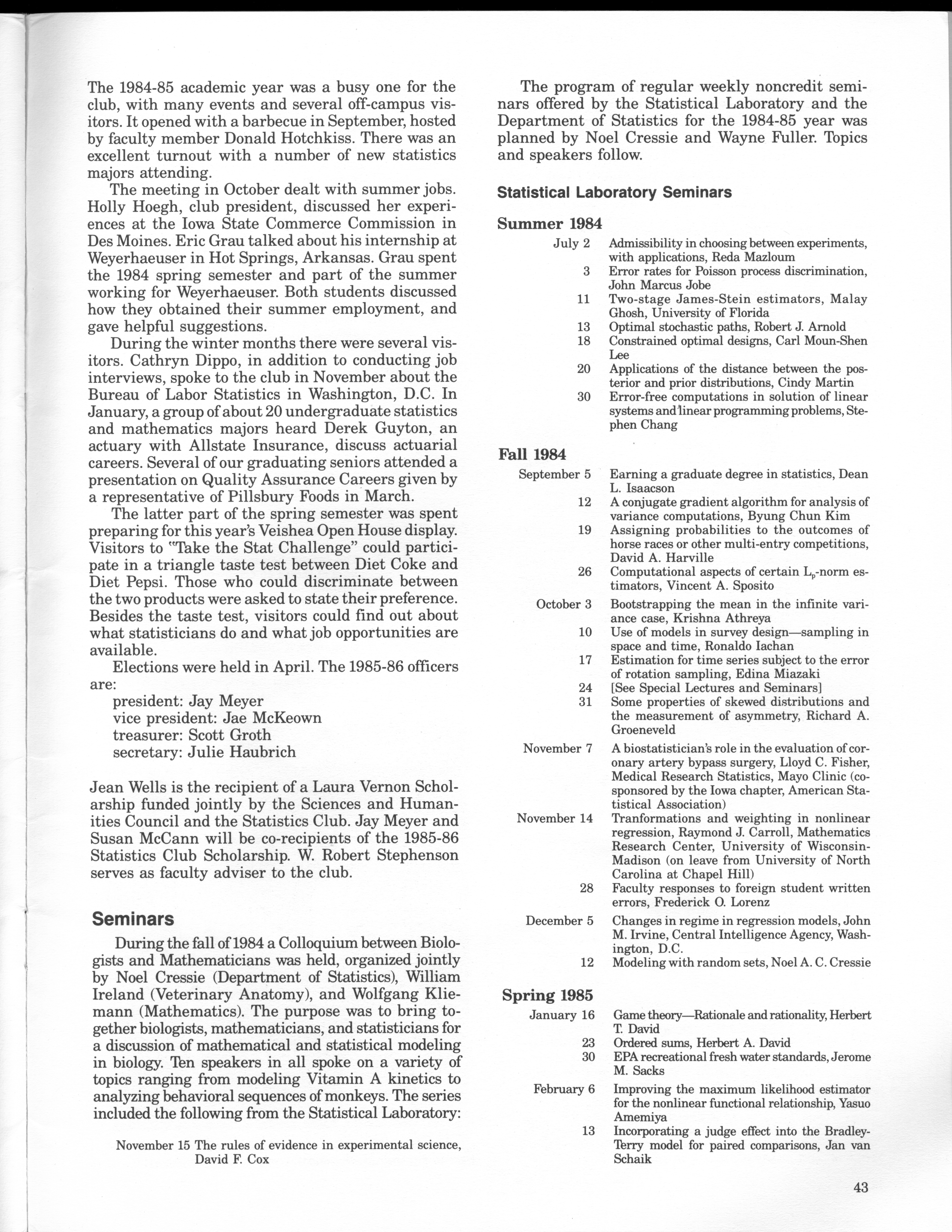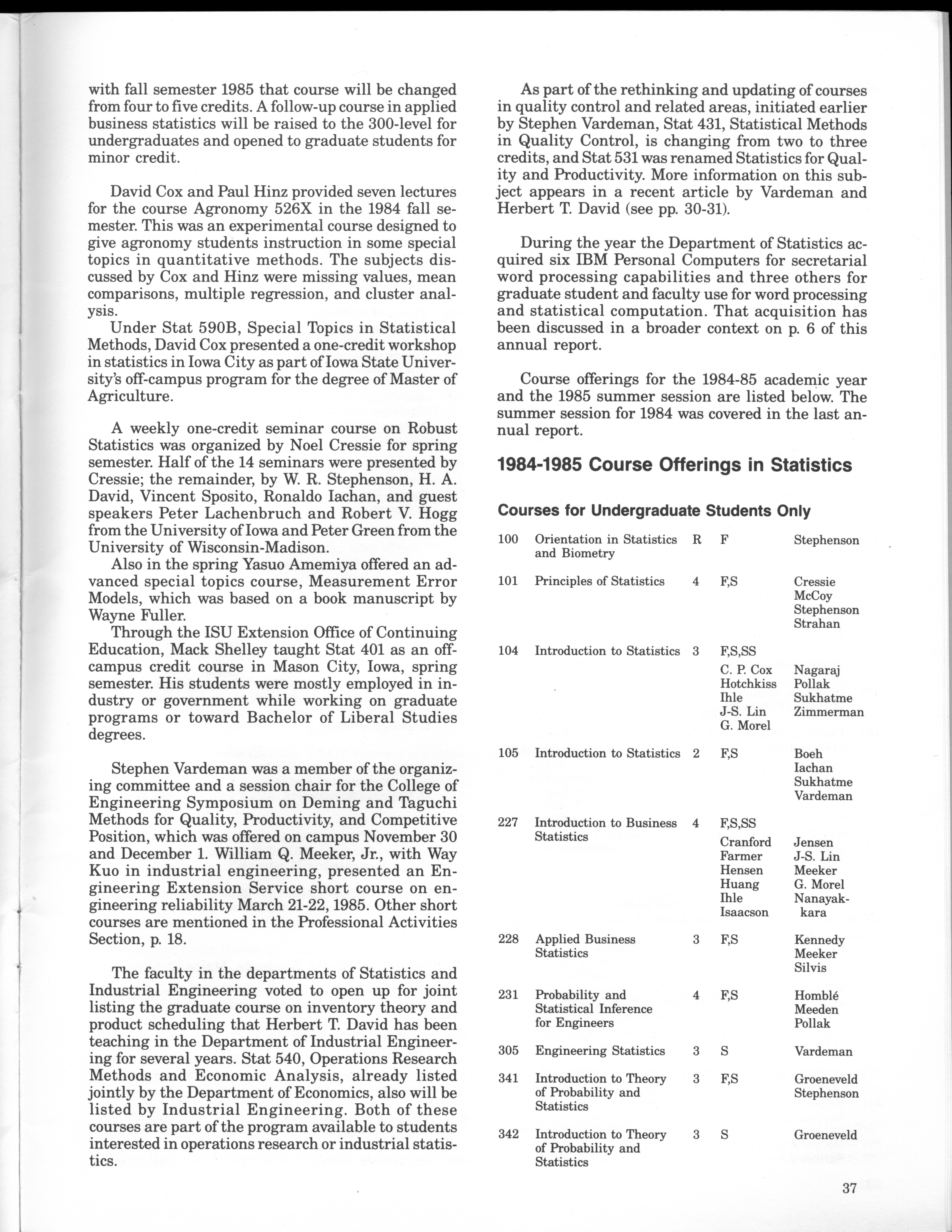 - "Statistical Laboratory Annual Report, July 1, 1984 to June 30, 1985", Iowa State University Statistical Laboratory Annual Reports, Iowa State University Library Digital Collections