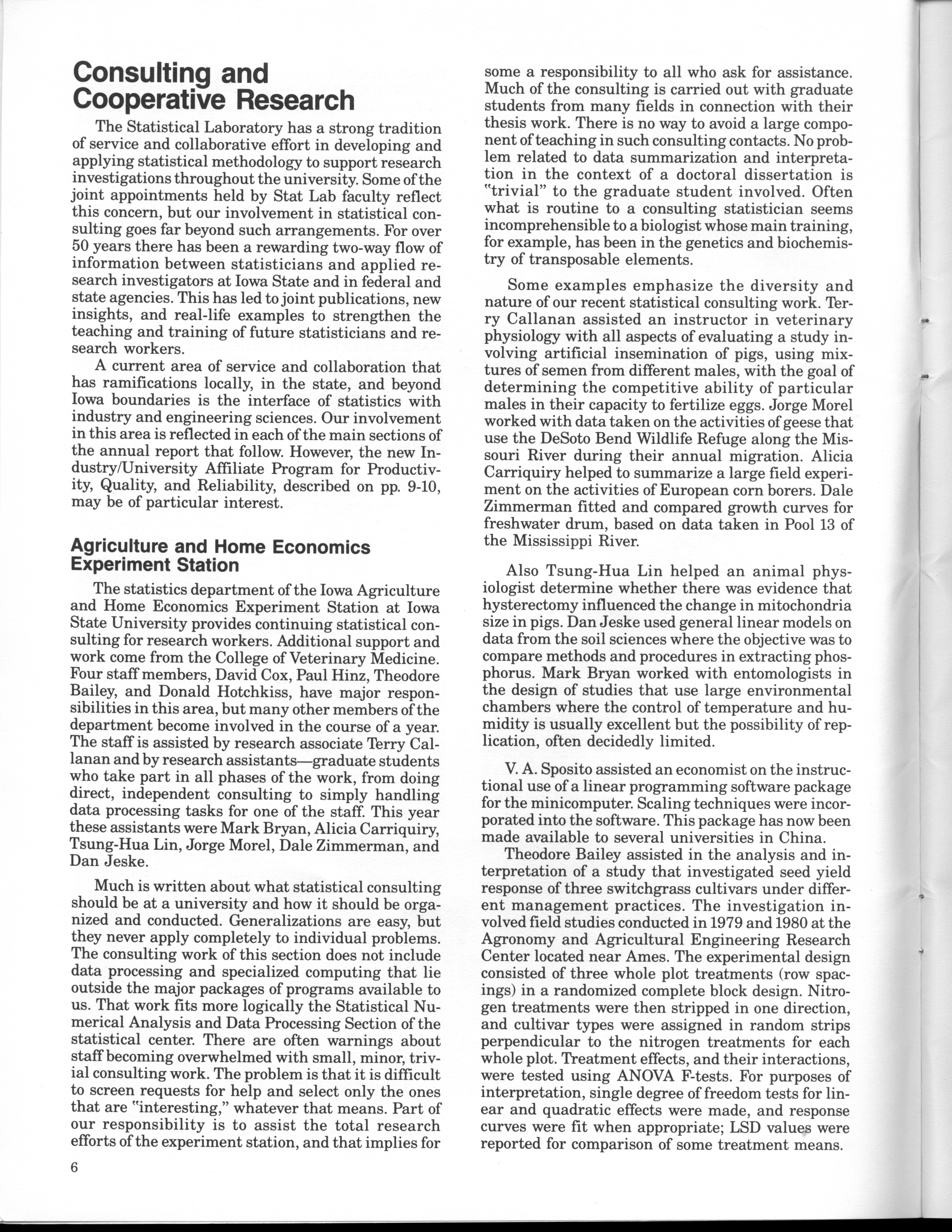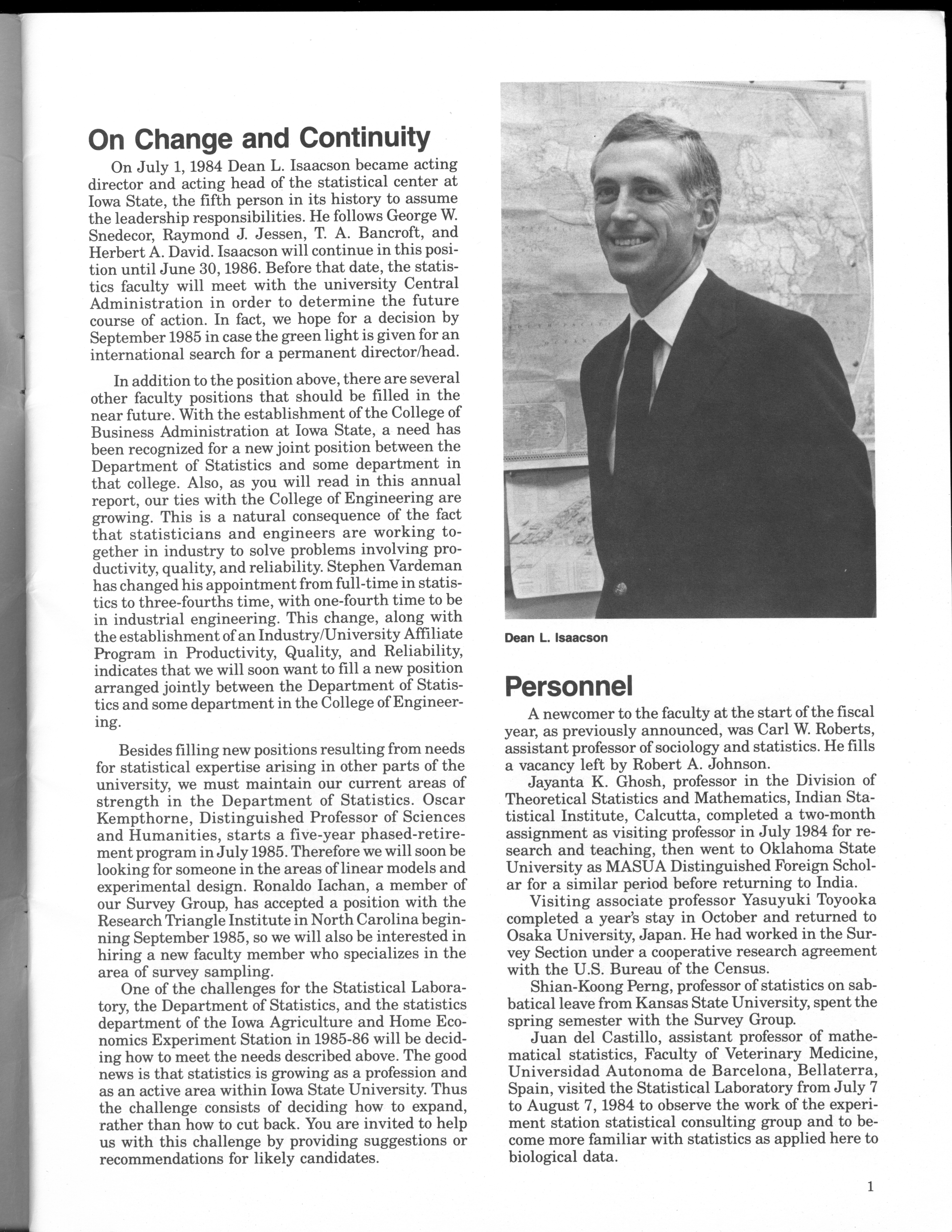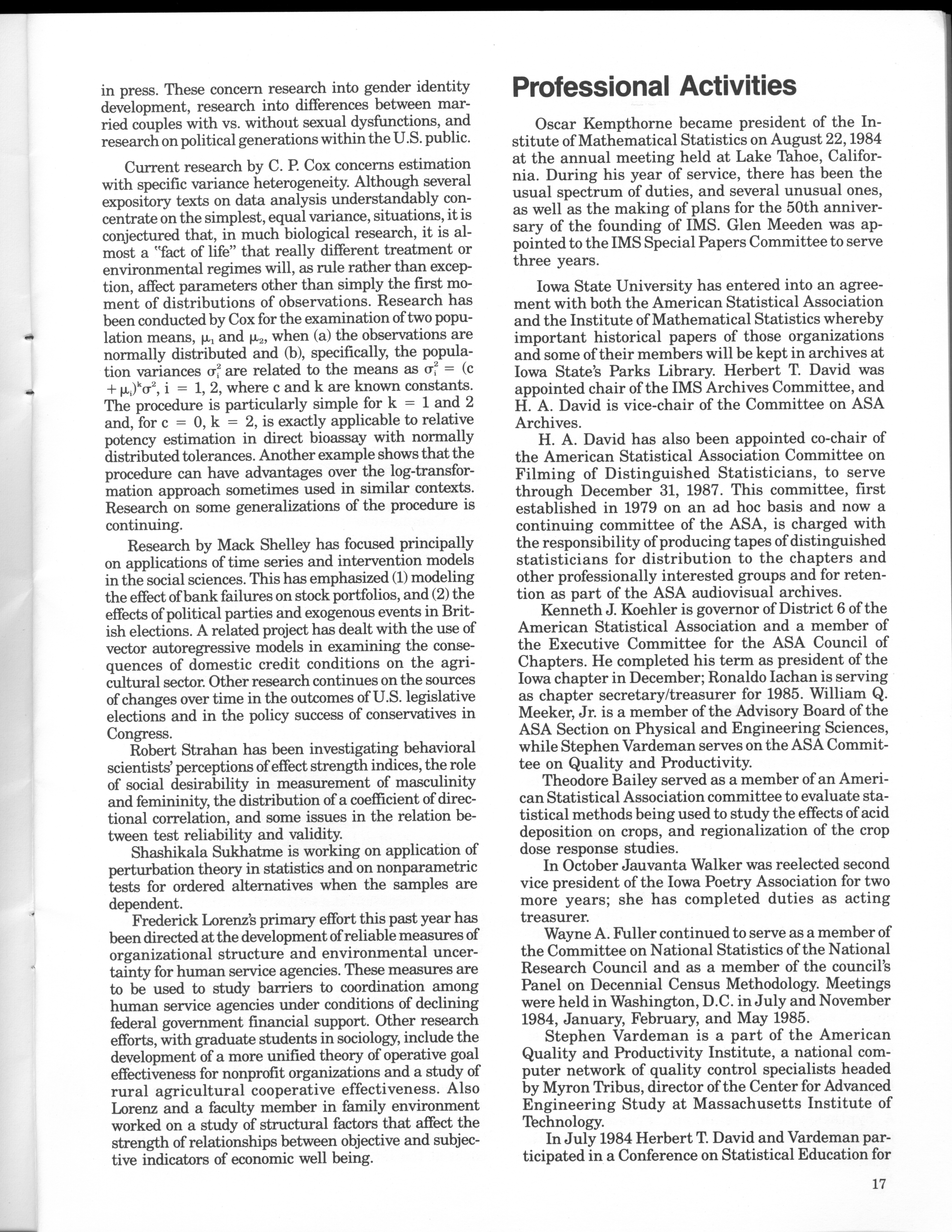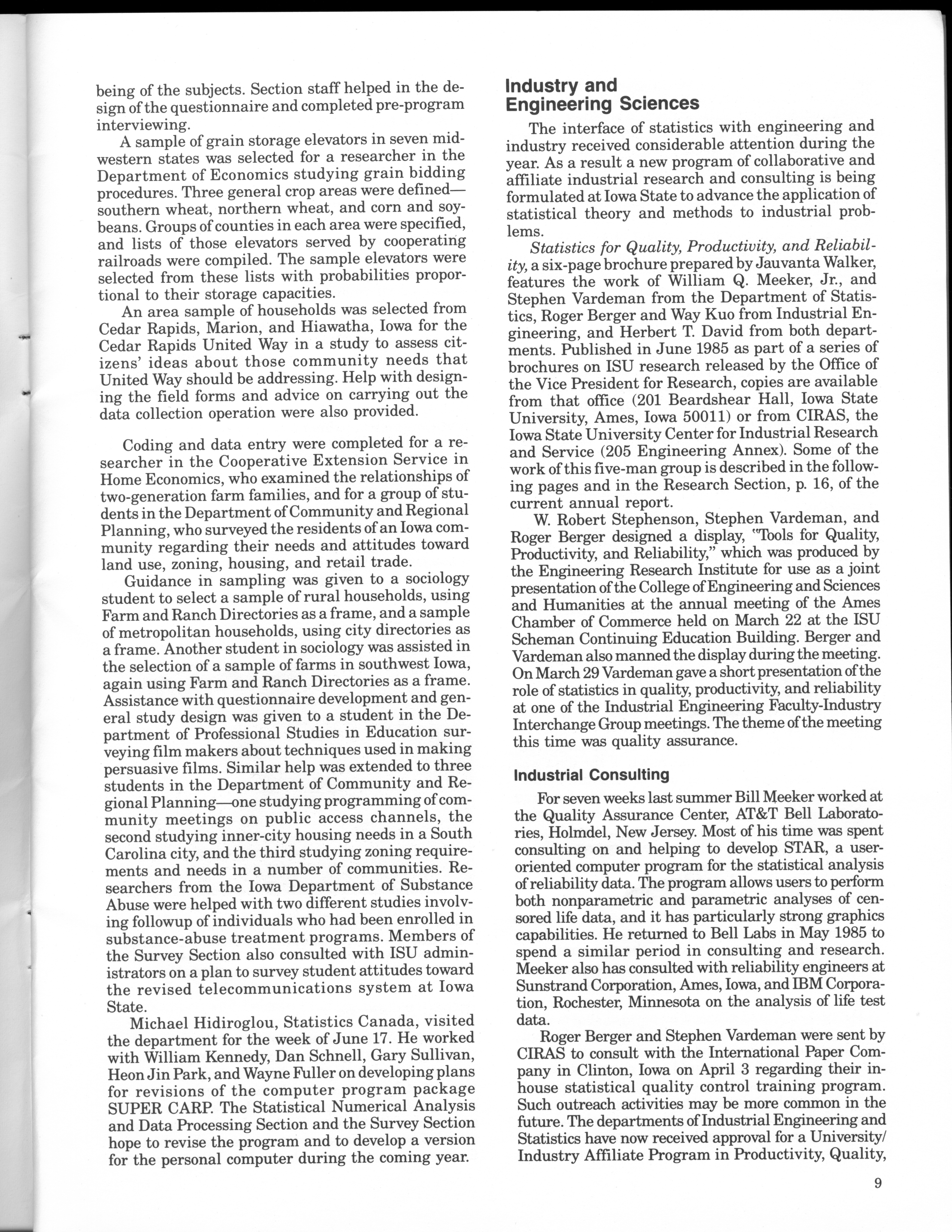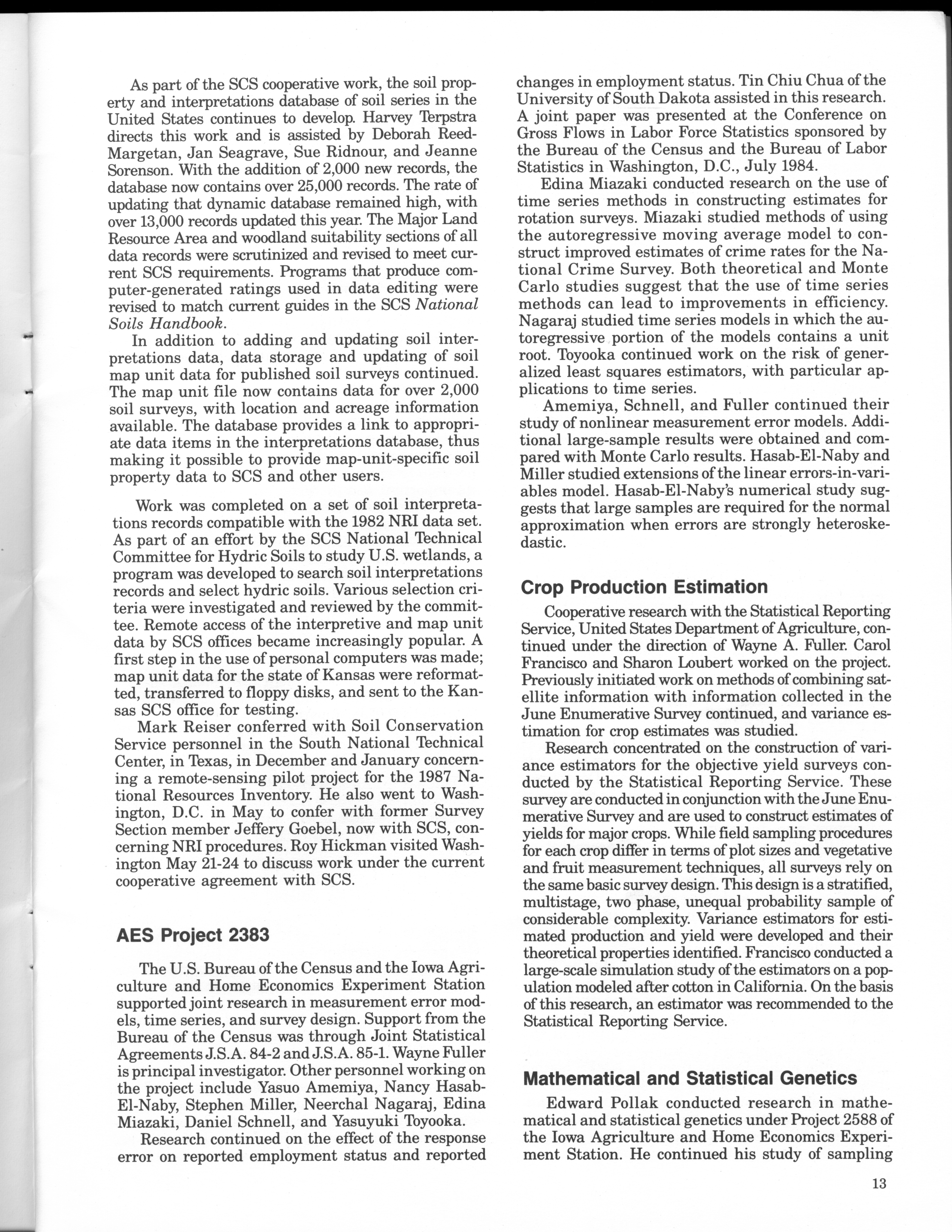 - "Statistical Laboratory Annual Report, July 1, 1984 to June 30, 1985", Iowa State University Statistical Laboratory Annual Reports, Iowa State University Library Digital Collections