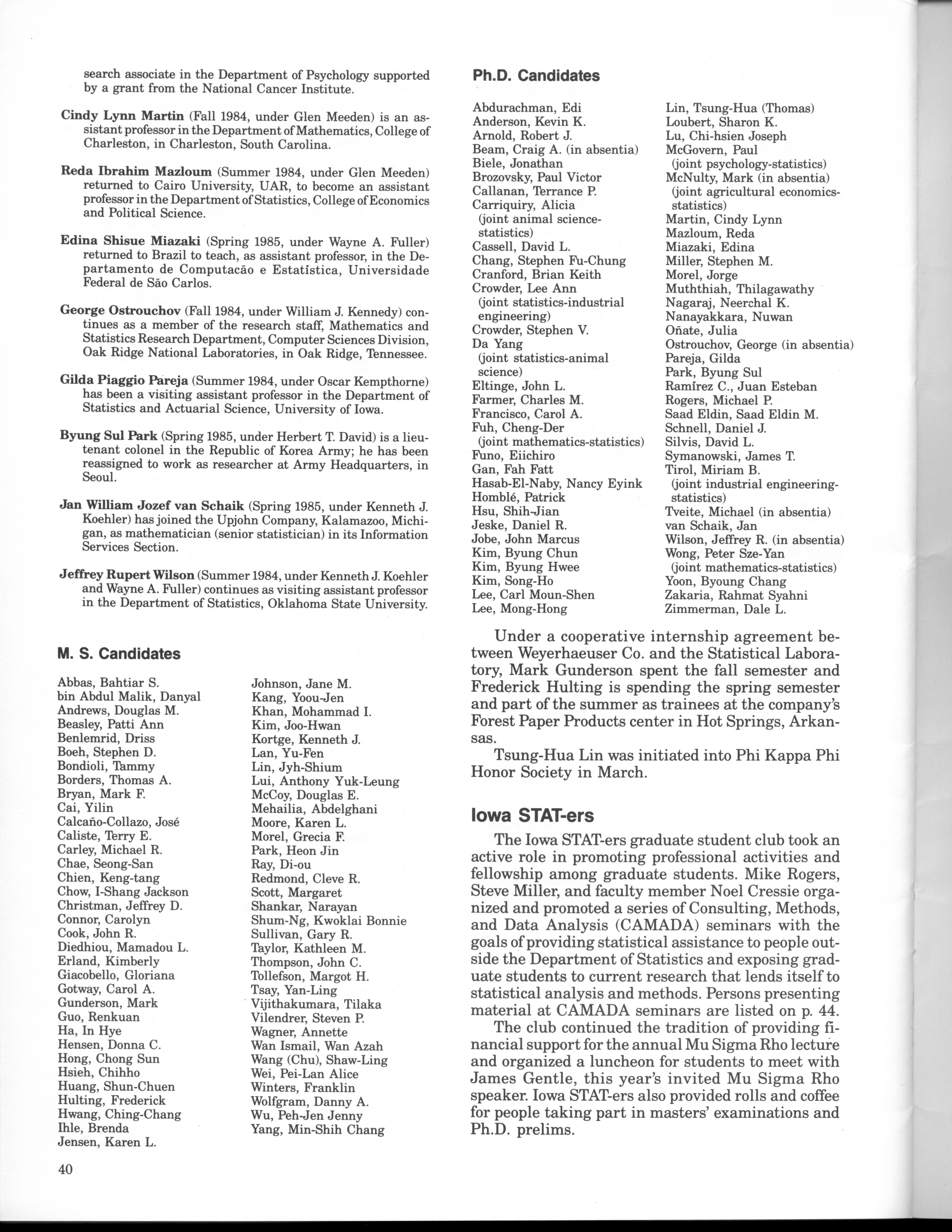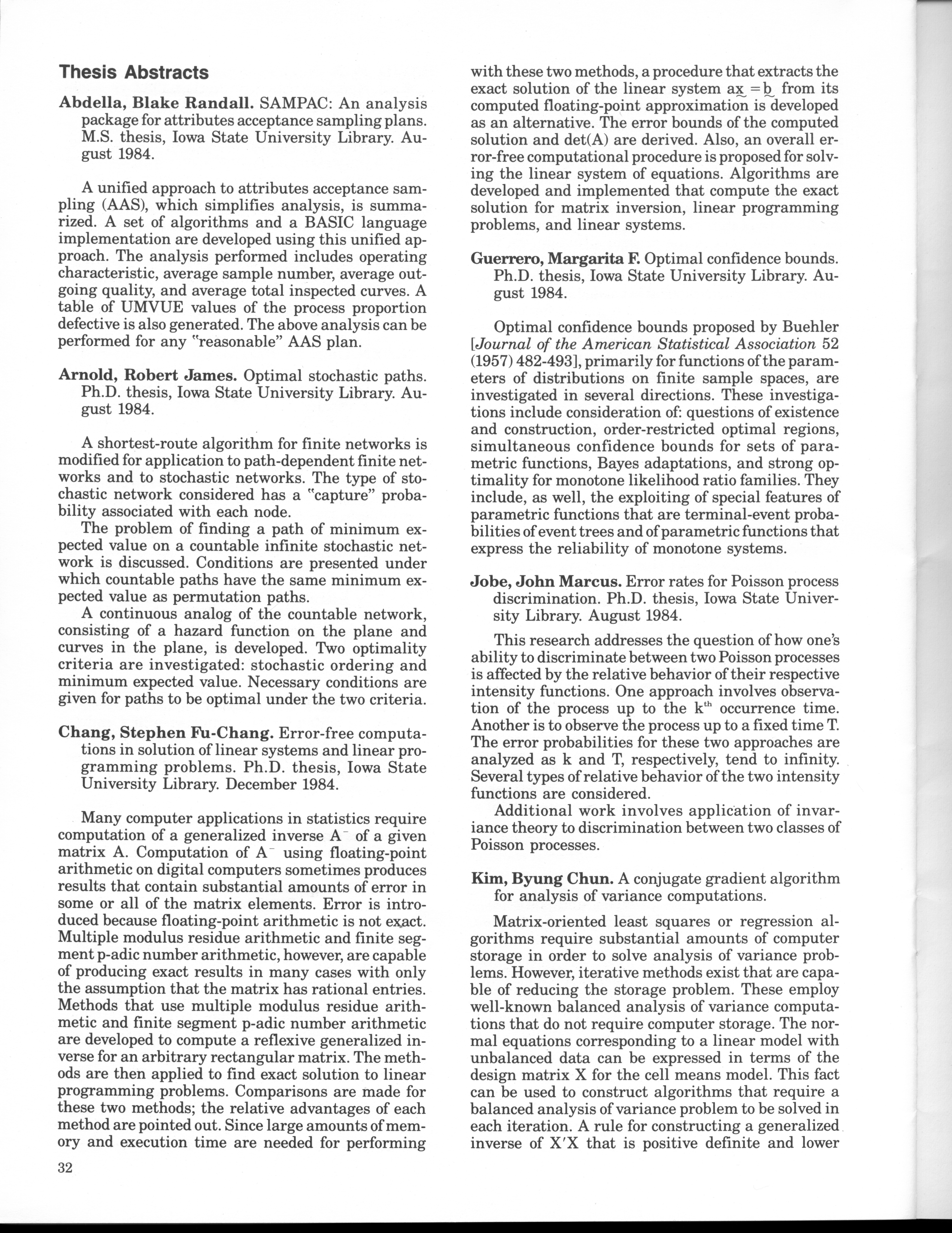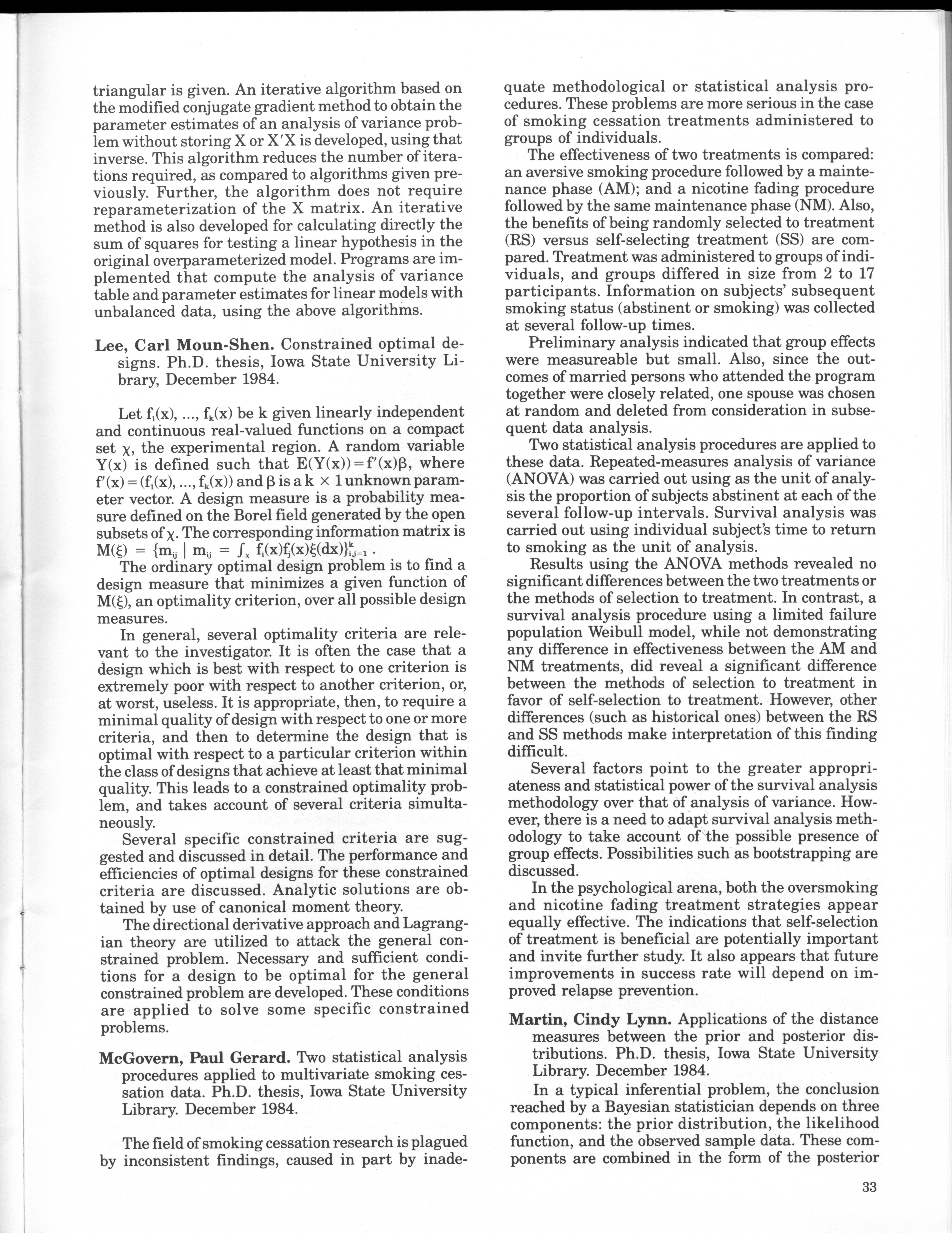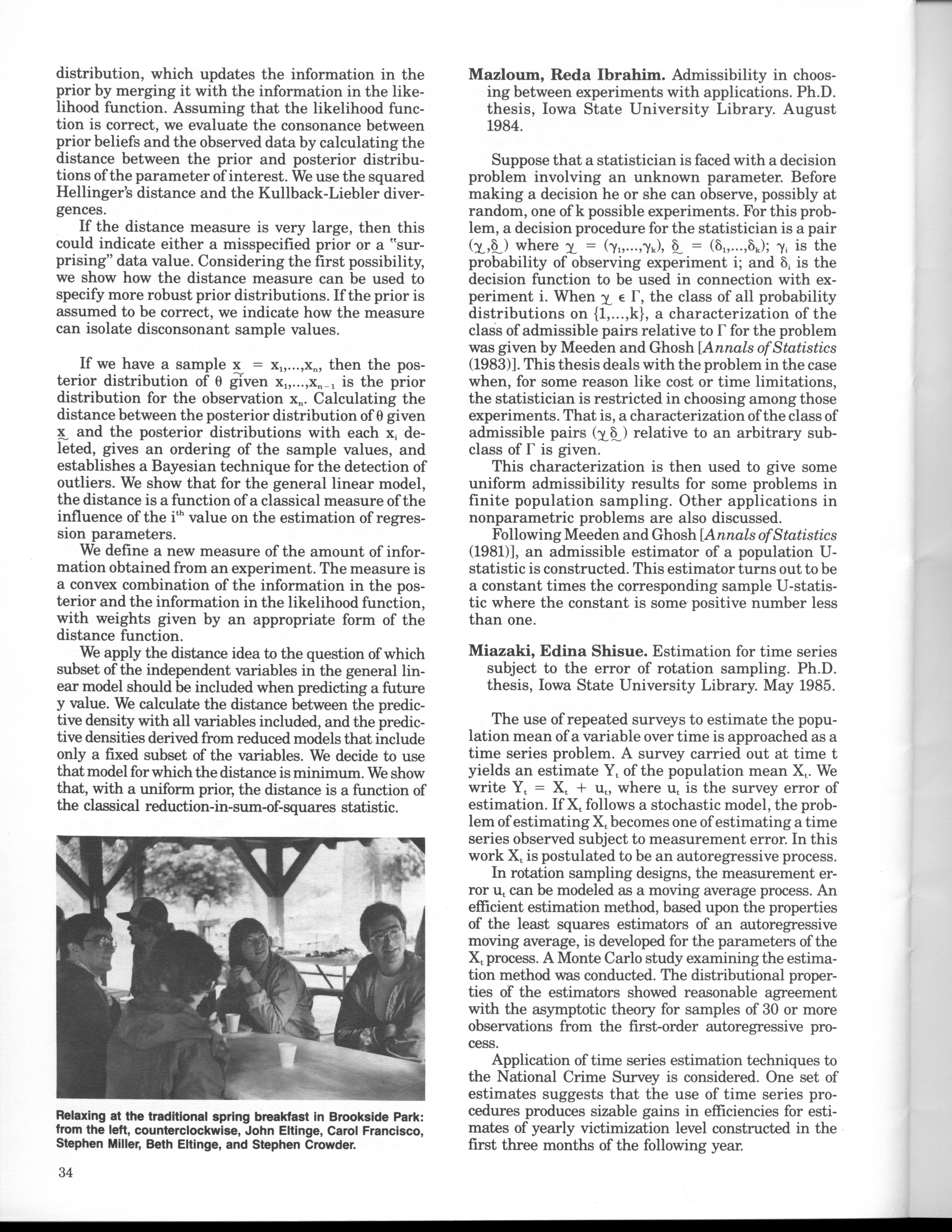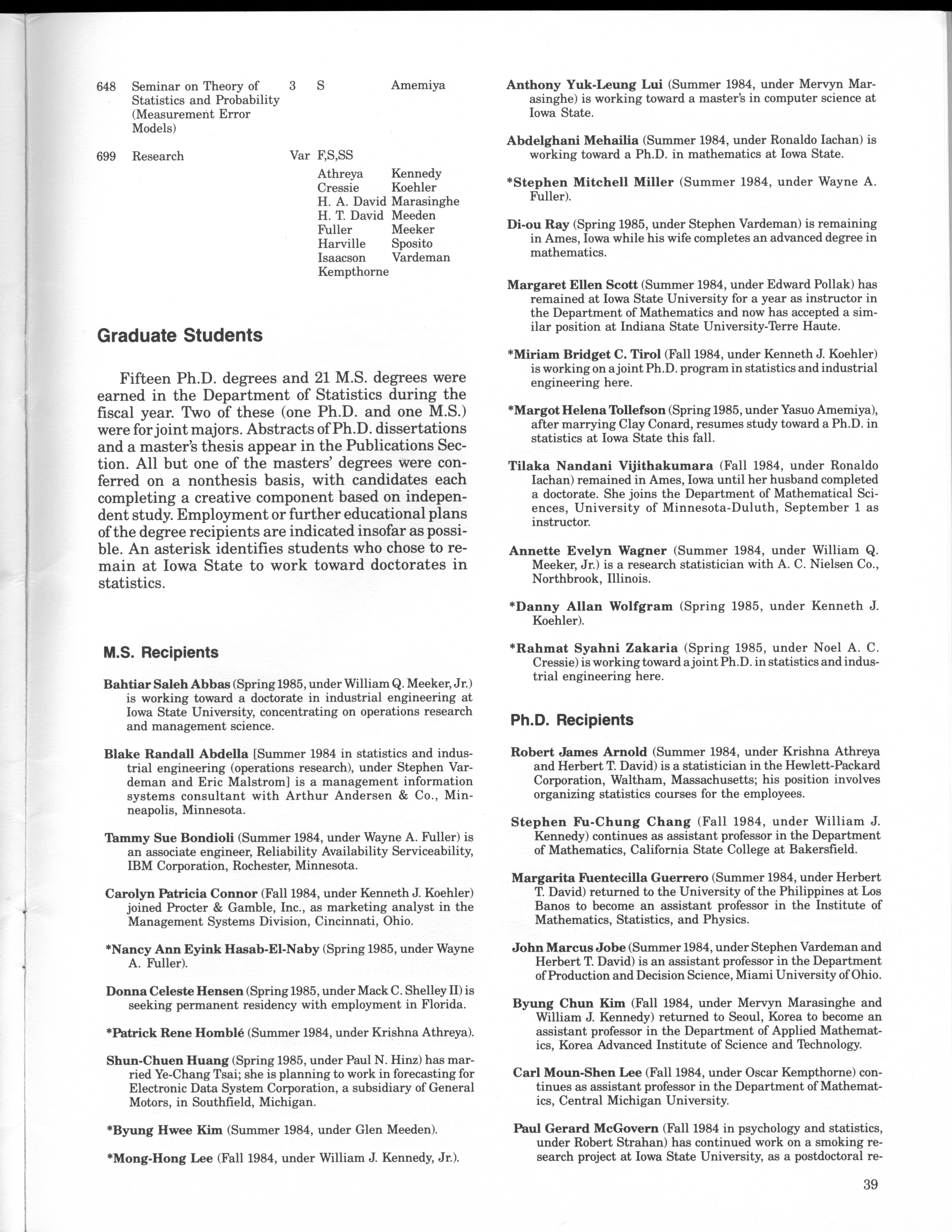 - "Statistical Laboratory Annual Report, July 1, 1984 to June 30, 1985", Iowa State University Statistical Laboratory Annual Reports, Iowa State University Library Digital Collections
