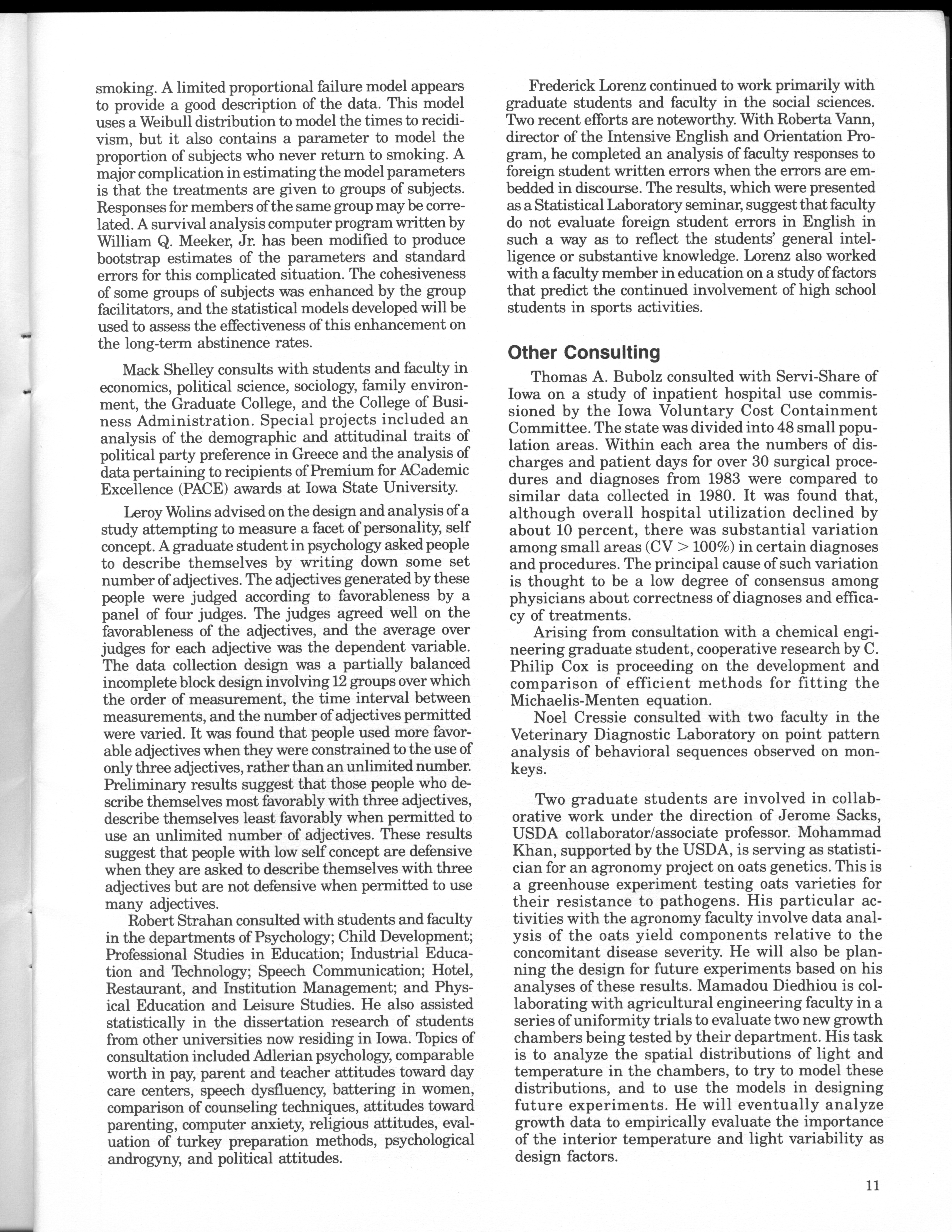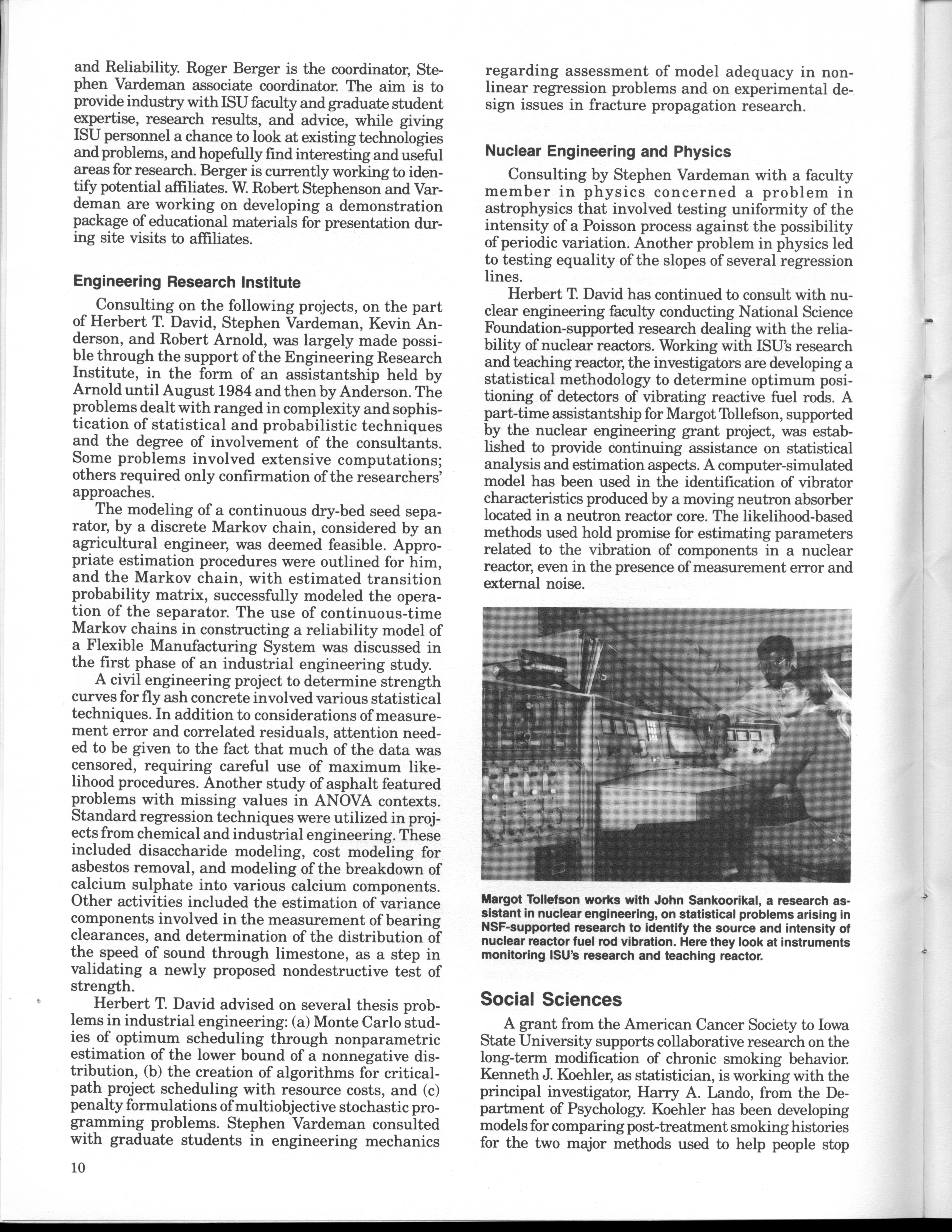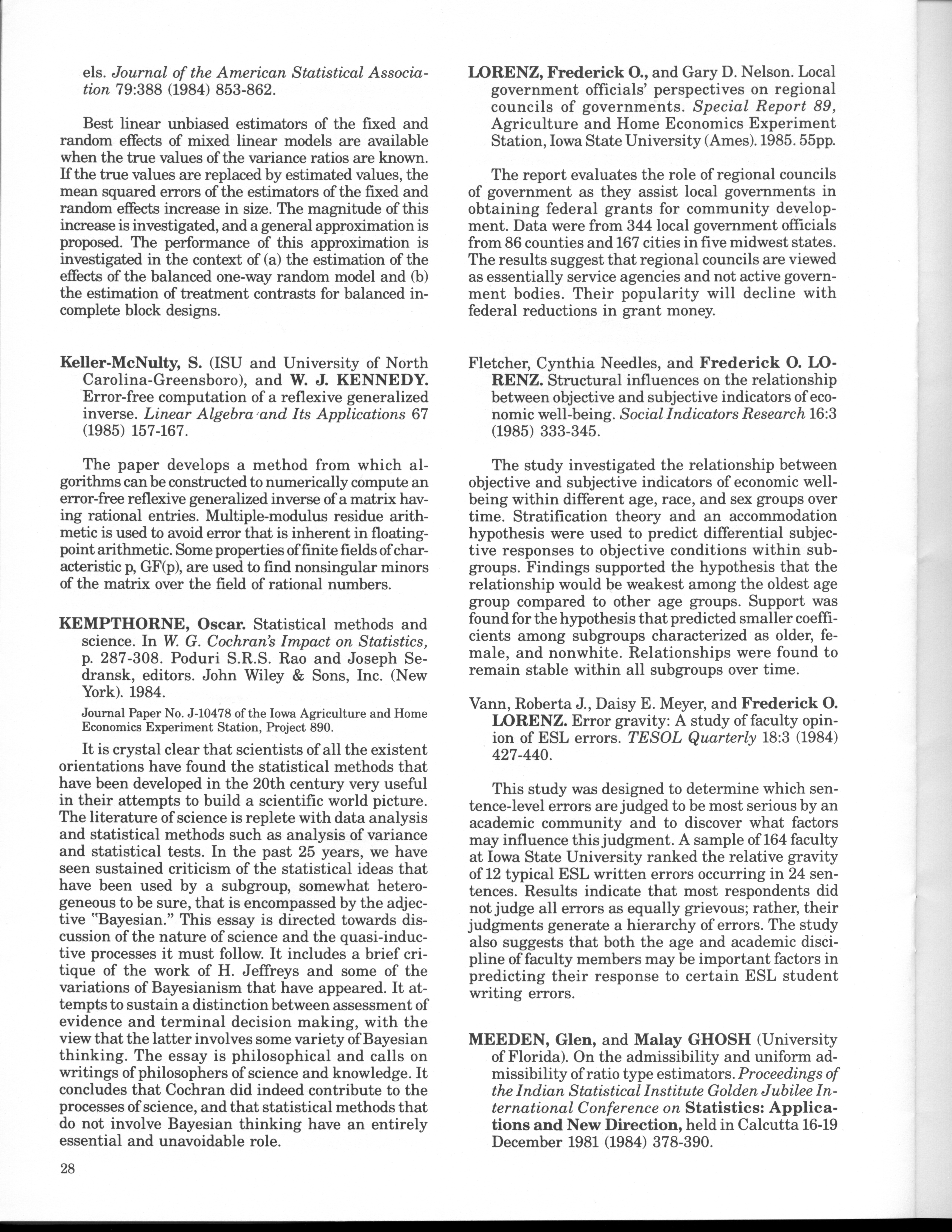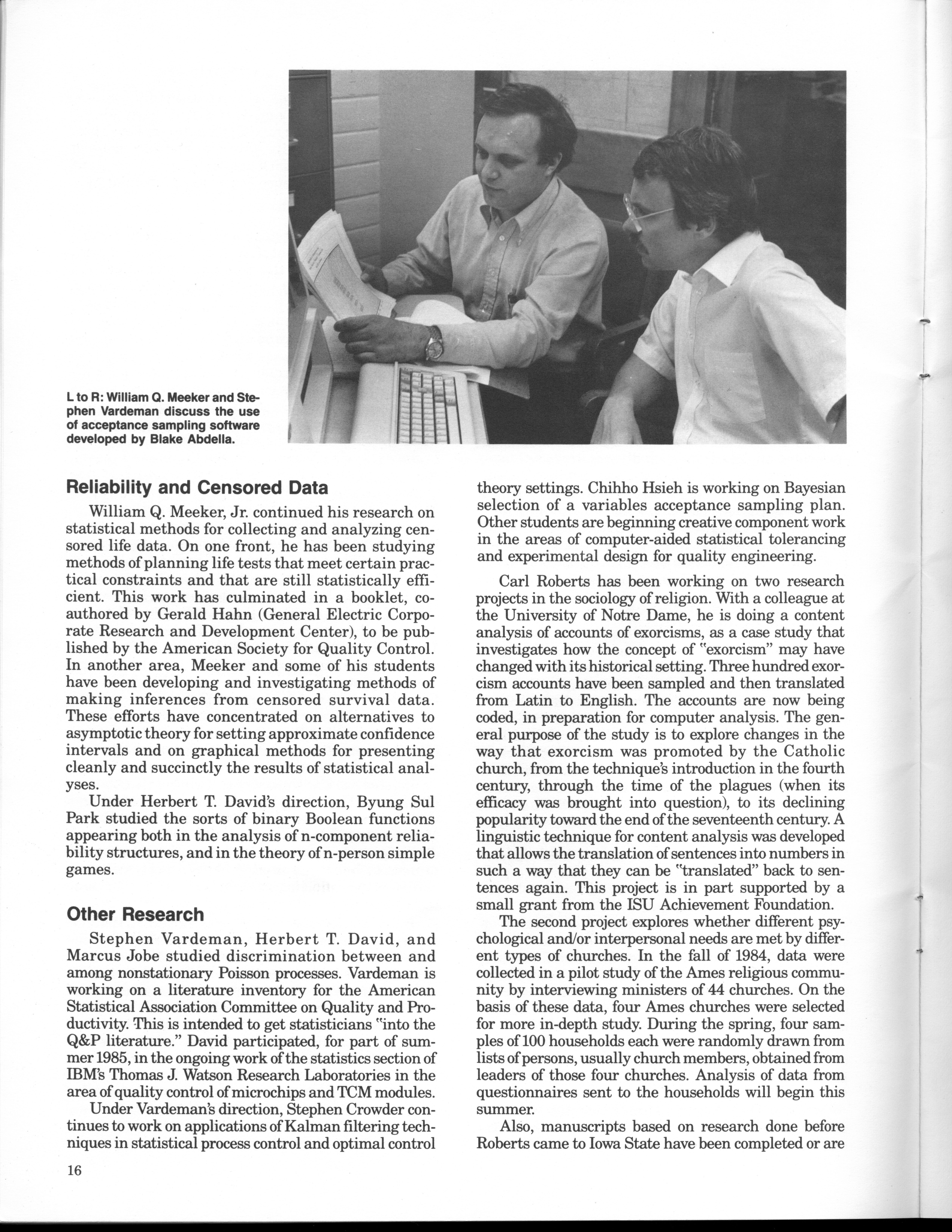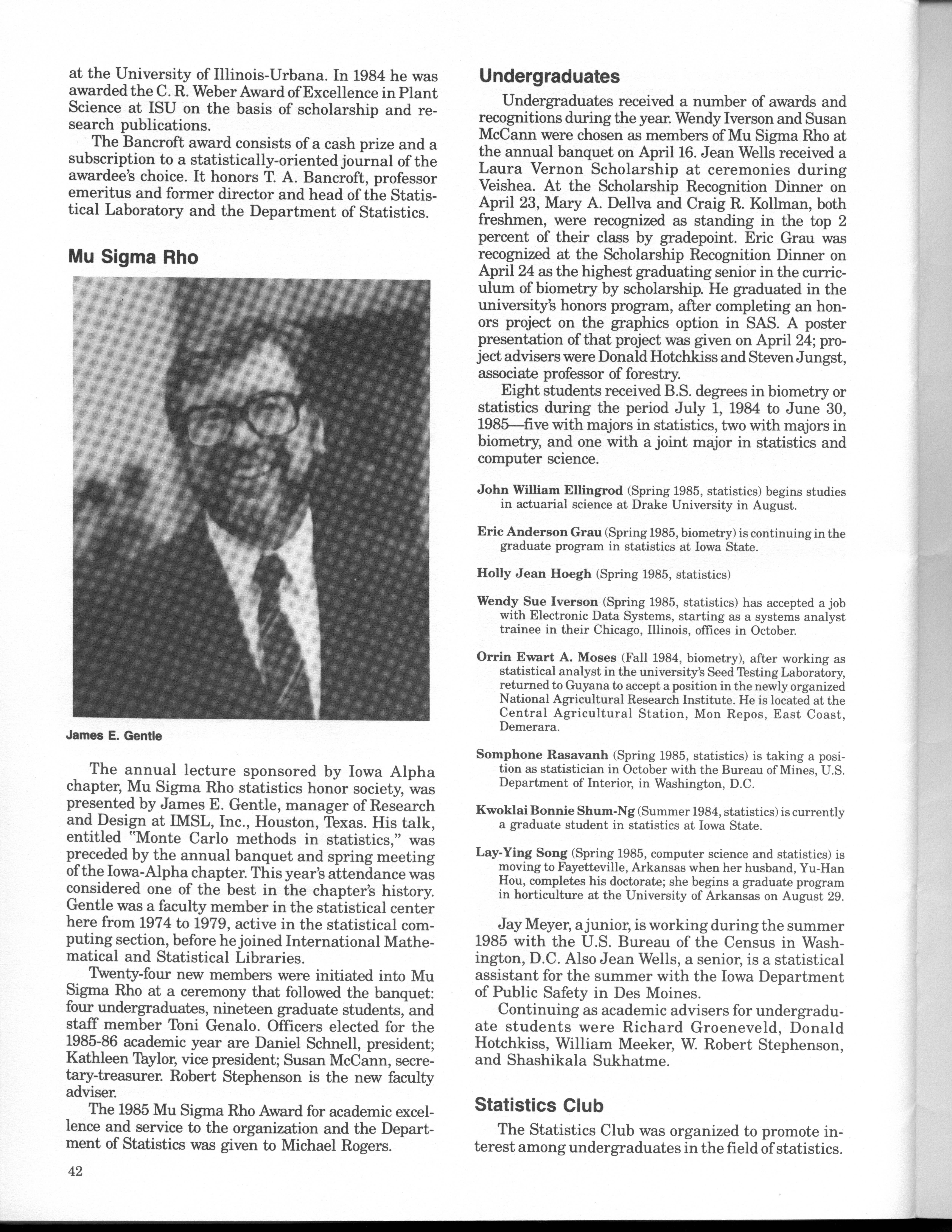 - "Statistical Laboratory Annual Report, July 1, 1984 to June 30, 1985", Iowa State University Statistical Laboratory Annual Reports, Iowa State University Library Digital Collections