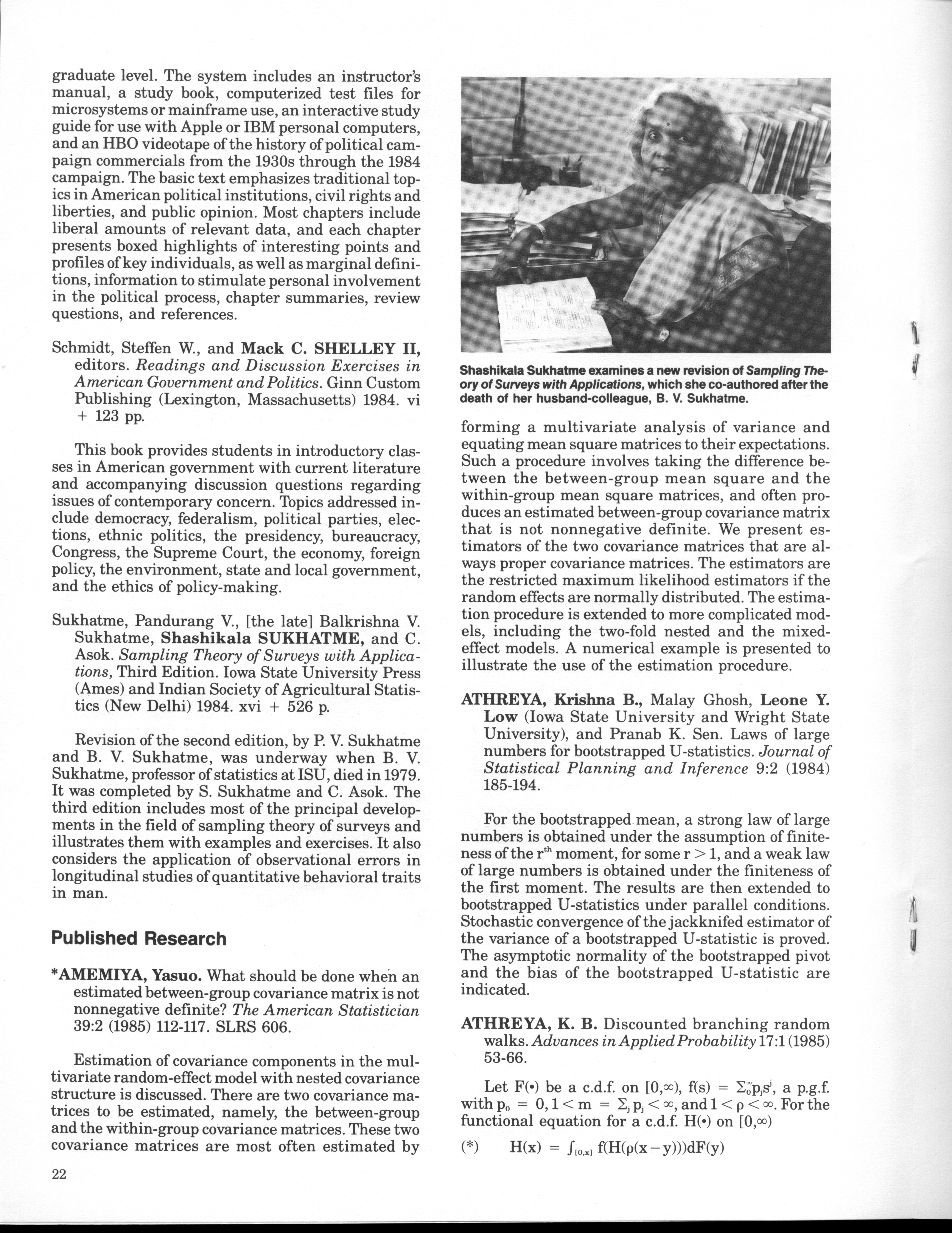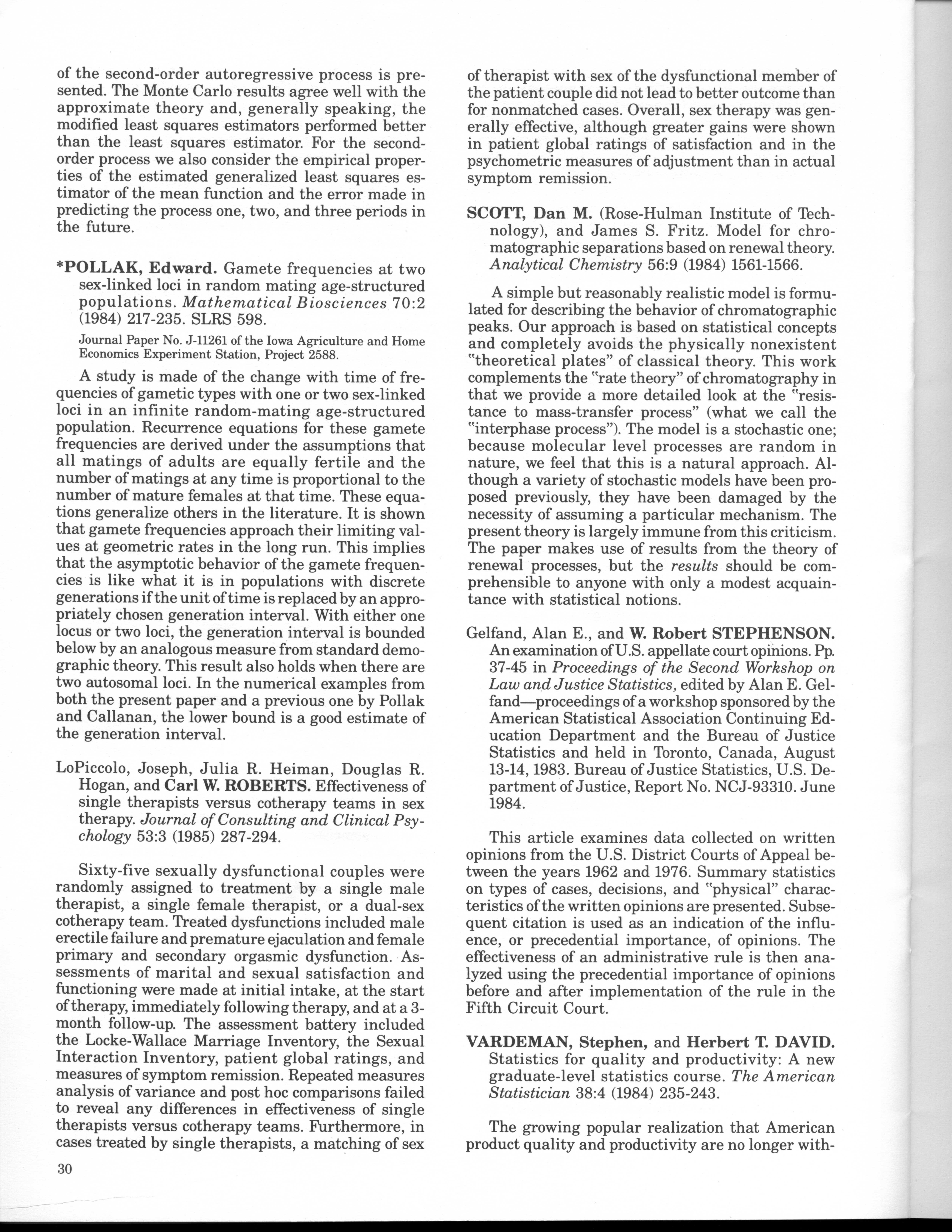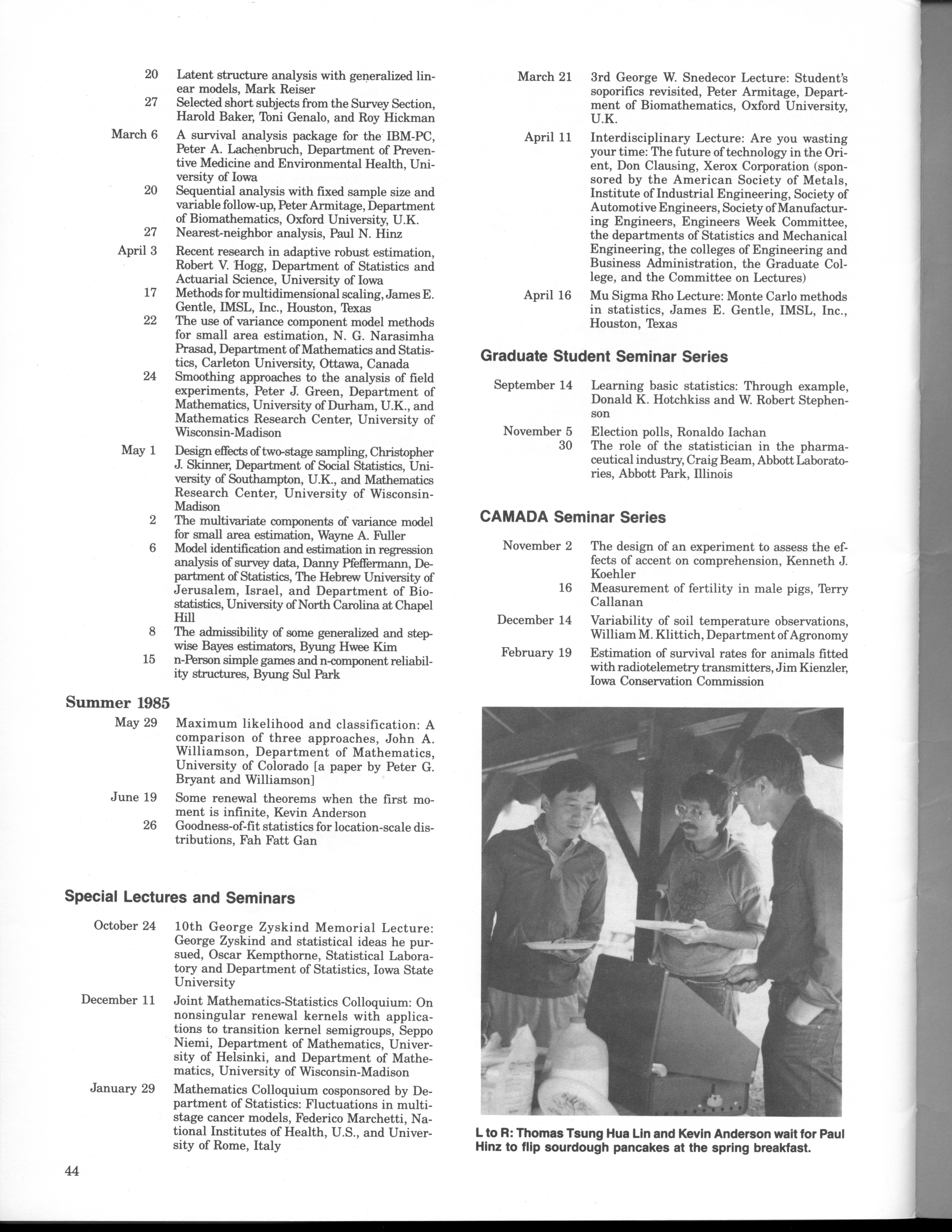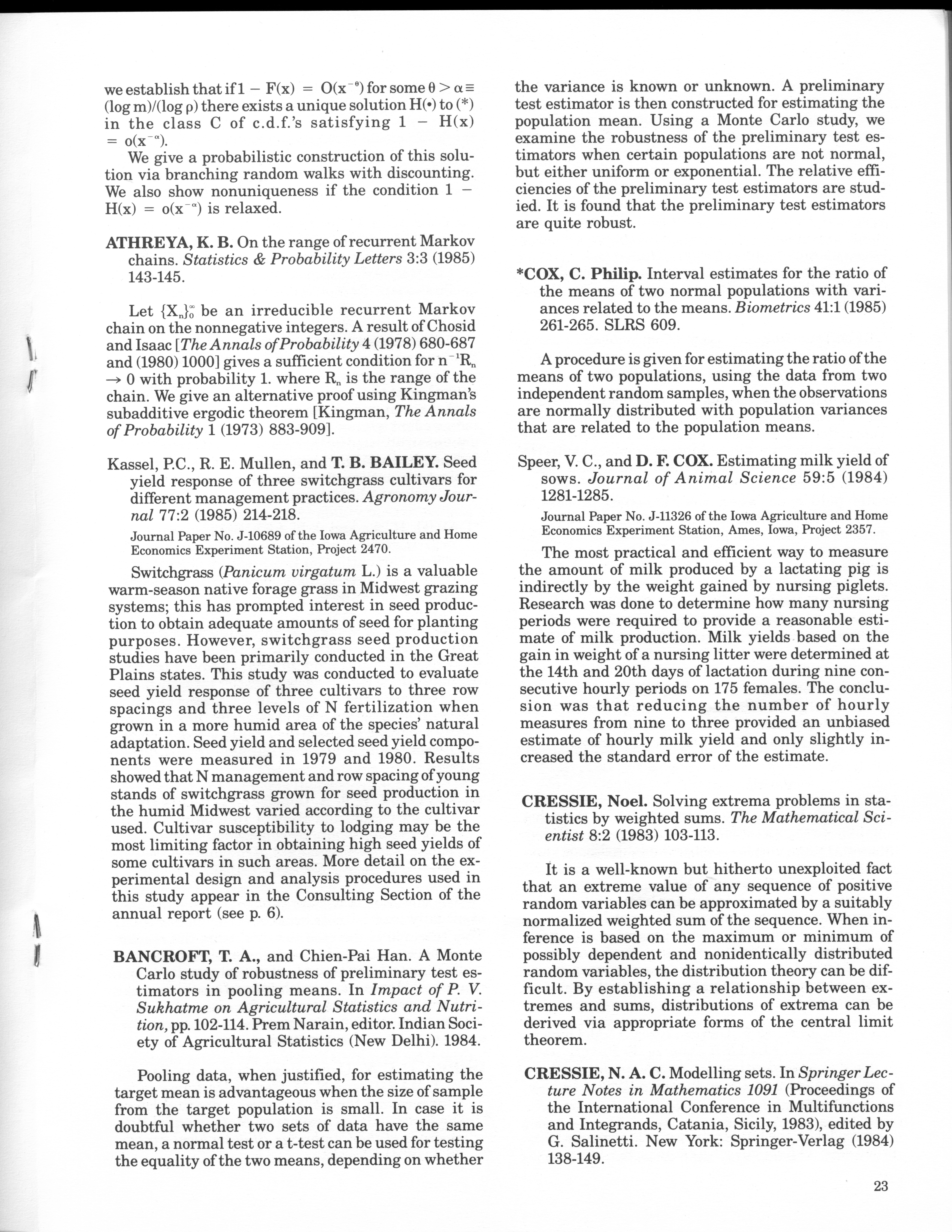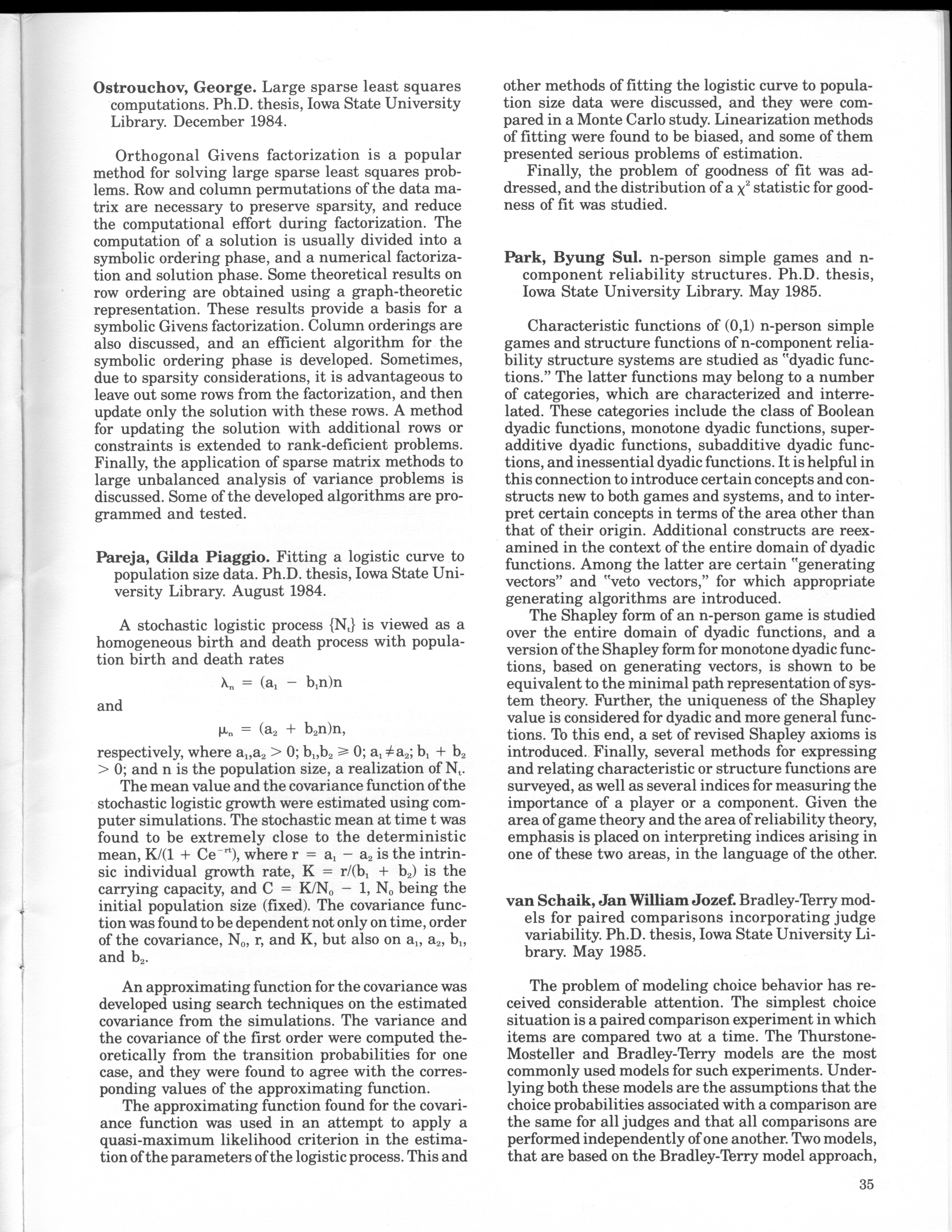 - "Statistical Laboratory Annual Report, July 1, 1984 to June 30, 1985", Iowa State University Statistical Laboratory Annual Reports, Iowa State University Library Digital Collections