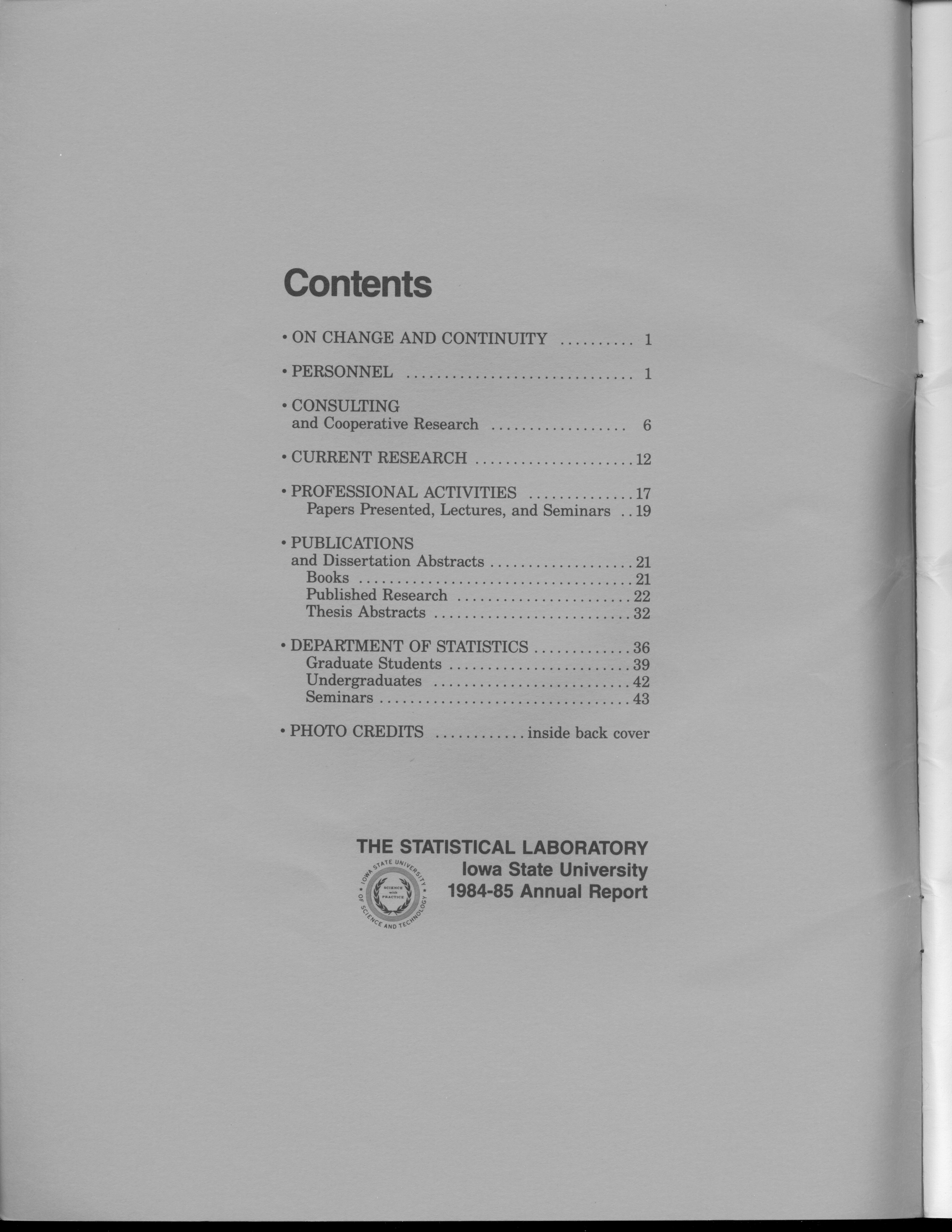 - Contents: On Change and Continuity -- Personnel -- Consulting and Cooperative Research -- Current Research -- Professional Activities: Papers Presented, Lectures, Seminars -- Publications and Dissertation Abstracts: Books, Published Research, Thesis Abstracts -- Department of Statistics: Graduate Students, Undergraduates, Seminars -- Photo Credits