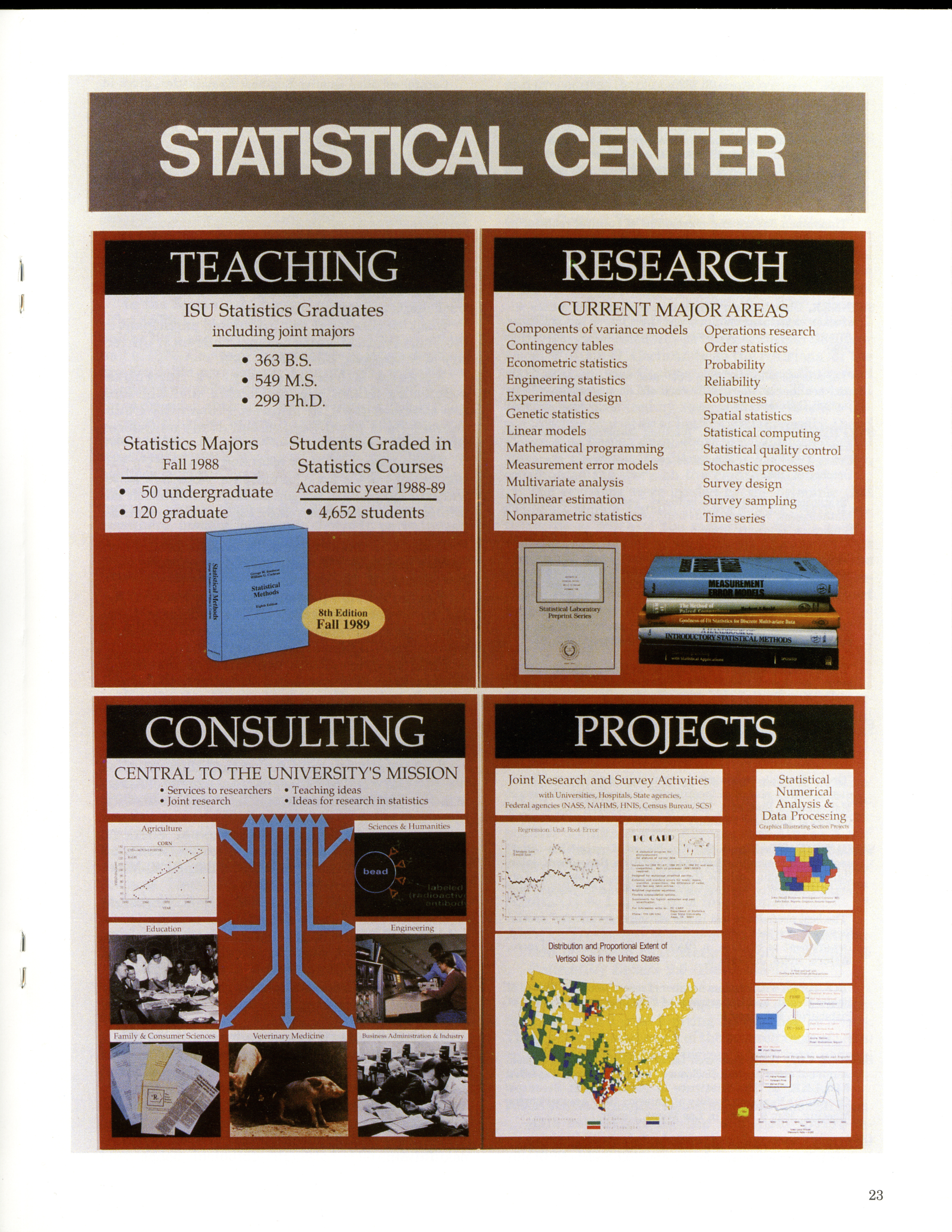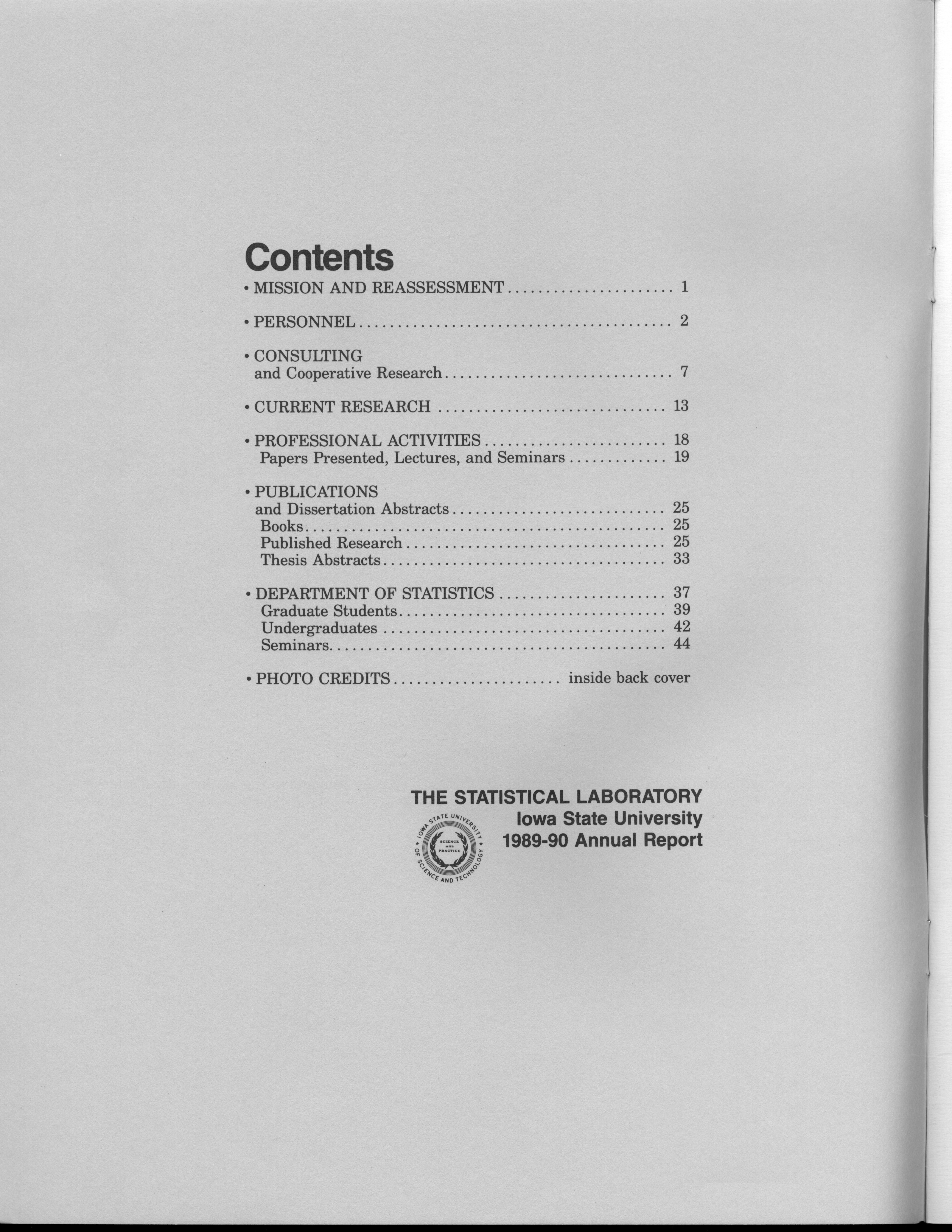 - Contents: Mission and Reassessment -- Personnel -- Consulting and Cooperative Research -- Current Research -- Professional Activities: Papers Presented, Lectures, Seminars -- Publications and Dissertation Abstracts: Books, Published Research, Thesis Abstracts -- Department of Statistics: Graduate Students, Undergraduates, Seminars -- Photo Credits