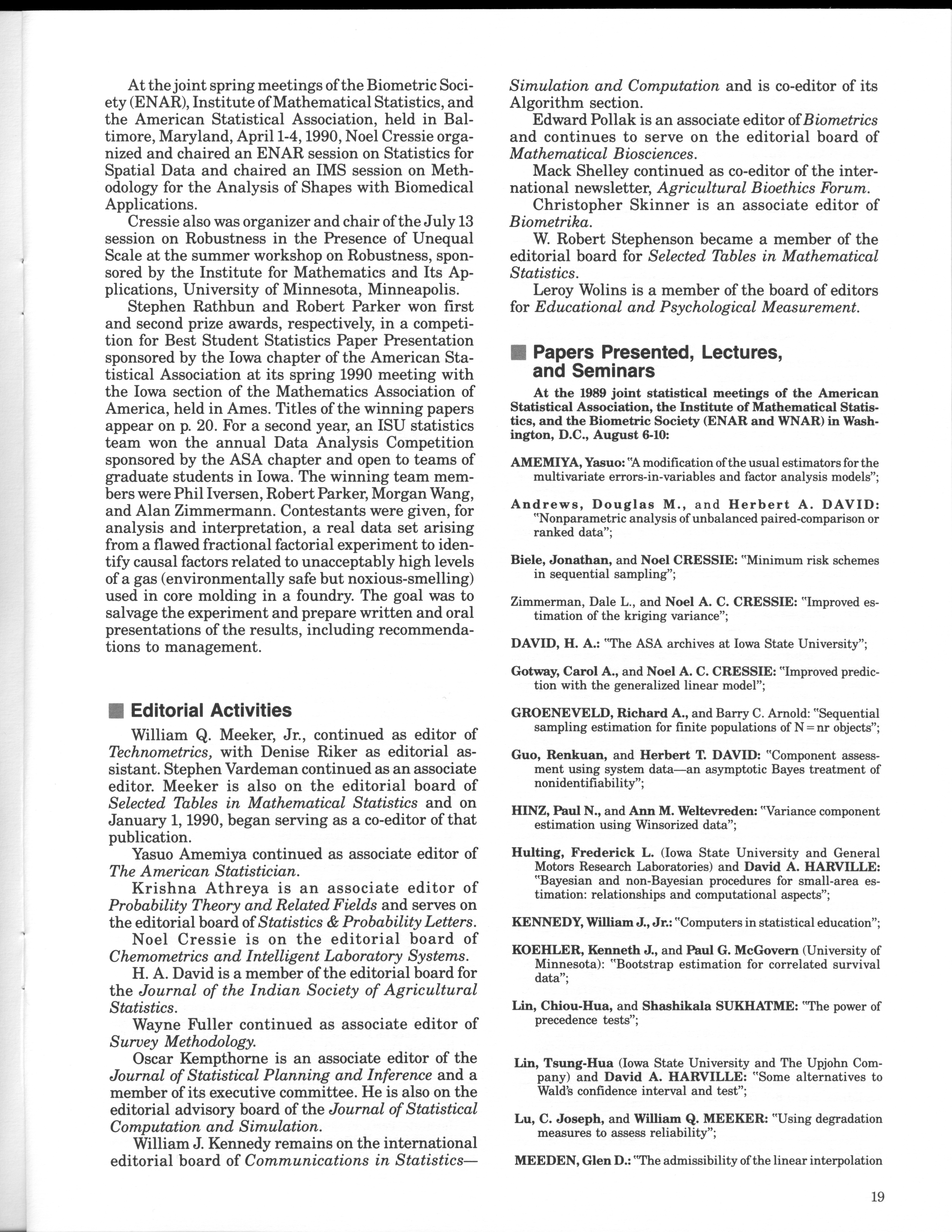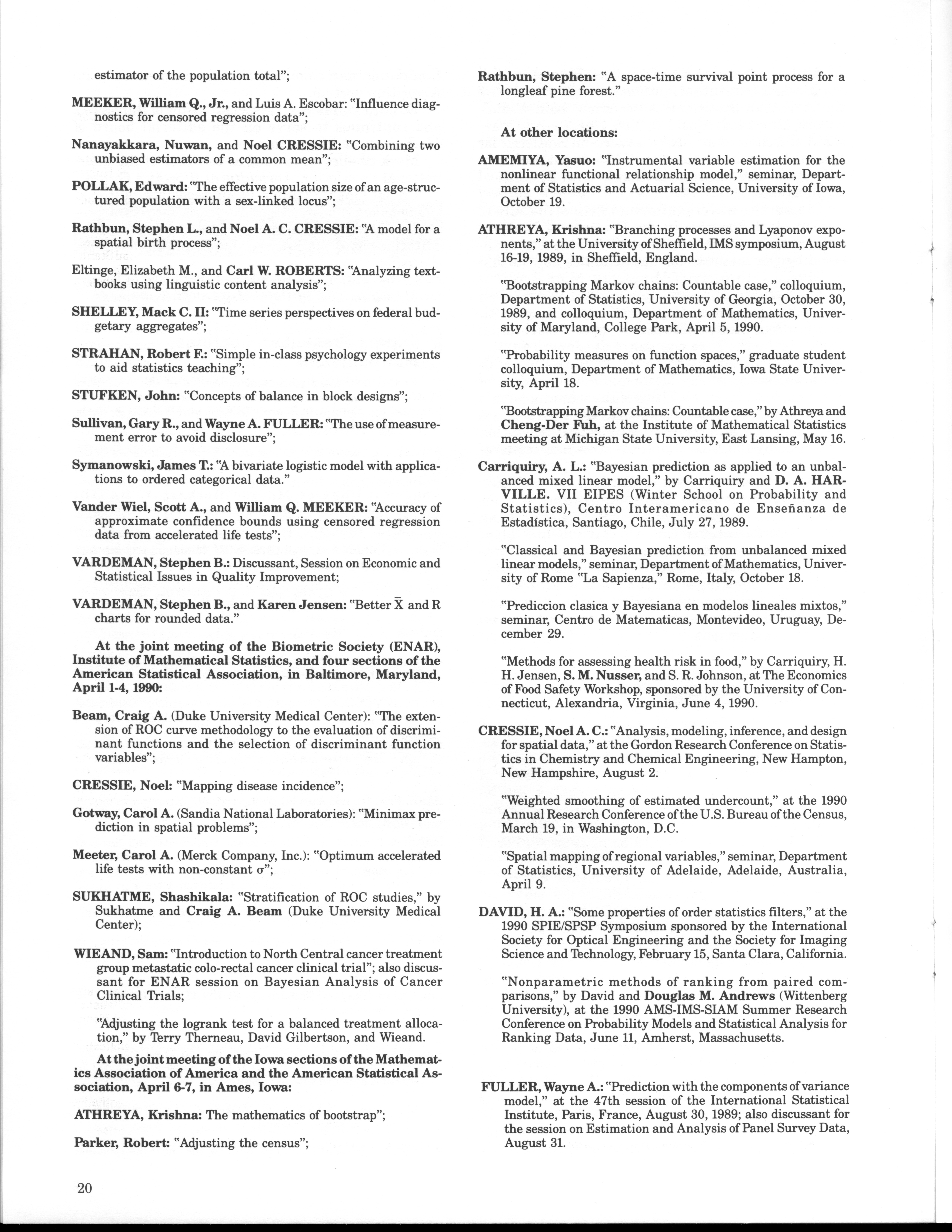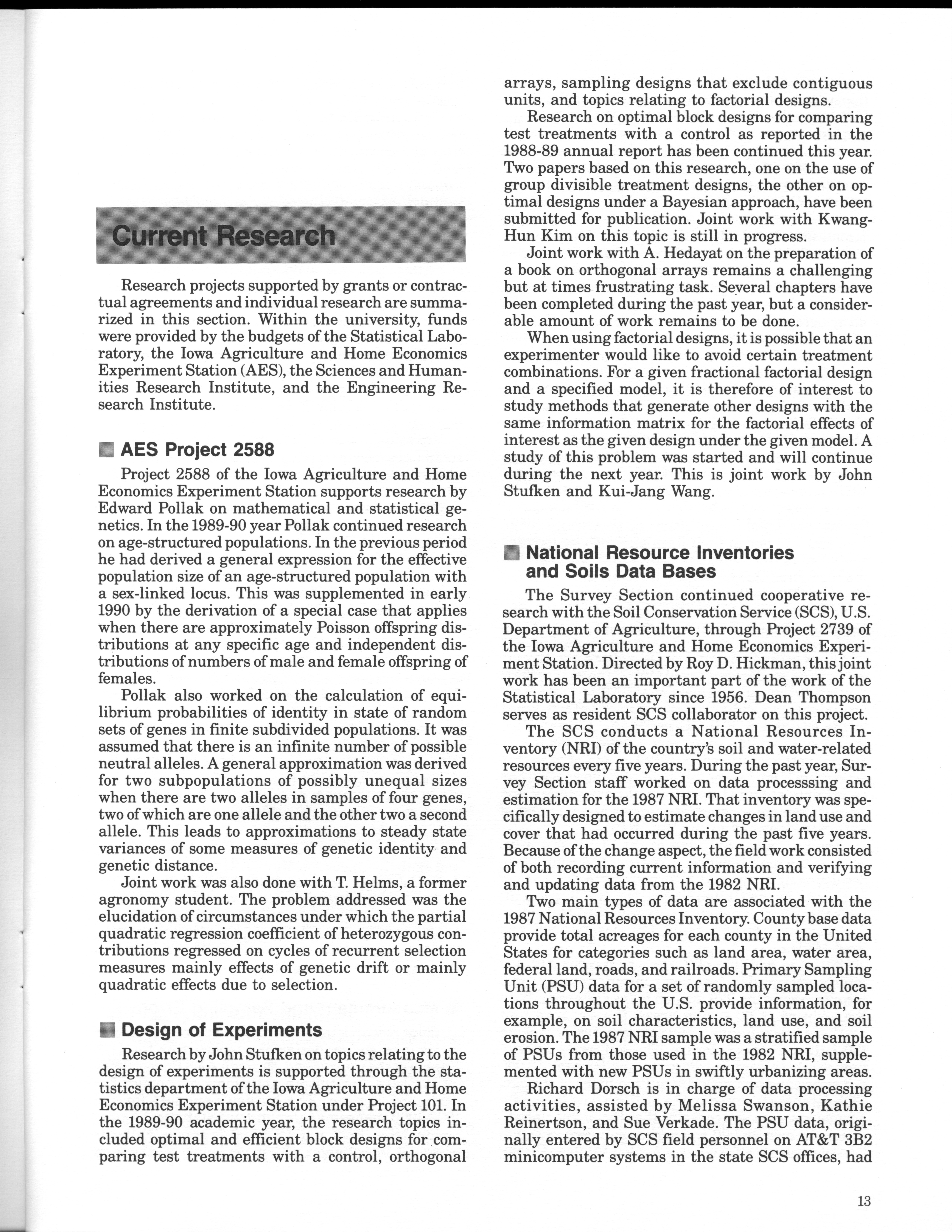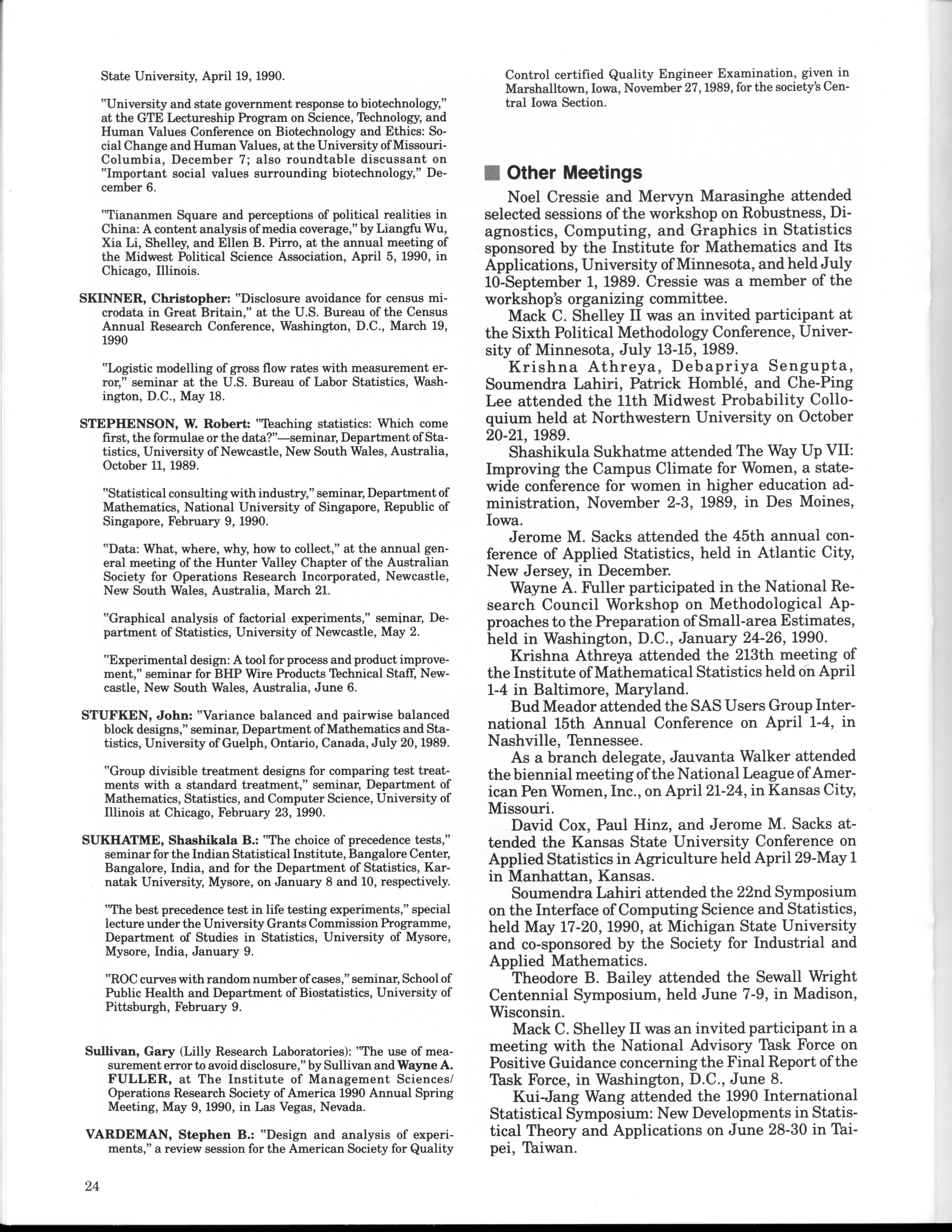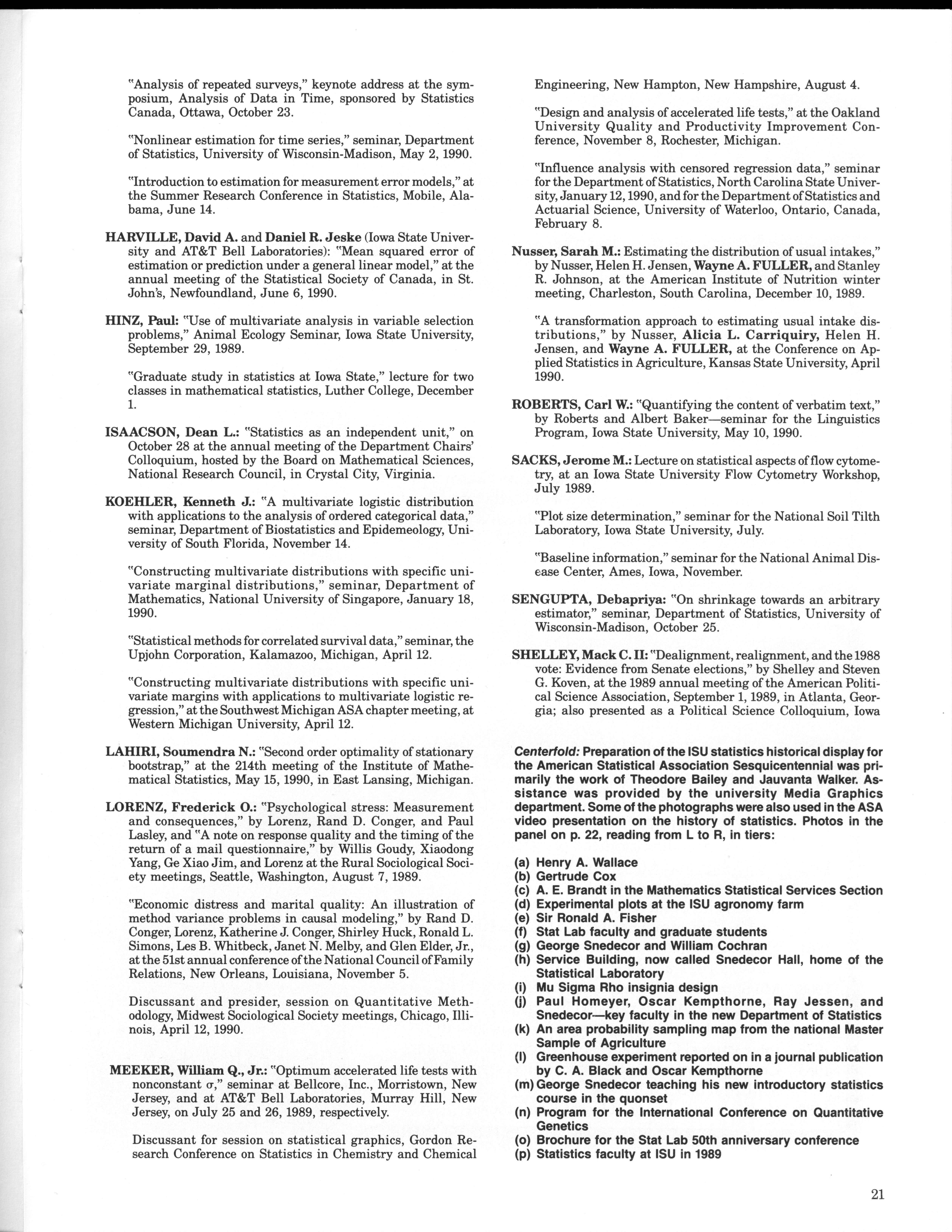 - "Statistical Laboratory Annual Report, July 1, 1989 to June 30, 1990", Iowa State University Statistical Laboratory Annual Reports, Iowa State University Library Digital Collections