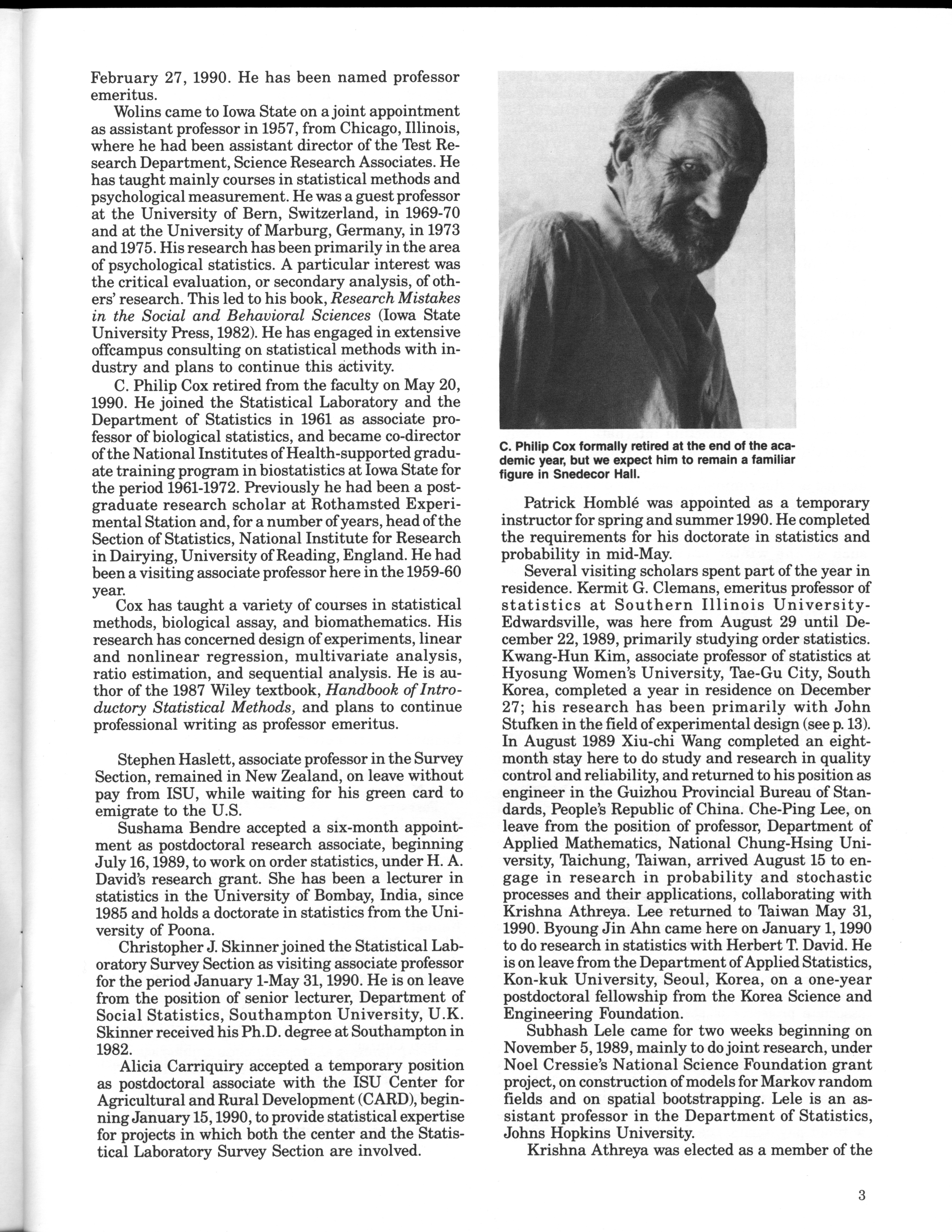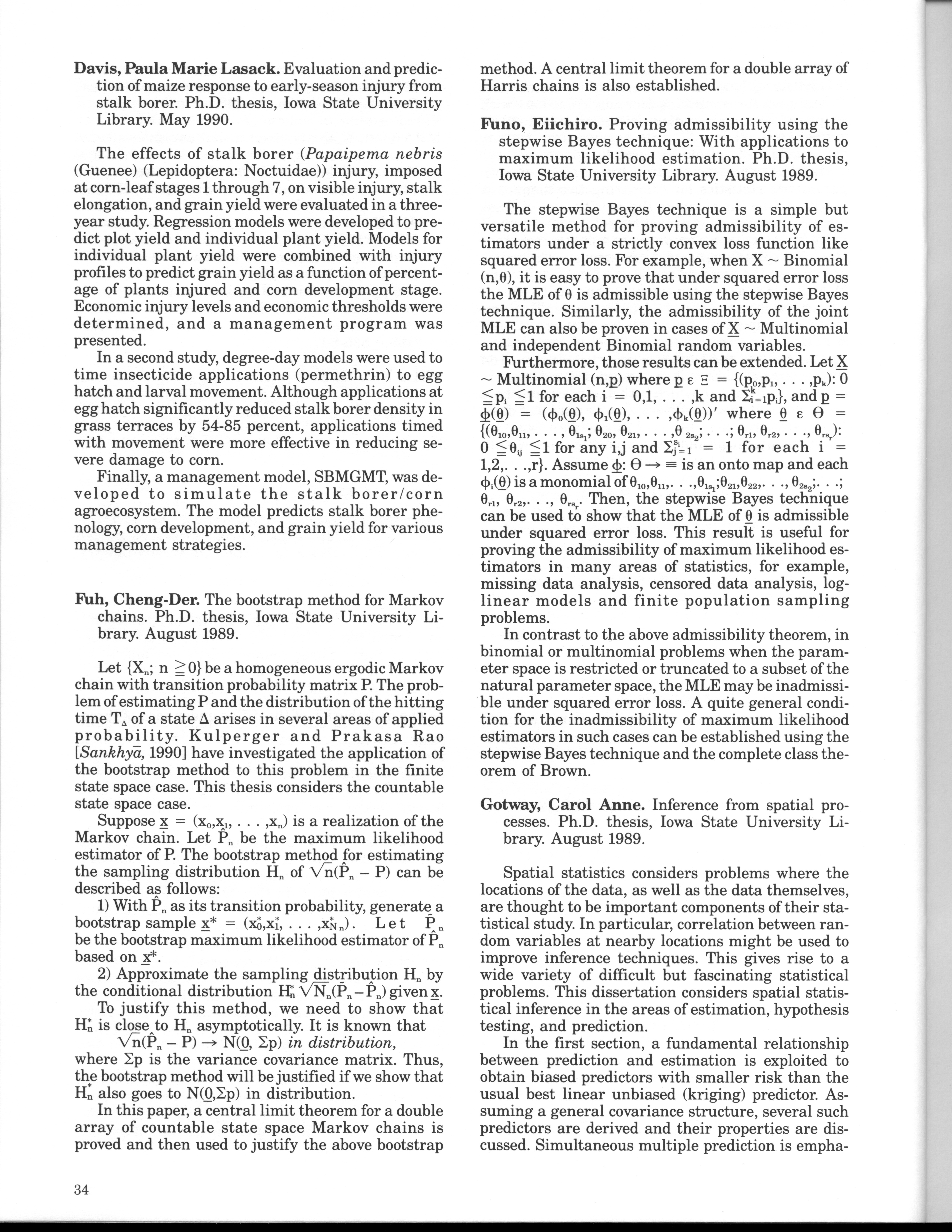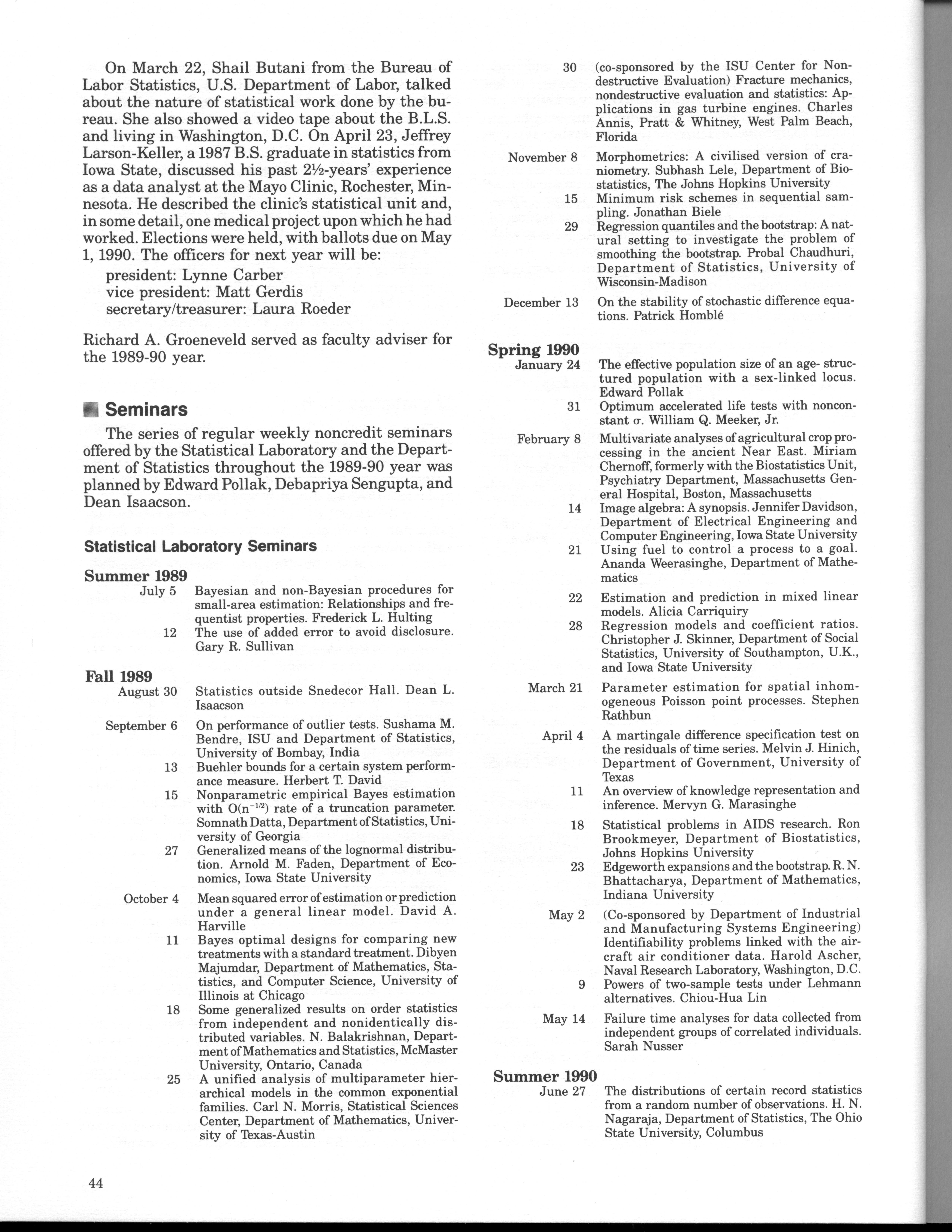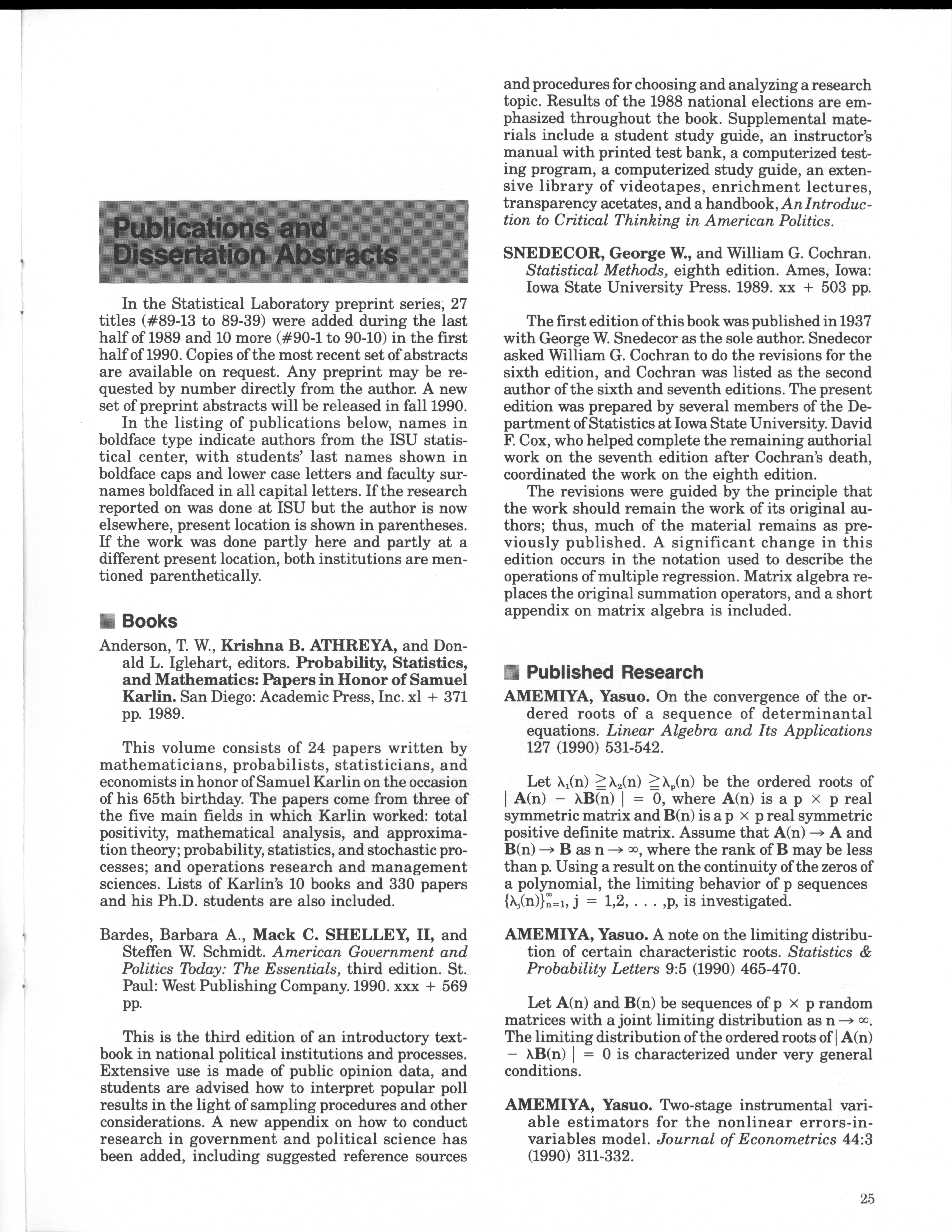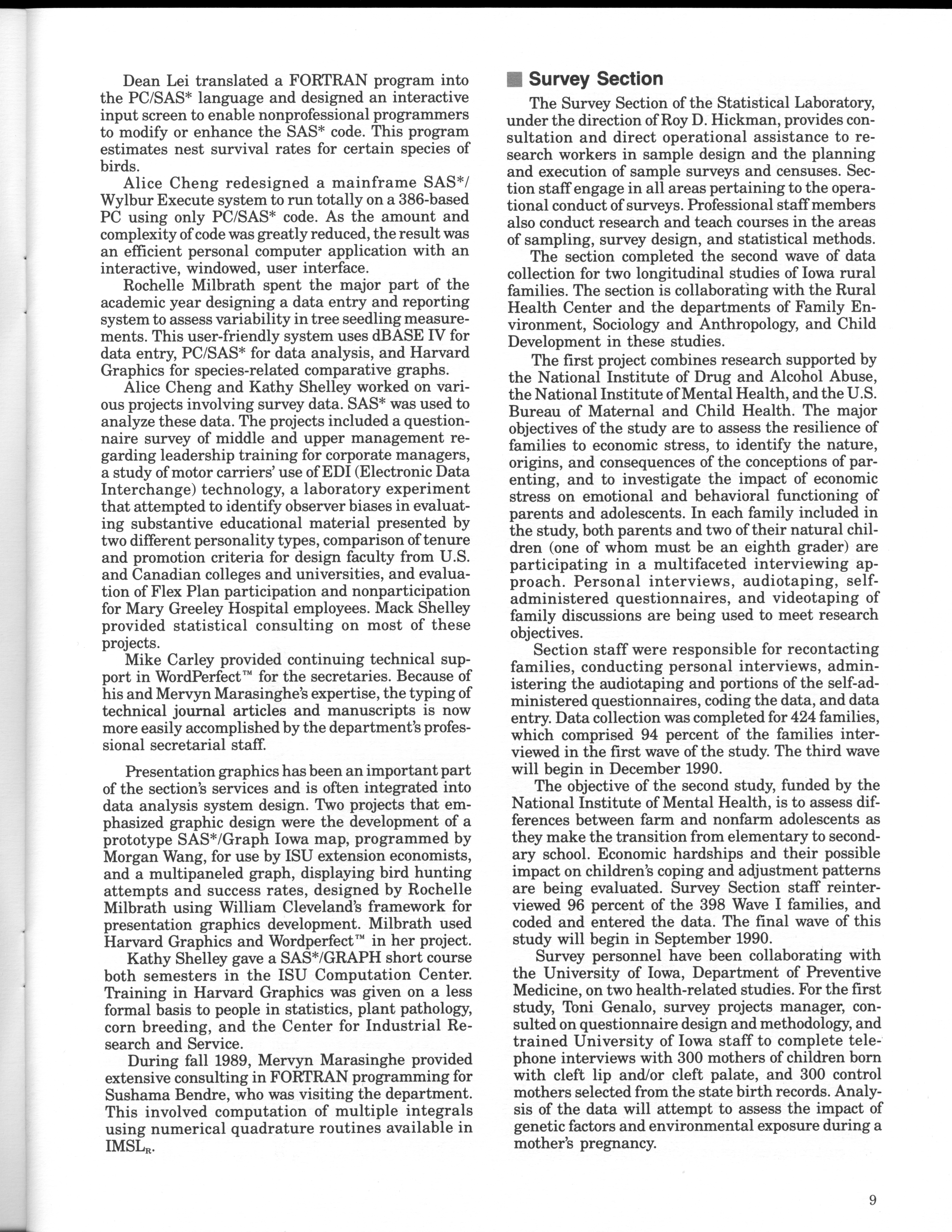 - "Statistical Laboratory Annual Report, July 1, 1989 to June 30, 1990", Iowa State University Statistical Laboratory Annual Reports, Iowa State University Library Digital Collections