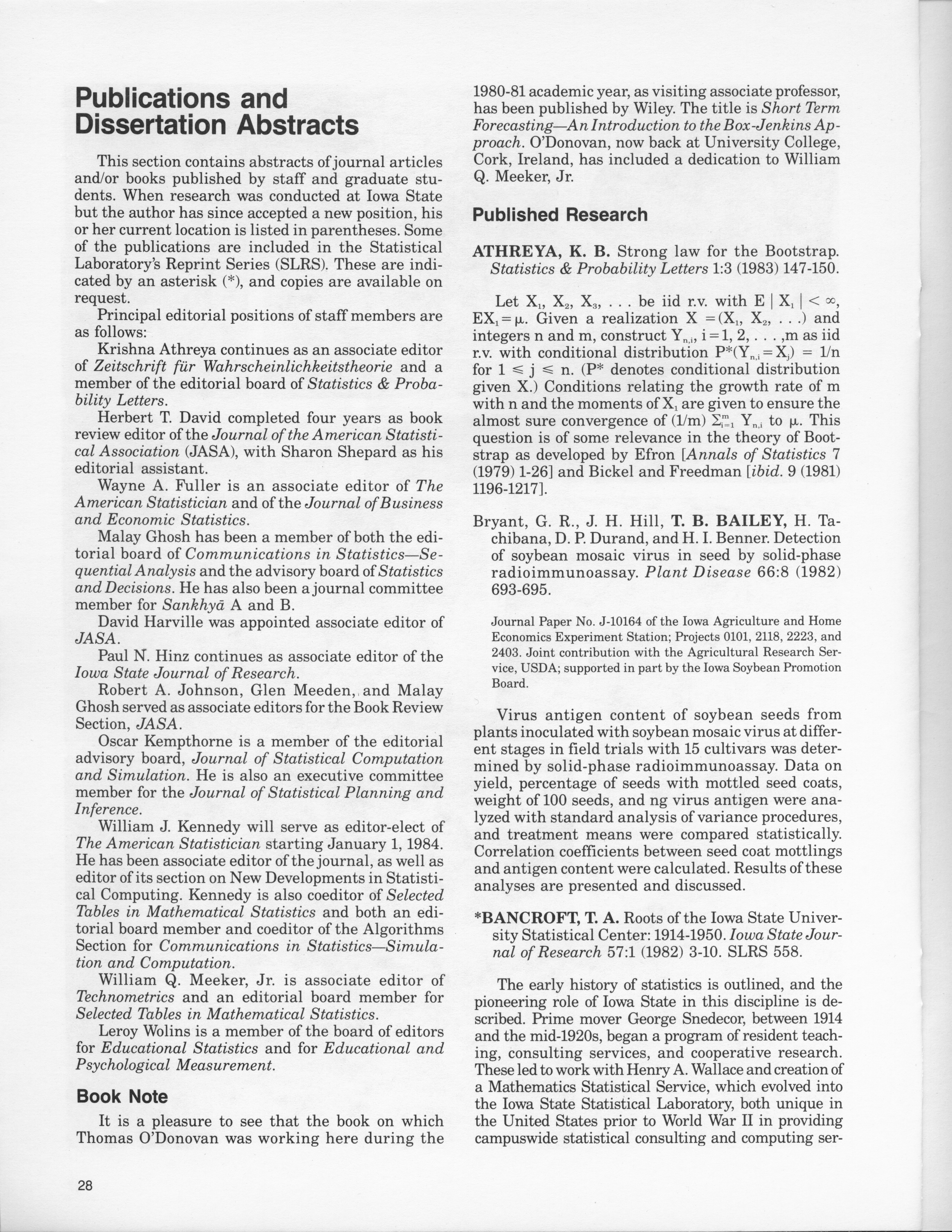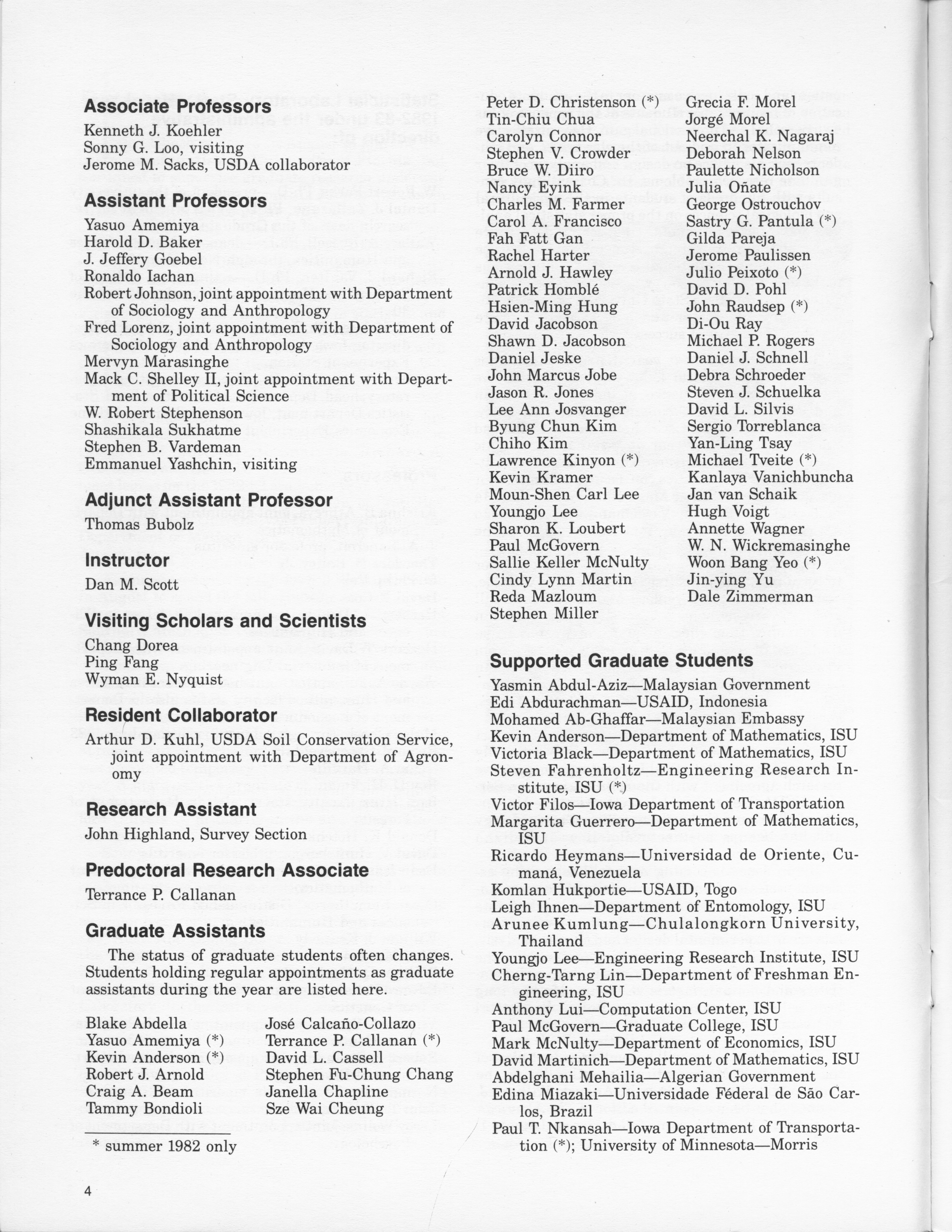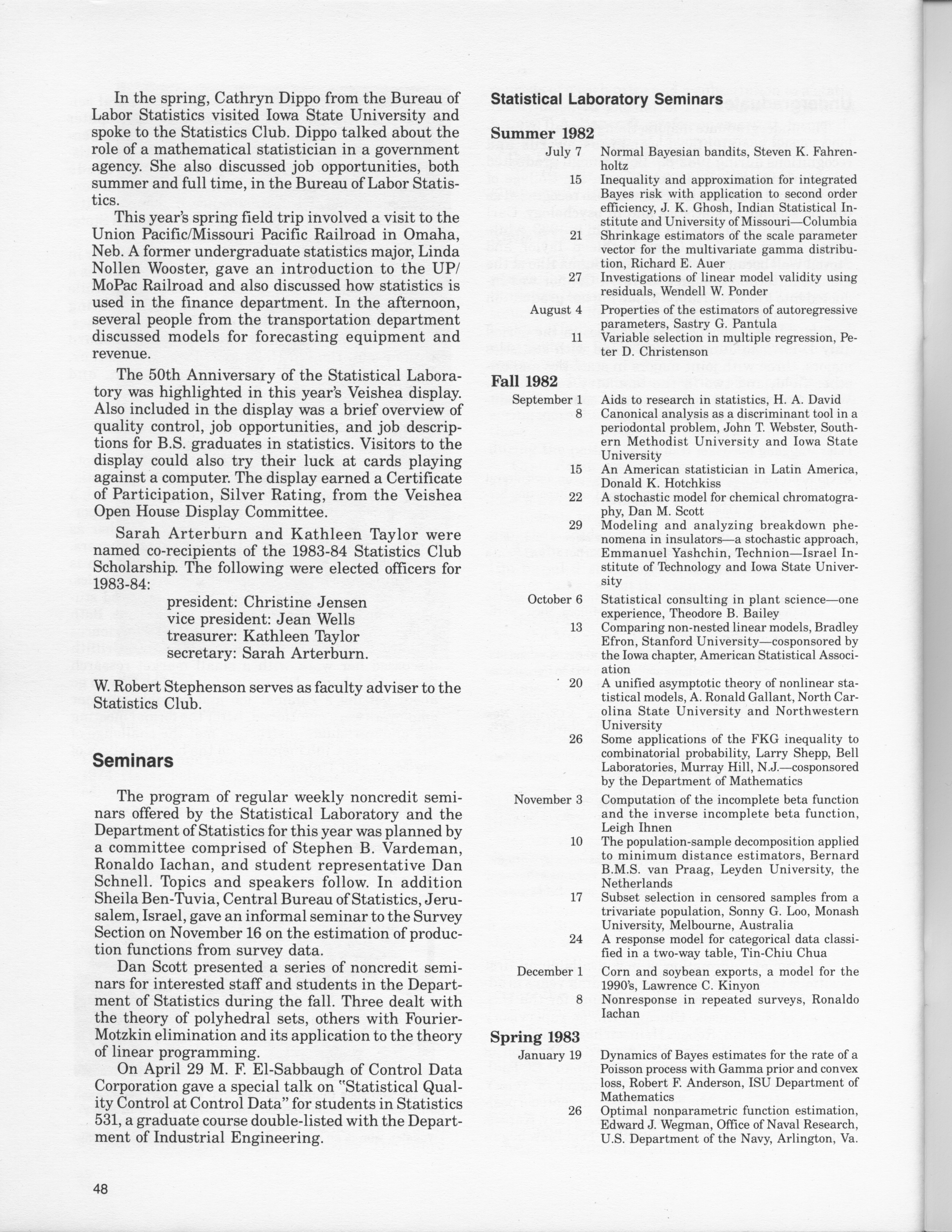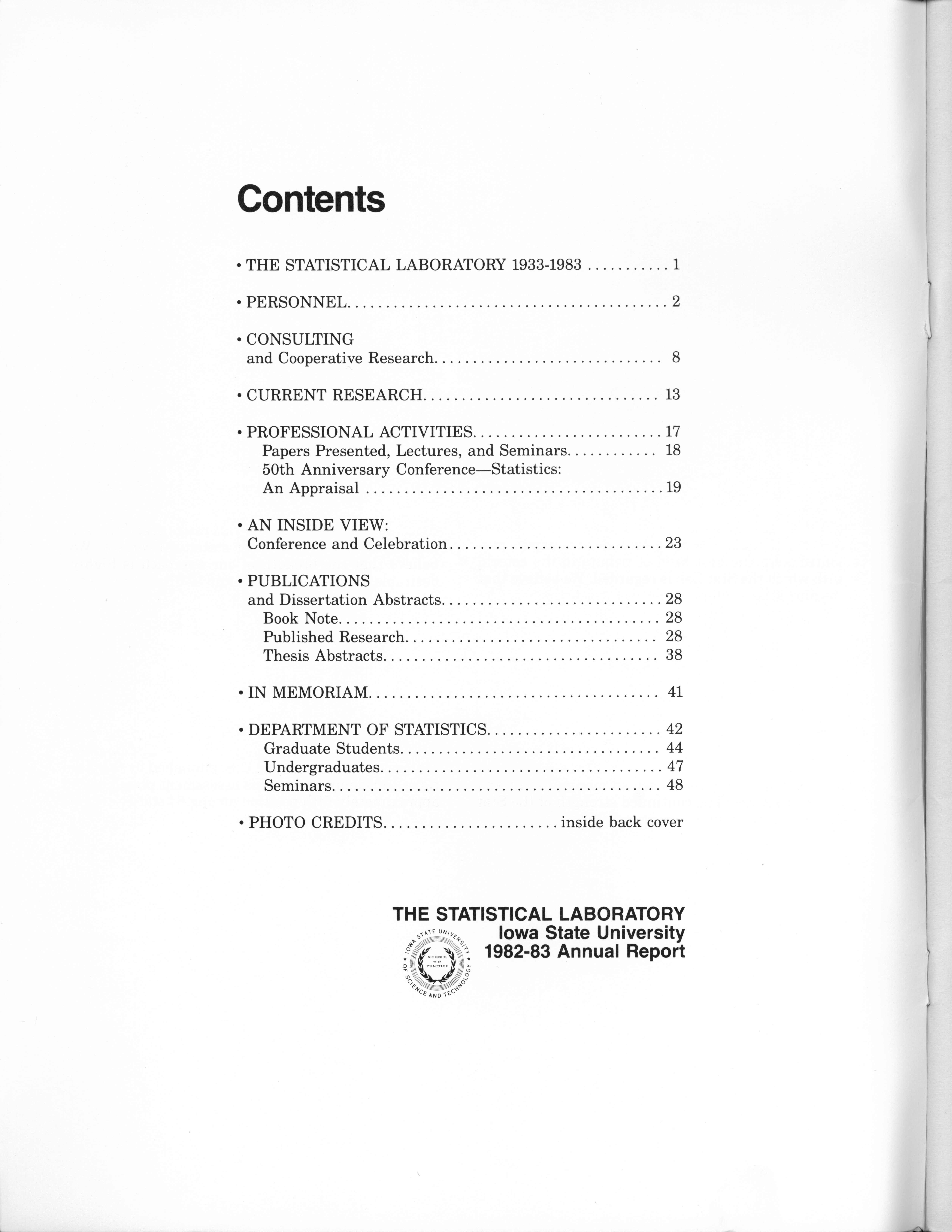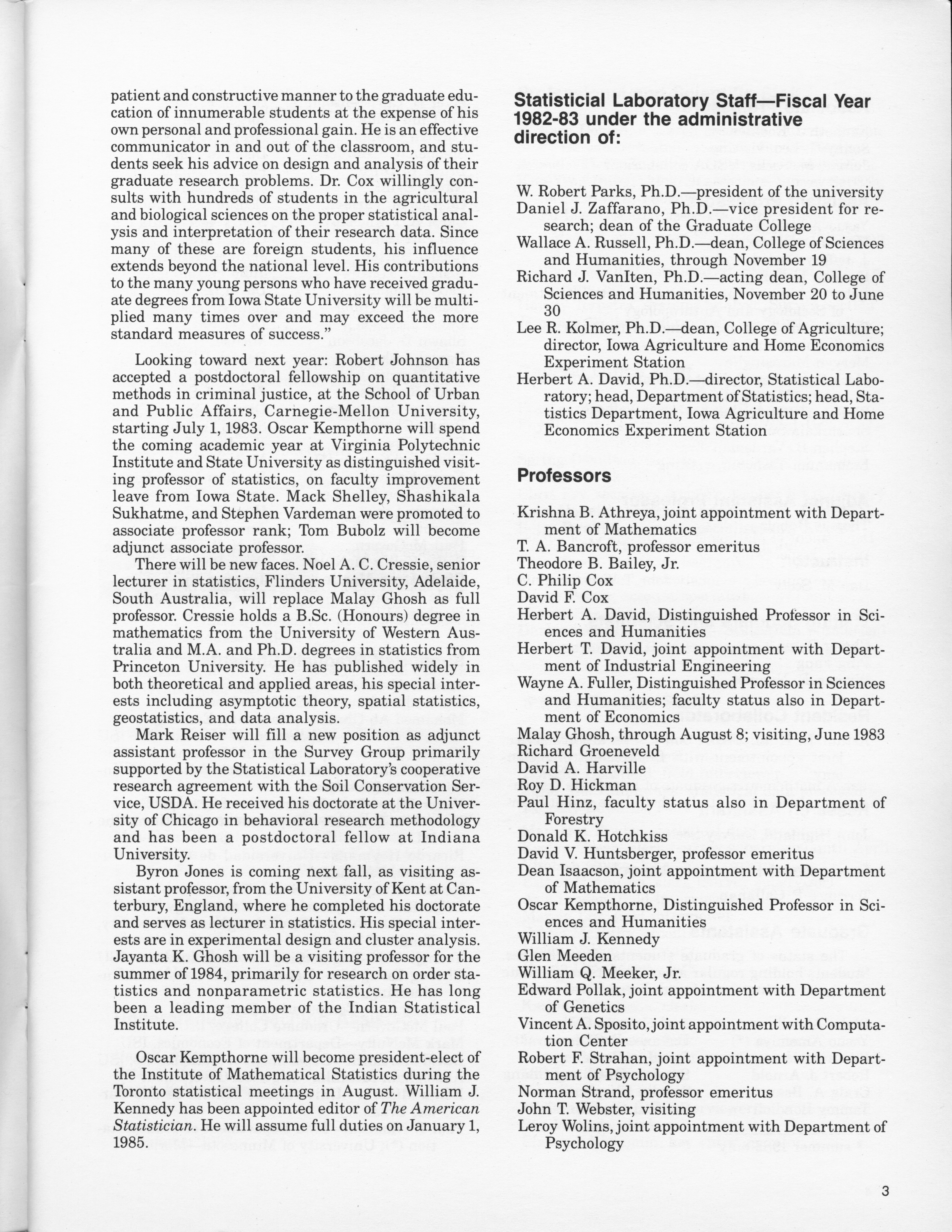 - "Statistical Laboratory Annual Report, July 1, 1982 to June 30, 1983", Iowa State University Statistical Laboratory Annual Reports, Iowa State University Library Digital Collections