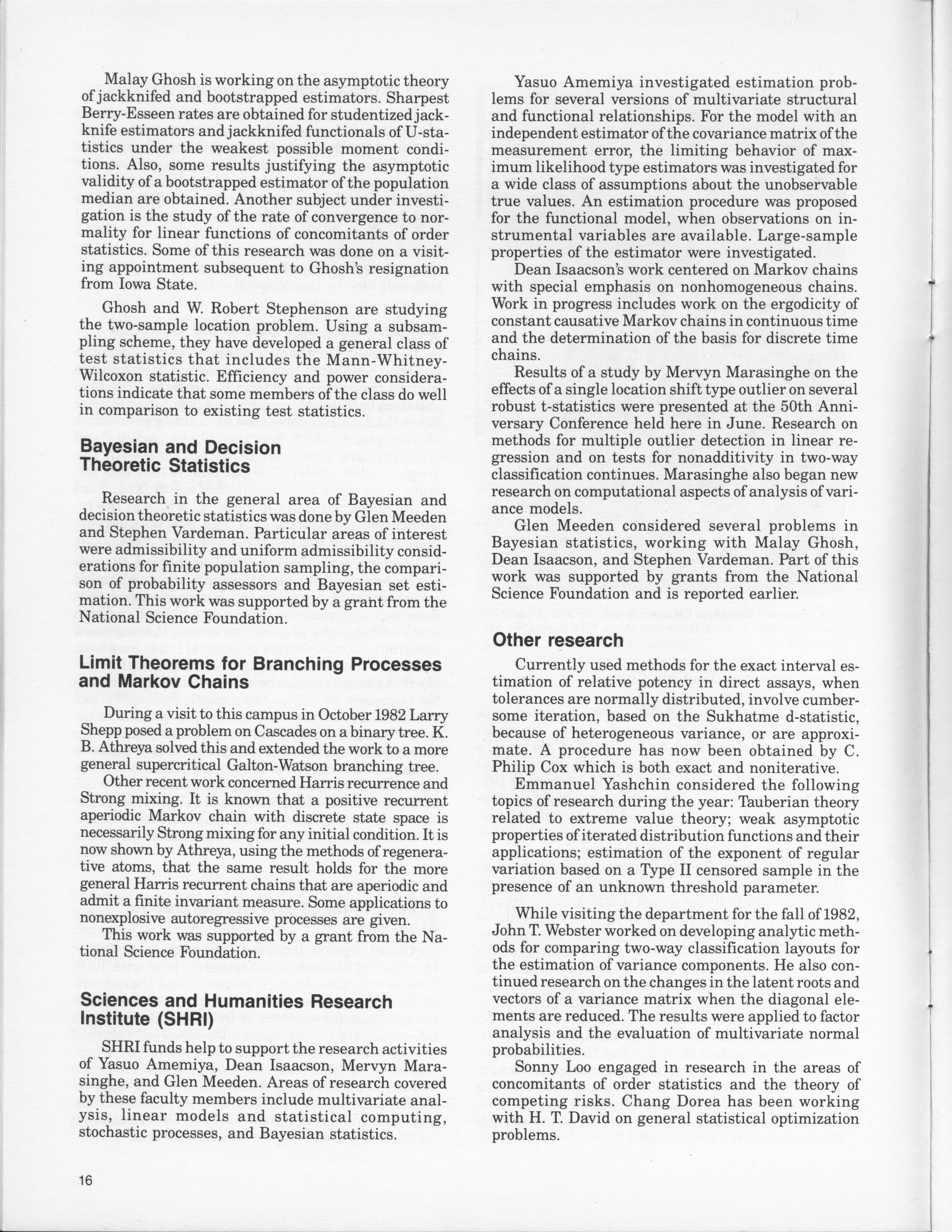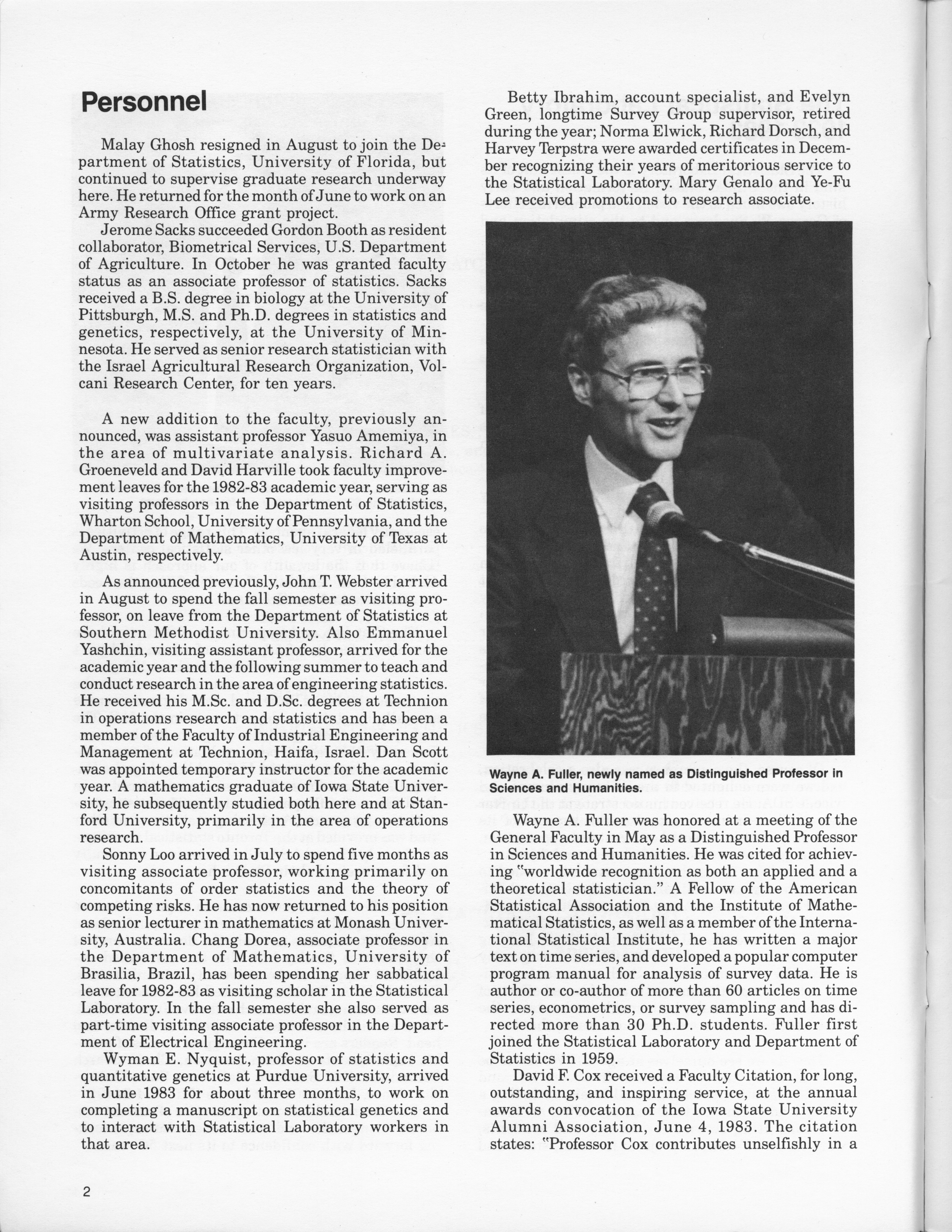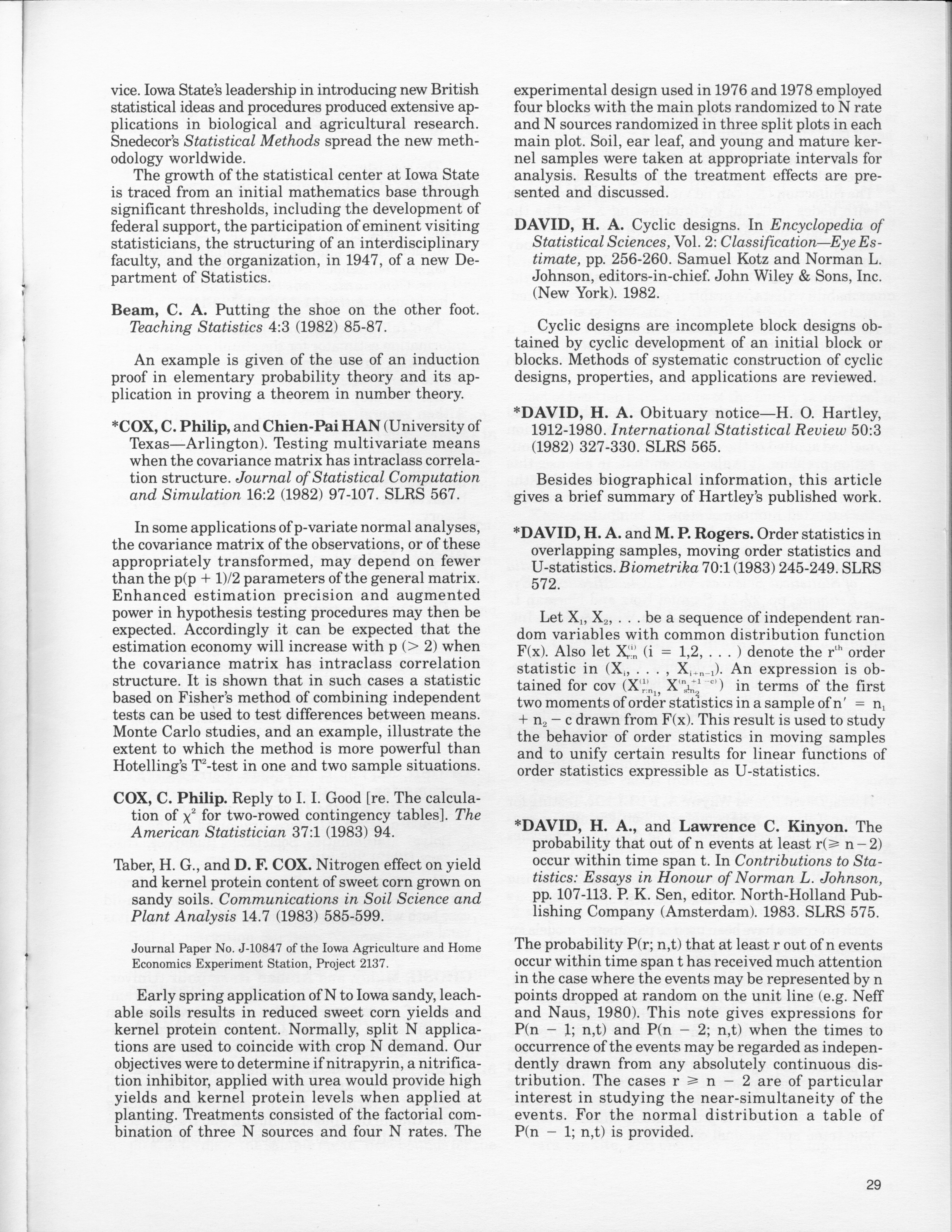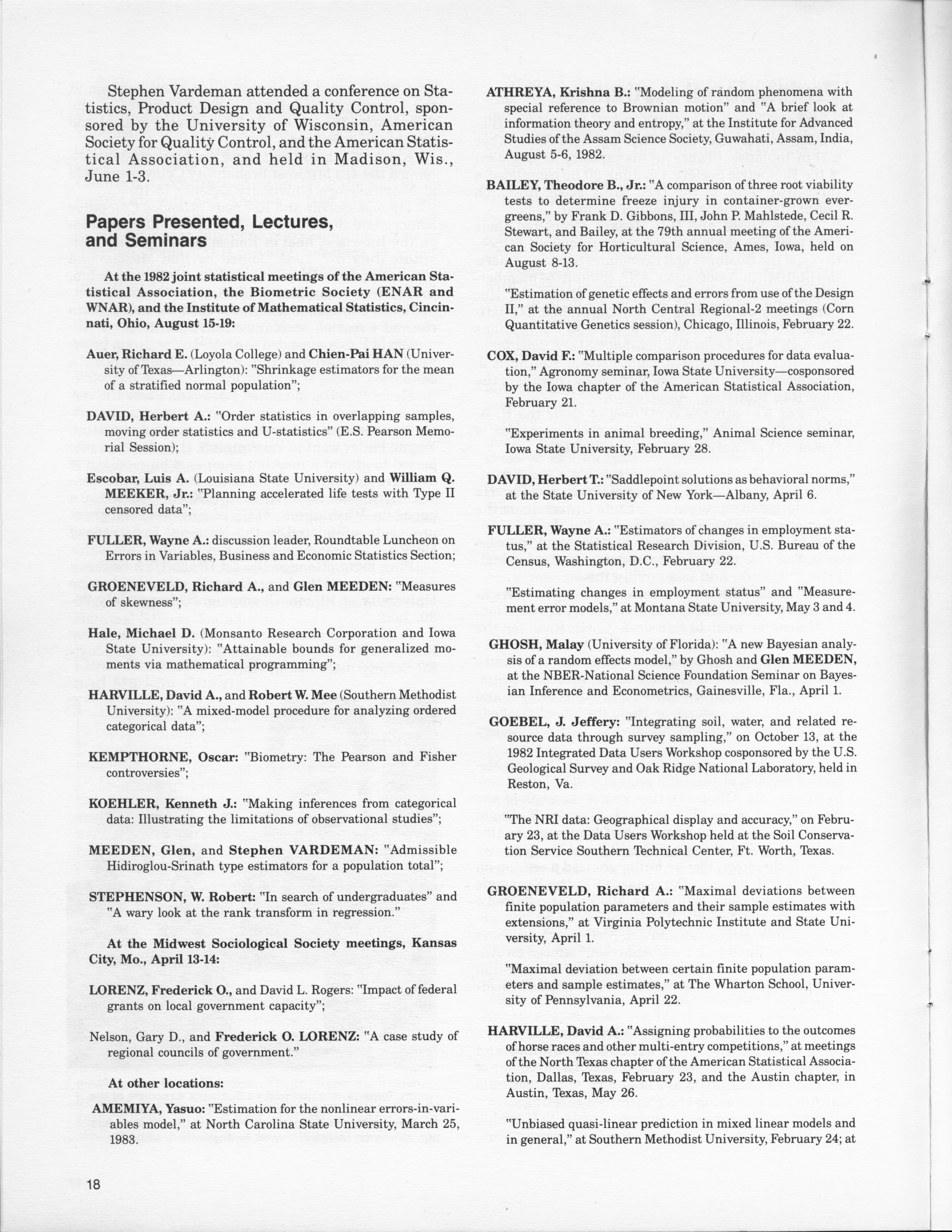- "Statistical Laboratory Annual Report, July 1, 1982 to June 30, 1983", Iowa State University Statistical Laboratory Annual Reports, Iowa State University Library Digital Collections