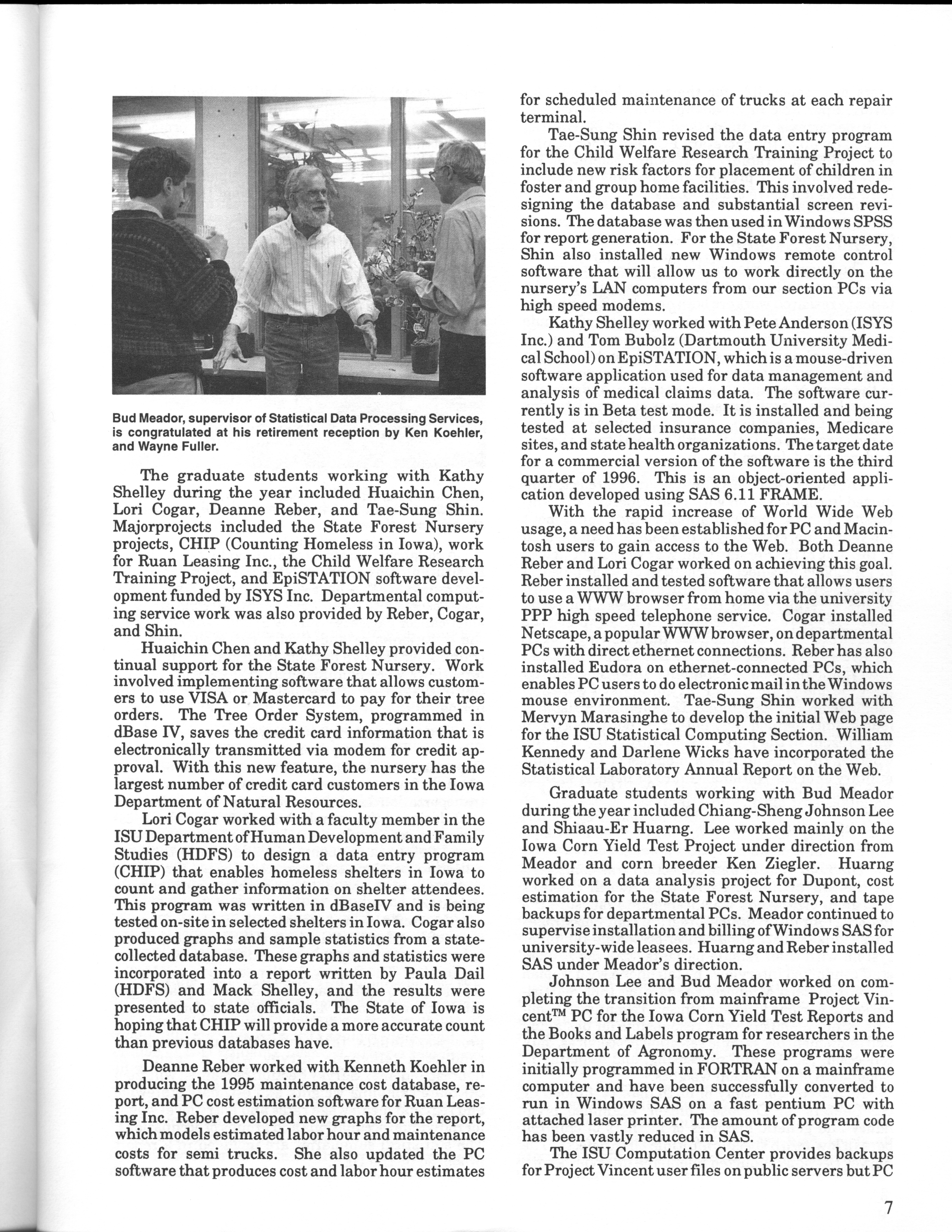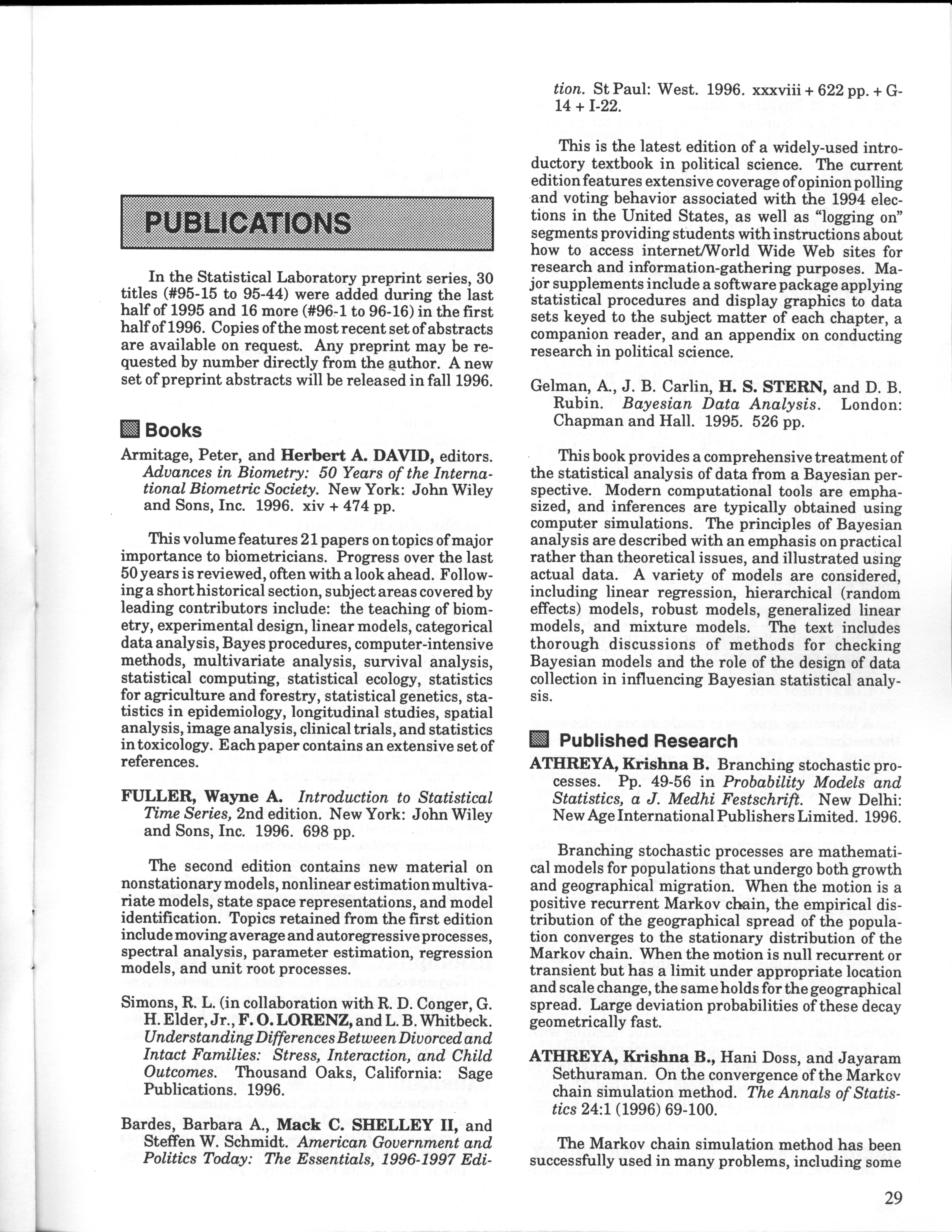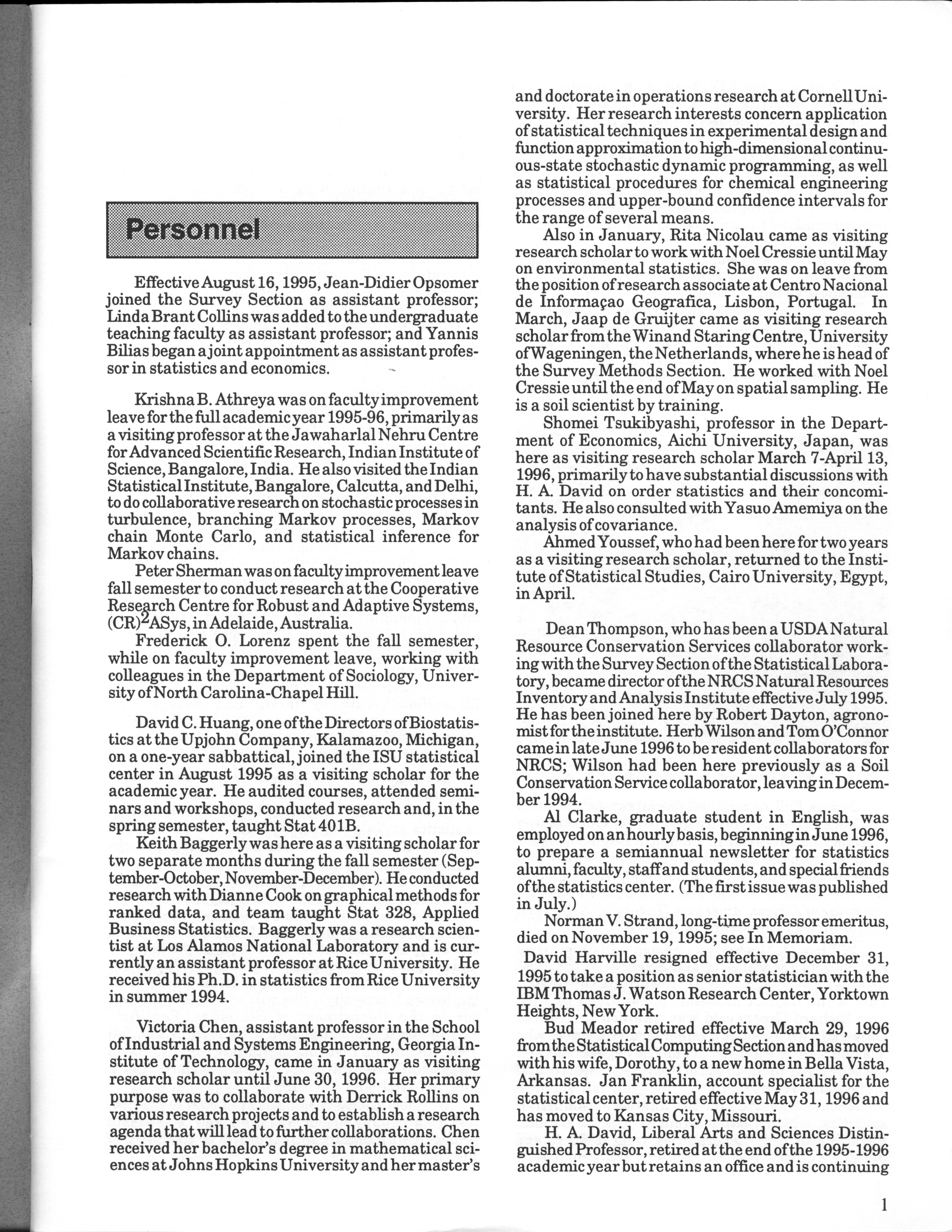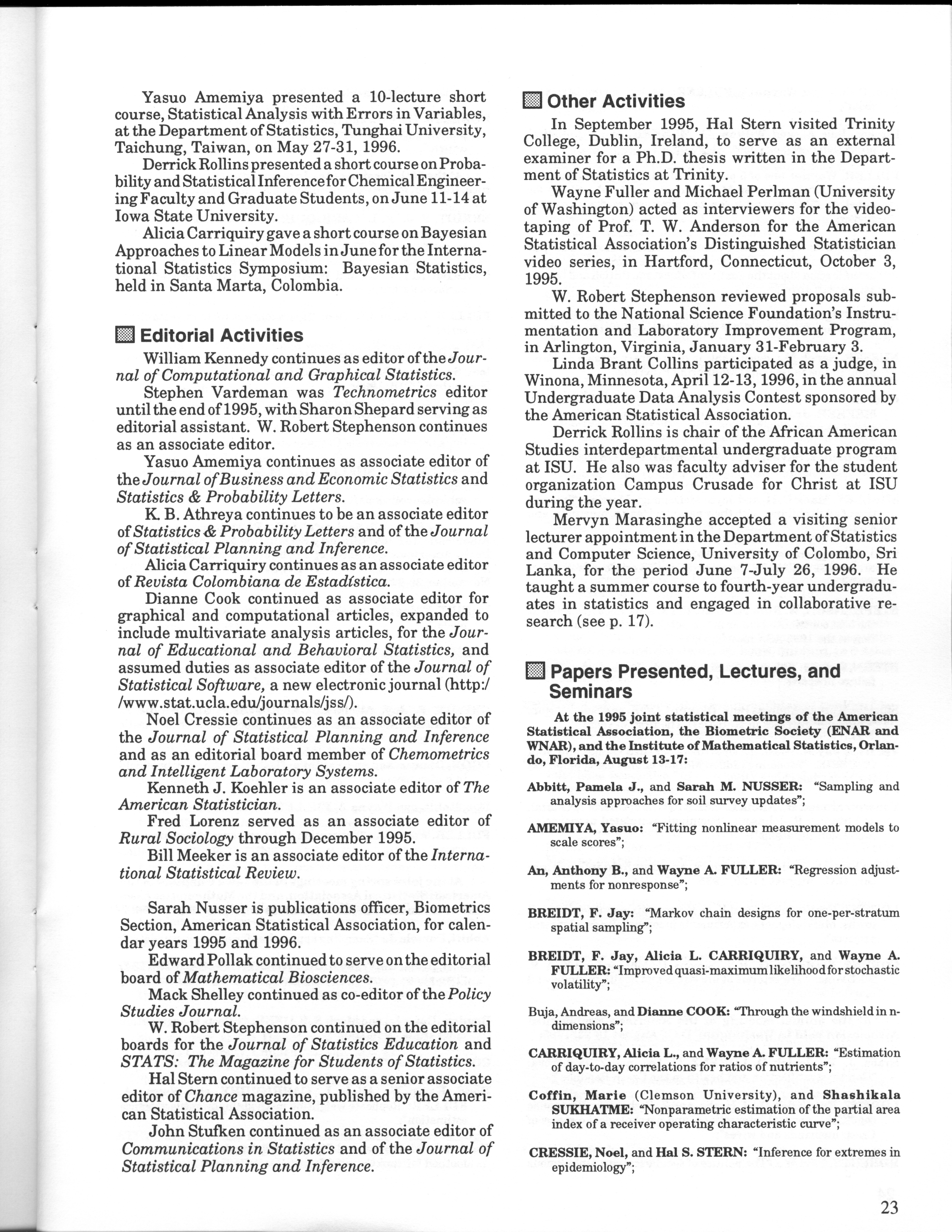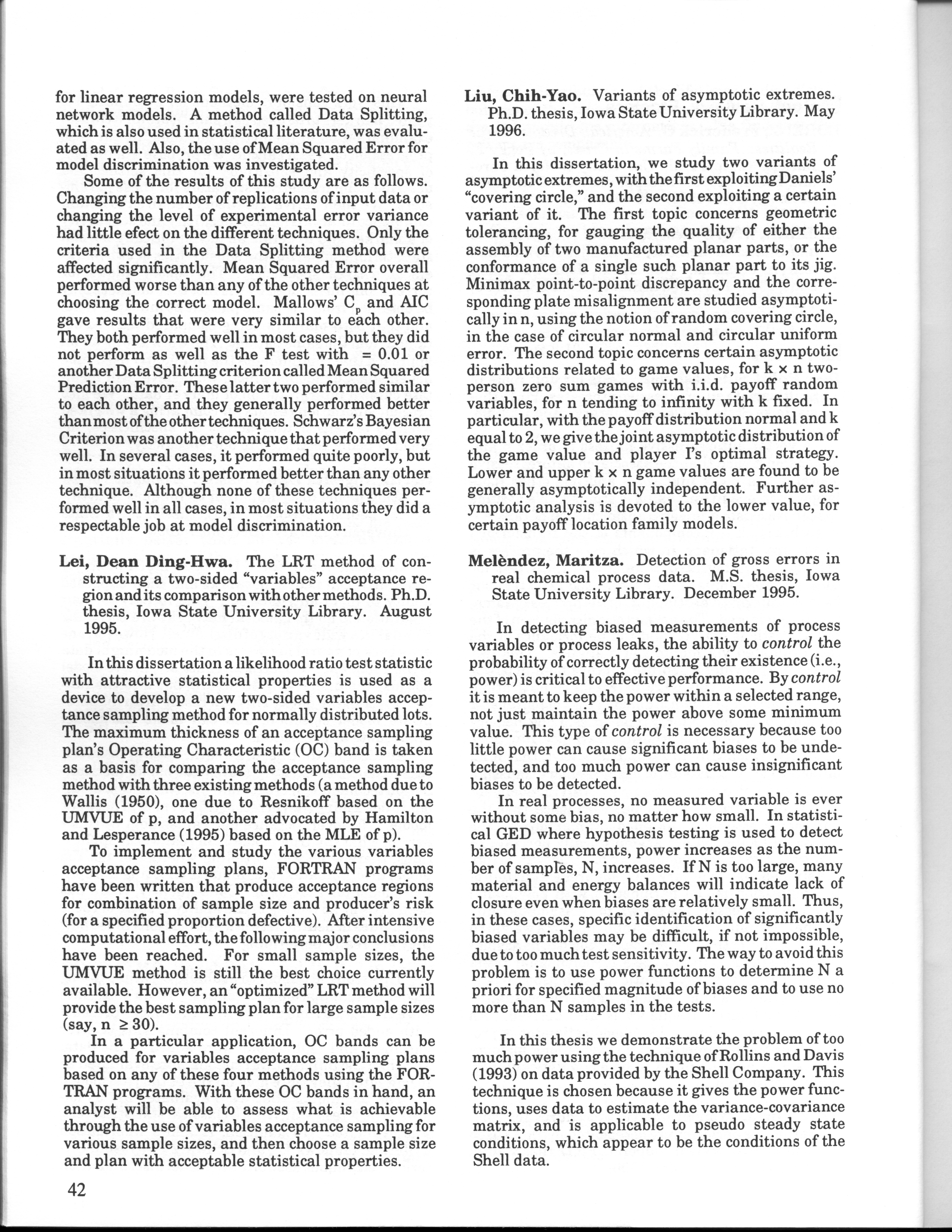 - "Statistical Laboratory Annual Report, July 1, 1995 to June 30, 1996", Iowa State University Statistical Laboratory Annual Reports, Iowa State University Library Digital Collections