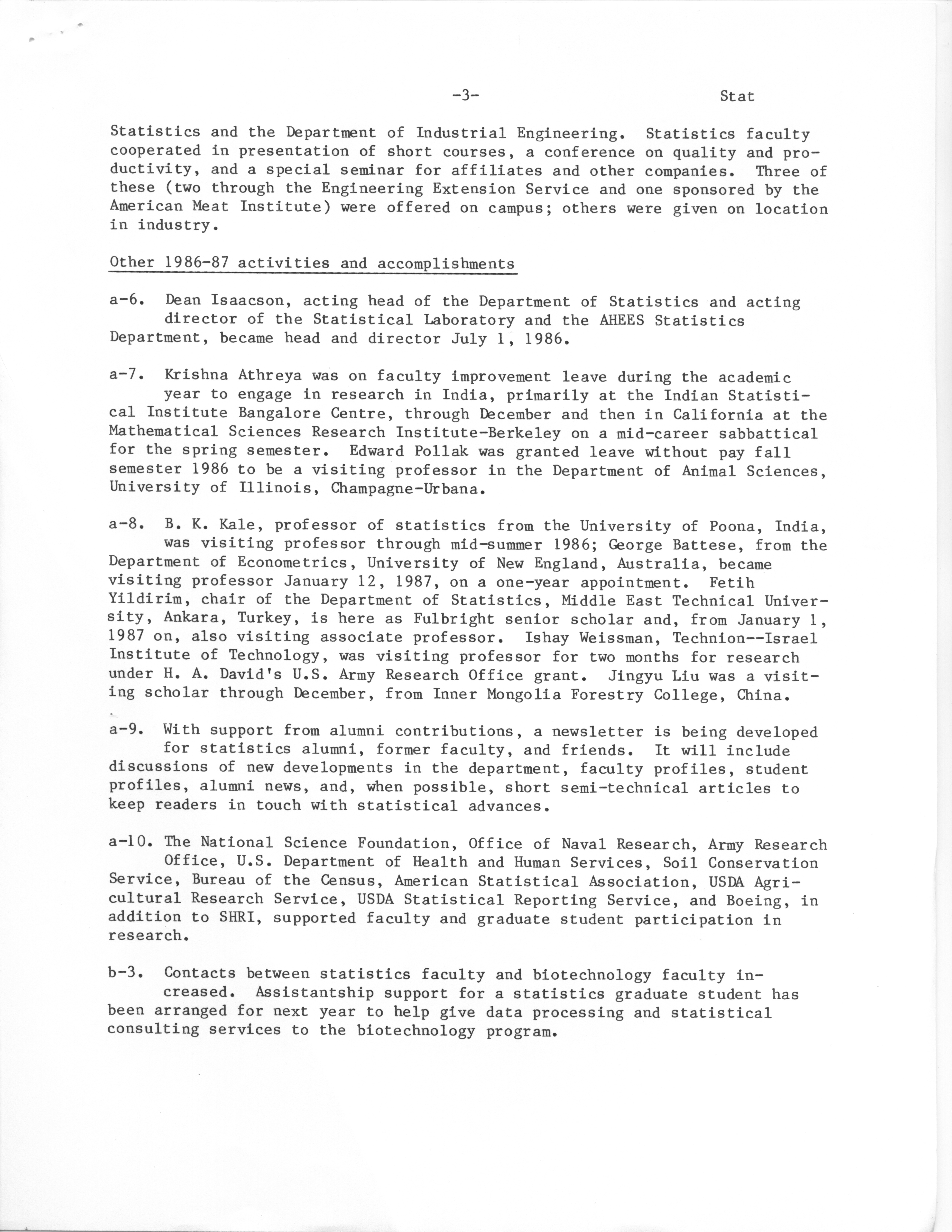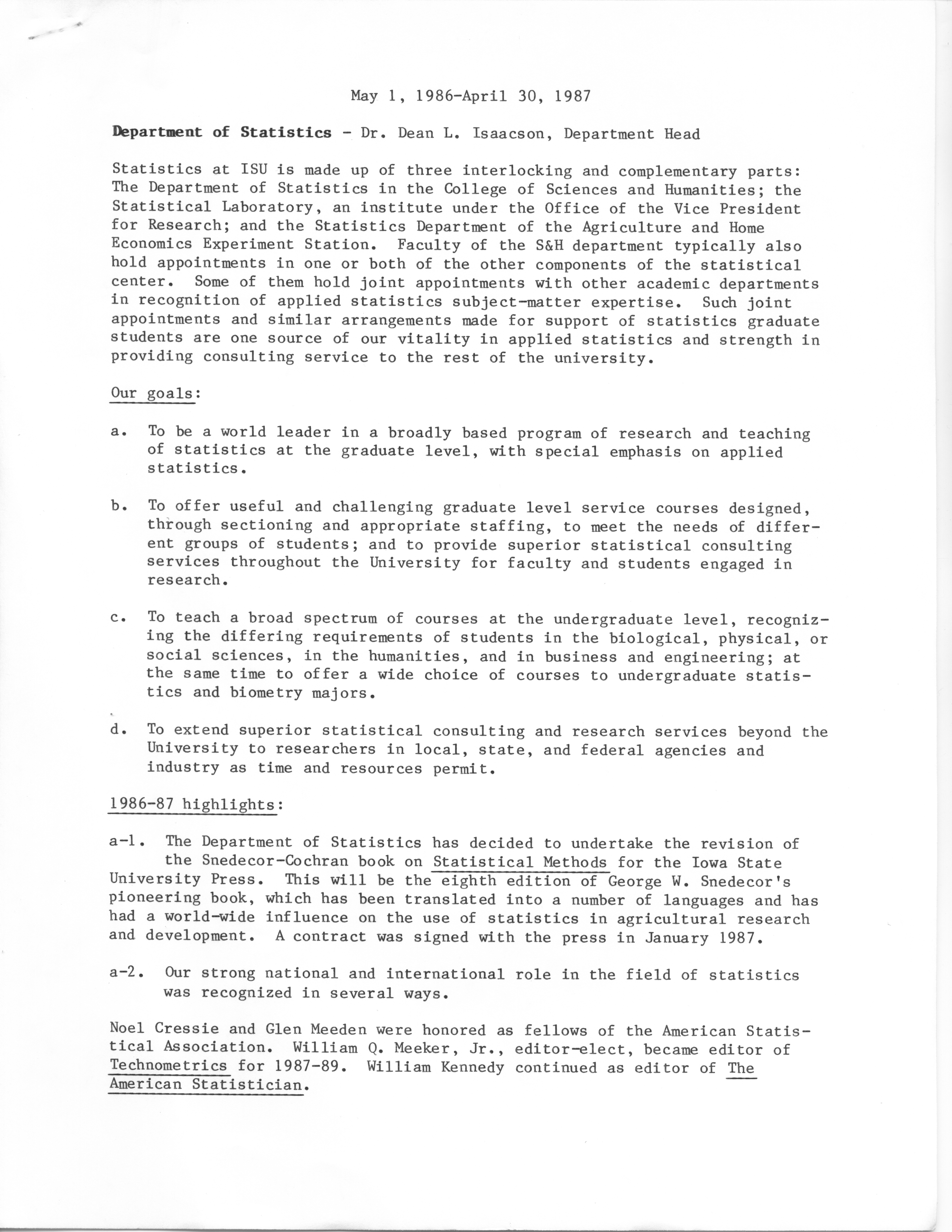 - "Department of Statistics Annual Report, May 1, 1986 to April 30, 1987", Iowa State University Statistical Laboratory Annual Reports, Iowa State University Library Digital Collections