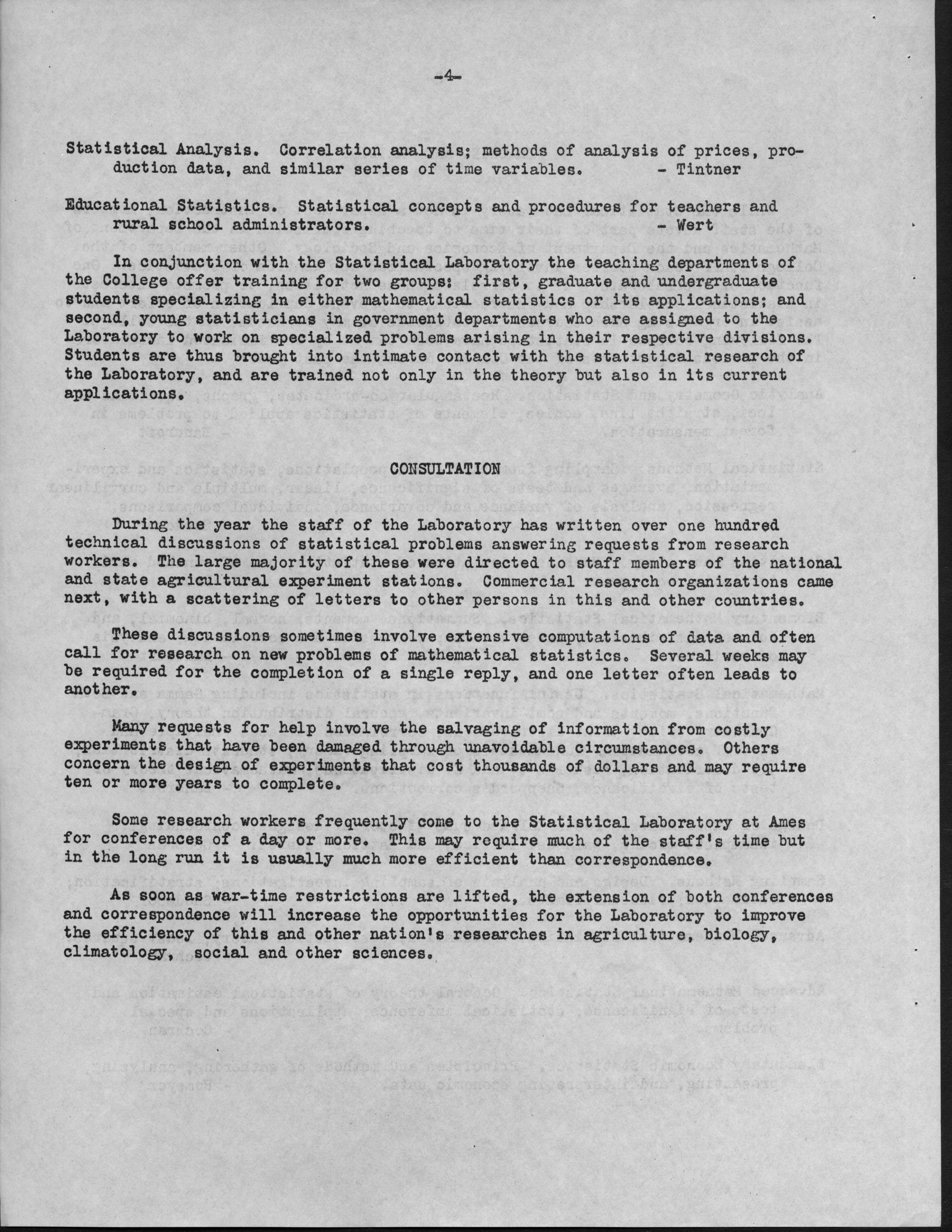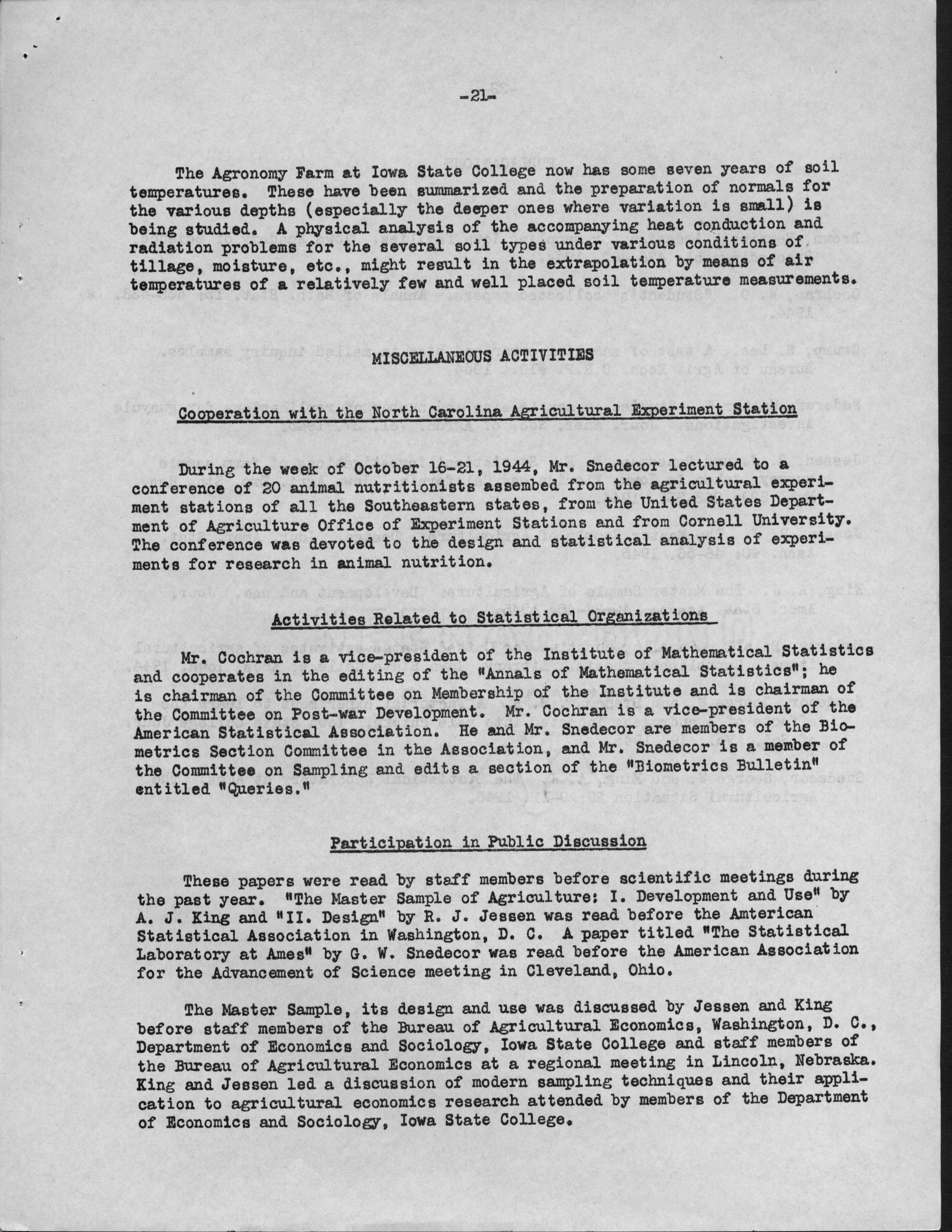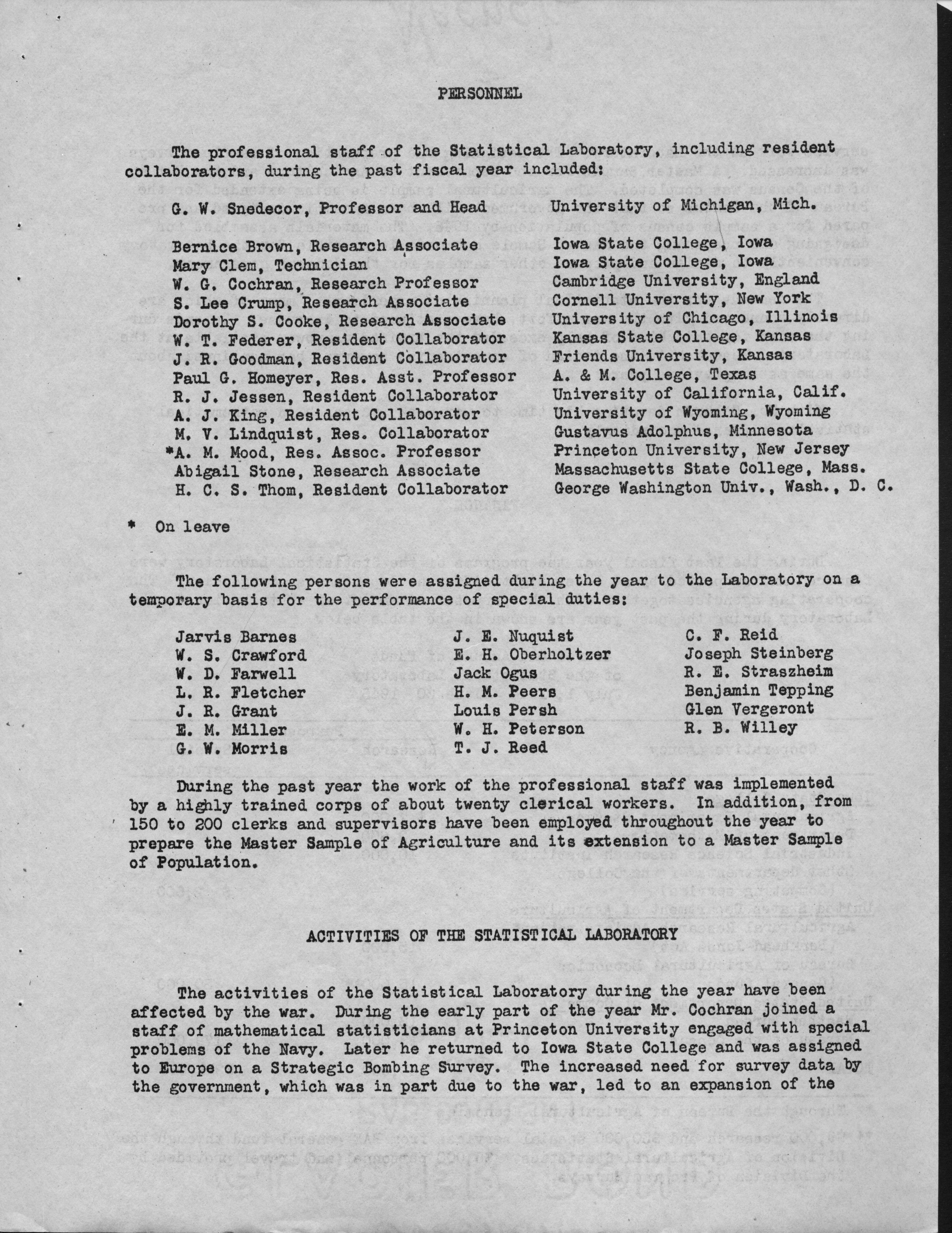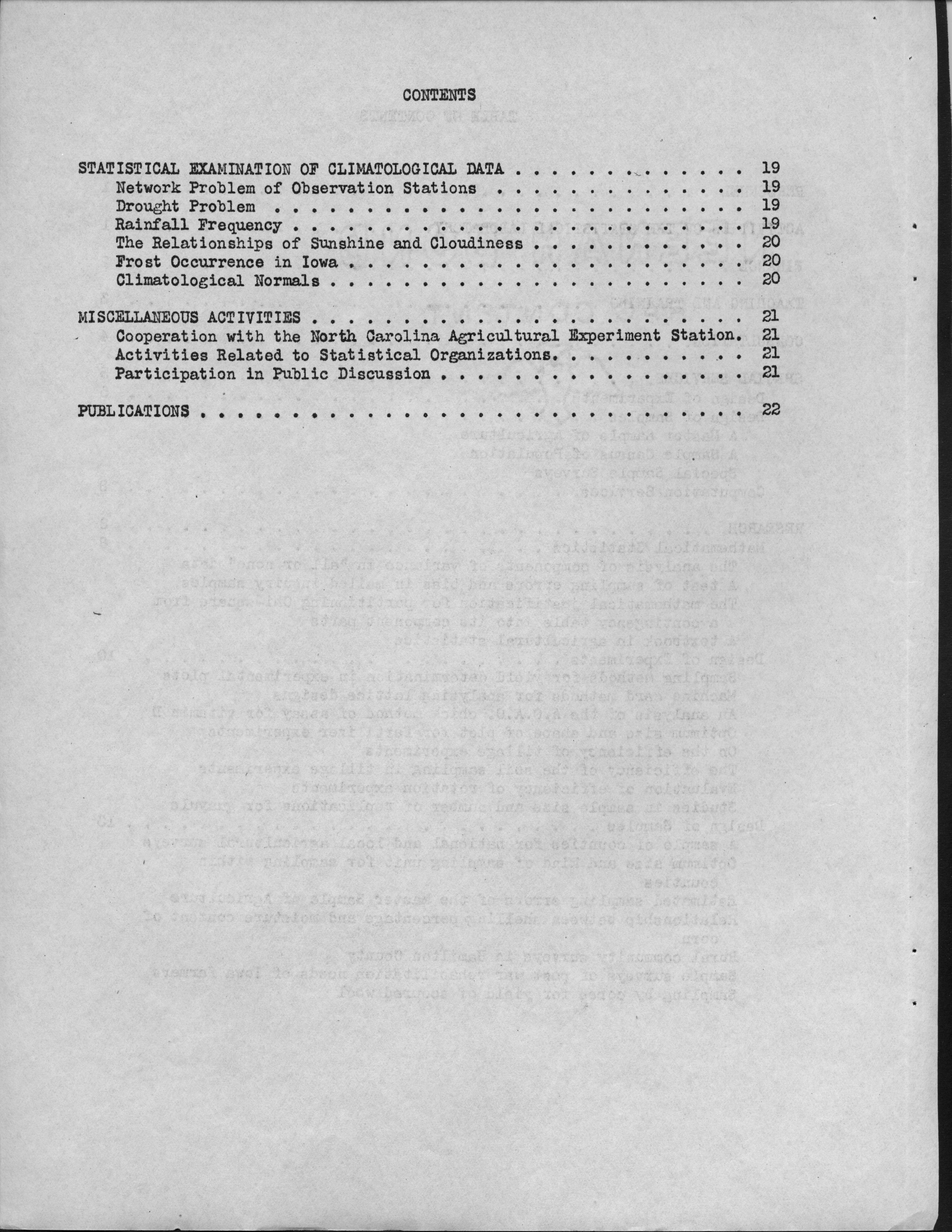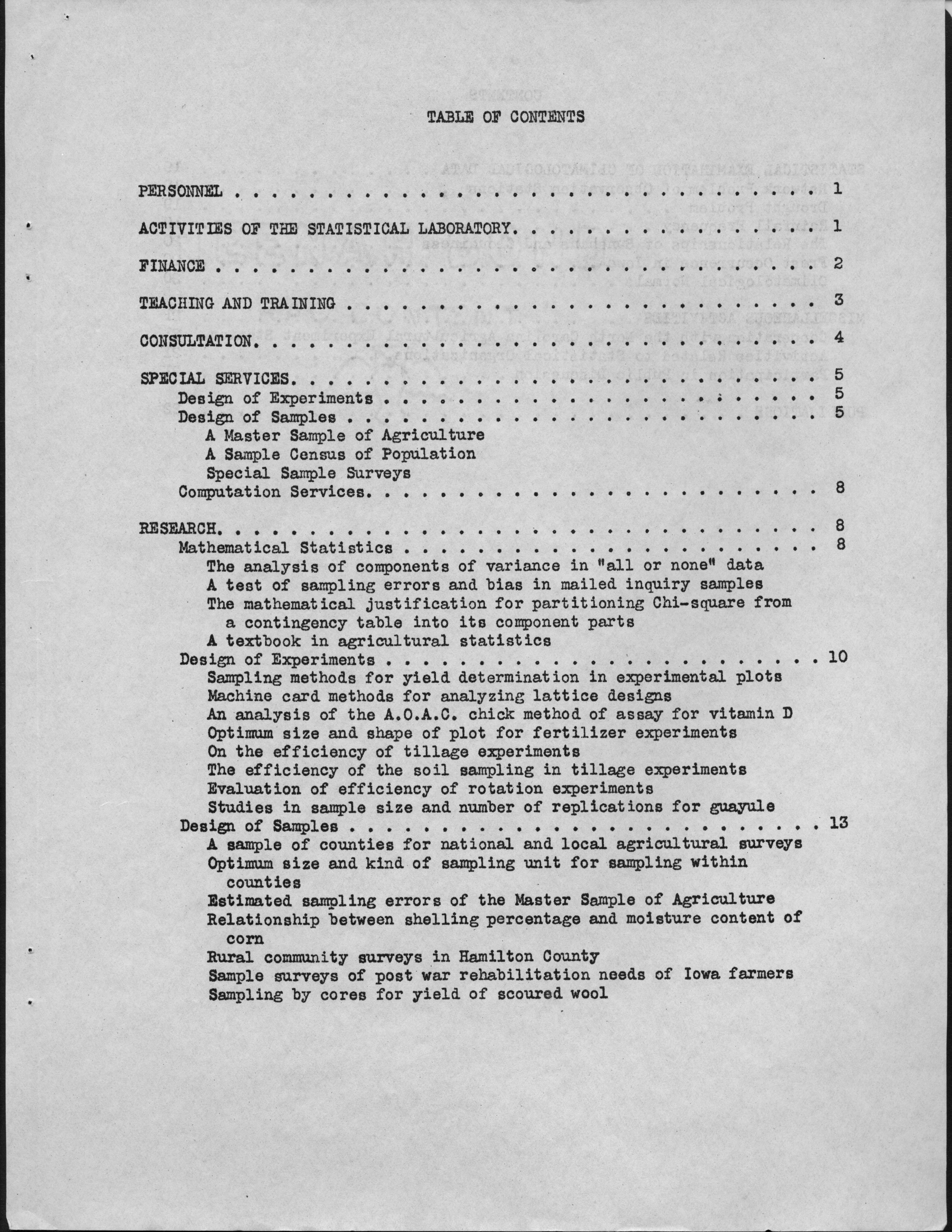 - Contents: Personnel -- Activities of the Statistical Laboratory -- Finance -- Teaching and Training -- Special Services: Design of Experiements, Design of Samples, Computation Services -- Research: Mathematical Statistics, Design of Experiments, Design of Samples -- Statistical Examination of Climatological Data: Network Problem of Observation Stations, Drought Problem, Rainfall Frequency, Relationships of Sunshine and Cloudiness, Frost Occurence in Iowa, Climatological Normals -- Miscelleanous Activities: Cooperation with the North Carolina Agricultural Experiment Station, Activities Related to Statistical Organizations, Participation in Public Discussion -- Publications
