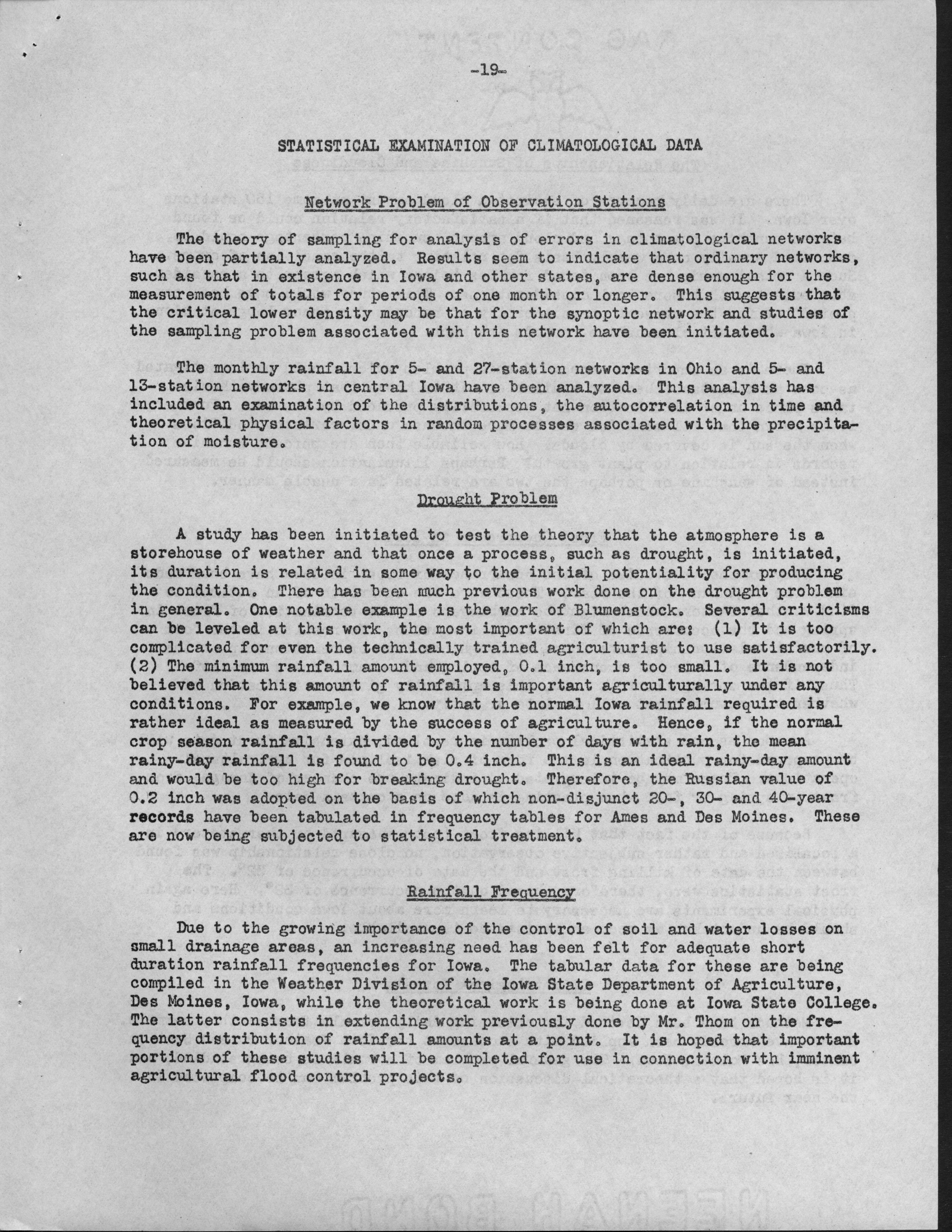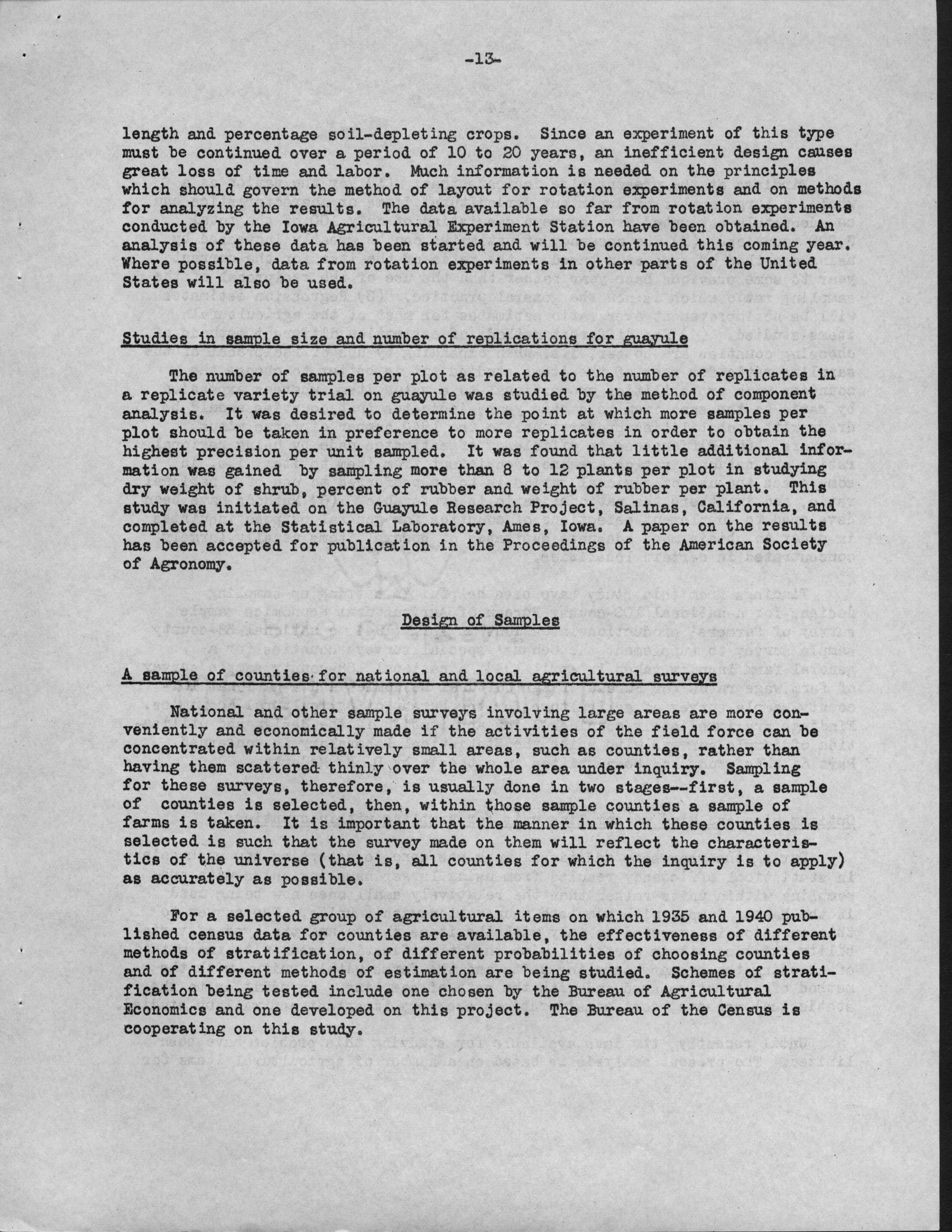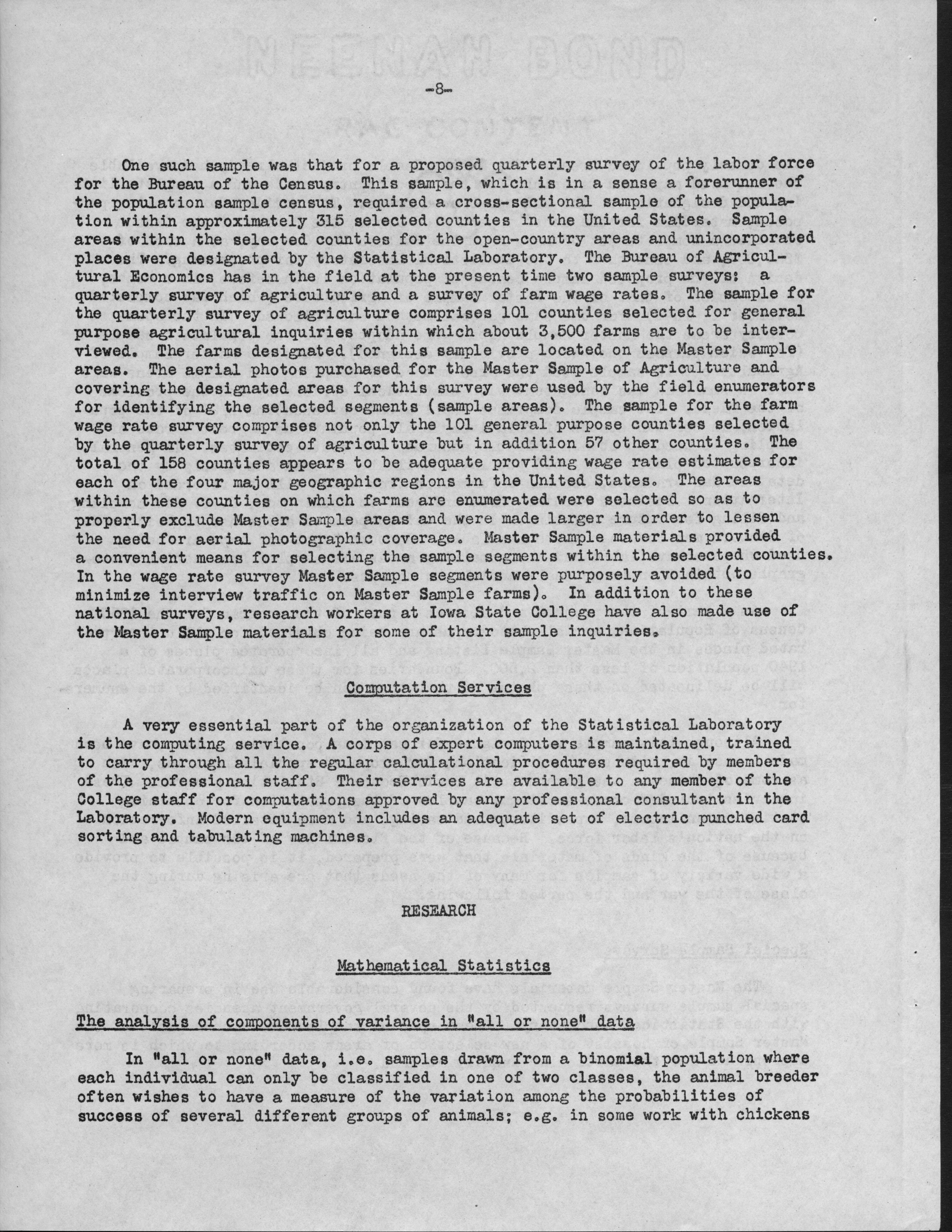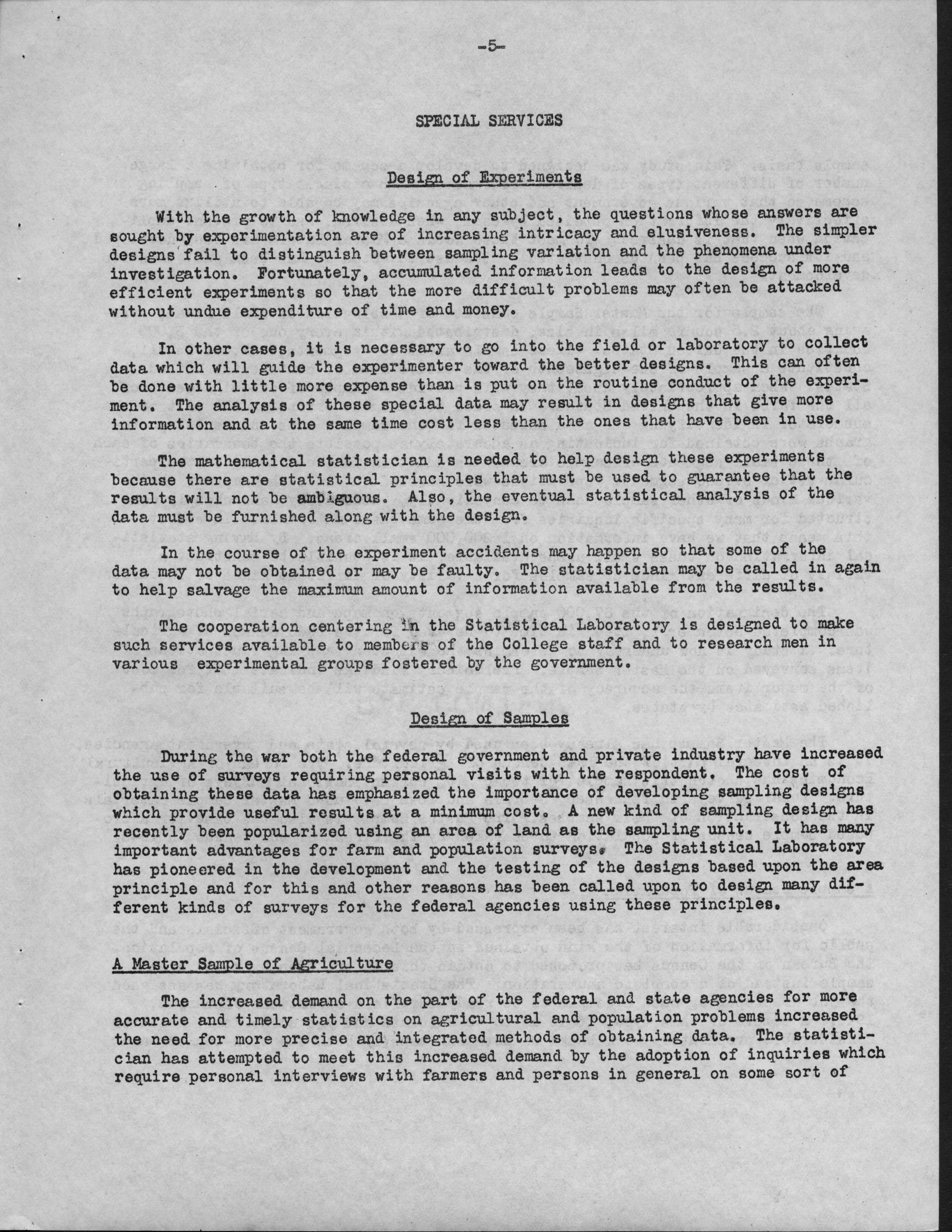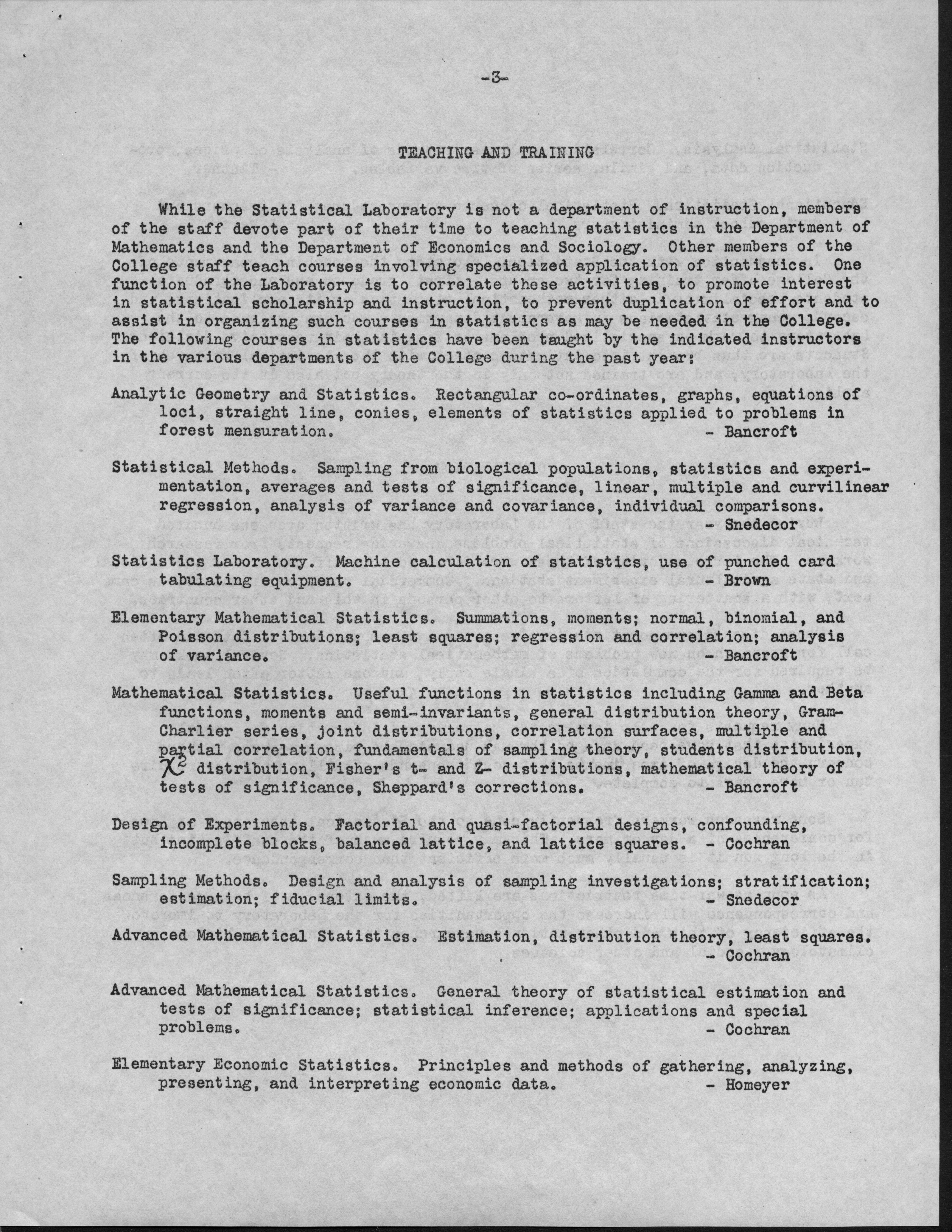 - Contents: Personnel -- Activities of the Statistical Laboratory -- Finance -- Teaching and Training -- Special Services: Design of Experiements, Design of Samples, Computation Services -- Research: Mathematical Statistics, Design of Experiments, Design of Samples -- Statistical Examination of Climatological Data: Network Problem of Observation Stations, Drought Problem, Rainfall Frequency, Relationships of Sunshine and Cloudiness, Frost Occurence in Iowa, Climatological Normals -- Miscelleanous Activities: Cooperation with the North Carolina Agricultural Experiment Station, Activities Related to Statistical Organizations, Participation in Public Discussion -- Publications