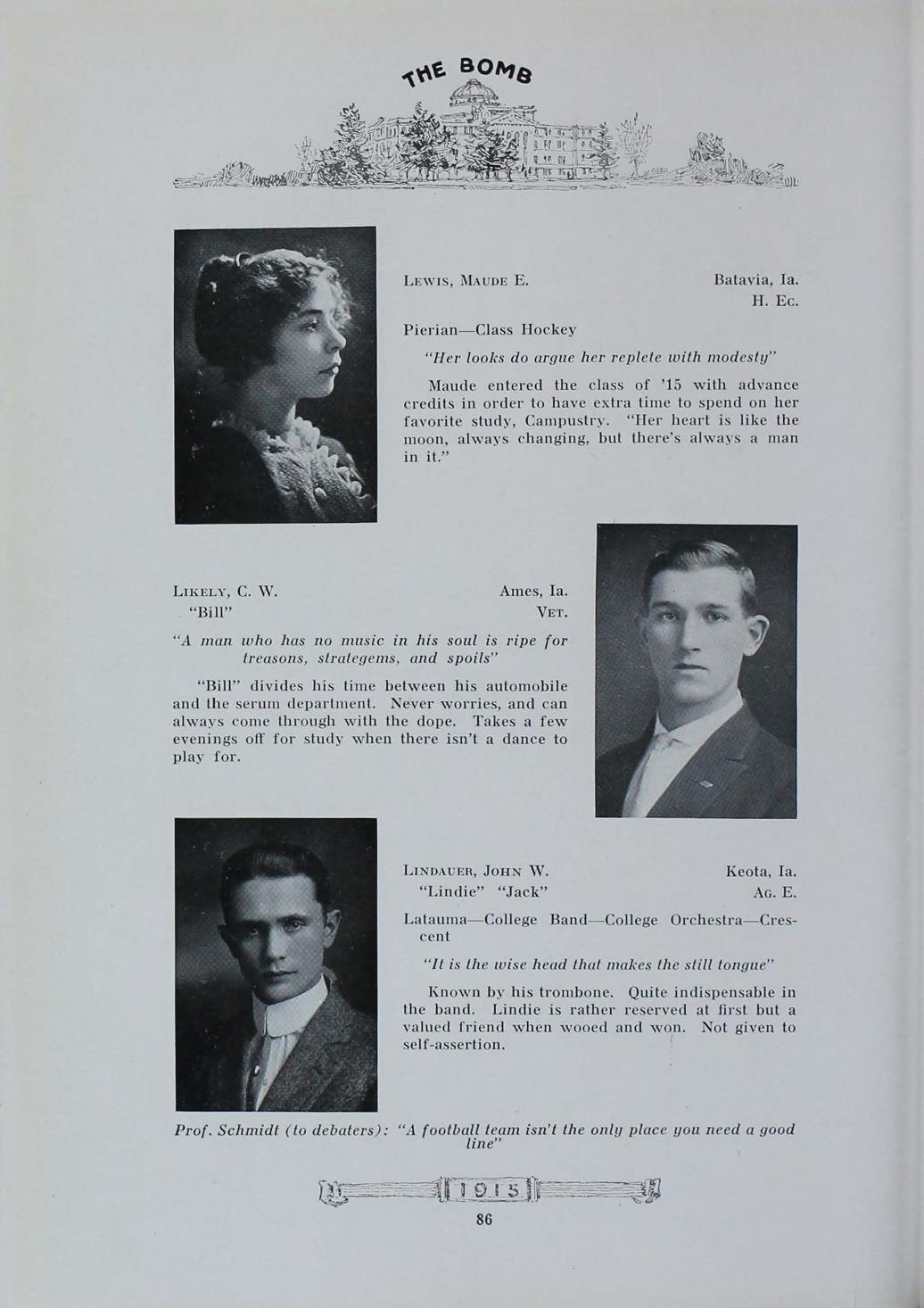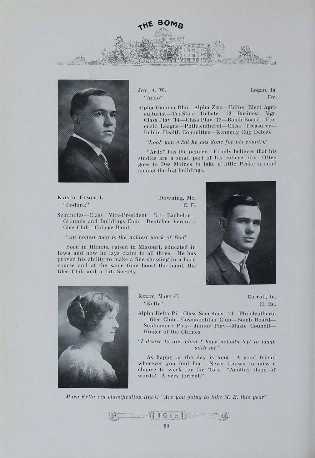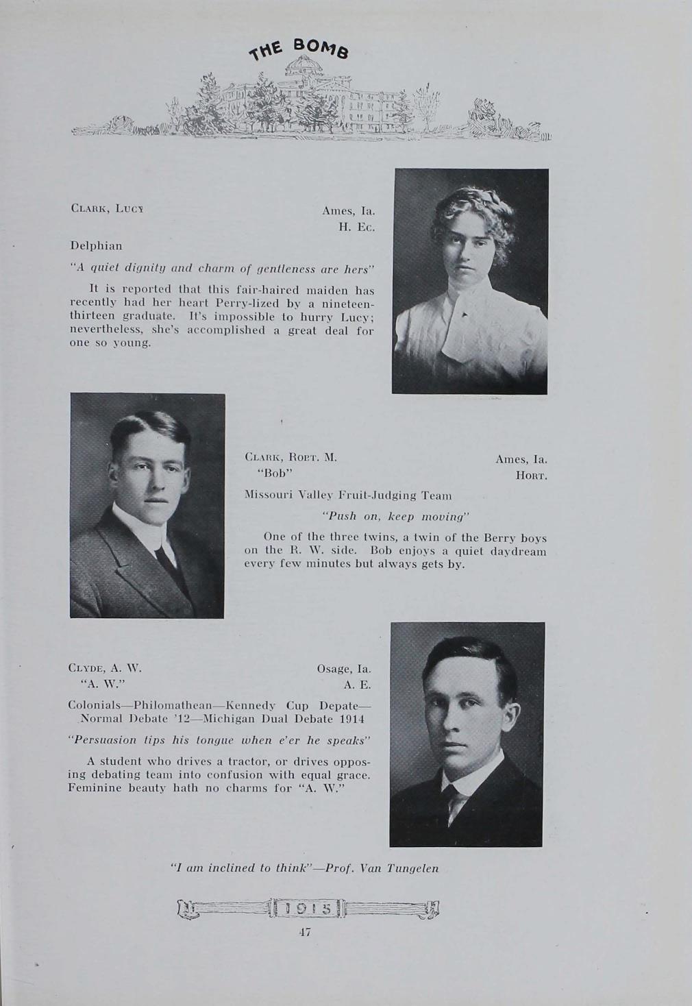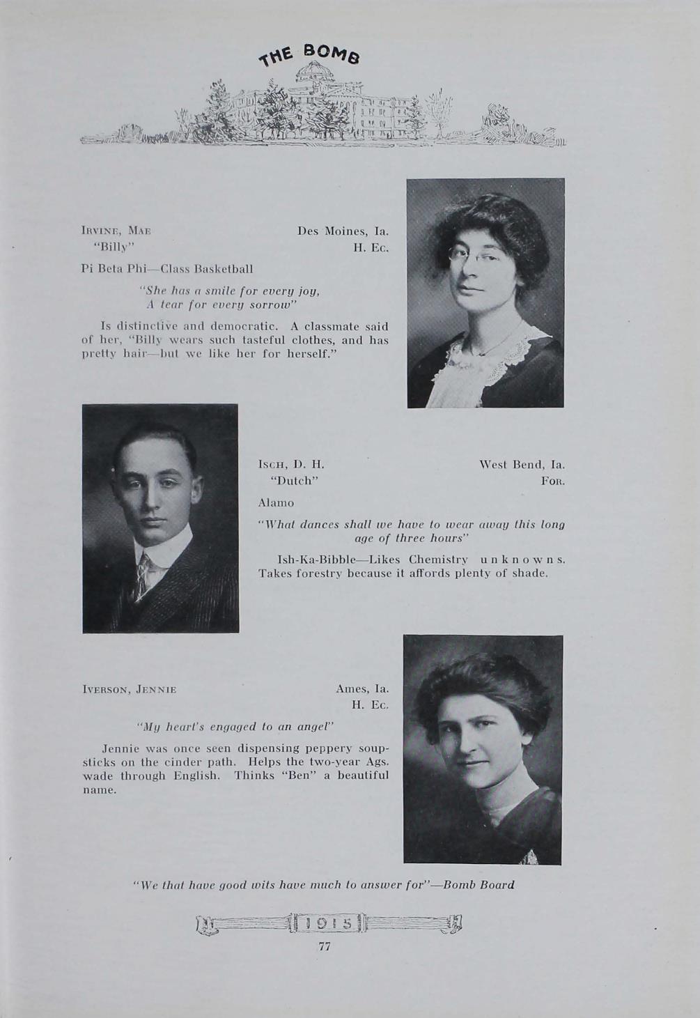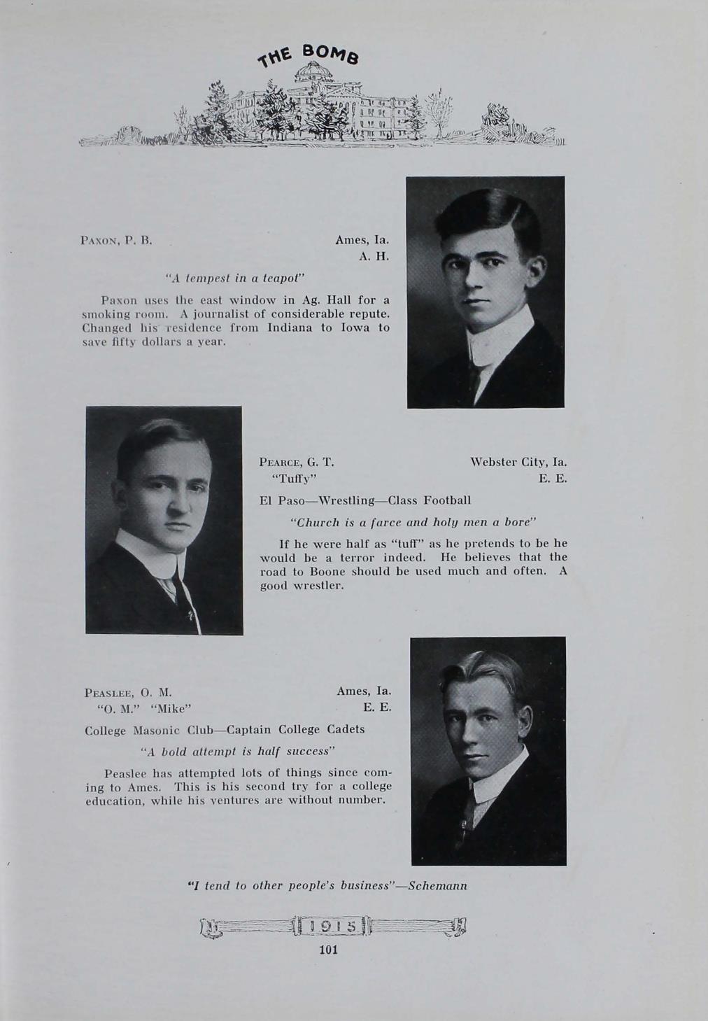 - "1915 Bomb", The Bomb (Iowa State) School Yearbooks, Iowa State University Library Digital Collections
