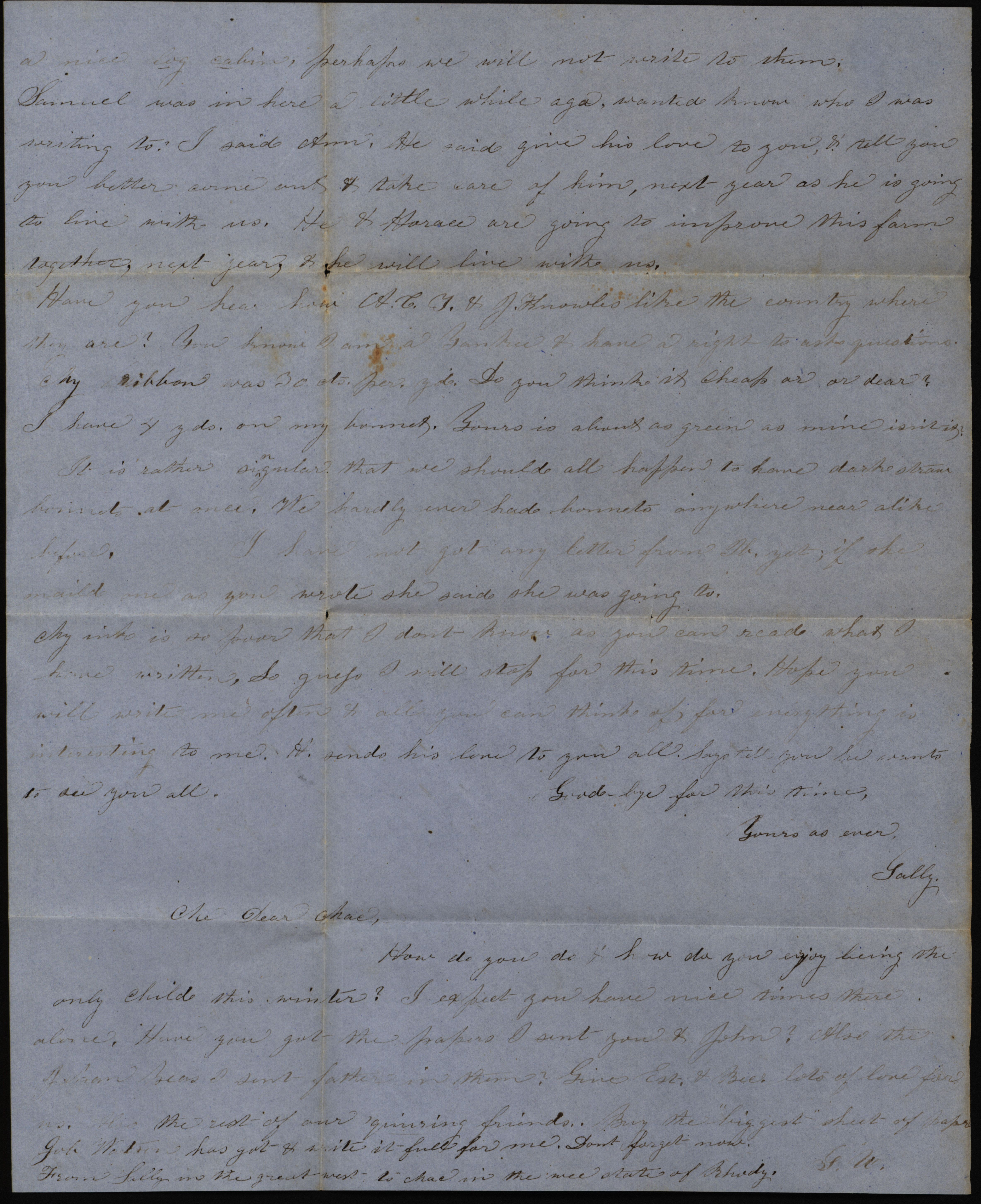 - "Letter from Sally to "Dear Sister Ann" and "Me Dear Mae," December 14, 1857", Sarah Underwood Papers, Iowa State University Library Digital Collections