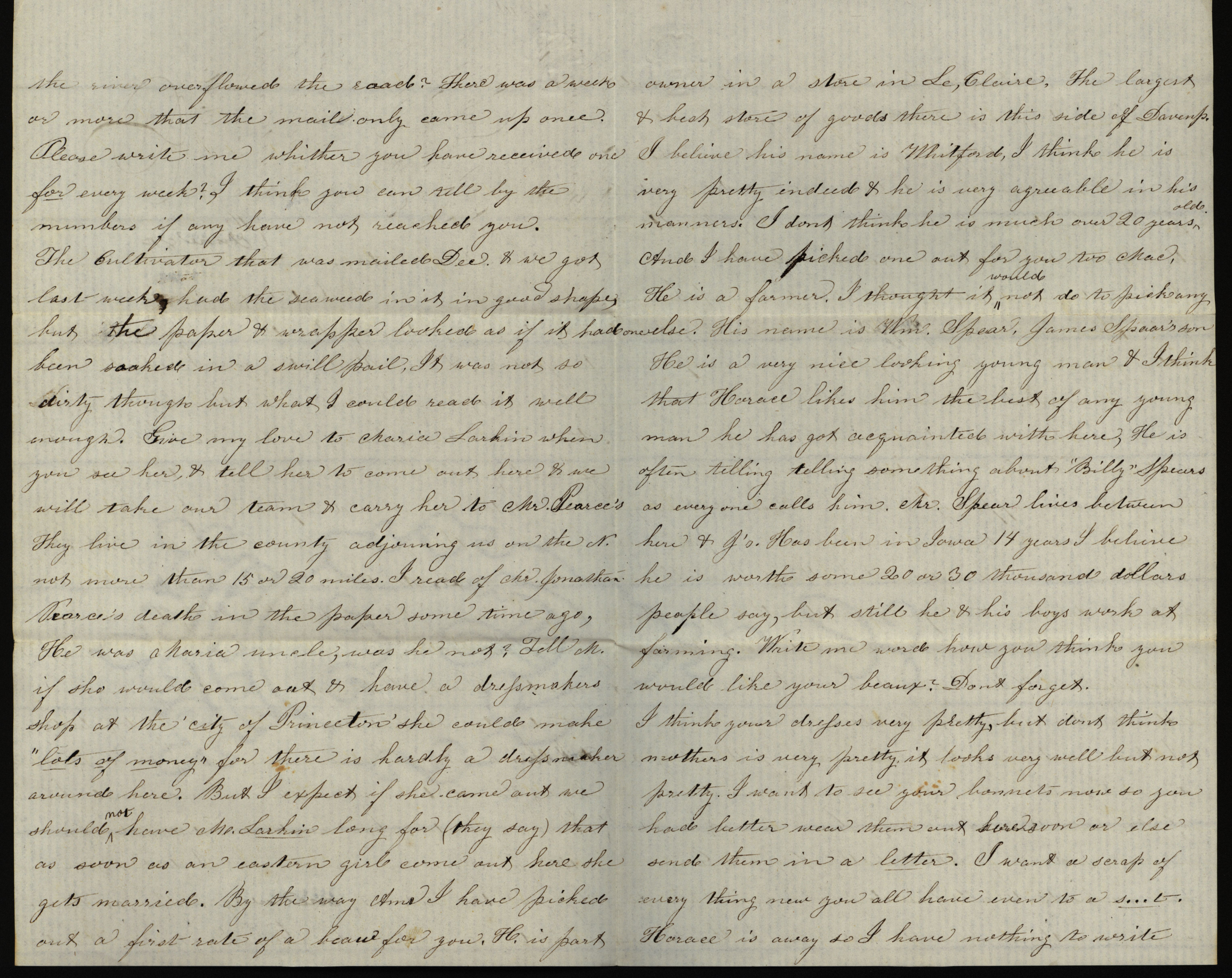 - Letter from Sarah Underwood to her sisters Ann E. Tefft and Mae Tefft June 8, 1857 discussing her neighbors and describing potential suitors for her sisters. Sarah also requests fabric samples from her sisters' clothing.