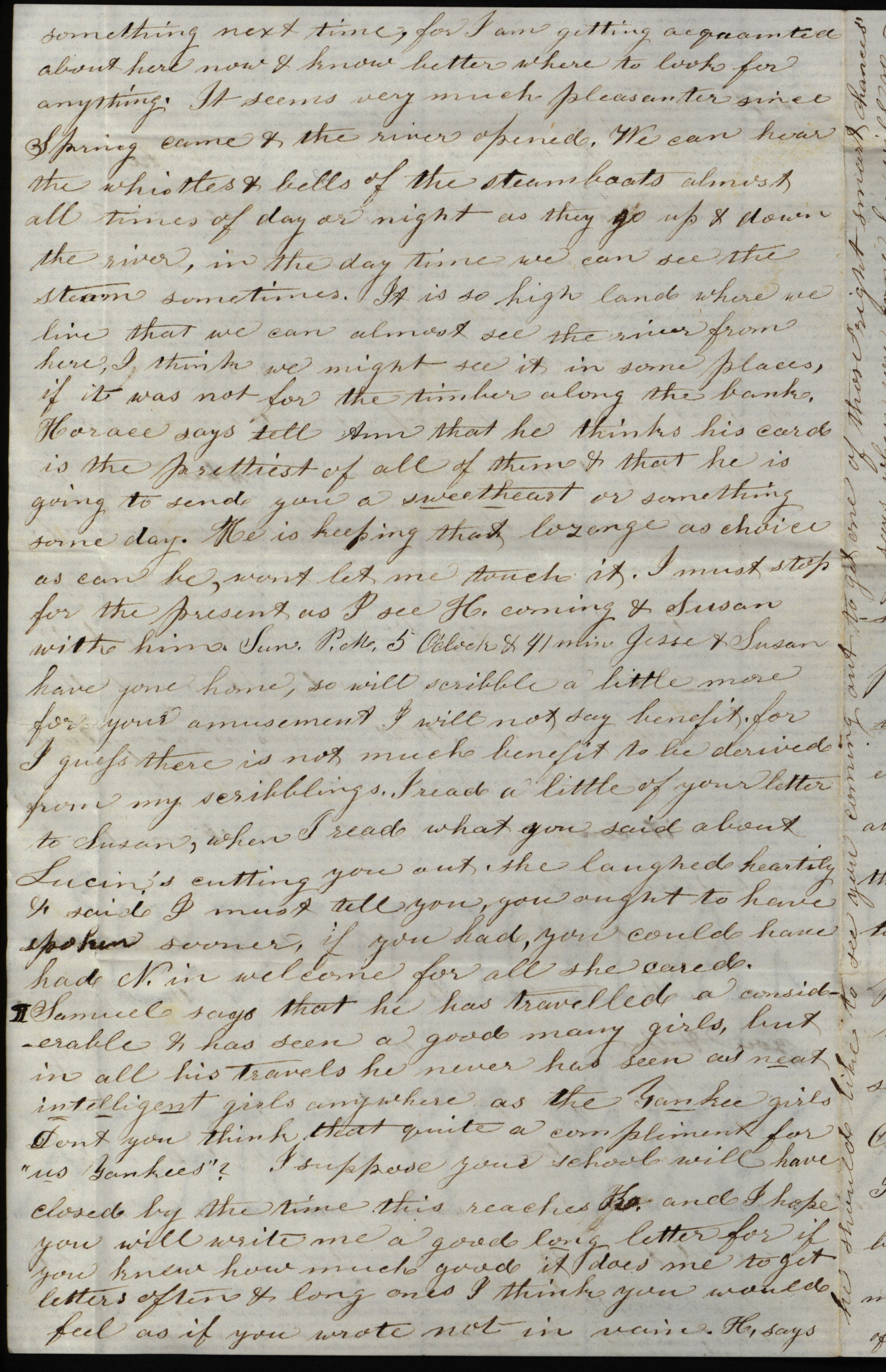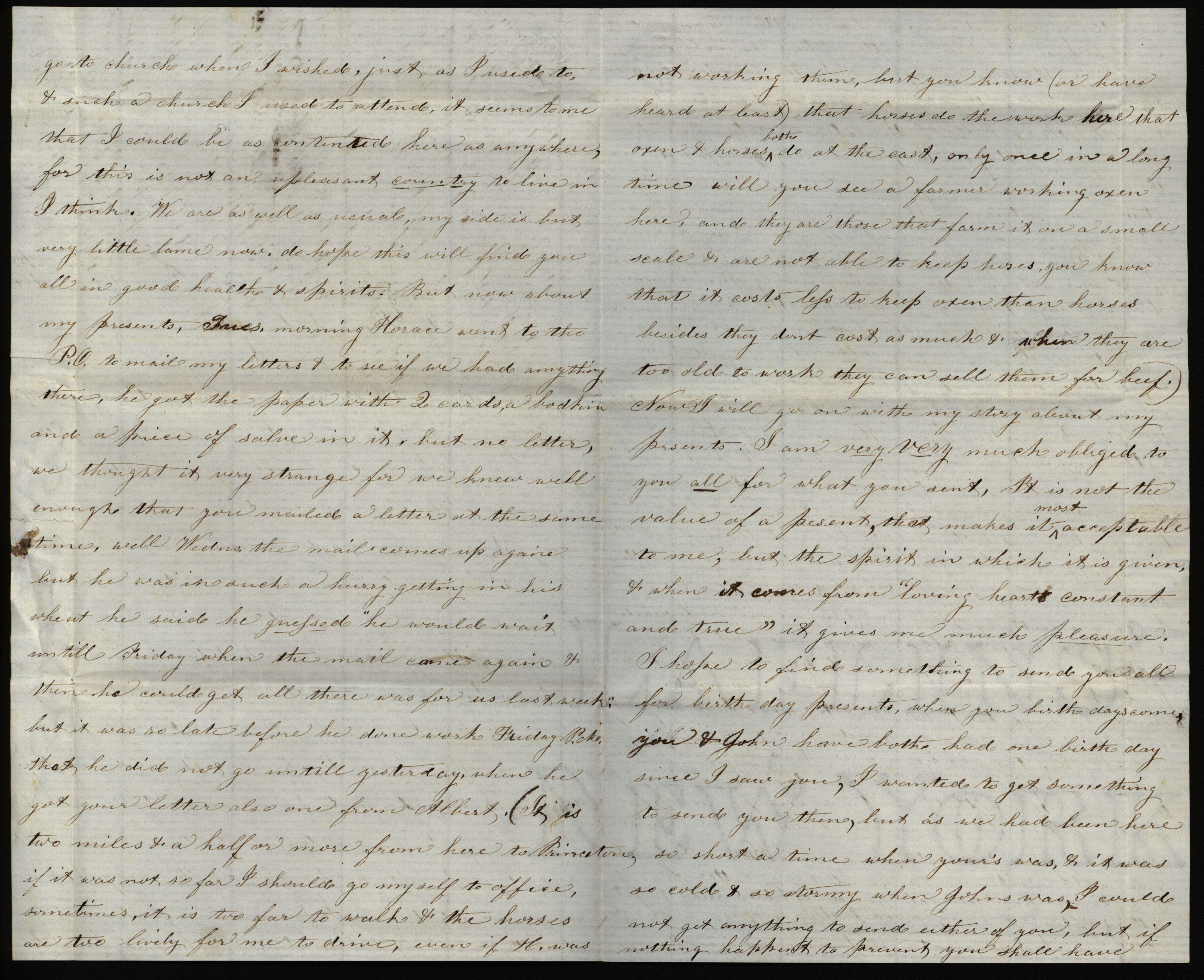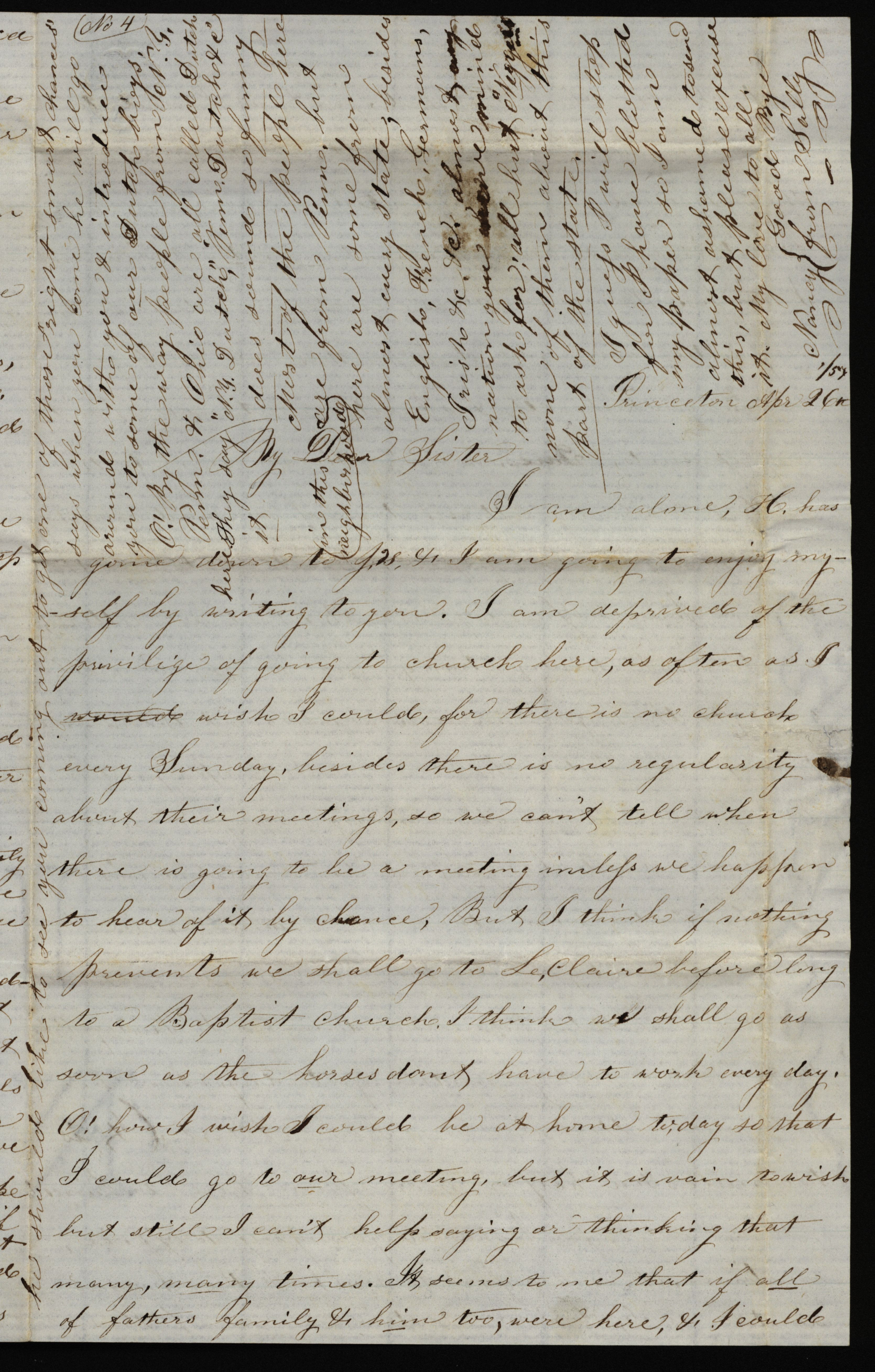 - Letter from Sarah Underwood to her sister, April 26, 1857. Sarah comments on the irregularity of local church services, the value of keeping work horses, steamboats on the Mississippi, her appreciation for a birthday gift, and the ethnic makeup of the area around Princeton, Iowa.